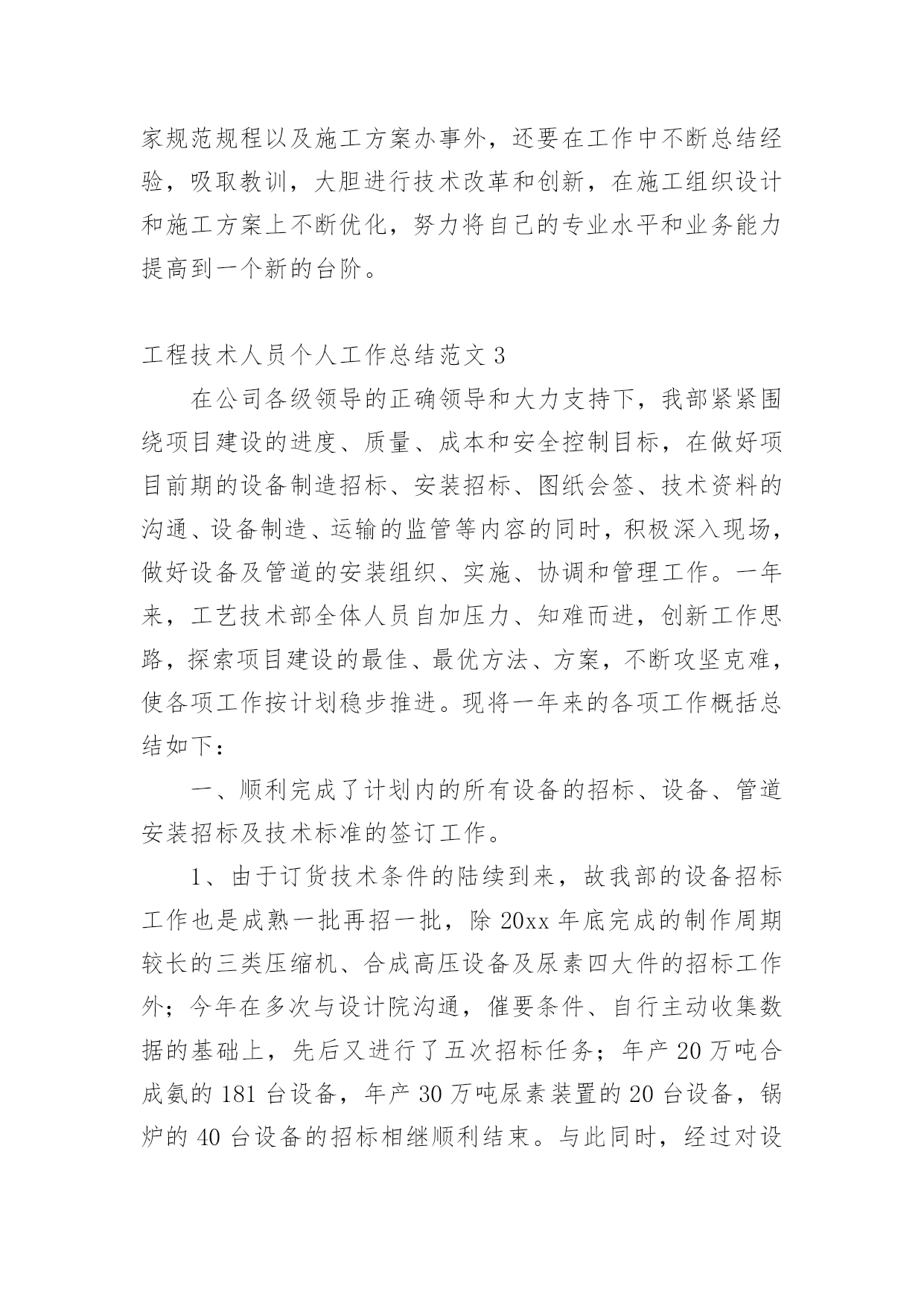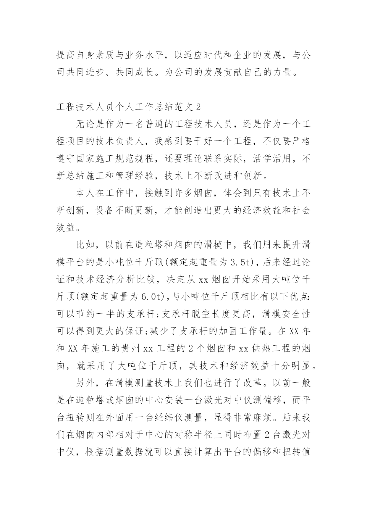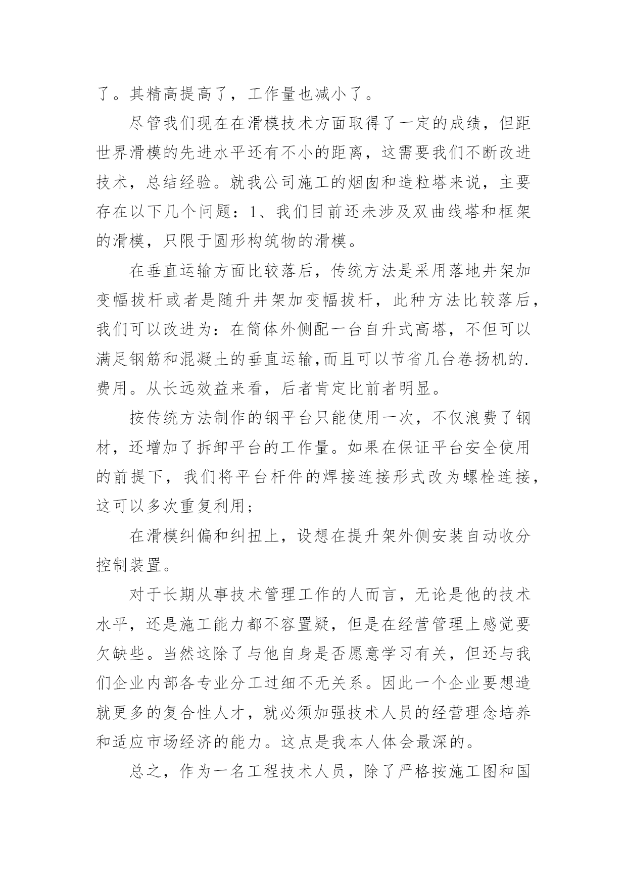 工程技术人员个人工作总结工程技术人员个人工作总结范文总结是对某一阶段的工作、学习或思想中的经验或情况进行分析研究的书面材料,它可以使我们更有效率,不妨坐下来好好写写总结吧。总结怎么写才不会千篇一律呢?以下是小编为大家整理的工程技术人员个人工作总结范文,供大家参考借鉴,希望可以帮助到有需要的朋友。工程技术人员个人工作总结范文1根据自身20xx年工作的实际情况,我对自己的工作做出分析评定,总结经验教训,提出改进方法,以便自己在今后的工作中扬长避短,为今后不断改进工作方法,提高工作效率提供依据,下面就本人20xx年的工作总结如下:作为一名技术人员,我将工作定位为协助好技术负责人的工作和不断的自我学习充实,在参与建设的工程中,在完成工程的施工测量放线的同时,还协助技术负责人编制施工方案、技术交底,并负责工程技术资料的指导与编制,和施工员一起进行现场质量检查,以及协助安全员落实、督促、检查施工现场安全工作。在工程施工过程中,我一直以积极的心态认真地对待自己的工作,在从事的各项工作中,都能尽职尽责,以求圆满的完成工作任务。“不要急于出成绩,埋下头来干工作”,是我的工作,提醒自己不要好高骛远,而要脚踏实地,多干实事,在实践中检验自己的知识并获得施工现场的经验累积。另外,拿技术交底工作来说,并不是简单的把交底写完交给劳务施工队签字就完成工作了。而是在书面交底工作完成后,还要在工人的实际施工过程中跟踪、检查,发现未按或未完全按技术交底施工的工人,要耐心的给予讲解和指导,这样才能使分部分项工程做到位,避免返工,在保证施工进度的同时也保证了工程质量。工程施工中,安全更是不容忽视的主要环节,根据一年的工地实际经验简单谈谈安全方面。最重要的就是树立安全意识,首先在项目部管理人员心中必须有强烈的安全意识和责任感,只有项目部管理人员从心底认识到安全的重要性,才能用心做好这项工作。如果项目部管理人员抱着侥幸的心理去做这项工作,那在工程安全施工方面是致命的隐患。所以项目部管理人员必须将安全工作从心底认识并付诸实施。对于劳务队,首先要做的就是在工人进场以后要安排一次安全教育培训,同时要对劳务施工队进行安全技术交底。一年来的工程施工工作,使得自己的.专业知识得到了长进和加深,工作能力,包括组织协调能力、管理能力和应变能力都得到了很大的提高,更重要的是获得了宝贵的工作经验的积累。多年来的工作表现也得到了项目部领导和同事们的认可。总之,在今后的工作中,我将以百倍的热情迎接新的挑战,在学习中进步和成熟起来,不断地鞭策自己并充实能量,提高自身素质与业务水平,以适应时代和企业的发展,与公司共同进步、共同成长。为公司的发展贡献自己的力量。工程技术人员个人工作总结范文2无论是作为一名普通的工程技术人员,还是作为一个工程项目的技术负责人,我感到要干好一个工程,不仅要严格遵守国家施工规范规程,还要理论联系实际,活学活用,不断总结施工和管理经验,技术上不断改进和创新。本人在工作中,接触到许多烟囱,体会到只有技术上不断创新,设备不断更新,才能创造出更大的经济效益和社会效益。比如,以前在造粒塔和烟囱的滑模中,我们用来提升滑模平台的是小吨位千斤顶(额定起重量为3.5t),后来经过论证和技术经济分析比较,决定从xx烟囱开始采用大吨位千斤顶(额定起重量为6.0t),与小吨位千斤顶相比有以下优点:可以节约一半的支承杆;支承杆脱空长度更高,滑模安全性可以得到更大的保证;减少了支承杆的加固工作量。在XX年和XX年施工的贵州xx工程的2个烟囱和xx供热工程的烟囱,就采用了大吨位千斤顶,其技术和经济效益十分明显。另外,在滑模测量技术上我们也进行了改革。以前一般是在造粒塔或烟囱的中心安装一台激光对中仪测偏移,而平台扭转则在外面用一台经纬仪测量,显得非常麻烦。后来我们在烟囱内部相对于中心的对称半径上同时布置2台激光对中仪,根据测量数据就可以直接计算出平台的偏移和扭转值了。其精高提高了,工作量也减小了。尽管我们现在在滑模技术方面取得了一定的成绩,但距世界滑模的先进水平还有不小的距离,这需要我们不断改进技术,总结经验。就我公司施工的烟囱和造粒塔来说,主要存在以下几个问题:1、我们目前还未涉及双曲线塔和框架的滑模,只限于圆形构筑物的滑模。在垂直运输方面比较落后,传统方法是采用落地井架加变幅拔杆或者是随升井架加变幅拔杆,此种方法比较落后,我们可以改进为:在筒体外侧配一台自升式高塔,不但可以满足钢筋和混凝土的垂直运输,而且可以节省几台卷扬机的.费用。从长远效益来看,后者肯定比前者明显。按传统方法制作的钢平台只能使用一次,不仅浪费了钢材,还增加了拆卸平台的工作量。如果在保证平台安全使用的前提下,我们将平台杆件的焊接连接形式改为螺栓连接,这可以多次重复利用;在滑模纠偏和纠扭上,设想在提升架外侧安装自动收分控制装置。对