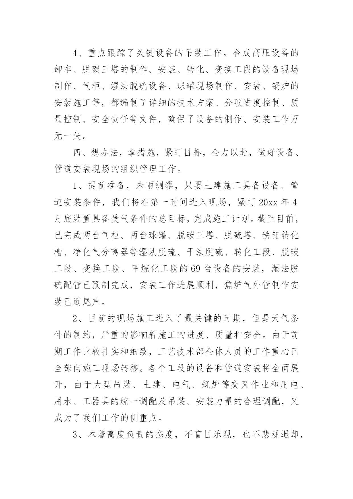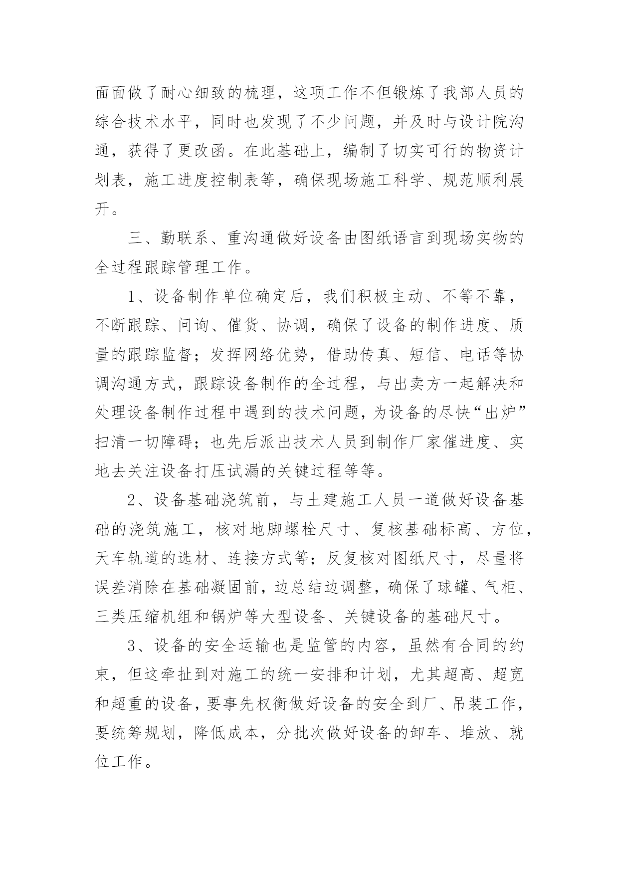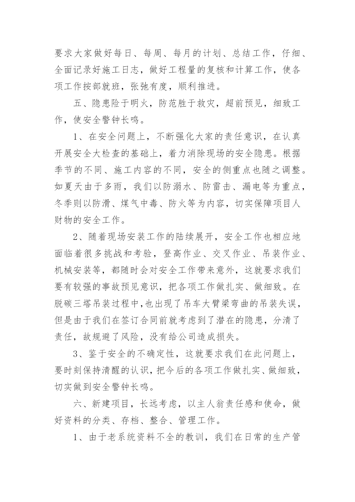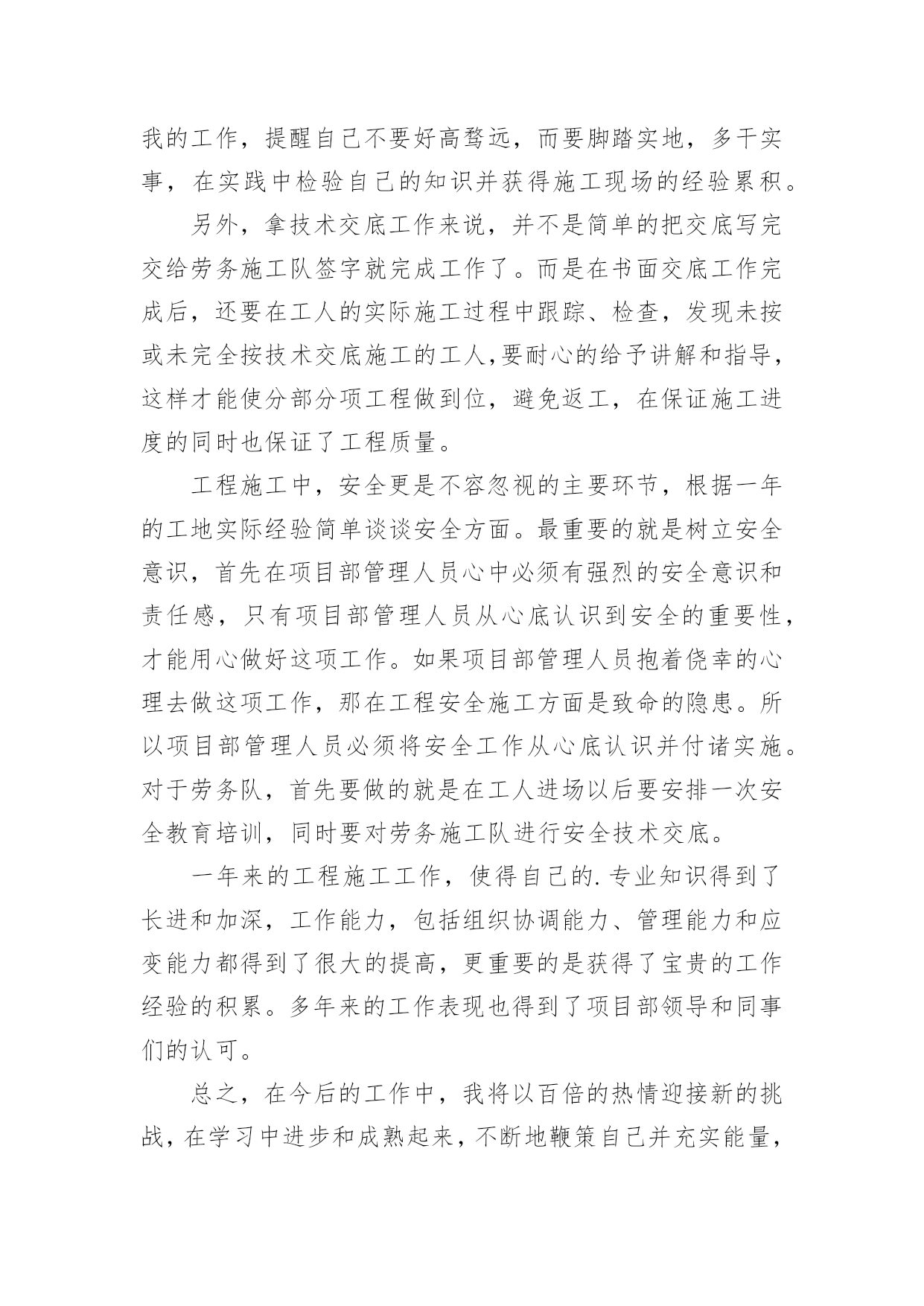 工程技术人员个人工作总结工程技术人员个人工作总结范文总结是对某一阶段的工作、学习或思想中的经验或情况进行分析研究的书面材料,它可以使我们更有效率,不妨坐下来好好写写总结吧。总结怎么写才不会千篇一律呢?以下是小编为大家整理的工程技术人员个人工作总结范文,供大家参考借鉴,希望可以帮助到有需要的朋友。工程技术人员个人工作总结范文1根据自身20xx年工作的实际情况,我对自己的工作做出分析评定,总结经验教训,提出改进方法,以便自己在今后的工作中扬长避短,为今后不断改进工作方法,提高工作效率提供依据,下面就本人20xx年的工作总结如下:作为一名技术人员,我将工作定位为协助好技术负责人的工作和不断的自我学习充实,在参与建设的工程中,在完成工程的施工测量放线的同时,还协助技术负责人编制施工方案、技术交底,并负责工程技术资料的指导与编制,和施工员一起进行现场质量检查,以及协助安全员落实、督促、检查施工现场安全工作。在工程施工过程中,我一直以积极的心态认真地对待自己的工作,在从事的各项工作中,都能尽职尽责,以求圆满的完成工作任务。“不要急于出成绩,埋下头来干工作”,是我的工作,提醒自己不要好高骛远,而要脚踏实地,多干实事,在实践中检验自己的知识并获得施工现场的经验累积。另外,拿技术交底工作来说,并不是简单的把交底写完交给劳务施工队签字就完成工作了。而是在书面交底工作完成后,还要在工人的实际施工过程中跟踪、检查,发现未按或未完全按技术交底施工的工人,要耐心的给予讲解和指导,这样才能使分部分项工程做到位,避免返工,在保证施工进度的同时也保证了工程质量。工程施工中,安全更是不容忽视的主要环节,根据一年的工地实际经验简单谈谈安全方面。最重要的就是树立安全意识,首先在项目部管理人员心中必须有强烈的安全意识和责任感,只有项目部管理人员从心底认识到安全的重要性,才能用心做好这项工作。如果项目部管理人员抱着侥幸的心理去做这项工作,那在工程安全施工方面是致命的隐患。所以项目部管理人员必须将安全工作从心底认识并付诸实施。对于劳务队,首先要做的就是在工人进场以后要安排一次安全教育培训,同时要对劳务施工队进行安全技术交底。一年来的工程施工工作,使得自己的.专业知识得到了长进和加深,工作能力,包括组织协调能力、管理能力和应变能力都得到了很大的提高,更重要的是获得了宝贵的工作经验的积累。多年来的工作表现也得到了项目部领导和同事们的认可。总之,在今后的工作中,我将以百倍的热情迎接新的挑战,在学习中进步和成熟起来,不断地鞭策自己并充实能量,提高自身素质与业务水平,以适应时代和企业的发展,与公司共同进步、共同成长。为公司的发展贡献自己的力量。工程技术人员个人工作总结范文2无论是作为一名普通的工程技术人员,还是作为一个工程项目的技术负责人,我感到要干好一个工程,不仅要严格遵守国家施工规范规程,还要理论联系实际,活学活用,不断总结施工和管理经验,技术上不断改进和创新。本人在工作中,接触到许多烟囱,体会到只有技术上不断创新,设备不断更新,才能创造出更大的经济效益和社会效益。比如,以前在造粒塔和烟囱的滑模中,我们用来提升滑模平台的是小吨位千斤顶(额定起重量为3.5t),后来经过论证和技术经济分析比较,决定从xx烟囱开始采用大吨位千斤顶(额定起重量为6.0t),与小吨位千斤顶相比有以下优点:可以节约一半的支承杆;支承杆脱空长度更高,滑模安全性可以得到更大的保证;减少了支承杆的加固工作量。在XX年和XX年施工的贵州xx工程的2个烟囱和xx供热工程的烟囱,就采用了大吨位千斤顶,其技术和经济效益十分明显。另外,在滑模测量技术上我们也进行了改革。以前一般是在造粒塔或烟囱的中心安装一台激光对中仪测偏移,而平台扭转则在外面用一台经纬仪测量,显得非常麻烦。后来我们在烟囱内部相对于中心的对称半径上同时布置2台激光对中仪,根据测量数据就可以直接计算出平台的偏移和扭转值了。其精高提高了,工作量也减小了。尽管我们现在在滑模技术方面取得了一定的成绩,但距世界滑模的先进水平还有不小的距离,这需要我们不断改进技术,总结经验。就我公司施工的烟囱和造粒塔来说,主要存在以下几个问题:1、我们目前还未涉及双曲线塔和框架的滑模,只限于圆形构筑物的滑模。在垂直运输方面比较落后,传统方法是采用落地井架加变幅拔杆或者是随升井架加变幅拔杆,此种方法比较落后,我们可以改进为:在筒体外侧配一台自升式高塔,不但可以满足钢筋和混凝土的垂直运输,而且可以节省几台卷扬机的.费用。从长远效益来看,后者肯定比前者明显。按传统方法制作的钢平台只能使用一次,不仅浪费了钢材,还增加了拆卸平台的工作量。如果在保证平台安全使用的前提下,我们将平台杆件的焊接连接形式改为螺栓连接,这可以多次重复利用;在滑模纠偏和纠扭上,设想在提升架外侧安装自动收分控制装置。对