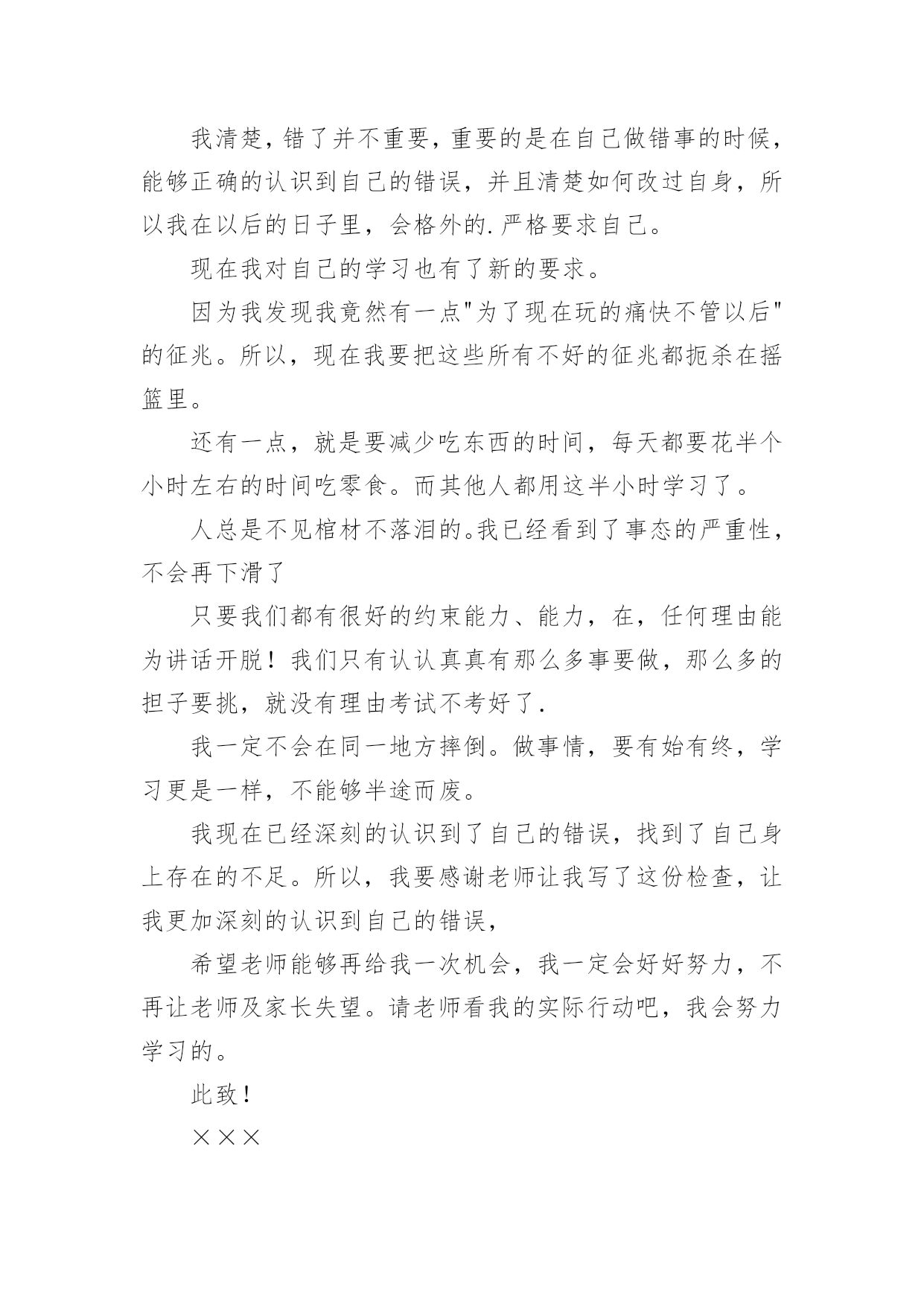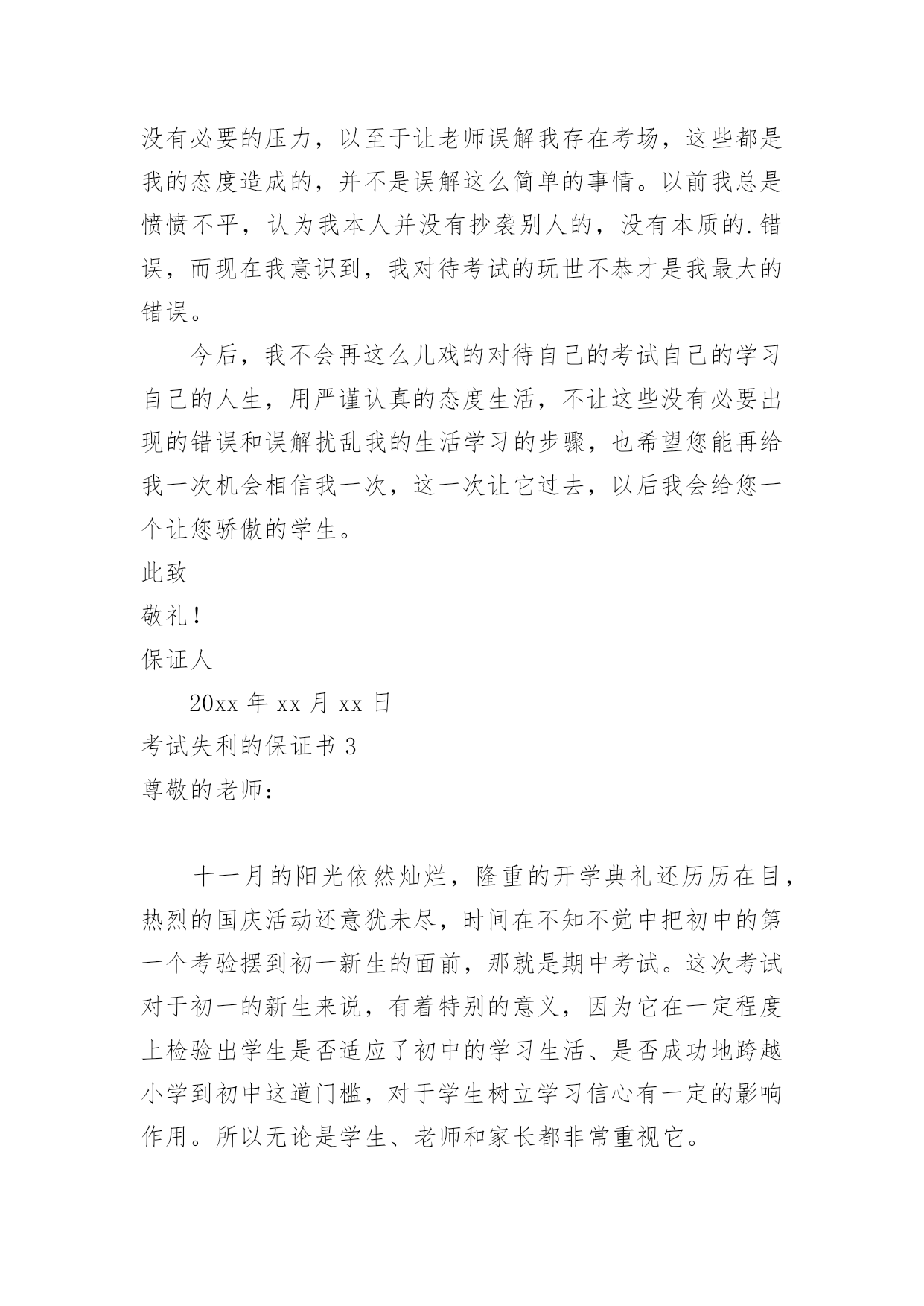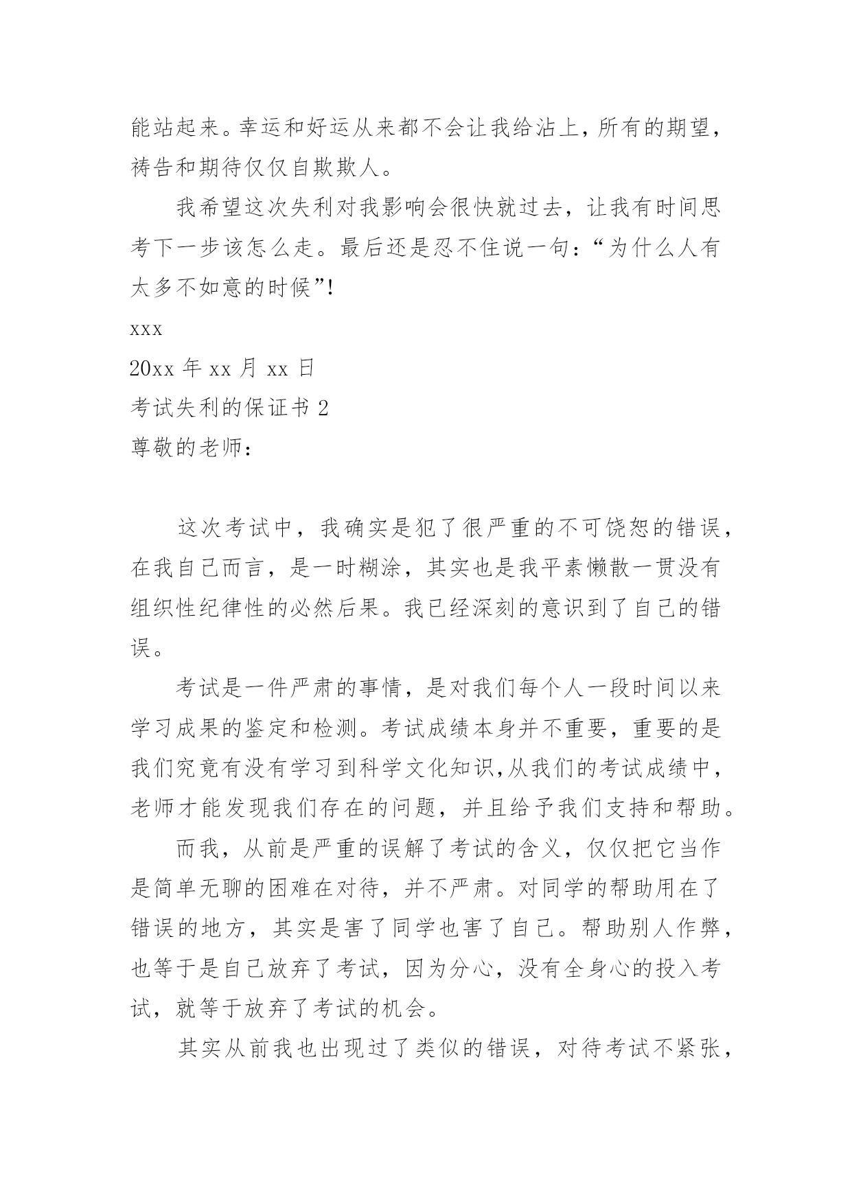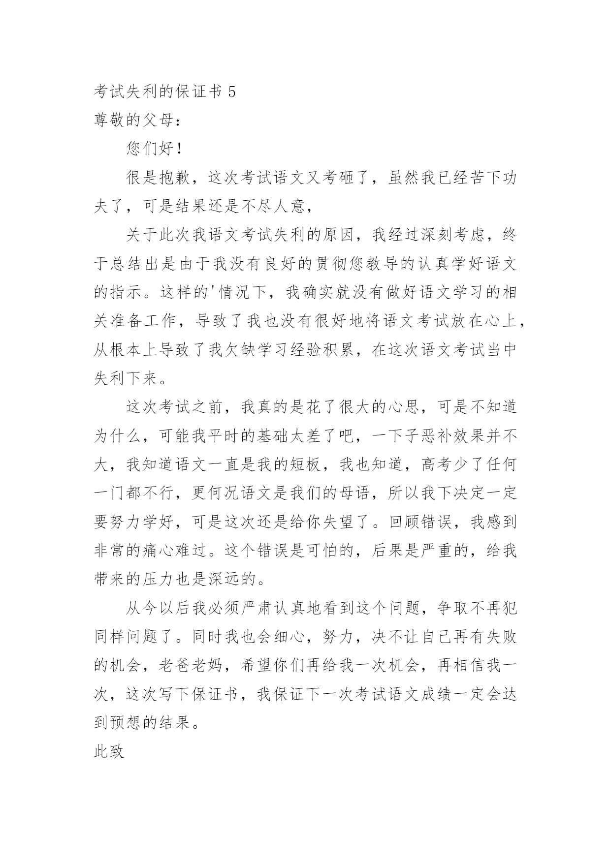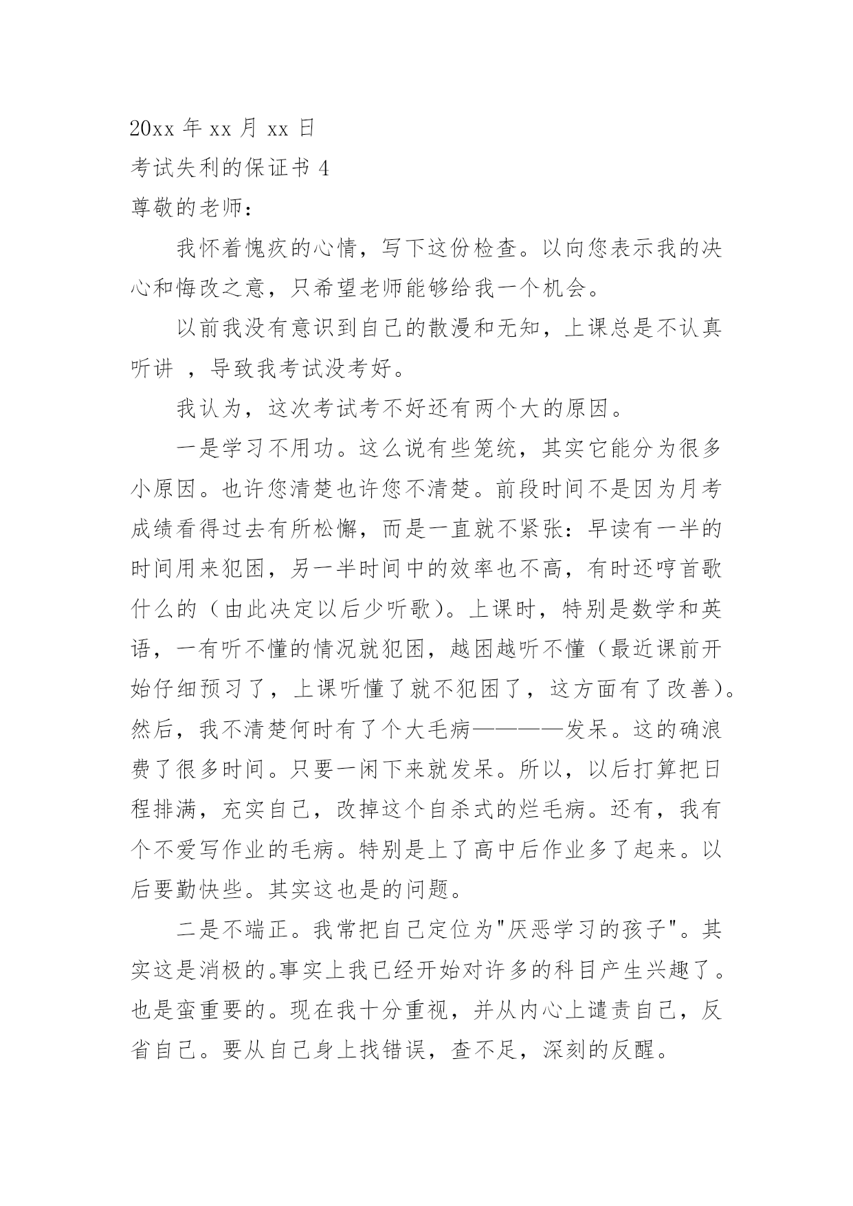 考试失利的保证书考试失利的保证书在当下社会,我们使用保证书的情况越来越多,保证书能对保证者起到督促和提醒作用。你所见过的保证书是什么样的呢?以下是小编为大家整理的考试失利的保证书,希望对大家有所帮助。考试失利的保证书1尊敬的老师:盼望已久的考试成绩,今天终于出来了。怀着忐忑的心情,我输入了校检码,然后一窜数字眺了出来,我满屏幕的寻找,然后心突然一沉,我有些难过--才得这么点分。原本预期至少有一门会及格而且分数应该还可以,可是令人失望的是,正是这门的分数是考过最低的成绩。忍不住回想考试的题目,答题的情景,可怎么也想象不出,为什么得这么少的.分。这已经是我第二次考翻译证的考试了,不知道还会不会有继续考下去的勇气。再次历经失败,又让人不得不反省自己。难道每天的练习竟然一点帮助也没有,到底怎么做才能考过去!此时,多么希望自己是天资聪颖的超人,可惜啊!可惜啊!我为什么是我?!对于我来说,考试已经是劳民伤财了,每次跌倒再爬起来的时候,我感到一阵剧痛,有时真是佩服自己竟然还能站起来。幸运和好运从来都不会让我给沾上,所有的期望,祷告和期待仅仅自欺欺人。我希望这次失利对我影响会很快就过去,让我有时间思考下一步该怎么走。最后还是忍不住说一句:“为什么人有太多不如意的时候”!xxx20xx年xx月xx日考试失利的保证书2尊敬的老师:这次考试中,我确实是犯了很严重的不可饶恕的错误,在我自己而言,是一时糊涂,其实也是我平素懒散一贯没有组织性纪律性的必然后果。我已经深刻的意识到了自己的错误。考试是一件严肃的事情,是对我们每个人一段时间以来学习成果的鉴定和检测。考试成绩本身并不重要,重要的是我们究竟有没有学习到科学文化知识,从我们的考试成绩中,老师才能发现我们存在的问题,并且给予我们支持和帮助。而我,从前是严重的误解了考试的含义,仅仅把它当作是简单无聊的困难在对待,并不严肃。对同学的帮助用在了错误的地方,其实是害了同学也害了自己。帮助别人作弊,也等于是自己放弃了考试,因为分心,没有全身心的投入考试,就等于放弃了考试的机会。其实从前我也出现过了类似的错误,对待考试不紧张,没有必要的压力,以至于让老师误解我存在考场,这些都是我的态度造成的,并不是误解这么简单的事情。以前我总是愤愤不平,认为我本人并没有抄袭别人的,没有本质的.错误,而现在我意识到,我对待考试的玩世不恭才是我最大的错误。今后,我不会再这么儿戏的对待自己的考试自己的学习自己的人生,用严谨认真的态度生活,不让这些没有必要出现的错误和误解扰乱我的生活学习的步骤,也希望您能再给我一次机会相信我一次,这一次让它过去,以后我会给您一个让您骄傲的学生。此致敬礼!保证人20xx年xx月xx日考试失利的保证书3尊敬的老师:十一月的阳光依然灿烂,隆重的开学典礼还历历在目,热烈的国庆活动还意犹未尽,时间在不知不觉中把初中的第一个考验摆到初一新生的面前,那就是期中考试。这次考试对于初一的新生来说,有着特别的意义,因为它在一定程度上检验出学生是否适应了初中的学习生活、是否成功地跨越小学到初中这道门槛,对于学生树立学习信心有一定的影响作用。所以无论是学生、老师和家长都非常重视它。成绩一出来,很多学生和家长发现与小学时清一色的“优良”形成了明显反差。这种反差让孩子感到失望、沮丧和焦虑不安,不免对自己的能力产生怀疑和否定的情绪,对父母的关心感到内疚,也为自己努力却得不到预想中的成绩感到迷茫和困惑。这种反差也让很多家长产生了怀疑,或怀疑孩子的潜力或怀疑初中的教学质量或怀疑小学教育有问题。为什么会有如此的反差呢?那是因为小学学习内容相对较简单,考试分数也较高一些;到了初中,学习科目增多、内容加深,考高分就不容易了。而分数与题目难易程度、覆盖面大小、孩子的身体、心理状况等多种因素有关。但一般来说有以下几个原因:1、对学习的不适应初中学习与小学学习有很大的不同,具体表现在学习内容逐步深化、学科知识逐步系统化、学习的课程门类逐渐增加等方面。语文、数学、英语这些小学曾学习过的课程,由直观的、感性的、零碎的知识点变成了更为完整、系统的知识体系,并更加突出能力要求;历史、政治、地理等人文社科知识也成为重要的学习内容。而老师的教学也越来越注重传授知识的严密性和注重学生思维方法、思维能力的培养,除要求学生识记大量的定义、原理等知识点外,更重要的是培养学生掌握运用知识的能力。相对于小学的“扶”,初中教师在教学中“放”得较多,更多的.学习体现在课后的自主学习。这些变化都对孩子的自主学习能力提出更高的要求,学习不自觉、没有良好学习习惯的孩子会感到不习惯、觉得功课应接不暇,上课似乎听懂了但作业却不会写。2、对考试的不适应虽然我们都在批驳应试教育,但是不可否认上了初中之后,与小学的“素质教育”相比,无论家长还是老师都更注重应试能力的培养。初中的考试给孩子