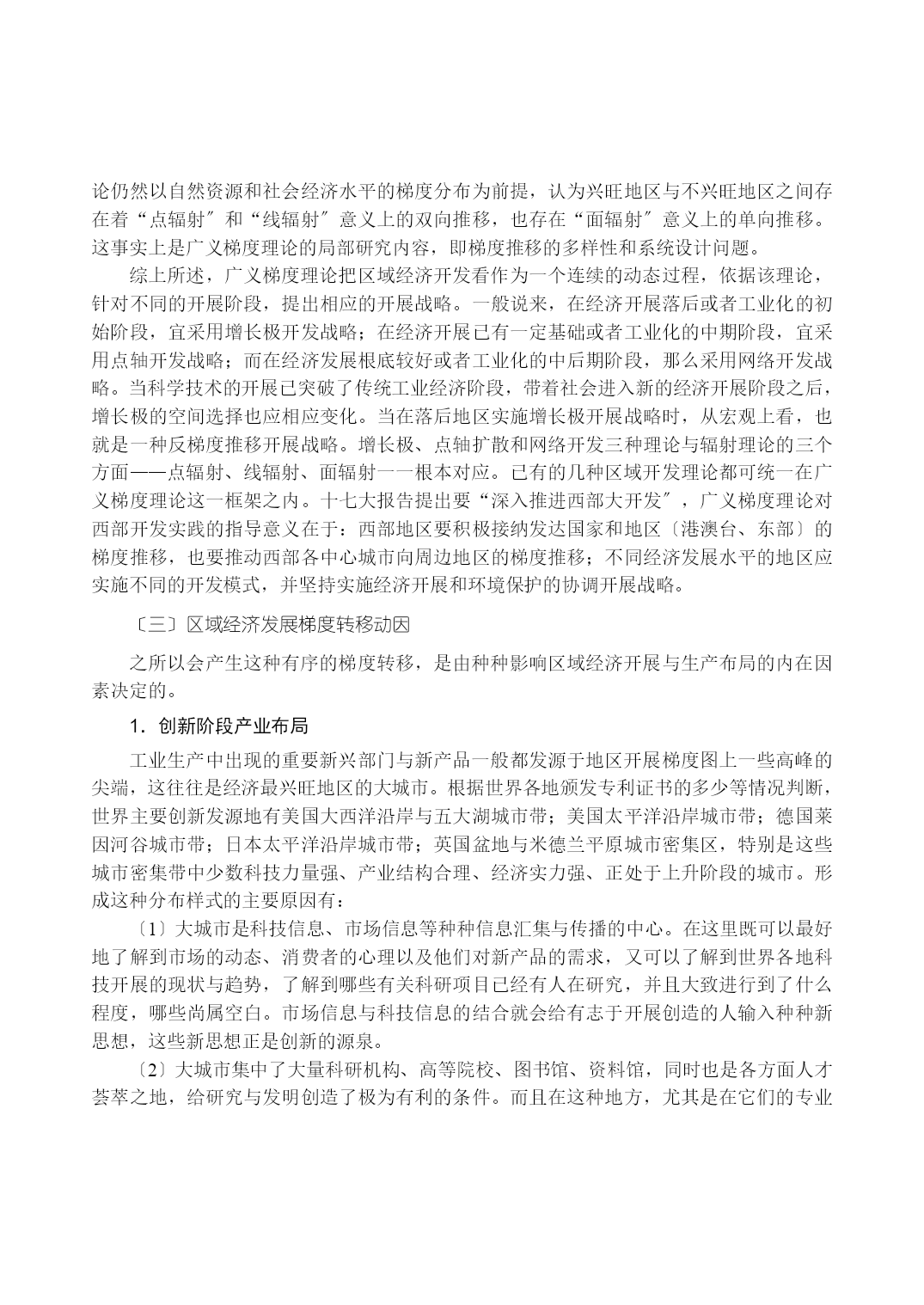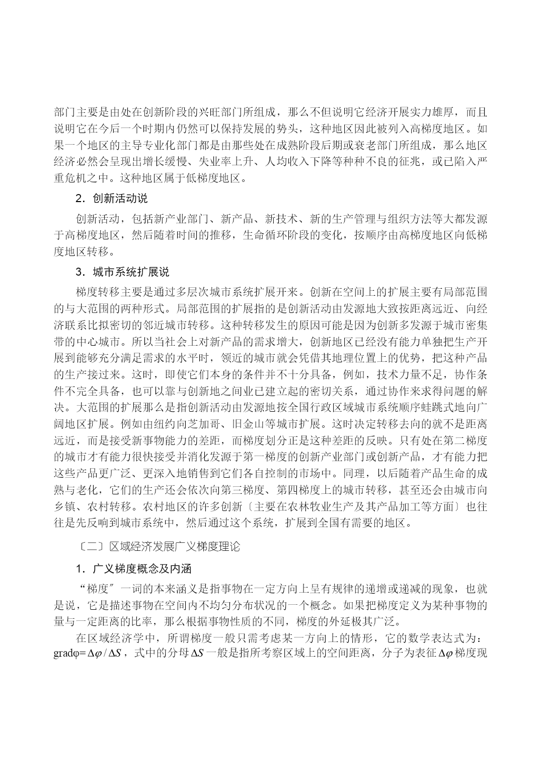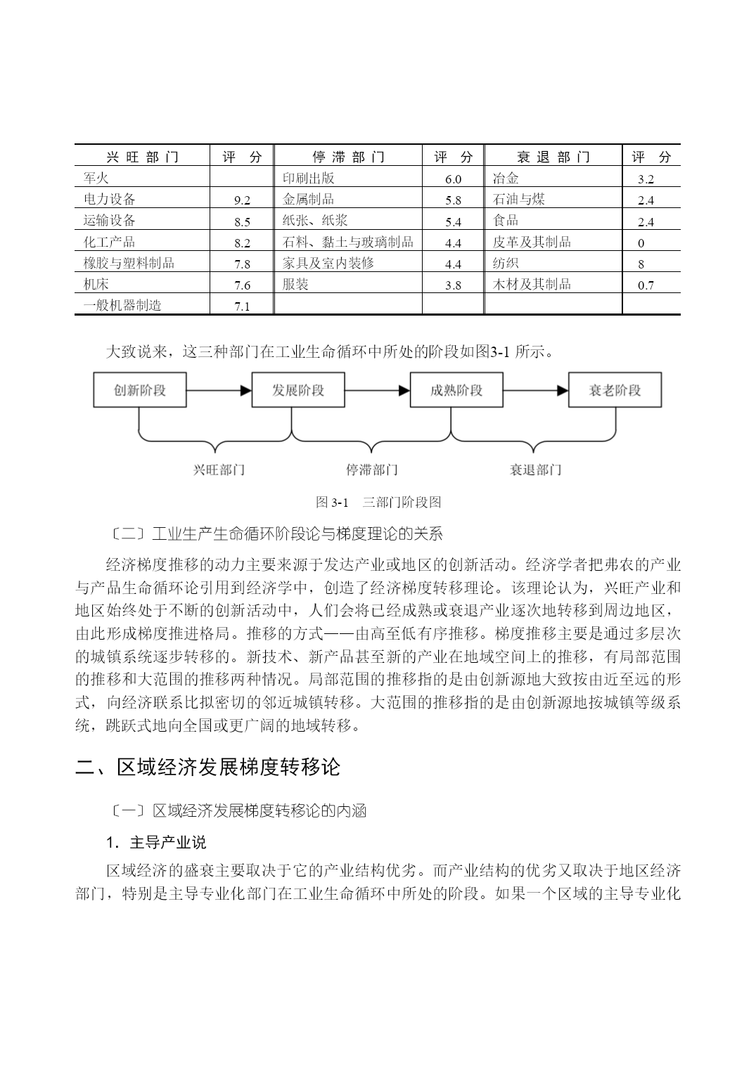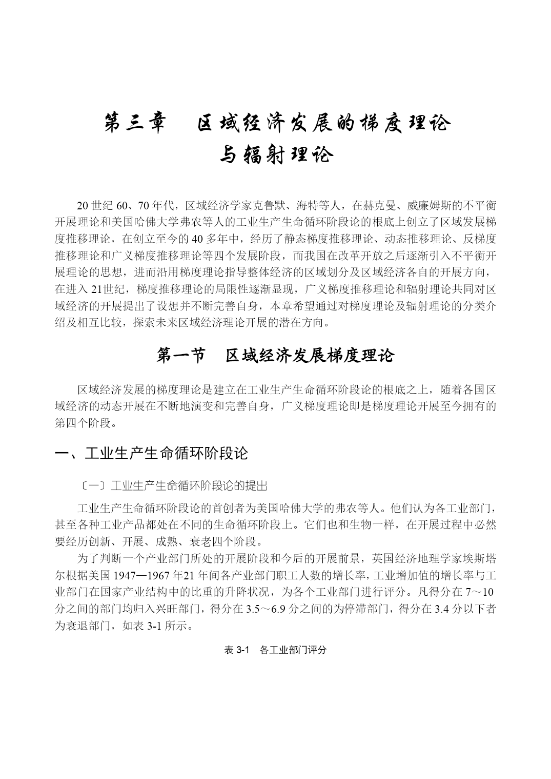 区域经济发展的梯度理论【完整版】(文档可以直接使用,也可根据实际需要修订后使用,可编辑放心下载)第三章区域经济发展的梯度理论与辐射理论20世纪60、70年代,区域经济学家克鲁默、海特等人,在赫克曼、威廉姆斯的不平衡开展理论和美国哈佛大学弗农等人的工业生产生命循环阶段论的根底上创立了区域发展梯度推移理论,在创立至今的40多年中,经历了静态梯度推移理论、动态推移理论、反梯度推移理论和广义梯度推移理论等四个发展阶段,而我国在改革开放之后逐渐引入不平衡开展理论的思想,进而沿用梯度理论指导整体经济的区域划分及区域经济各自的开展方向,在进入21世纪,梯度推移理论的局限性逐渐显现,广义梯度推移理论和辐射理论共同对区域经济的开展提出了设想并不断完善自身,本章希望通过对梯度理论及辐射理论的分类介绍及相互比较,探索未来区域经济理论开展的潜在方向。第一节区域经济发展梯度理论区域经济发展的梯度理论是建立在工业生产生命循环阶段论的根底之上,随着各国区域经济的动态开展在不断地演变和完善自身,广义梯度理论即是梯度理论开展至今拥有的第四个阶段。一、工业生产生命循环阶段论〔一〕工业生产生命循环阶段论的提出工业生产生命循环阶段论的首创者为美国哈佛大学的弗农等人。他们认为各工业部门,甚至各种工业产品都处在不同的生命循环阶段上。它们也和生物一样,在开展过程中必然要经历创新、开展、成熟、衰老四个阶段。为了判断一个产业部门所处的开展阶段和今后的开展前景,英国经济地理学家埃斯塔尔根据美国1947—1967年21年间各产业部门职工人数的增长率,工业增加值的增长率与工业部门在国家产业结构中的比重的升降状况,为各个工业部门进行评分。凡得分在7~10分之间的部门均归入兴旺部门,得分在3.5~6.9分之间的为停滞部门,得分在3.4分以下者为衰退部门,如表3-1所示。表3-1各工业部门评分兴旺部门评分停滞部门评分衰退部门评分军火印刷出版6.0冶金3.2电力设备9.2金属制品5.8石油与煤2.4运输设备8.5纸张、纸浆5.4食品2.4化工产品8.2石料、黏土与玻璃制品4.4皮革及其制品0橡胶与塑料制品7.8家具及室内装修4.4纺织8机床7.6服装3.8木材及其制品0.7一般机器制造7.1大致说来,这三种部门在工业生命循环中所处的阶段如图3-1所示。图3-1三部门阶段图〔二〕工业生产生命循环阶段论与梯度理论的关系经济梯度推移的动力主要来源于发达产业或地区的创新活动。经济学者把弗农的产业与产品生命循环论引用到经济学中,创造了经济梯度转移理论。该理论认为,兴旺产业和地区始终处于不断的创新活动中,人们会将已经成熟或衰退产业逐次地转移到周边地区,由此形成梯度推进格局。推移的方式——由高至低有序推移。梯度推移主要是通过多层次的城镇系统逐步转移的。新技术、新产品甚至新的产业在地域空间上的推移,有局部范围的推移和大范围的推移两种情况。局部范围的推移指的是由创新源地大致按由近至远的形式,向经济联系比拟密切的邻近城镇转移。大范围的推移指的是由创新源地按城镇等级系统,跳跃式地向全国或更广阔的地域转移。二、区域经济发展梯度转移论〔一〕区域经济发展梯度转移论的内涵1.主导产业说区域经济的盛衰主要取决于它的产业结构优劣。而产业结构的优劣又取决于地区经济部门,特别是主导专业化部门在工业生命循环中所处的阶段。如果一个区域的主导专业化部门主要是由处在创新阶段的兴旺部门所组成,那么不但说明它经济开展实力雄厚,而且说明它在今后一个时期内仍然可以保持发展的势头,这种地区因此被列入高梯度地区。如果一个地区的主导专业化部门都是由那些处在成熟阶段后期或衰老部门所组成,那么地区经济必然会呈现出增长缓慢、失业率上升、人均收入下降等种种不良的征兆,或已陷入严重危机之中。这种地区属于低梯度地区。2.创新活动说创新活动,包括新产业部门、新产品、新技术、新的生产管理与组织方法等大都发源于高梯度地区,然后随着时间的推移,生命循环阶段的变化,按顺序由高梯度地区向低梯度地区转移。3.城市系统扩展说梯度转移主要是通过多层次城市系统扩展开来。创新在空间上的扩展主要有局部范围的与大范围的两种形式。局部范围的扩展指的是创