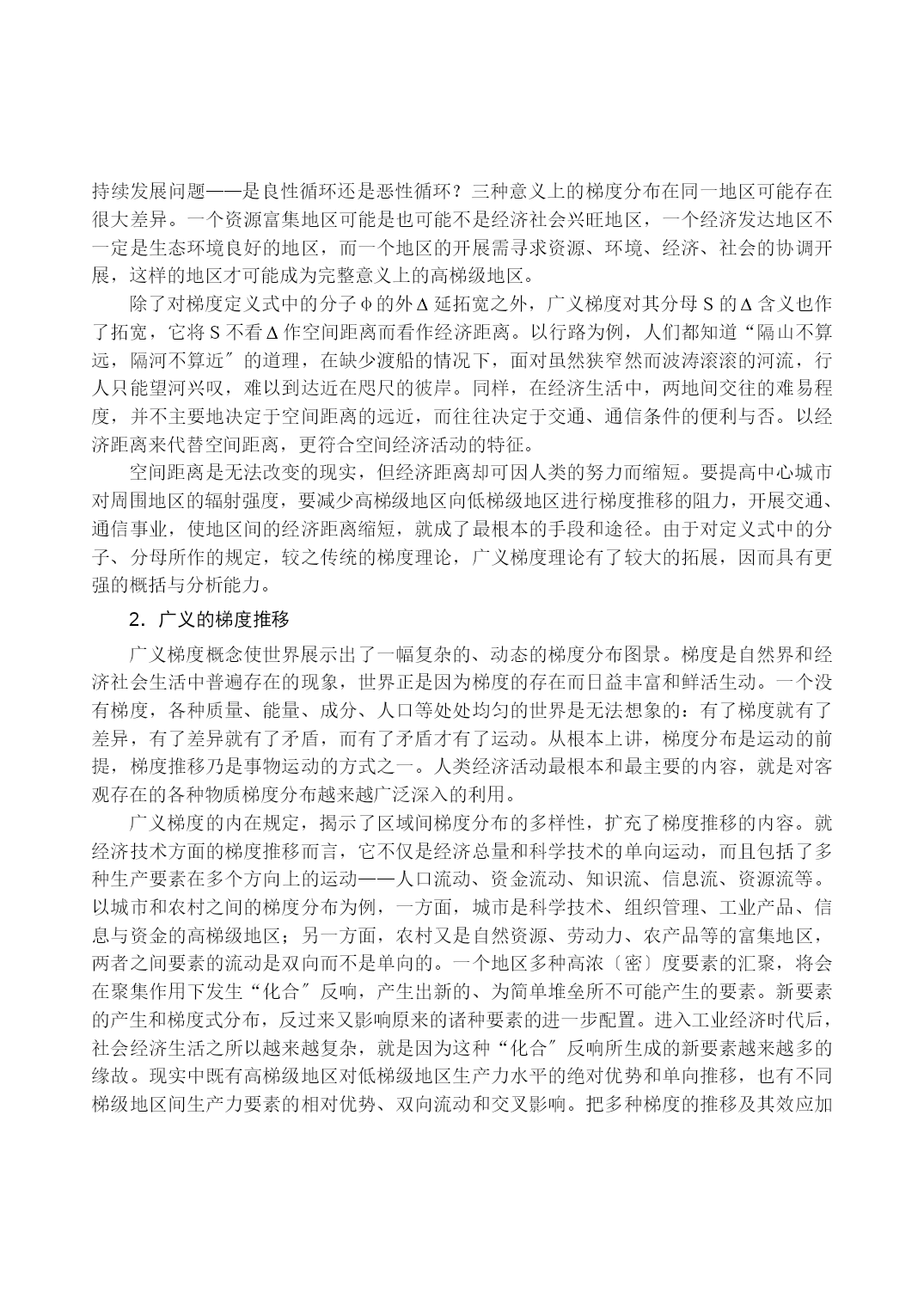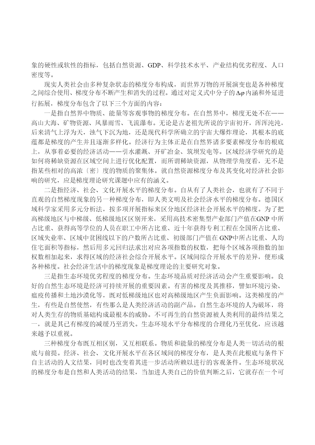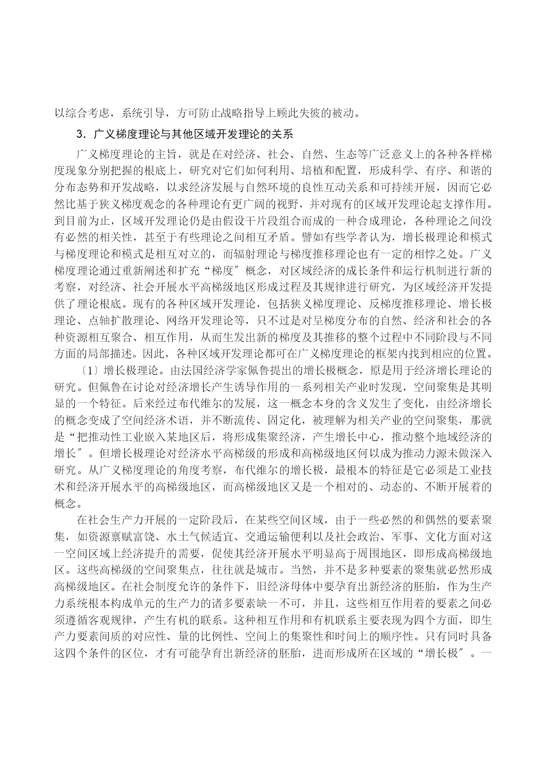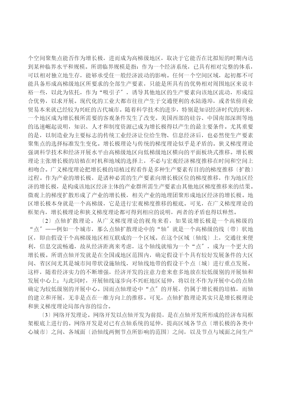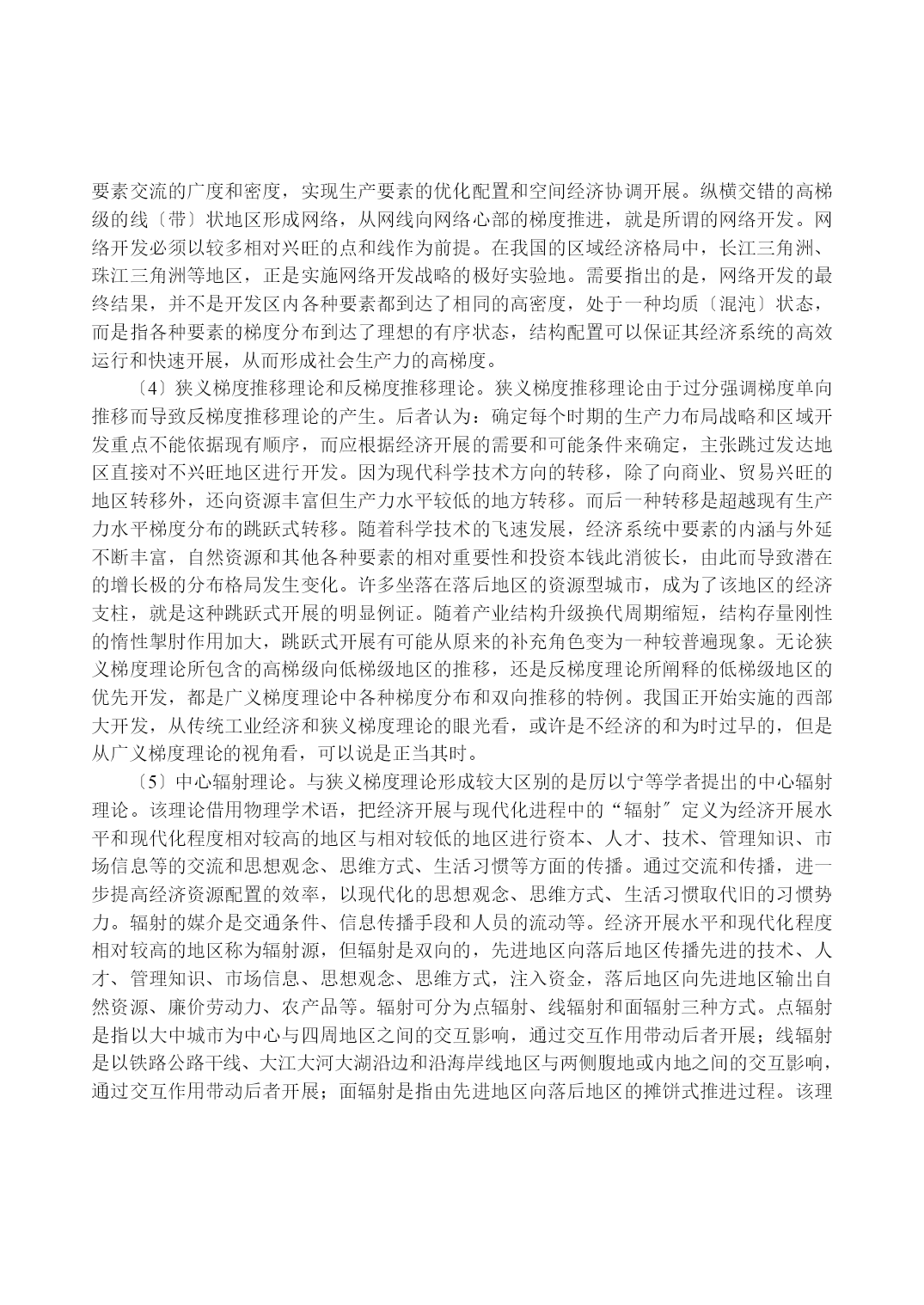 区域经济发展的梯度理论【完整版】(文档可以直接使用,也可根据实际需要修订后使用,可编辑放心下载)第三章区域经济发展的梯度理论与辐射理论20世纪60、70年代,区域经济学家克鲁默、海特等人,在赫克曼、威廉姆斯的不平衡开展理论和美国哈佛大学弗农等人的工业生产生命循环阶段论的根底上创立了区域发展梯度推移理论,在创立至今的40多年中,经历了静态梯度推移理论、动态推移理论、反梯度推移理论和广义梯度推移理论等四个发展阶段,而我国在改革开放之后逐渐引入不平衡开展理论的思想,进而沿用梯度理论指导整体经济的区域划分及区域经济各自的开展方向,在进入21世纪,梯度推移理论的局限性逐渐显现,广义梯度推移理论和辐射理论共同对区域经济的开展提出了设想并不断完善自身,本章希望通过对梯度理论及辐射理论的分类介绍及相互比较,探索未来区域经济理论开展的潜在方向。第一节区域经济发展梯度理论区域经济发展的梯度理论是建立在工业生产生命循环阶段论的根底之上,随着各国区域经济的动态开展在不断地演变和完善自身,广义梯度理论即是梯度理论开展至今拥有的第四个阶段。一、工业生产生命循环阶段论〔一〕工业生产生命循环阶段论的提出工业生产生命循环阶段论的首创者为美国哈佛大学的弗农等人。他们认为各工业部门,甚至各种工业产品都处在不同的生命循环阶段上。它们也和生物一样,在开展过程中必然要经历创新、开展、成熟、衰老四个阶段。为了判断一个产业部门所处的开展阶段和今后的开展前景,英国经济地理学家埃斯塔尔根据美国1947—1967年21年间各产业部门职工人数的增长率,工业增加值的增长率与工业部门在国家产业结构中的比重的升降状况,为各个工业部门进行评分。凡得分在7~10分之间的部门均归入兴旺部门,得分在3.5~6.9分之间的为停滞部门,得分在3.4分以下者为衰退部门,如表3-1所示。表3-1各工业部门评分兴旺部门评分停滞部门评分衰退部门评分军火印刷出版6.0冶金3.2电力设备9.2金属制品5.8石油与煤2.4运输设备8.5纸张、纸浆5.4食品2.4化工产品8.2石料、黏土与玻璃制品4.4皮革及其制品0橡胶与塑料制品7.8家具及室内装修4.4纺织8机床7.6服装3.8木材及其制品0.7一般机器制造7.1大致说来,这三种部门在工业生命循环中所处的阶段如图3-1所示。图3-1三部门阶段图〔二〕工业生产生命循环阶段论与梯度理论的关系经济梯度推移的动力主要来源于发达产业或地区的创新活动。经济学者把弗农的产业与产品生命循环论引用到经济学中,创造了经济梯度转移理论。该理论认为,兴旺产业和地区始终处于不断的创新活动中,人们会将已经成熟或衰退产业逐次地转移到周边地区,由此形成梯度推进格局。推移的方式——由高至低有序推移。梯度推移主要是通过多层次的城镇系统逐步转移的。新技术、新产品甚至新的产业在地域空间上的推移,有局部范围的推移和大范围的推移两种情况。局部范围的推移指的是由创新源地大致按由近至远的形式,向经济联系比拟密切的邻近城镇转移。大范围的推移指的是由创新源地按城镇等级系统,跳跃式地向全国或更广阔的地域转移。二、区域经济发展梯度转移论〔一〕区域经济发展梯度转移论的内涵1.主导产业说区域经济的盛衰主要取决于它的产业结构优劣。而产业结构的优劣又取决于地区经济部门,特别是主导专业化部门在工业生命循环中所处的阶段。如果一个区域的主导专业化部门主要是由处在创新阶段的兴旺部门所组成,那么不但说明它经济开展实力雄厚,而且说明它在今后一个时期内仍然可以保持发展的势头,这种地区因此被列入高梯度地区。如果一个地区的主导专业化部门都是由那些处在成熟阶段后期或衰老部门所组成,那么地区经济必然会呈现出增长缓慢、失业率上升、人均收入下降等种种不良的征兆,或已陷入严重危机之中。这种地区属于低梯度地区。2.创新活动说创新活动,包括新产业部门、新产品、新技术、新的生产管理与组织方法等大都发源于高梯度地区,然后随着时间的推移,生命循环阶段的变化,按顺序由高梯度地区向低梯度地区转移。3.城市系统扩展说梯度转移主要是通过多层次城市系统扩展开来。创新在空间上的扩展主要有局部范围的与大范围的两种形式。局部范围的扩展指的是创