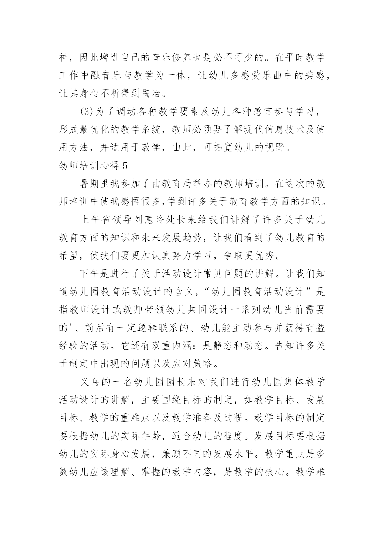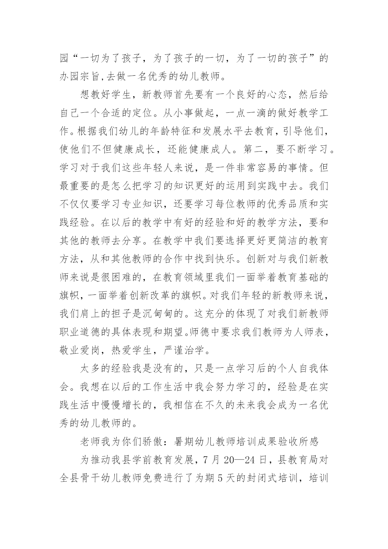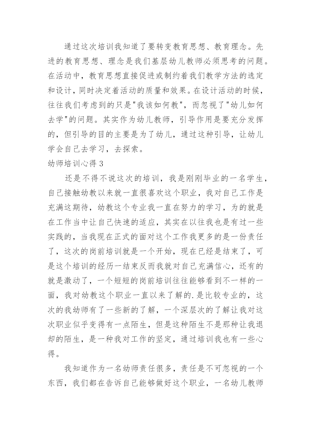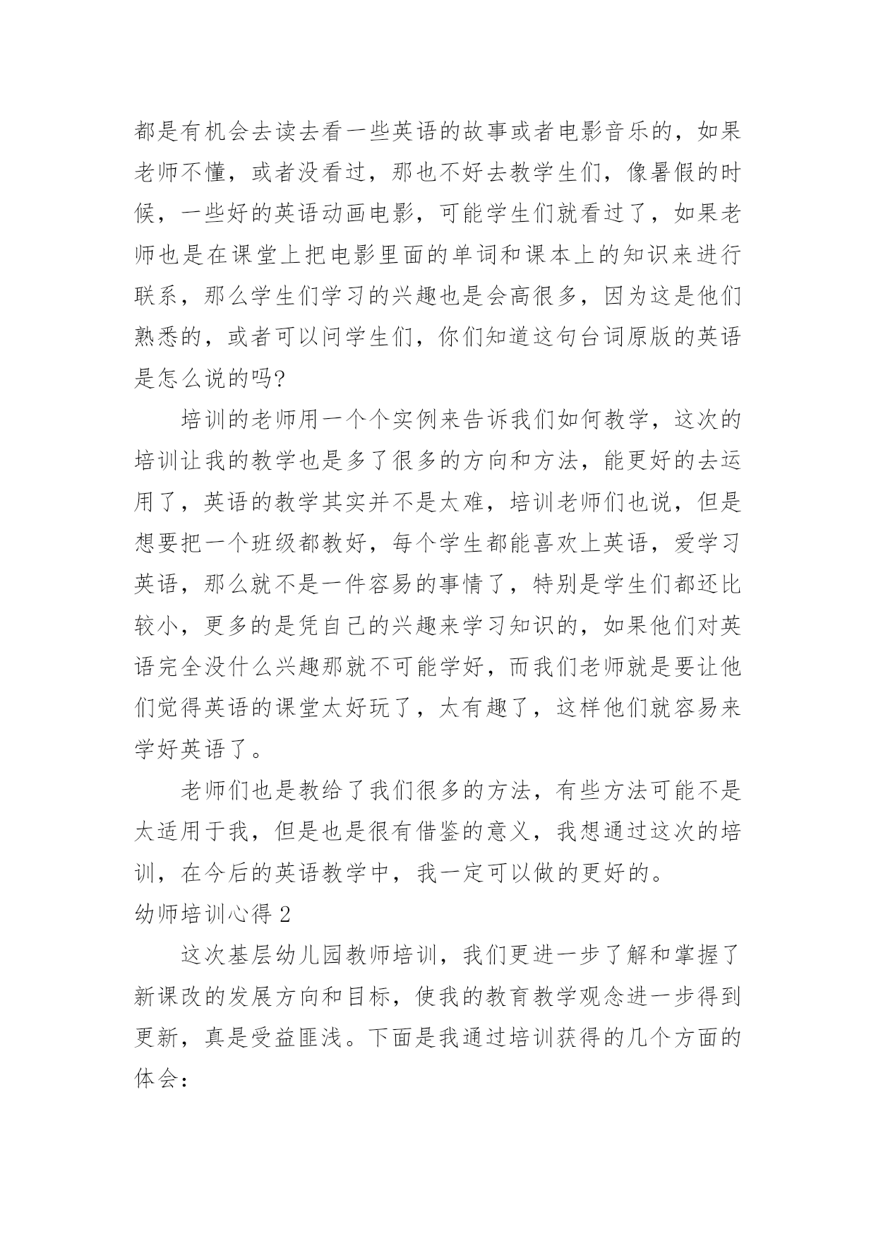 幼师培训心得幼师培训心得幼师培训心得1在秋季开学前的八月这段时间里,我和其他的英语老师都参加了我们区几个学校统一组织的英语老师的一个培训课,在这几天的一个培训里我觉得我学到的东西真的很多,而且对我以后的英语教学的工作也是有着很大的帮助的。首先培训的老师们都讲到一个,那就是我们英语小学老师的基本功一定要扎实,只有这样,才能教好学生,虽然小学的英语是相对简单的,但是其实也不是那么容易,而且像一些简单的更是需要我们去深究,像单词的读法,就是需要我们老师用标准的口音读出来,这样学生们学习的时候就能学到标准的口音,而不是还带有老师的口音,这样从源头上就让学生们学好标准的英语口音,更有利于他们以后的学习,同时也是只有我们的基本功扎实了,给学生们写单词或者字母的时候,书写一定要漂亮标准,让学生们从一开始就不会把字母写得歪歪扭扭的。而且老师的基本功扎实,也能让课堂更加的生动有趣,而不是只讲课本的知识,让学生们觉得这个英语课好没有意思。还有就是我们英语老师也是要不断的学习的,不断的提高,跟上时代,让学生们能更好的学习,像现在的.学生们都是有机会去读去看一些英语的故事或者电影音乐的,如果老师不懂,或者没看过,那也不好去教学生们,像暑假的时候,一些好的英语动画电影,可能学生们就看过了,如果老师也是在课堂上把电影里面的单词和课本上的知识来进行联系,那么学生们学习的兴趣也是会高很多,因为这是他们熟悉的,或者可以问学生们,你们知道这句台词原版的英语是怎么说的吗?培训的老师用一个个实例来告诉我们如何教学,这次的培训让我的教学也是多了很多的方向和方法,能更好的去运用了,英语的教学其实并不是太难,培训老师们也说,但是想要把一个班级都教好,每个学生都能喜欢上英语,爱学习英语,那么就不是一件容易的事情了,特别是学生们都还比较小,更多的是凭自己的兴趣来学习知识的,如果他们对英语完全没什么兴趣那就不可能学好,而我们老师就是要让他们觉得英语的课堂太好玩了,太有趣了,这样他们就容易来学好英语了。老师们也是教给了我们很多的方法,有些方法可能不是太适用于我,但是也是很有借鉴的意义,我想通过这次的培训,在今后的英语教学中,我一定可以做的更好的。幼师培训心得2这次基层幼儿园教师培训,我们更进一步了解和掌握了新课改的发展方向和目标,使我的教育教学观念进一步得到更新,真是受益匪浅。下面是我通过培训获得的几个方面的体会:一、广泛学习科学的教育理论。县幼儿园园长张梅霞在幼儿教育科学理论方面的阐述简要精辟,为我们的教学实践起了提纲挈领的作用,为我们的教育科学理论注入了源头活水,他们又结合幼儿园实际工作让我们了解如何在幼儿园进行教学工作。幼儿园教育工作应该坚持体、智、德、美诸方面的`教育互相渗透,有机结合。遵循幼儿身心发展的规律,符合幼儿的年龄特点,注重个体差异,因人施教,引导幼儿个性健康发展。幼儿教育要面向全体幼儿,热爱幼儿,坚持积极鼓励,启发诱导。合理地综合组织各方面的教育内容,并渗透于幼儿一日生活的各项活动中,充分发挥各种教育手段的交互作用。创设与教育相适应的良好环境,为幼儿提供活动和表现能力的机会与条件。以游戏为基本活动,寓教育于各项活动中。二、学习技能技巧,提高个人能力。这次的培训还给我们安排了县幼儿园部分骨干教师的示范课,跟着县幼儿园领导和骨干教师学习,我们获得了很大帮助。康东芳老师的体育教育示范课让我们目不暇接。在她手里,简单的一张报纸摇身一变就成了很好的教育资源,成了孩子们游戏的体育用品。一会儿让孩子们把报纸穿在身上跑,和报纸比赛,一会儿把报纸揉成小纸团投掷。孩子们玩的乐此不彼。整个教学都在活动中完成,遵循幼儿的身心发展规律,符合幼儿的心理特点,值得我们去认真研究与学习。通过这次培训我知道了要转变教育思想、教育理念。先进的教育思想、理念是我们基层幼儿教师必须思考的问题。在活动中,教育思想直接促进或制约着我们教学方法的选定和设计,同时决定着活动的质量和效果。在设计活动的时候,往往我们考虑到的只是"我该如何教",而忽视了"幼儿如何去学"的问题。其实作为幼儿教师,引导作用是要充分发挥的,但引导的目的主要是为了幼儿,通过这种引导,让幼儿学会自己去学习,去探索。幼师培训心得3还是不得不说这次的培训,我是刚刚毕业的一名学生,自己接触幼教以来就一直很喜欢这个职业,我对自己工作是充满这期待,幼教这个专业我一直在努力的学习,为的就是在工作当中让自己快速的适应,其实在以往我也是有过一些实践的,当我现在正式的面对这个工作我更多的是一份责任了,这次的岗前培训就是一个开始,现在已经是结束了,可是这个培训的经历一结束反而我就对自己充满信心,还有的就是激动了,一个短短的岗前培训往往能够看到不一样的一面,我对幼教这个职业一直以来了解的.是比较专业的,这次的我幼师有了一些新的了解,一个深层次的了解让我对这