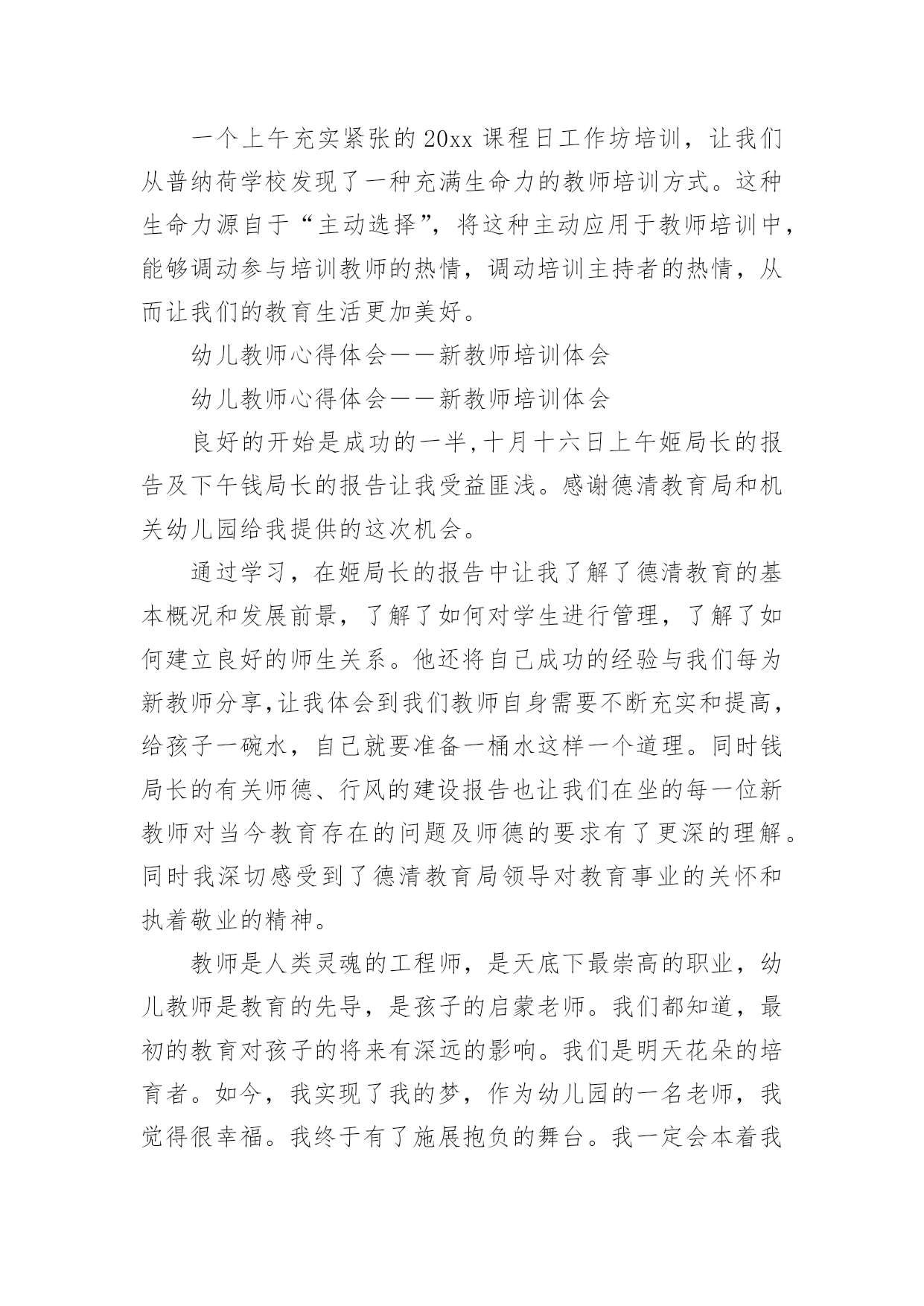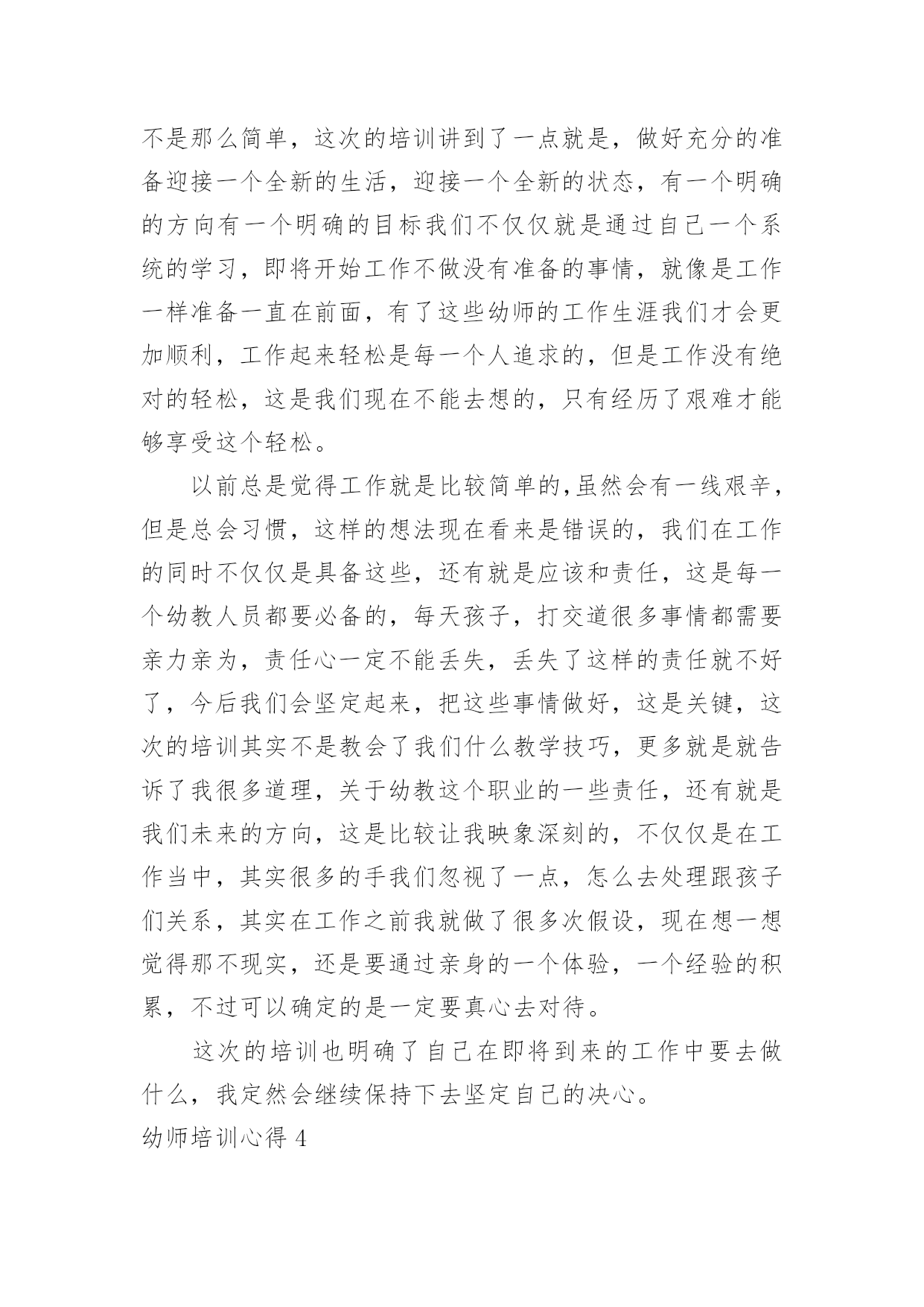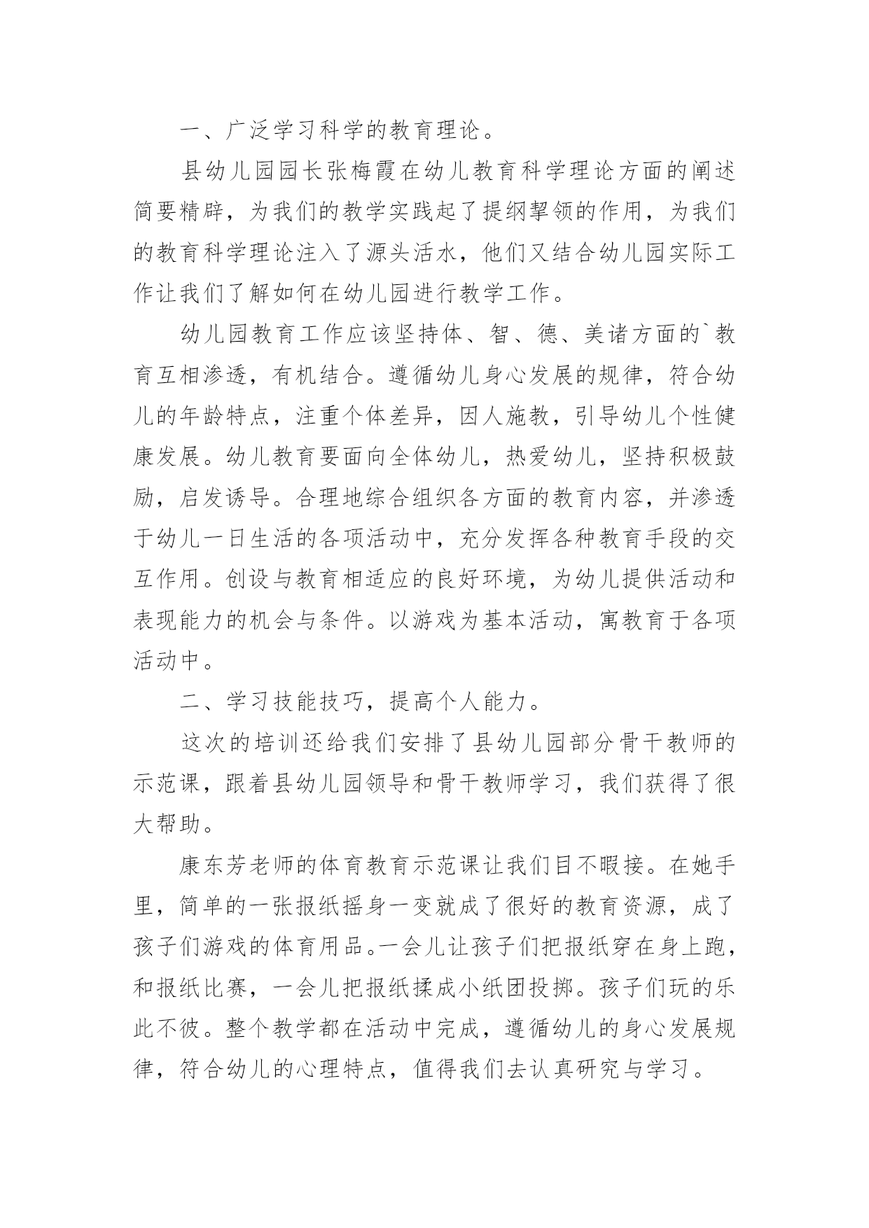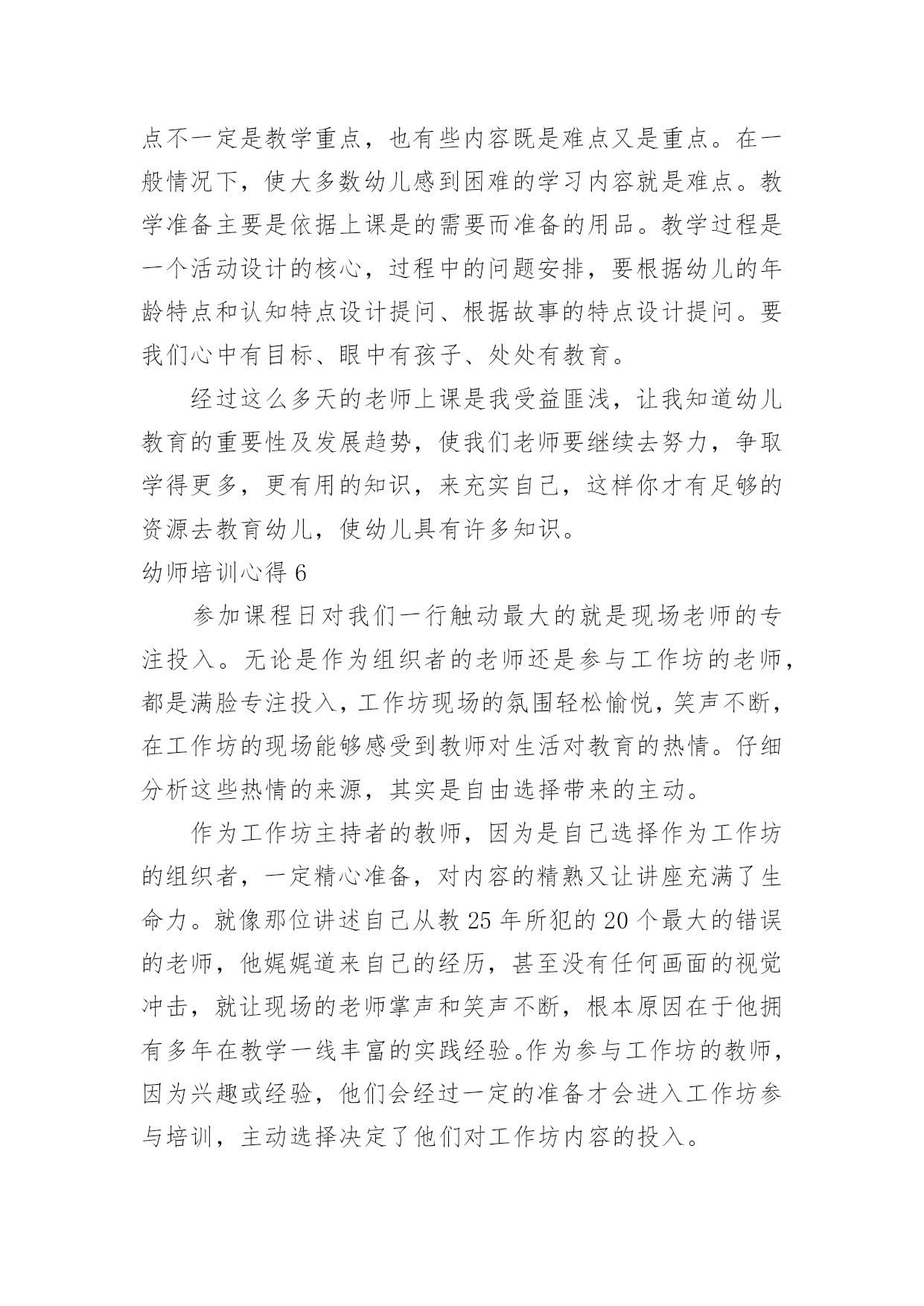 幼师培训心得幼师培训心得幼师培训心得1在秋季开学前的八月这段时间里,我和其他的英语老师都参加了我们区几个学校统一组织的英语老师的一个培训课,在这几天的一个培训里我觉得我学到的东西真的很多,而且对我以后的英语教学的工作也是有着很大的帮助的。首先培训的老师们都讲到一个,那就是我们英语小学老师的基本功一定要扎实,只有这样,才能教好学生,虽然小学的英语是相对简单的,但是其实也不是那么容易,而且像一些简单的更是需要我们去深究,像单词的读法,就是需要我们老师用标准的口音读出来,这样学生们学习的时候就能学到标准的口音,而不是还带有老师的口音,这样从源头上就让学生们学好标准的英语口音,更有利于他们以后的学习,同时也是只有我们的基本功扎实了,给学生们写单词或者字母的时候,书写一定要漂亮标准,让学生们从一开始就不会把字母写得歪歪扭扭的。而且老师的基本功扎实,也能让课堂更加的生动有趣,而不是只讲课本的知识,让学生们觉得这个英语课好没有意思。还有就是我们英语老师也是要不断的学习的,不断的提高,跟上时代,让学生们能更好的学习,像现在的.学生们都是有机会去读去看一些英语的故事或者电影音乐的,如果老师不懂,或者没看过,那也不好去教学生们,像暑假的时候,一些好的英语动画电影,可能学生们就看过了,如果老师也是在课堂上把电影里面的单词和课本上的知识来进行联系,那么学生们学习的兴趣也是会高很多,因为这是他们熟悉的,或者可以问学生们,你们知道这句台词原版的英语是怎么说的吗?培训的老师用一个个实例来告诉我们如何教学,这次的培训让我的教学也是多了很多的方向和方法,能更好的去运用了,英语的教学其实并不是太难,培训老师们也说,但是想要把一个班级都教好,每个学生都能喜欢上英语,爱学习英语,那么就不是一件容易的事情了,特别是学生们都还比较小,更多的是凭自己的兴趣来学习知识的,如果他们对英语完全没什么兴趣那就不可能学好,而我们老师就是要让他们觉得英语的课堂太好玩了,太有趣了,这样他们就容易来学好英语了。老师们也是教给了我们很多的方法,有些方法可能不是太适用于我,但是也是很有借鉴的意义,我想通过这次的培训,在今后的英语教学中,我一定可以做的更好的。幼师培训心得2这次基层幼儿园教师培训,我们更进一步了解和掌握了新课改的发展方向和目标,使我的教育教学观念进一步得到更新,真是受益匪浅。下面是我通过培训获得的几个方面的体会:一、广泛学习科学的教育理论。县幼儿园园长张梅霞在幼儿教育科学理论方面的阐述简要精辟,为我们的教学实践起了提纲挈领的作用,为我们的教育科学理论注入了源头活水,他们又结合幼儿园实际工作让我们了解如何在幼儿园进行教学工作。幼儿园教育工作应该坚持体、智、德、美诸方面的`教育互相渗透,有机结合。遵循幼儿身心发展的规律,符合幼儿的年龄特点,注重个体差异,因人施教,引导幼儿个性健康发展。幼儿教育要面向全体幼儿,热爱幼儿,坚持积极鼓励,启发诱导。合理地综合组织各方面的教育内容,并渗透于幼儿一日生活的各项活动中,充分发挥各种教育手段的交互作用。创设与教育相适应的良好环境,为幼儿提供活动和表现能力的机会与条件。以游戏为基本活动,寓教育于各项活动中。二、学习技能技巧,提高个人能力。这次的培训还给我们安排了县幼儿园部分骨干教师的示范课,跟着县幼儿园领导和骨干教师学习,我们获得了很大帮助。康东芳老师的体育教育示范课让我们目不暇接。在她手里,简单的一张报纸摇身一变就成了很好的教育资源,成了孩子们游戏的体育用品。一会儿让孩子们把报纸穿在身上跑,和报纸比赛,一会儿把报纸揉成小纸团投掷。孩子们玩的乐此不彼。整个教学都在活动中完成,遵循幼儿的身心发展规律,符合幼儿的心理特点,值得我们去认真研究与学习。通过这次培训我知道了要转变教育思想、教育理念。先进的教育思想、理念是我们基层幼儿教师必须思考的问题。在活动中,教育思想直接促进或制约着我们教学方法的选定和设计,同时决定着活动的质量和效果。在设计活动的时候,往往我们考虑到的只是"我该如何教",而忽视了"幼儿如何去学"的问题。其实作为幼儿教师,引导作用是要充分发挥的,但引导的目的主要是为了幼儿,通过这种引导,让幼儿学会自己去学习,去探索。幼师培训心得3还是不得不说这次的培训,我是刚刚毕业的一名学生,自己接触幼教以来就一直很喜欢这个职业,我对自己工作是充满这期待,幼教这个专业我一直在努力的学习,为的就是在工作当中让自己快速的适应,其实在以往我也是有过一些实践的,当我现在正式的面对这个工作我更多的是一份责任了,这次的岗前培训就是一个开始,现在已经是结束了,可是这个培训的经历一结束反而我就对自己充满信心,还有的就是激动了,一个短短的岗前培训往往能够看到不一样的一面,我对幼教这个职业一直以来了解的.是比较专业的,这次的我幼师有了一些新的了解,一个深层次的了解让我对这