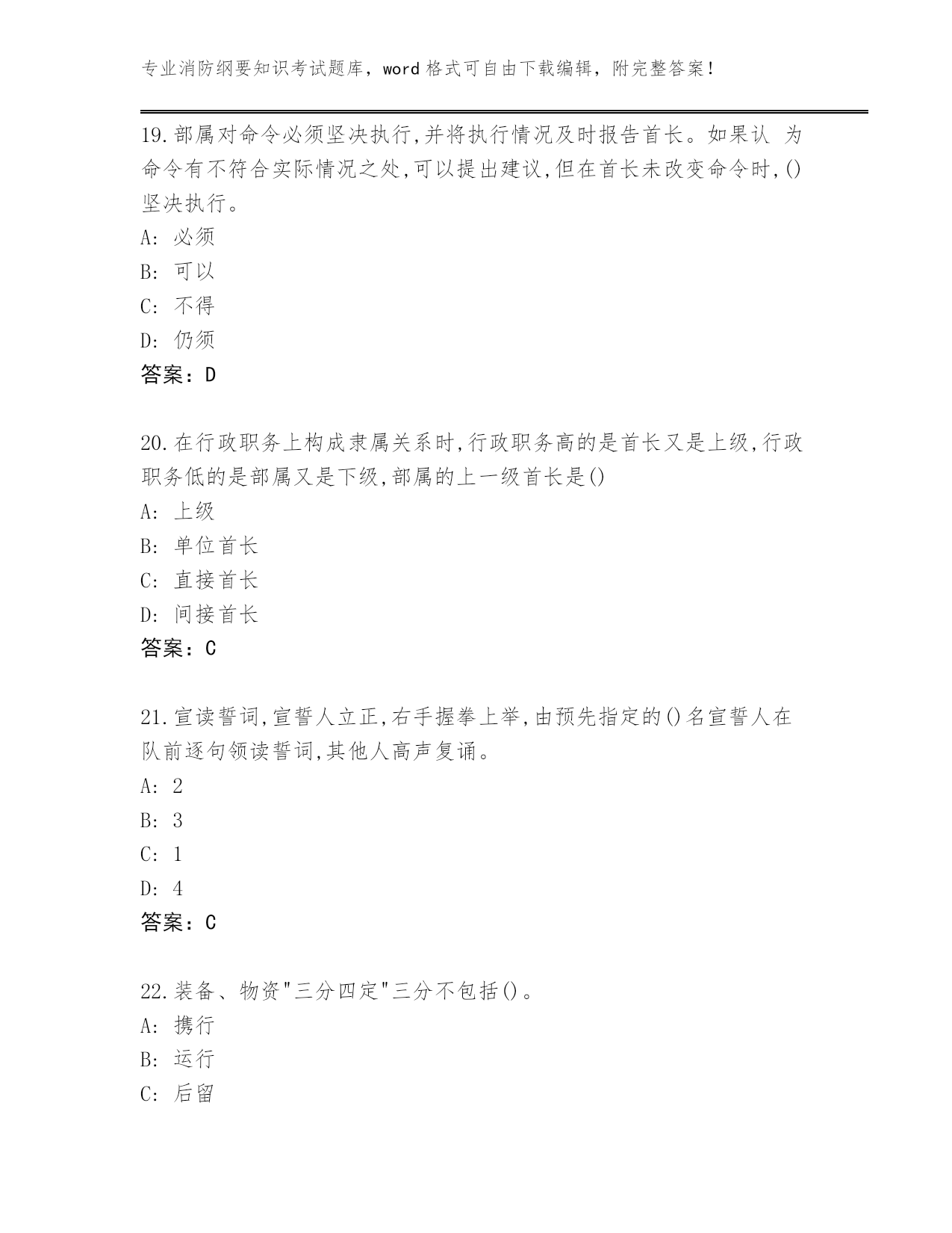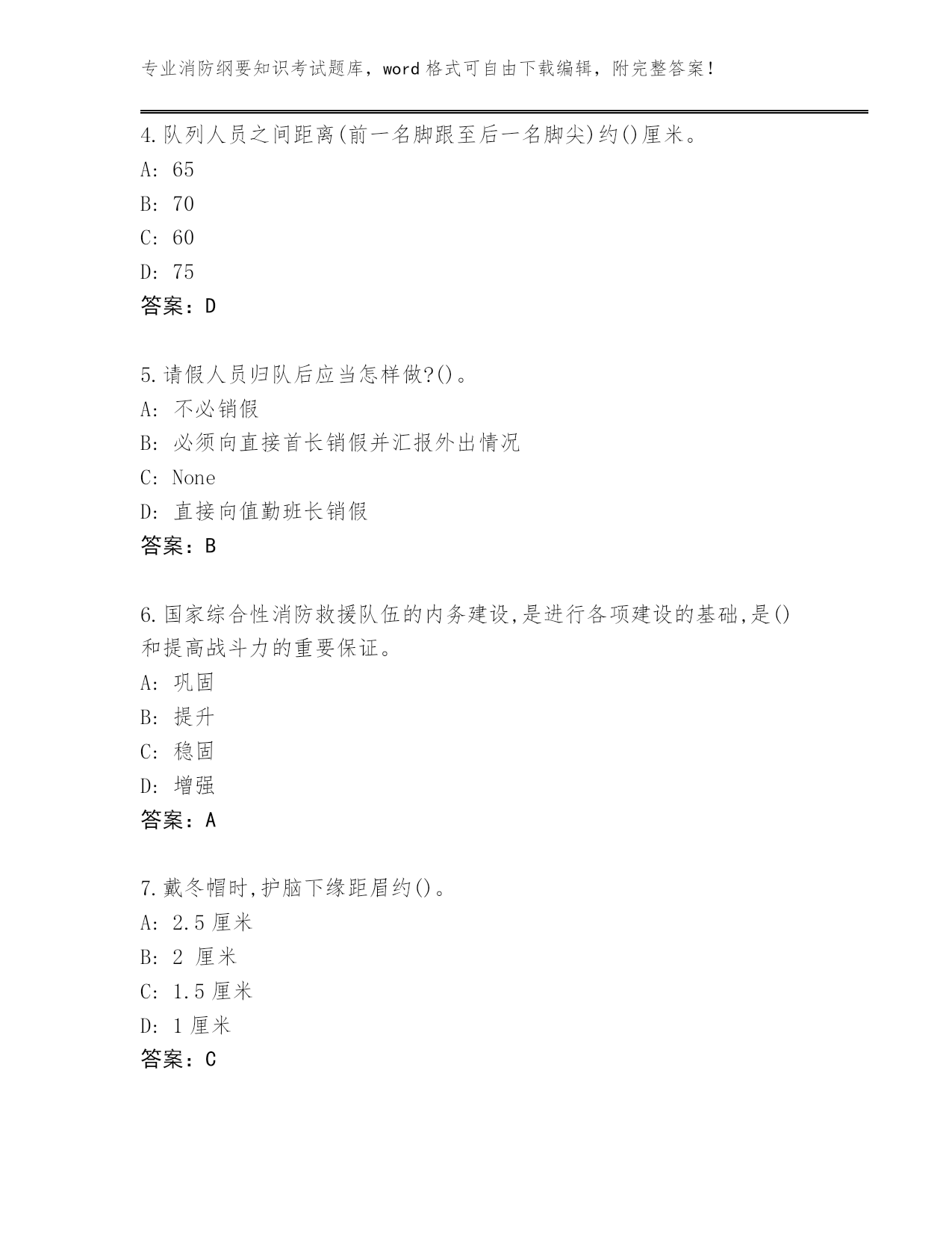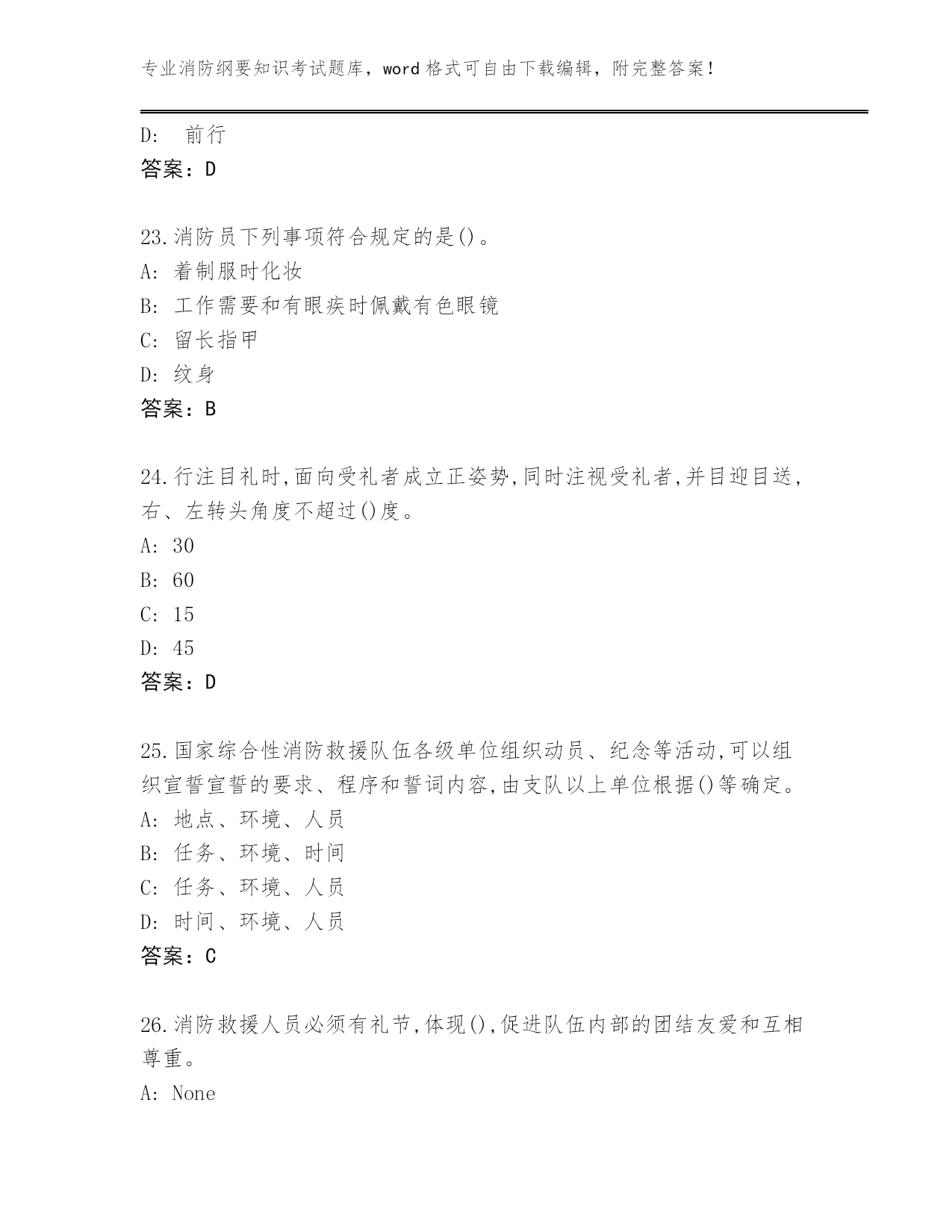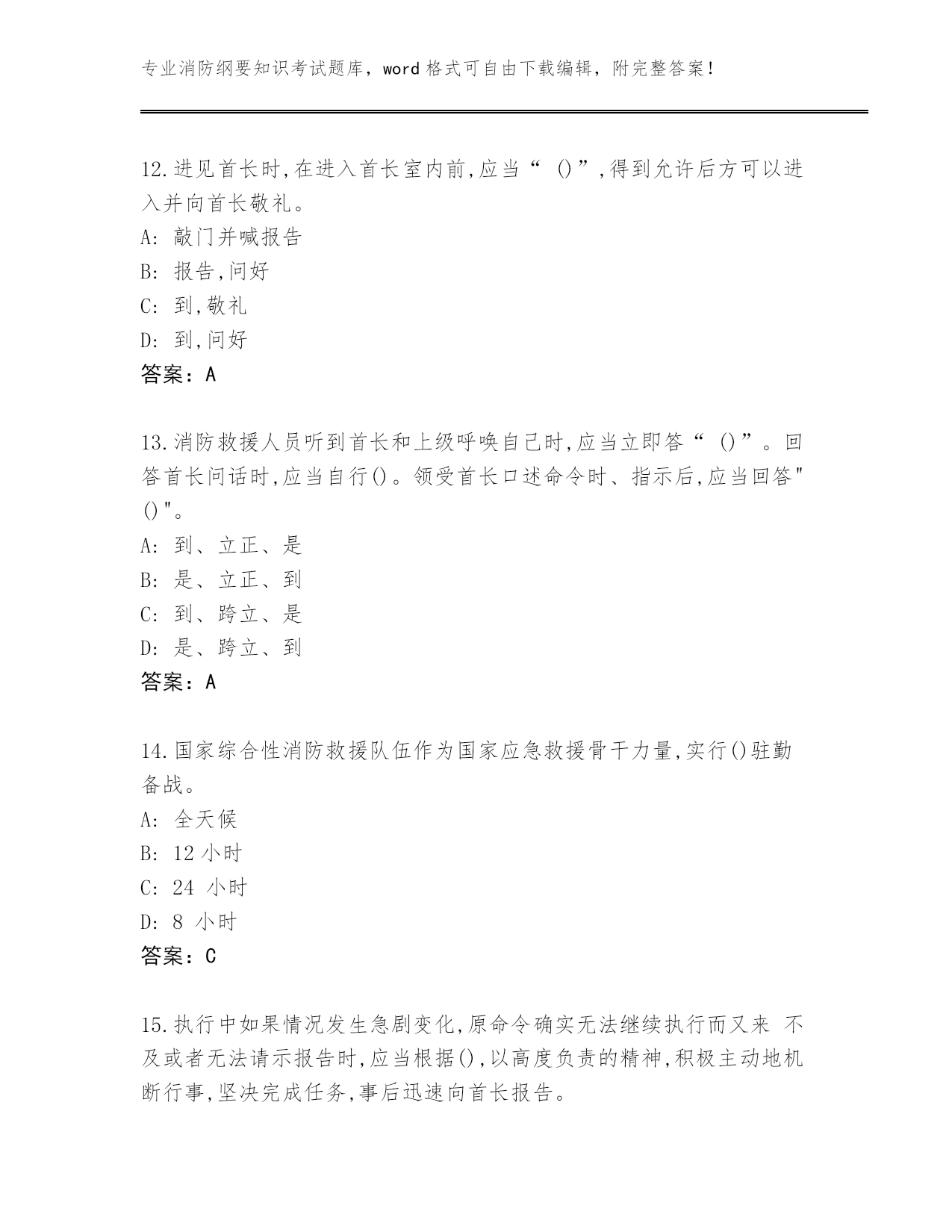专业消防纲要知识考试题库,word格式可自由下载编辑,附完整答案!历年辽宁省消防纲要知识考试完整版【考试直接用】第I部分单选题(100题)1.《内务条令》规定,干部对消防员应当做到以下几点,除了()。A:公道正派,对待消防员一视同仁B:以身作则,依法管理,耐心说服教育,关心消防员的成长进步C:忠诚老实,主动汇报思想D:不打骂体罚和侮辱消防员,不收受消防员的钱物,不侵占消防员利益答案:C2.部属接到越级下达的命令,必须坚决执行。在执行的同时,()向直接首长报告;因故不能及时报告的,应当在情况允许时迅速补报。A:及时B:事后C:立即D:应当答案:D3.消防救援人员临时离开原单位到其他单位工作时,应当接受()的领导和管理。A:上级指定首长B:所到单位首长C:原单位首长D:其他首长答案:B4.队列人员之间距离(前一名脚跟至后一名脚尖)约()厘米。A:65B:70C:60D:75答案:D5.请假人员归队后应当怎样做?()。A:不必销假B:必须向直接首长销假并汇报外出情况C:NoneD:直接向值勤班长销假答案:B6.国家综合性消防救援队伍的内务建设,是进行各项建设的基础,是()和提高战斗力的重要保证。A:巩固B:提升C:稳固D:增强答案:A7.戴冬帽时,护脑下缘距眉约()。A:2.5厘米B:2厘米C:1.5厘米D:1厘米答案:C8.国家综合性消防救援队伍的内务建设,必须始终聚焦职责使命。牢固树立战斗队思想,坚持()这个唯一的根本的标准。A:行动力B:主力军C:国家队D:战斗力答案:D9.休息日的前一天可以推迟就寝,时间通常不超过()。A:2小时B:1小时C:半小时D:3小时答案:B10.当国家综合性消防救援队伍的单位、人员配属某一单位时,即与该单位构成临时()关系。A:相邻B:友邻C:隶属D:上下答案:C11.队伍紧急战备或工作需要召回时,请假、休假应当怎样做?()。A:请假、休假的人员可根据情况归队B:NoneC:请假、休假的人员应当立即归队D:请假、休假的人员可不必返归队答案:C12.进见首长时,在进入首长室内前,应当“()”,得到允许后方可以进入并向首长敬礼。A:敲门并喊报告B:报告,问好C:到,敬礼D:到,问好答案:A13.消防救援人员听到首长和上级呼唤自己时,应当立即答“()”。回答首长问话时,应当自行()。领受首长口述命令时、指示后,应当回答"()"。A:到、立正、是B:是、立正、到C:到、跨立、是D:是、跨立、到答案:A14.国家综合性消防救援队伍作为国家应急救援骨干力量,实行()驻勤备战。A:全天候B:12小时C:24小时D:8小时答案:C15.执行中如果情况发生急剧变化,原命令确实无法继续执行而又来不及或者无法请示报告时,应当根据(),以高度负责的精神,积极主动地机断行事,坚决完成任务,事后迅速向首长报告。A:突发情况B:上级命令C:现场情况D:首长总的意图答案:D16.跨立时,左脚向左跨出约()脚之长,两腿挺直。A:NoneB:三C:二D:一答案:D17.队旗分为部级、局级、总队级、()四个等级。A:大队级B:支队级C:部局级D:中队级答案:B18.除宣誓仪式、晋升(授予)消防救援仪式、授旗仪式等重要集体活动外,着制式服装进入室内通常(),按照规定放置。A:脱去外穿服装B:自行脱帽C:NoneD:脱鞋答案:B19.部属对命令必须坚决执行,并将执行情况及时报告首长。如果认为命令有不符合实际情况之处,可以提出建议,但在首长未改变命令时,()坚决执行。A:必须B:可以C:不得D:仍须答案:D20.在行政职务上构成隶属关系时,行政职务高的是首长又是上级,行政职务低的是部属又是下级,部属的上一级首长是()A:上级B:单位首长C:直接首长D:间接首长答案:C21.宣读誓词,宣誓人立正,右手握拳上举,由预先指定的()名宣誓人在队前逐句领读誓词,其他人高声复诵。A:2B:3C:1D:4答案:C22.装备、物资"三分四定"三分不包括()。A:携行B:运行C:后留D:前行答案:D23.消防员下列事项符合规定的是()。A:着制服时化妆B:工作需要和有眼疾时佩戴有色眼镜C:留长指甲D:纹身答案:B24.行注目礼时,面向受礼者成立正姿势,同时注视受礼者,并目迎目送,右、左转头角度不超过()度。A:30B:60C:15D:45答案:D25.国家综合性消防救援队伍各级单位组织动员、纪念等活动,可以组织