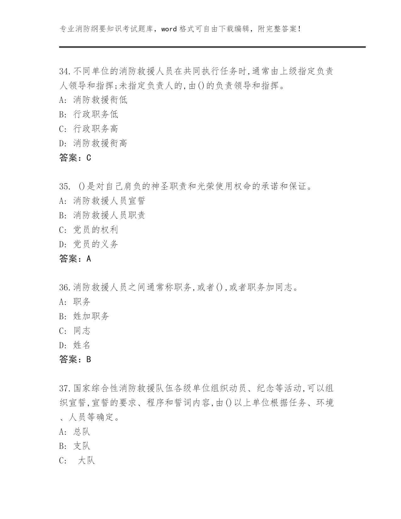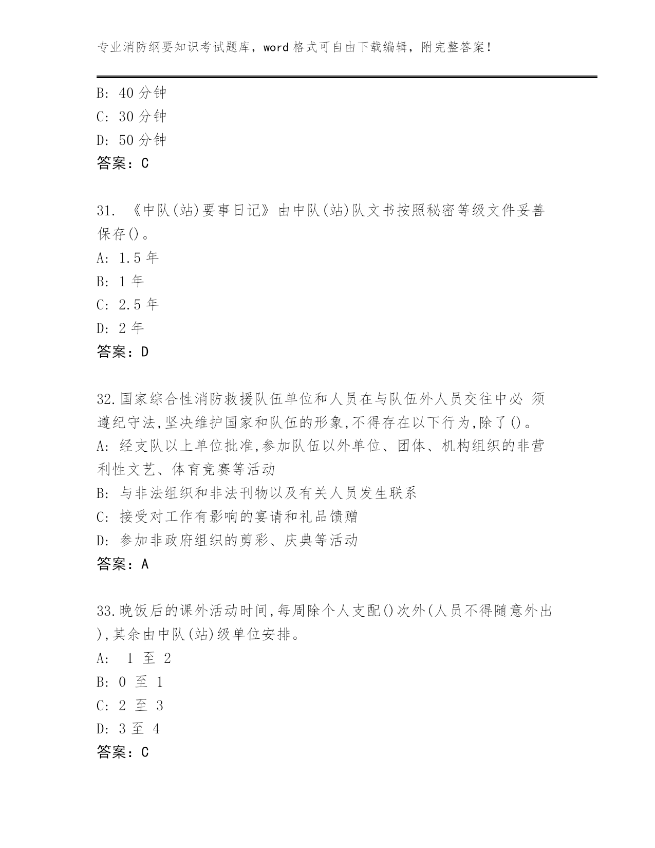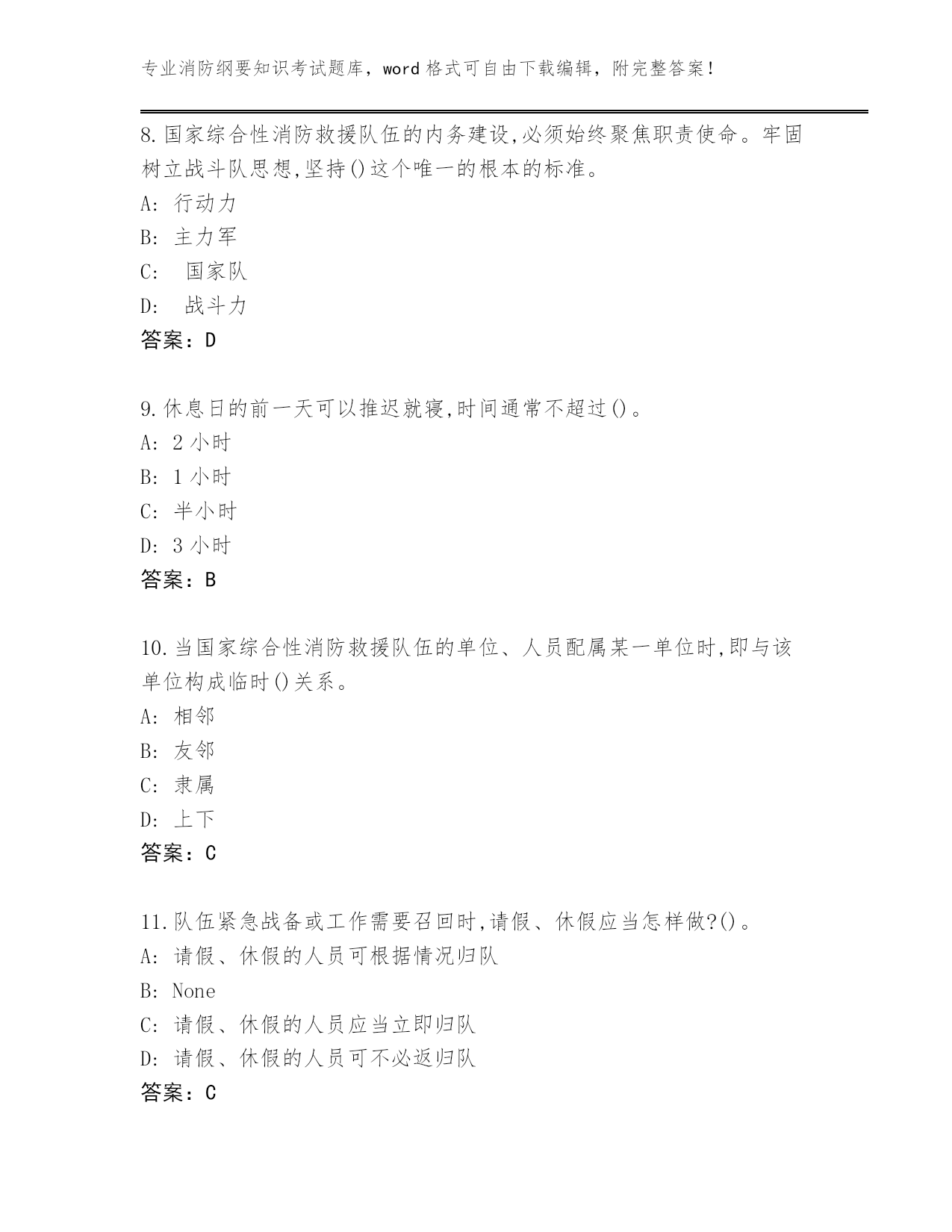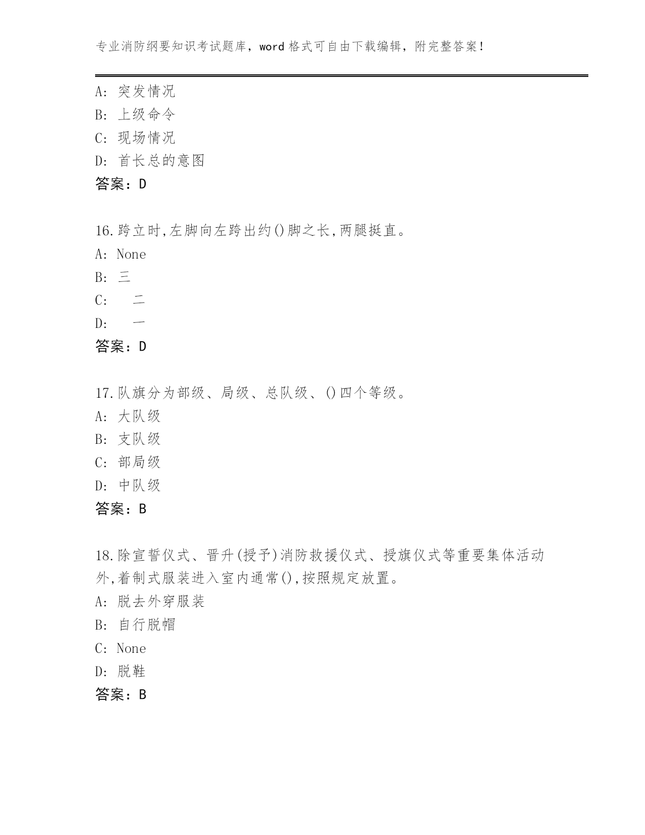 专业消防纲要知识考试题库,word格式可自由下载编辑,附完整答案!历年辽宁省消防纲要知识考试完整版【考试直接用】第I部分单选题(100题)1.《内务条令》规定,干部对消防员应当做到以下几点,除了()。A:公道正派,对待消防员一视同仁B:以身作则,依法管理,耐心说服教育,关心消防员的成长进步C:忠诚老实,主动汇报思想D:不打骂体罚和侮辱消防员,不收受消防员的钱物,不侵占消防员利益答案:C2.部属接到越级下达的命令,必须坚决执行。在执行的同时,()向直接首长报告;因故不能及时报告的,应当在情况允许时迅速补报。A:及时B:事后C:立即D:应当答案:D3.消防救援人员临时离开原单位到其他单位工作时,应当接受()的领导和管理。A:上级指定首长B:所到单位首长C:原单位首长D:其他首长答案:B4.队列人员之间距离(前一名脚跟至后一名脚尖)约()厘米。A:65B:70C:60D:75答案:D5.请假人员归队后应当怎样做?()。A:不必销假B:必须向直接首长销假并汇报外出情况C:NoneD:直接向值勤班长销假答案:B6.国家综合性消防救援队伍的内务建设,是进行各项建设的基础,是()和提高战斗力的重要保证。A:巩固B:提升C:稳固D:增强答案:A7.戴冬帽时,护脑下缘距眉约()。A:2.5厘米B:2厘米C:1.5厘米D:1厘米答案:C8.国家综合性消防救援队伍的内务建设,必须始终聚焦职责使命。牢固树立战斗队思想,坚持()这个唯一的根本的标准。A:行动力B:主力军C:国家队D:战斗力答案:D9.休息日的前一天可以推迟就寝,时间通常不超过()。A:2小时B:1小时C:半小时D:3小时答案:B10.当国家综合性消防救援队伍的单位、人员配属某一单位时,即与该单位构成临时()关系。A:相邻B:友邻C:隶属D:上下答案:C11.队伍紧急战备或工作需要召回时,请假、休假应当怎样做?()。A:请假、休假的人员可根据情况归队B:NoneC:请假、休假的人员应当立即归队D:请假、休假的人员可不必返归队答案:C12.进见首长时,在进入首长室内前,应当“()”,得到允许后方可以进入并向首长敬礼。A:敲门并喊报告B:报告,问好C:到,敬礼D:到,问好答案:A13.消防救援人员听到首长和上级呼唤自己时,应当立即答“()”。回答首长问话时,应当自行()。领受首长口述命令时、指示后,应当回答"()"。A:到、立正、是B:是、立正、到C:到、跨立、是D:是、跨立、到答案:A14.国家综合性消防救援队伍作为国家应急救援骨干力量,实行()驻勤备战。A:全天候B:12小时C:24小时D:8小时答案:C15.执行中如果情况发生急剧变化,原命令确实无法继续执行而又来不及或者无法请示报告时,应当根据(),以高度负责的精神,积极主动地机断行事,坚决完成任务,事后迅速向首长报告。A:突发情况B:上级命令C:现场情况D:首长总的意图答案:D16.跨立时,左脚向左跨出约()脚之长,两腿挺直。A:NoneB:三C:二D:一答案:D17.队旗分为部级、局级、总队级、()四个等级。A:大队级B:支队级C:部局级D:中队级答案:B18.除宣誓仪式、晋升(授予)消防救援仪式、授旗仪式等重要集体活动外,着制式服装进入室内通常(),按照规定放置。A:脱去外穿服装B:自行脱帽C:NoneD:脱鞋答案:B19.部属对命令必须坚决执行,并将执行情况及时报告首长。如果认为命令有不符合实际情况之处,可以提出建议,但在首长未改变命令时,()坚决执行。A:必须B:可以C:不得D:仍须答案:D20.在行政职务上构成隶属关系时,行政职务高的是首长又是上级,行政职务低的是部属又是下级,部属的上一级首长是()A:上级B:单位首长C:直接首长D:间接首长答案:C21.宣读誓词,宣誓人立正,右手握拳上举,由预先指定的()名宣誓人在队前逐句领读誓词,其他人高声复诵。A:2B:3C:1D:4答案:C22.装备、物资"三分四定"三分不包括()。A:携行B:运行C:后留D:前行答案:D23.消防员下列事项符合规定的是()。A:着制服时化妆B:工作需要和有眼疾时佩戴有色眼镜C:留长指甲D:纹身答案:B24.行注目礼时,面向受礼者成立正姿势,同时注视受礼者,并目迎目送,右、左转头角度不超过()度。A:30B:60C:15D:45答案:D25.国家综合性消防救援队伍各级单位组织动员、纪念等活动,可以组织