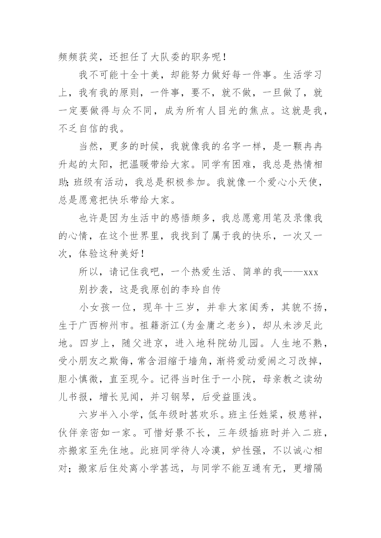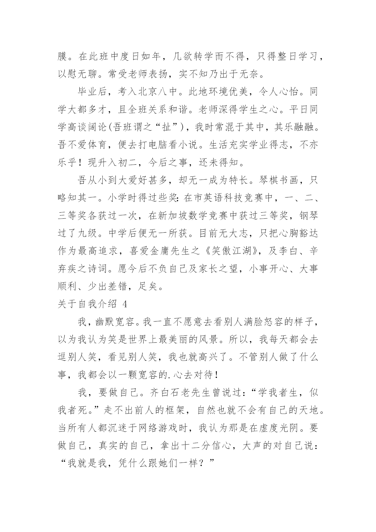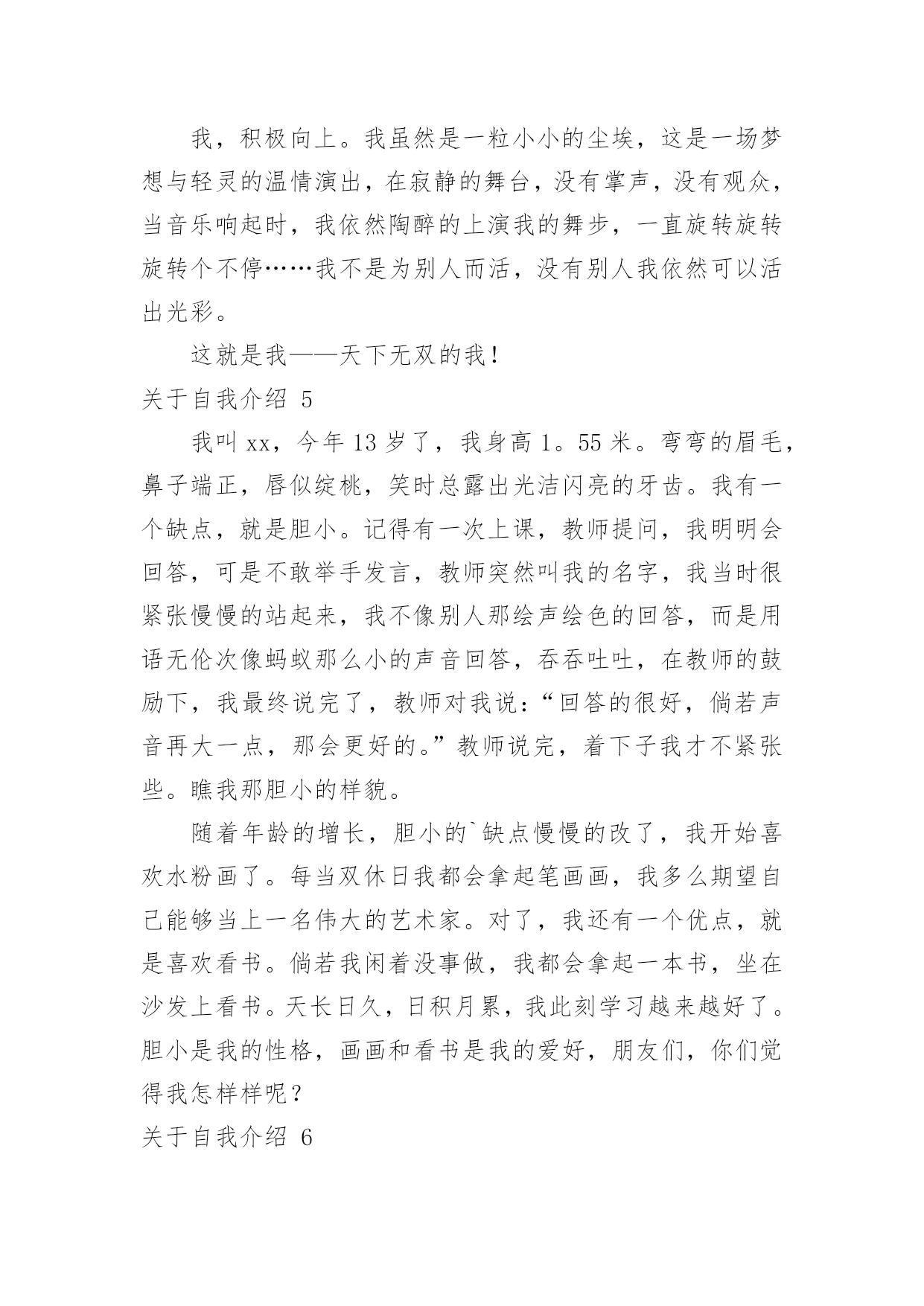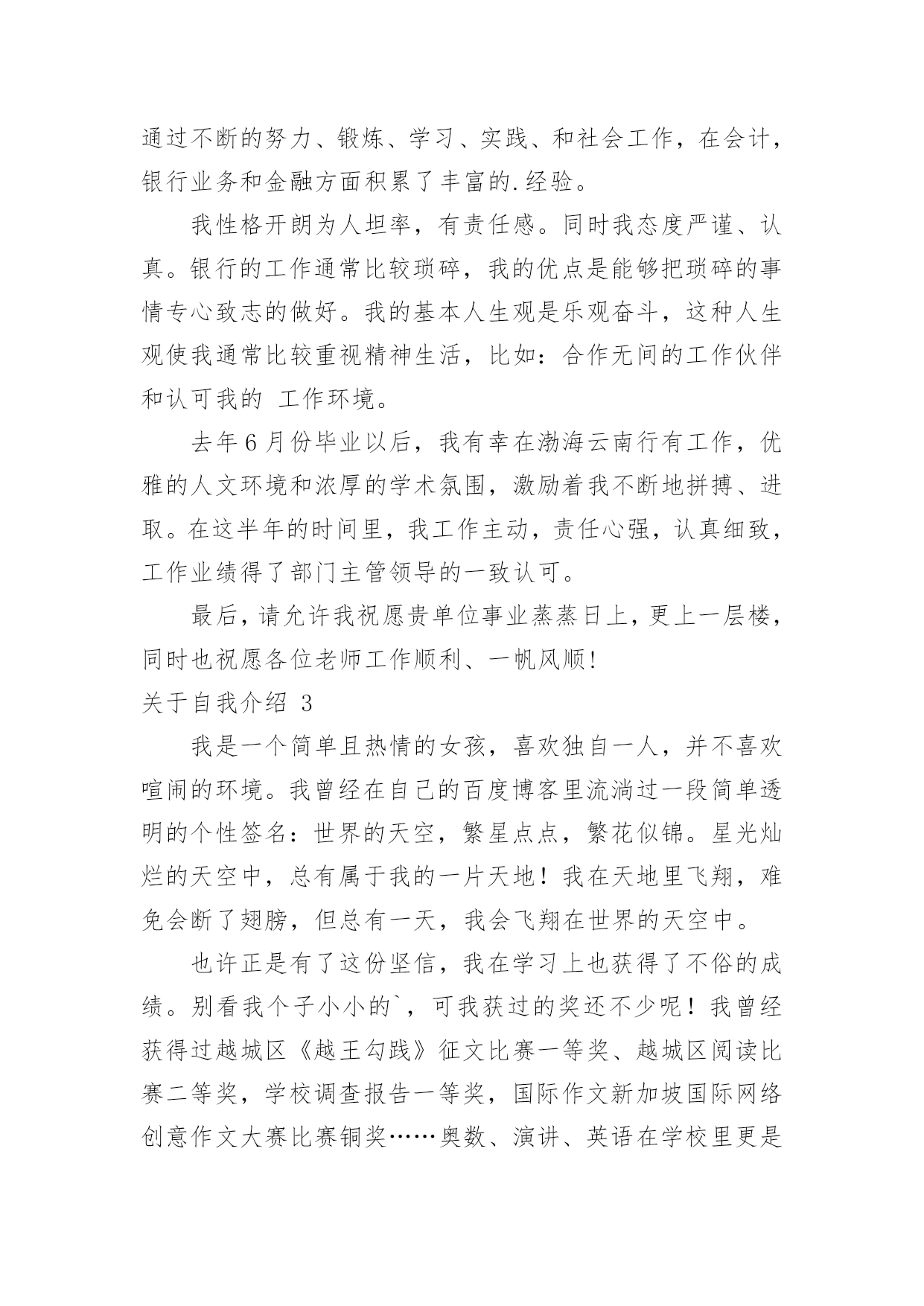 自我介绍关于自我介绍15篇当碰到陌生人时候,我们通常会被要求作自我介绍,用自我介绍往往可以让他人有一定的了解。那要怎么写好自我介绍呢?下面是小编为大家整理的关于自我介绍,希望能够帮助到大家。关于自我介绍1各位考官下午好,非常高兴能有这样一个面试的`机会,现应聘xx主管一职。请允许我向你们介绍我自己!我叫xxx,来自xx省xx市,今年25岁,XX年6月毕业于北京大学光华管理学院mba专业。在校期间,由于表现优秀,被评为三好学生及优秀毕业生。我曾到彩虹集团2个月,任xx项目实习主管,主要是为了加强项目执行力度,对项目坚持跟踪进度,积极协助处理相关事项,并监督项目严格按要求进行,实习期后获得了上级的一致好评。请考官们认真考虑是否给我一个以行动来证明的机会!谢谢!关于自我介绍2各位尊敬的考官:早上好。我叫万华,毕业于广西财经大学会计专业。大学四年,通过不断的努力、锻炼、学习、实践、和社会工作,在会计,银行业务和金融方面积累了丰富的.经验。我性格开朗为人坦率,有责任感。同时我态度严谨、认真。银行的工作通常比较琐碎,我的优点是能够把琐碎的事情专心致志的做好。我的基本人生观是乐观奋斗,这种人生观使我通常比较重视精神生活,比如:合作无间的工作伙伴和认可我的工作环境。去年6月份毕业以后,我有幸在渤海云南行有工作,优雅的人文环境和浓厚的学术氛围,激励着我不断地拼搏、进取。在这半年的时间里,我工作主动,责任心强,认真细致,工作业绩得了部门主管领导的一致认可。最后,请允许我祝愿贵单位事业蒸蒸日上,更上一层楼,同时也祝愿各位老师工作顺利、一帆风顺!关于自我介绍3我是一个简单且热情的女孩,喜欢独自一人,并不喜欢喧闹的环境。我曾经在自己的百度博客里流淌过一段简单透明的个性签名:世界的天空,繁星点点,繁花似锦。星光灿烂的天空中,总有属于我的一片天地!我在天地里飞翔,难免会断了翅膀,但总有一天,我会飞翔在世界的天空中。也许正是有了这份坚信,我在学习上也获得了不俗的成绩。别看我个子小小的`,可我获过的奖还不少呢!我曾经获得过越城区《越王勾践》征文比赛一等奖、越城区阅读比赛二等奖,学校调查报告一等奖,国际作文新加坡国际网络创意作文大赛比赛铜奖……奥数、演讲、英语在学校里更是频频获奖,还担任了大队委的职务呢!我不可能十全十美,却能努力做好每一件事。生活学习上,我有我的原则,一件事,要不,就不做,一旦做了,就一定要做得与众不同,成为所有人目光的焦点。这就是我,不乏自信的我。当然,更多的时候,我就像我的名字一样,是一颗冉冉升起的太阳,把温暖带给大家。同学有困难,我总是热情相助;班级有活动,我总是积极参加。我就像一个爱心小天使,总是愿意把快乐带给大家。也许是因为生活中的感悟颇多,我总愿意用笔及录像我的心情,在这个世界里,我找到了属于我的快乐,一次又一次,体验这种美好!所以,请记住我吧,一个热爱生活、简单的我——xxx别抄袭,这是我原创的李玲自传小女孩一位,现年十三岁,并非大家闺秀,其貌不扬,生于广西柳州市。祖籍浙江(为金庸之老乡),却从未涉足此地。四岁上,随父进京,进入地科院幼儿园。人生地不熟,受小朋友之欺侮,常含泪缩于墙角,渐将爱动爱闹之习改掉,胆小慎微,直至现今。记得当时住于一小院,母亲教之读幼儿书报,增长见闻,并习钢琴,后受益匪浅。六岁半入小学,低年级时甚欢乐。班主任姓粱,极慈祥,伙伴亲密如一家。可惜好景不长,三年级插班时并入二班,亦搬家至先住地。此班同学待人冷漠,妒性强,不以诚心相对;搬家后住处离小学甚远,与同学不能互通有无,更增隔膜。在此班中度日如年,几欲转学而不得,只得整日学习,以慰无聊。常受老师表扬,实不知乃出于无奈。毕业后,考入北京八中。此地环境优美,令人心怡。同学大都多才,且全班关系和谐。老师深得学生之心。平日同学高谈阔论(吾班谓之“扯”),我时常混于其中,其乐融融。吾不爱体育,便去打电脑看小说。生活充实学业得志,不亦乐乎!现升入初二,今后之事,还未得知。吾从小到大爱好甚多,却无一成为特长。琴棋书画,只略知其一。小学时得过些奖:在市英语科技竞赛中,一、二、三等奖各获过一次,在新加坡数学竞赛中获过三等奖,钢琴过了九级。中学后便无一所获。目前无大志,只把心胸豁达作为最高追求,喜爱金庸先生之《笑傲江湖》,及李白、辛弃疾之诗词。愿今后不负自己及家长之望,小事开心、大事顺利、少出差错,足矣。关于自我介绍4我,幽默宽容。我一直不愿意去看别人满脸怒容的样子,以为我认为笑是世界上最美丽的风景。所以,我每天都会去逗别人笑,看见别人笑,我也就高兴了。不管别人做了什么事,我都会以一颗宽容的.心去对待!我,要做自己。齐白石老先生曾说过:“学我者生,似我者死。”走不出前人的框架,自然也就不会有自己的天地。当所有人都沉迷于网络游戏时,我认为那是在虚度光阴。要做自己,真实的自己,