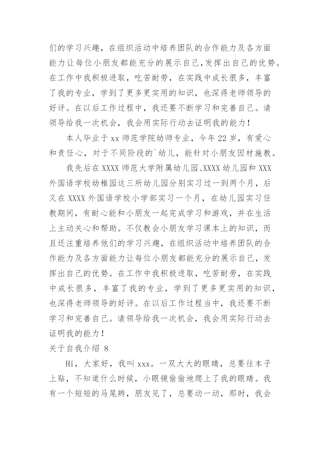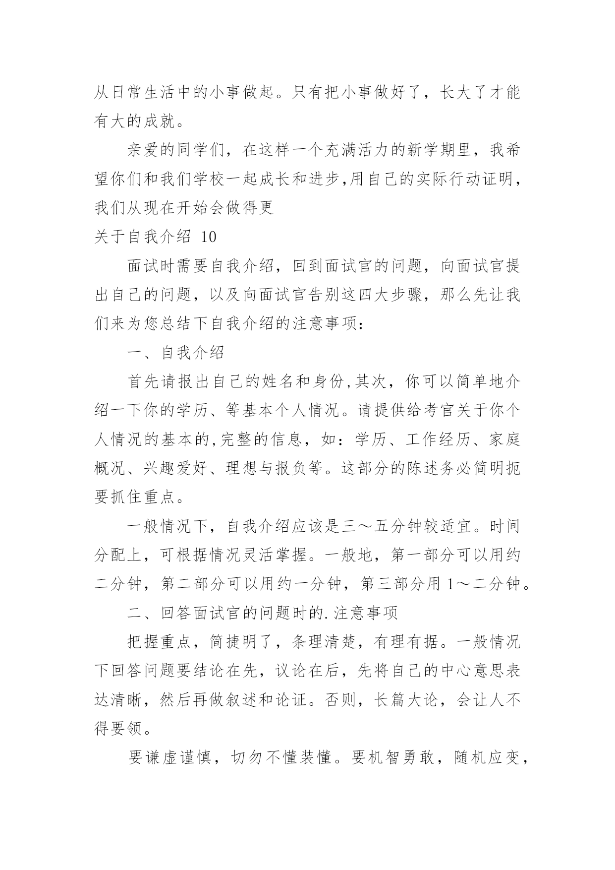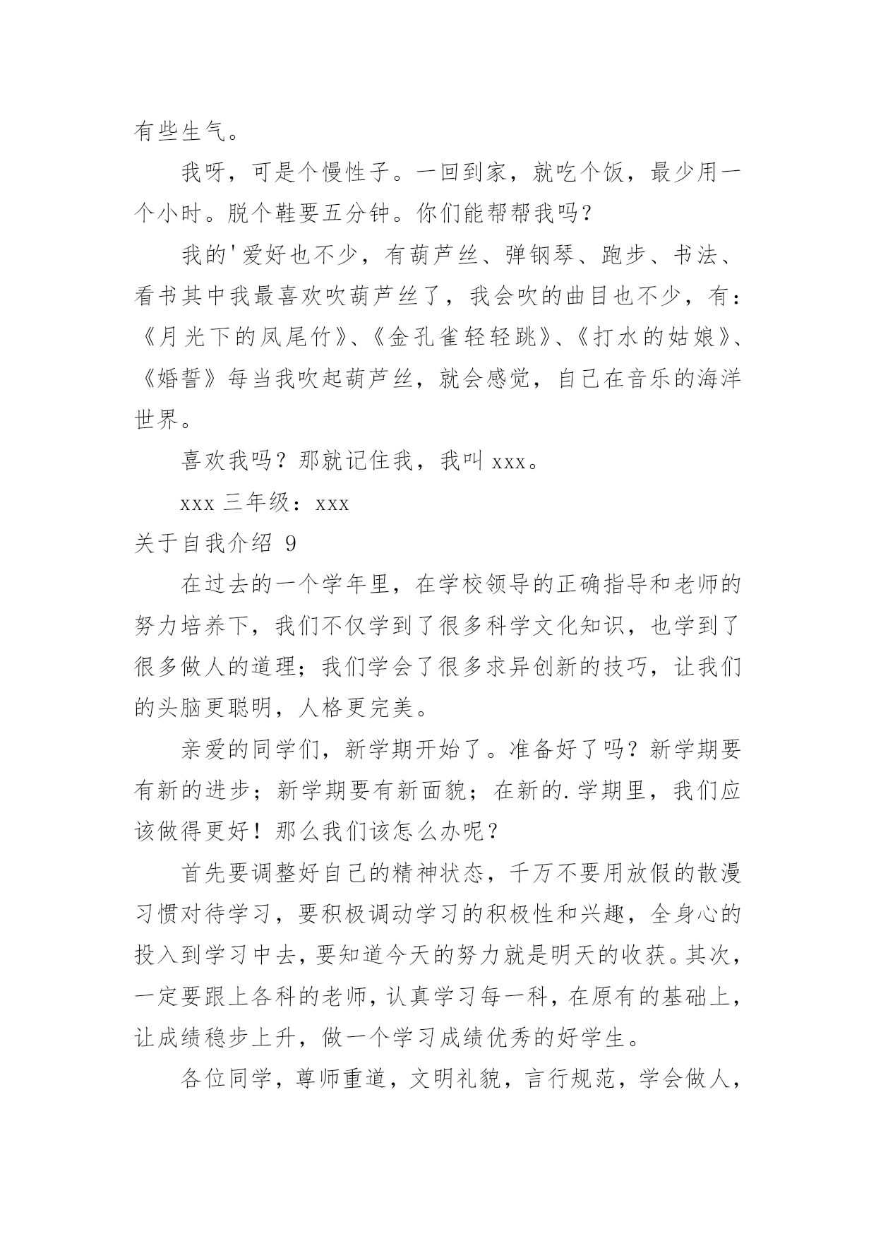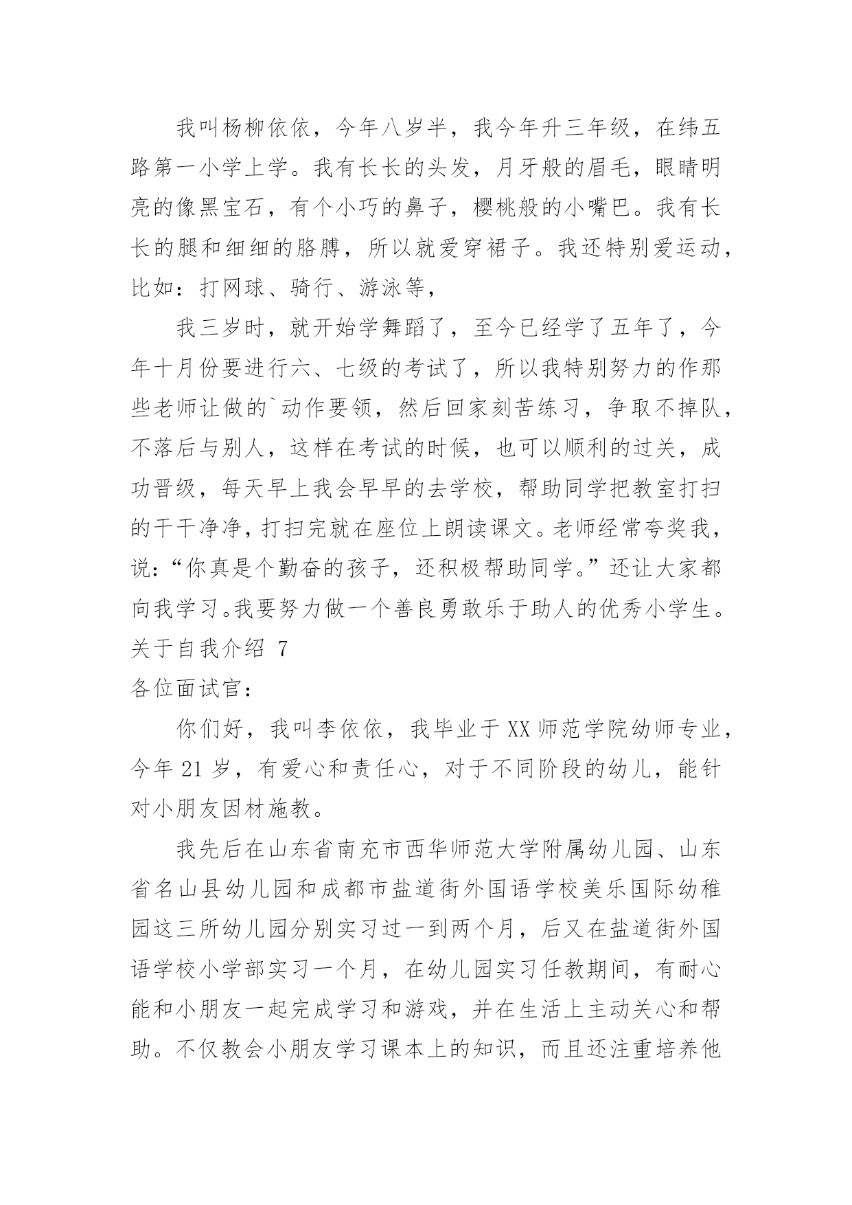 自我介绍关于自我介绍15篇当碰到陌生人时候,我们通常会被要求作自我介绍,用自我介绍往往可以让他人有一定的了解。那要怎么写好自我介绍呢?下面是小编为大家整理的关于自我介绍,希望能够帮助到大家。关于自我介绍1各位考官下午好,非常高兴能有这样一个面试的`机会,现应聘xx主管一职。请允许我向你们介绍我自己!我叫xxx,来自xx省xx市,今年25岁,XX年6月毕业于北京大学光华管理学院mba专业。在校期间,由于表现优秀,被评为三好学生及优秀毕业生。我曾到彩虹集团2个月,任xx项目实习主管,主要是为了加强项目执行力度,对项目坚持跟踪进度,积极协助处理相关事项,并监督项目严格按要求进行,实习期后获得了上级的一致好评。请考官们认真考虑是否给我一个以行动来证明的机会!谢谢!关于自我介绍2各位尊敬的考官:早上好。我叫万华,毕业于广西财经大学会计专业。大学四年,通过不断的努力、锻炼、学习、实践、和社会工作,在会计,银行业务和金融方面积累了丰富的.经验。我性格开朗为人坦率,有责任感。同时我态度严谨、认真。银行的工作通常比较琐碎,我的优点是能够把琐碎的事情专心致志的做好。我的基本人生观是乐观奋斗,这种人生观使我通常比较重视精神生活,比如:合作无间的工作伙伴和认可我的工作环境。去年6月份毕业以后,我有幸在渤海云南行有工作,优雅的人文环境和浓厚的学术氛围,激励着我不断地拼搏、进取。在这半年的时间里,我工作主动,责任心强,认真细致,工作业绩得了部门主管领导的一致认可。最后,请允许我祝愿贵单位事业蒸蒸日上,更上一层楼,同时也祝愿各位老师工作顺利、一帆风顺!关于自我介绍3我是一个简单且热情的女孩,喜欢独自一人,并不喜欢喧闹的环境。我曾经在自己的百度博客里流淌过一段简单透明的个性签名:世界的天空,繁星点点,繁花似锦。星光灿烂的天空中,总有属于我的一片天地!我在天地里飞翔,难免会断了翅膀,但总有一天,我会飞翔在世界的天空中。也许正是有了这份坚信,我在学习上也获得了不俗的成绩。别看我个子小小的`,可我获过的奖还不少呢!我曾经获得过越城区《越王勾践》征文比赛一等奖、越城区阅读比赛二等奖,学校调查报告一等奖,国际作文新加坡国际网络创意作文大赛比赛铜奖……奥数、演讲、英语在学校里更是频频获奖,还担任了大队委的职务呢!我不可能十全十美,却能努力做好每一件事。生活学习上,我有我的原则,一件事,要不,就不做,一旦做了,就一定要做得与众不同,成为所有人目光的焦点。这就是我,不乏自信的我。当然,更多的时候,我就像我的名字一样,是一颗冉冉升起的太阳,把温暖带给大家。同学有困难,我总是热情相助;班级有活动,我总是积极参加。我就像一个爱心小天使,总是愿意把快乐带给大家。也许是因为生活中的感悟颇多,我总愿意用笔及录像我的心情,在这个世界里,我找到了属于我的快乐,一次又一次,体验这种美好!所以,请记住我吧,一个热爱生活、简单的我——xxx别抄袭,这是我原创的李玲自传小女孩一位,现年十三岁,并非大家闺秀,其貌不扬,生于广西柳州市。祖籍浙江(为金庸之老乡),却从未涉足此地。四岁上,随父进京,进入地科院幼儿园。人生地不熟,受小朋友之欺侮,常含泪缩于墙角,渐将爱动爱闹之习改掉,胆小慎微,直至现今。记得当时住于一小院,母亲教之读幼儿书报,增长见闻,并习钢琴,后受益匪浅。六岁半入小学,低年级时甚欢乐。班主任姓粱,极慈祥,伙伴亲密如一家。可惜好景不长,三年级插班时并入二班,亦搬家至先住地。此班同学待人冷漠,妒性强,不以诚心相对;搬家后住处离小学甚远,与同学不能互通有无,更增隔膜。在此班中度日如年,几欲转学而不得,只得整日学习,以慰无聊。常受老师表扬,实不知乃出于无奈。毕业后,考入北京八中。此地环境优美,令人心怡。同学大都多才,且全班关系和谐。老师深得学生之心。平日同学高谈阔论(吾班谓之“扯”),我时常混于其中,其乐融融。吾不爱体育,便去打电脑看小说。生活充实学业得志,不亦乐乎!现升入初二,今后之事,还未得知。吾从小到大爱好甚多,却无一成为特长。琴棋书画,只略知其一。小学时得过些奖:在市英语科技竞赛中,一、二、三等奖各获过一次,在新加坡数学竞赛中获过三等奖,钢琴过了九级。中学后便无一所获。目前无大志,只把心胸豁达作为最高追求,喜爱金庸先生之《笑傲江湖》,及李白、辛弃疾之诗词。愿今后不负自己及家长之望,小事开心、大事顺利、少出差错,足矣。关于自我介绍4我,幽默宽容。我一直不愿意去看别人满脸怒容的样子,以为我认为笑是世界上最美丽的风景。所以,我每天都会去逗别人笑,看见别人笑,我也就高兴了。不管别人做了什么事,我都会以一颗宽容的.心去对待!我,要做自己。齐白石老先生曾说过:“学我者生,似我者死。”走不出前人的框架,自然也就不会有自己的天地。当所有人都沉迷于网络游戏时,我认为那是在虚度光阴。要做自己,真实的自己,
