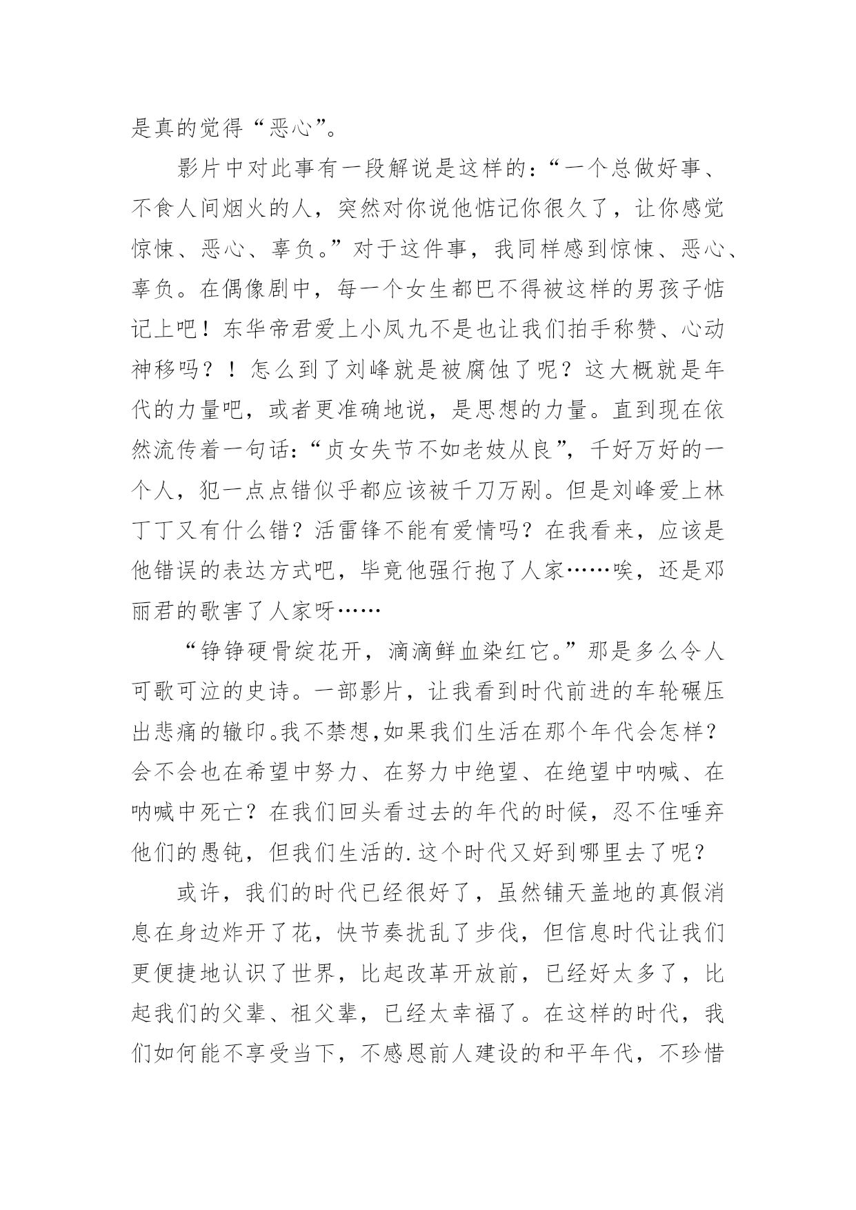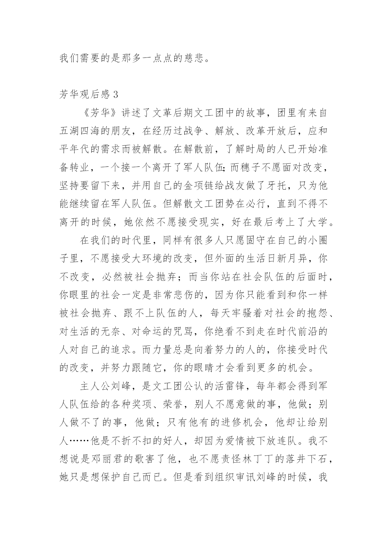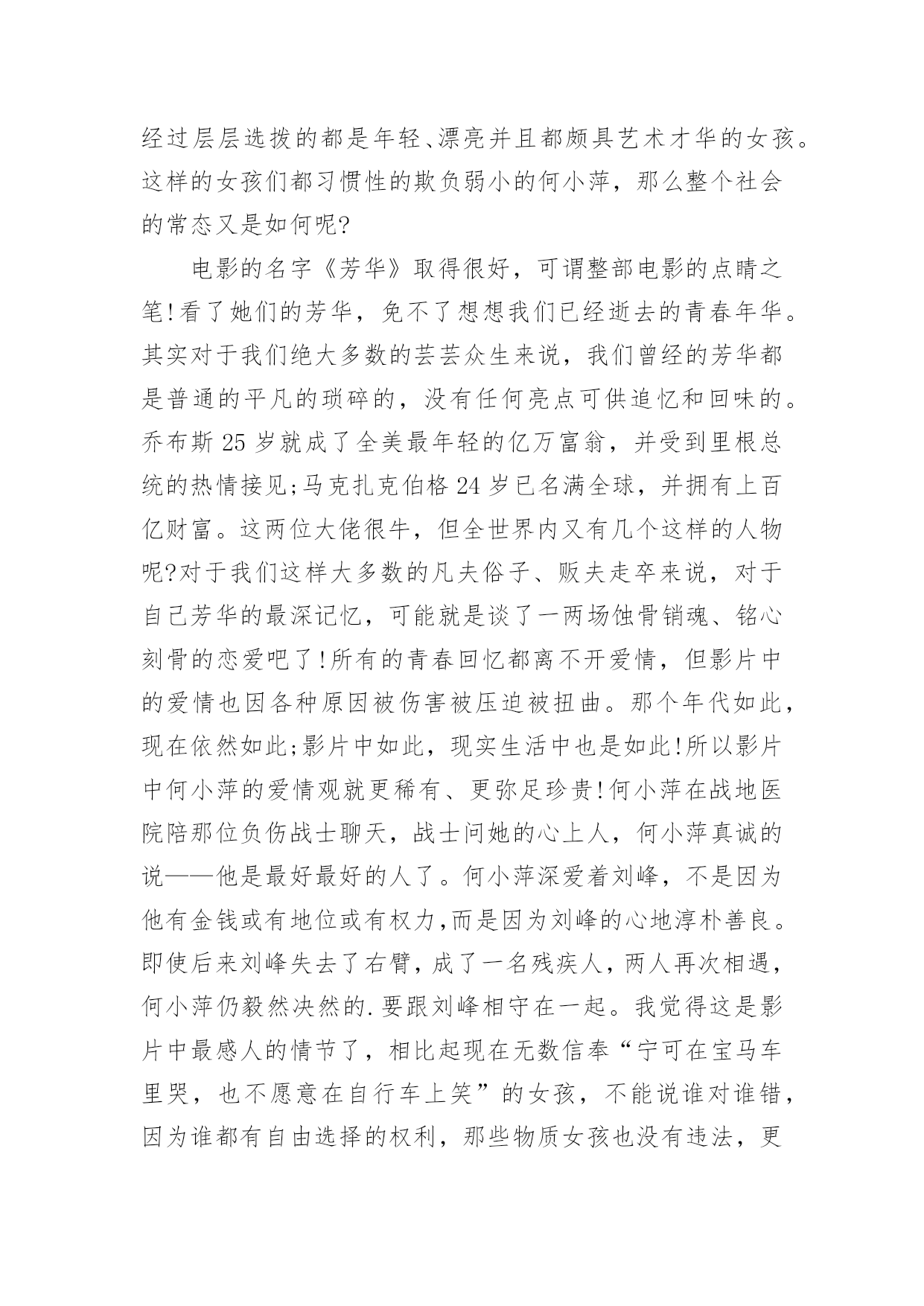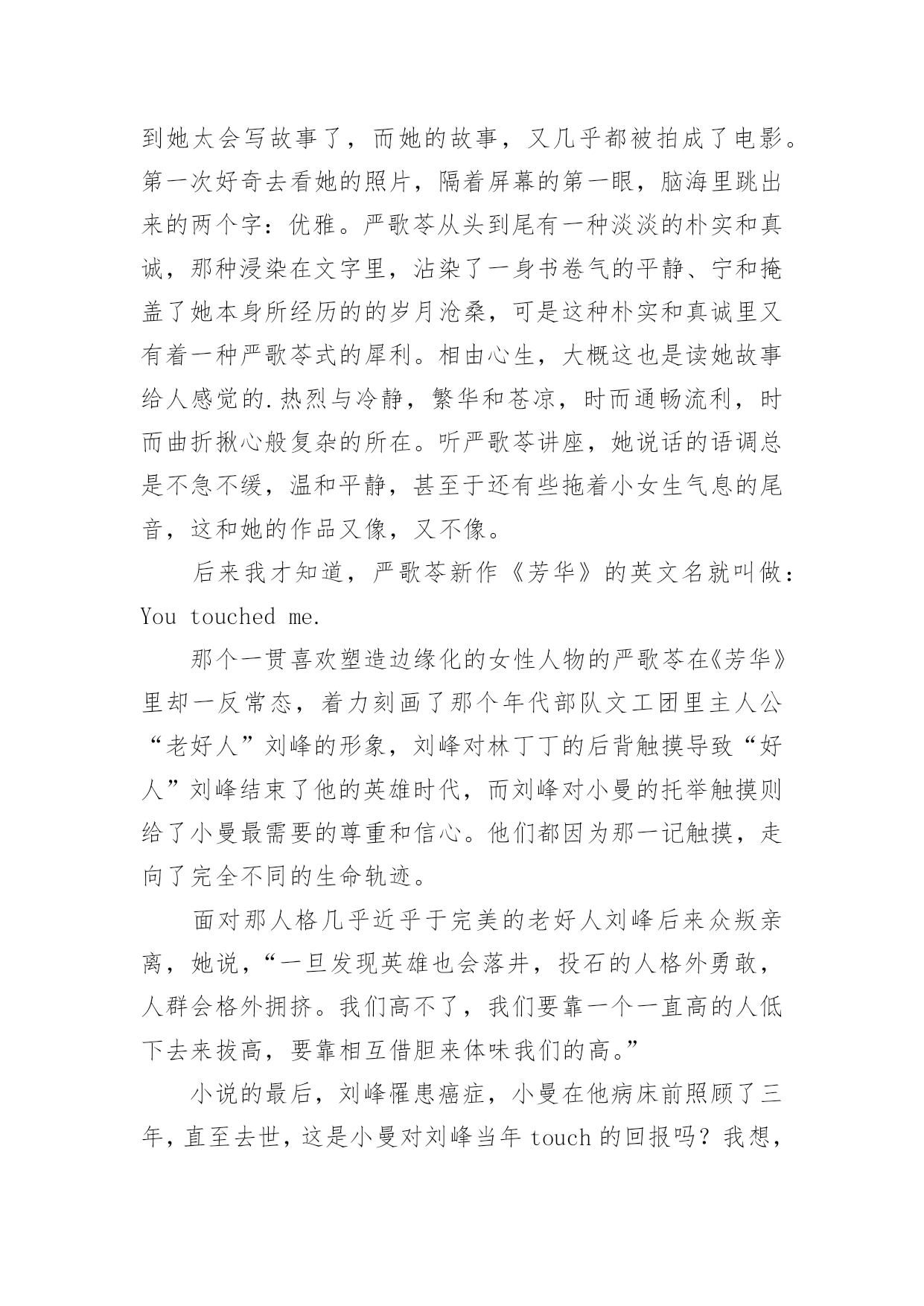 芳华观后感当品味完一部作品后,能够给我们不少启示,是时候静下心来好好写写观后感了。那要怎么写好观后感呢?以下是小编精心整理的芳华观后感,仅供参考,欢迎大家阅读。芳华观后感1我当时看的是点映,在观影之前我就知道这个片子一定好看的,因此很期待。为什么知道一定好看呢,因为我是命理师嘛,而且应该是个出色的命理师呢,我根据自己的八字对应当晚的时辰,觉得对自己很吉祥,是一个对自己感官和思维感到触动的时辰,因此我相信这片子会座无虚席。我是在万达广场看的,虽然点映,但坐了一多半人,整场电影基本大家都是聚精会神的。一般看电影的多是青年人居多,这次大家应该也提前大概了解了点影片吧,我发现这次观影中年人的比例相对比别的片子高的。给我的感觉是挺好看的,故事情节前半段舒缓但却紧凑,后半段节奏明快而段落清晰。这片子听闻是本九月上映的,但是改档到本月十二月,细看还是能看出刻意的剪辑变化的,不过故事情节依旧紧凑,可以引人入胜。从摄影场景背景道具,都比较逼真专业。并且演员演技普遍不错,因为他们是军队文工团的,电影里有大量舞蹈场面,看得出群演的舞蹈都是很专业,演员有功底,能够引人入胜让人不出戏,很有代入感。而后半段越战部分,无论是战争场景,还是六分钟左右的,小队被敌军伏击的战斗戏份,都非常逼真,还原了场景,给人真实感,让人感受到战争之无奈与残酷。六分钟的战斗戏份,是从我军,尤其主要从男主角刘峰的个人视角拍摄的,好像是固定摄影和手提摄像机结合拍摄。这样就更逼真,真实而又不过分晃动而看不清,从刘峰的视角拍摄,让人感受更真实,代入感极强。这段拍摄手法很有好莱坞战争片感觉哦。整体故事情节紧凑明快,和拍得感人。一方面因为冯小刚讲故事的方式和指导水平过硬,以及选材好。另一方面也是因为原小说出色,但原小说不是影片名字,〔芳华〕的影片名字,是作者,也就是影片里穗子原型严歌苓起的。影片名字恰如其分,讲了一代人的芳华和他们的故事,片子里穗子文笔好被提起过,后来也的确成为了一个优秀的`作家。也因为文笔出色,和故事真实,真情实感,故而感人,影片亦感人。在如今影院多是商业片之潮流下,本艺术片前票房不俗,也引起很多人共鸣和赞赏,已经说明影片刺激出色和成功。刘峰毫无意义是一个悲剧人物,后来被下放到连队,参加越战时的他,我觉得已经处于灵魂幻灭的心死状态,夹杂的因为丁丁事情和被下放的失望无无奈。当然丁丁这个人应该是不喜欢刘峰的,她如何姑且不多评论,因为每个人可能看法不同。对于刘峰这样的人,如果仅仅是他的表白被拒绝,他可能会有痛苦,但不至于那么伤心和失望。他的失望和伤心以及心死,应该是之后被组织上一些人诱导定性和下放。之后的刘显然已经是凄凉失望和沧桑的。如果他当时直接去军校读书,就没有那些。如果战场上听从战友及时撤回,就不一定因为肱动脉扎时间太长手臂坏死而截肢残疾,如果不是因为残疾他后半生生活也不一定那么艰辛。但是真实的故事是没有如果的,人生时间都在按顺序走,发生就是发生了,这是他的命,他和小萍都比较苦命而已。而善良知性有同情心的穗子湿掉了那张纸条,也是她个人的感情命运。冯导除了表达故事,而且从一些片段里想表明一些社会现象或某些现象。但这个时代一些现象未必能被更多人看出和理解,甚至多个角度不同,看法不一,因此不适合多去介意,每个人都有每个人自己的看法,不同的角度会不同的看法,常言道一万个人中有一万个哈姆雷特。不同的人也有不同的芳华,至于影片要表达的含义不复杂,每个人有自己的理解,总之是一部好影片,大家可以从自己的角度观摩理解。芳华观后感2她依然是我十多年来最喜爱的一位作家,偶然从她的第一本《陆犯焉识》开始,紧接着从《天浴》、《扶桑》到《小姨多鹤》、《妈阁是座城》,从《霜降》、到《老师好美》、《谁家有女初长成》···一发不可收拾。严歌苓的文字有种与生俱来的吸引力和冲击力,她塑造故事总是“翻手为苍凉,覆手为繁华”,不需要听外面的评价,读着读着你就能感受到她太会写故事了,而她的故事,又几乎都被拍成了电影。第一次好奇去看她的照片,隔着屏幕的第一眼,脑海里跳出来的两个字:优雅。严歌苓从头到尾有一种淡淡的朴实和真诚,那种浸染在文字里,沾染了一身书卷气的平静、宁和掩盖了她本身所经历的的岁月沧桑,可是这种朴实和真诚里又有着一种严歌苓式的犀利。相由心生,大概这也是读她故事给人感觉的.热烈与冷静,繁华和苍凉,时而通畅流利,时而曲折揪心般复杂的所在。听严歌苓讲座,她说话的语调总是不急不缓,温和平静,甚至于还有些拖着小女生气息的尾音,这和她的作品又像,又不像。后来我才知道,严歌苓新作《芳华》的英文名就叫做:Youtouchedme.那个一贯喜欢塑造边缘化的女性人物的严歌苓在《芳华》里却一反常态,着力刻画了那个年代部队文工团里主人公“老好人”刘峰的形象,刘峰对林丁丁的后背触摸导致“好人”刘峰结束了他的英雄时代,而刘峰对