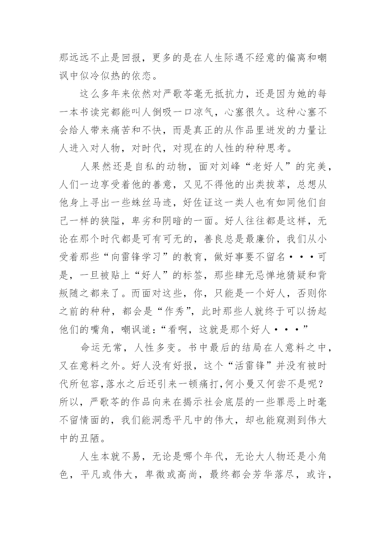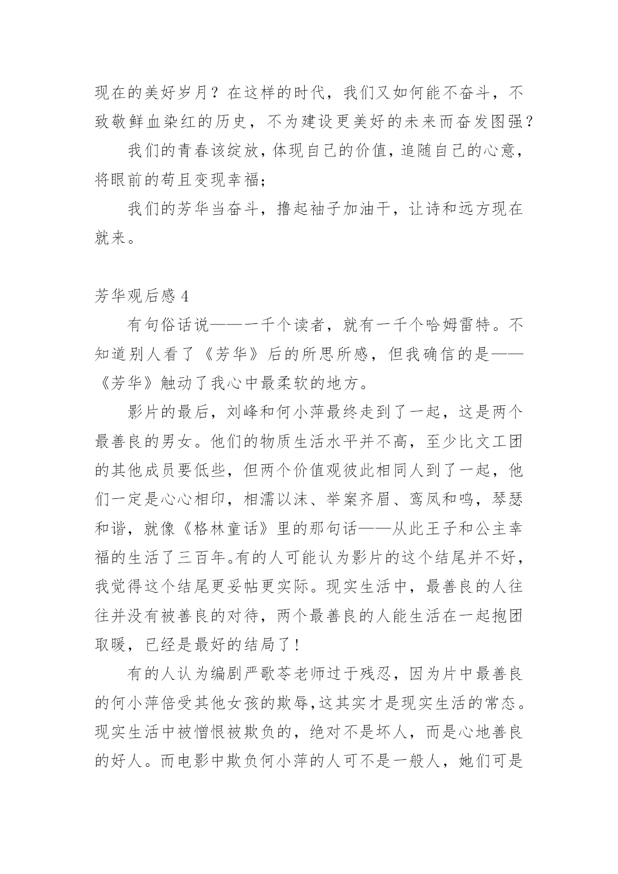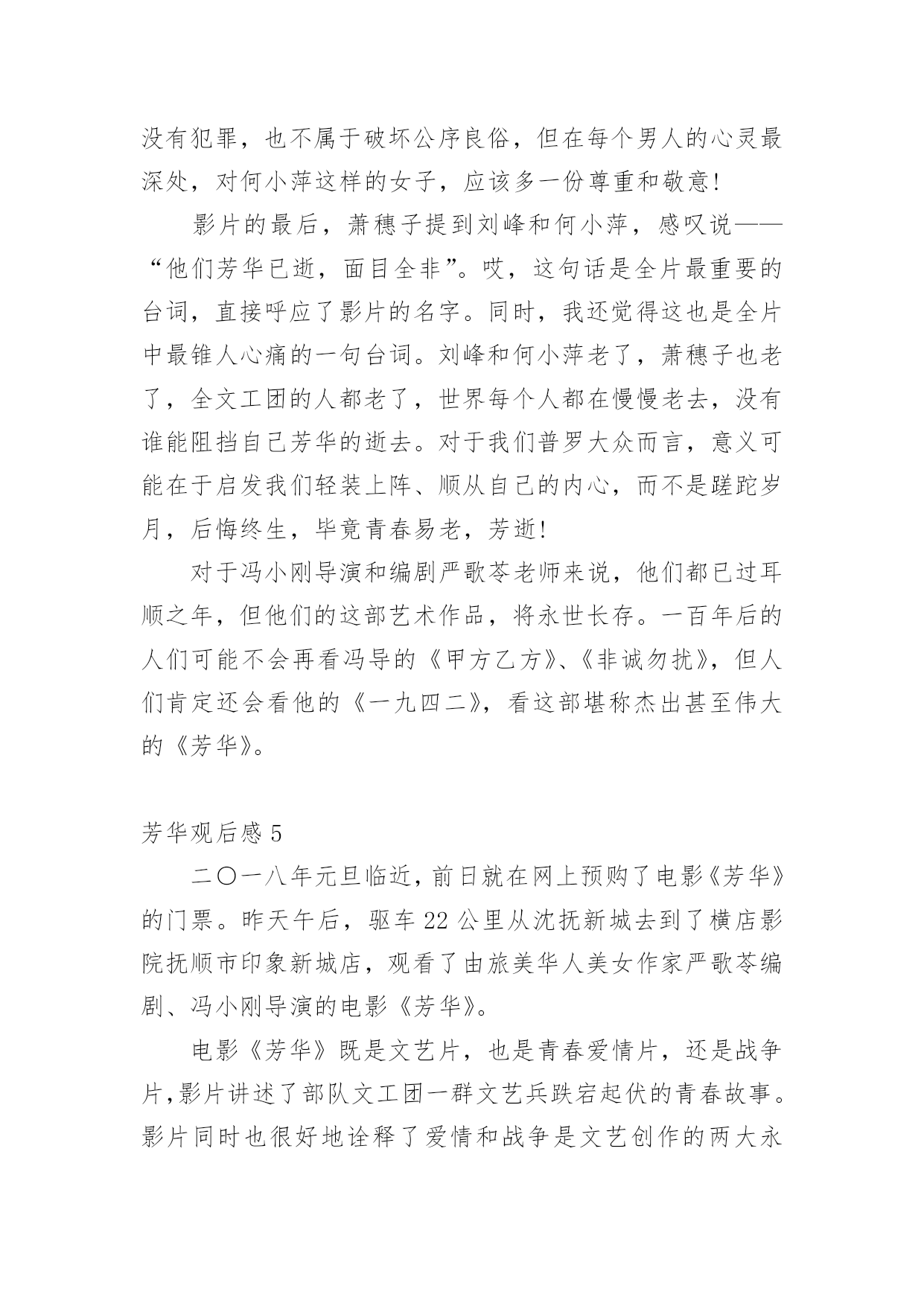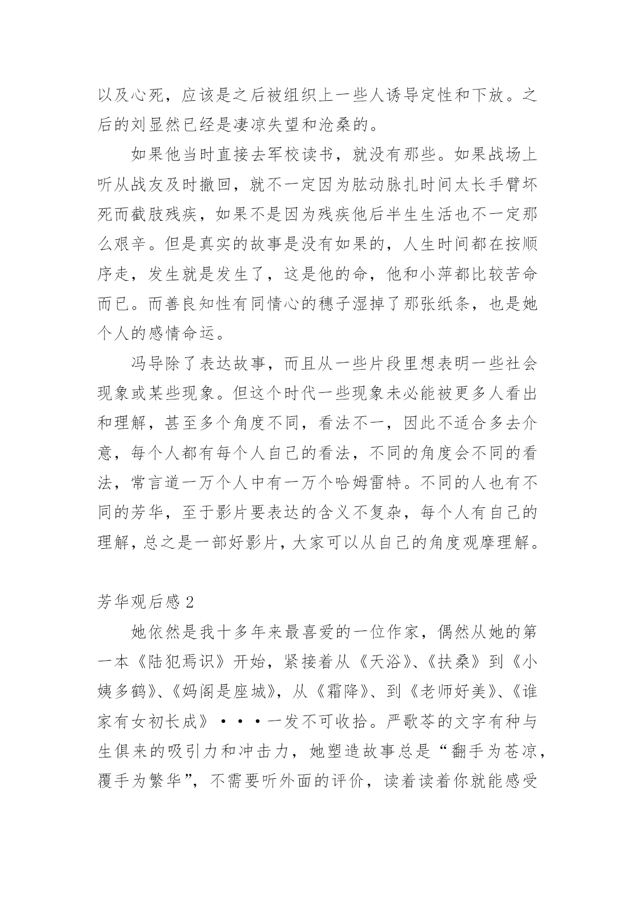 芳华观后感当品味完一部作品后,能够给我们不少启示,是时候静下心来好好写写观后感了。那要怎么写好观后感呢?以下是小编精心整理的芳华观后感,仅供参考,欢迎大家阅读。芳华观后感1我当时看的是点映,在观影之前我就知道这个片子一定好看的,因此很期待。为什么知道一定好看呢,因为我是命理师嘛,而且应该是个出色的命理师呢,我根据自己的八字对应当晚的时辰,觉得对自己很吉祥,是一个对自己感官和思维感到触动的时辰,因此我相信这片子会座无虚席。我是在万达广场看的,虽然点映,但坐了一多半人,整场电影基本大家都是聚精会神的。一般看电影的多是青年人居多,这次大家应该也提前大概了解了点影片吧,我发现这次观影中年人的比例相对比别的片子高的。给我的感觉是挺好看的,故事情节前半段舒缓但却紧凑,后半段节奏明快而段落清晰。这片子听闻是本九月上映的,但是改档到本月十二月,细看还是能看出刻意的剪辑变化的,不过故事情节依旧紧凑,可以引人入胜。从摄影场景背景道具,都比较逼真专业。并且演员演技普遍不错,因为他们是军队文工团的,电影里有大量舞蹈场面,看得出群演的舞蹈都是很专业,演员有功底,能够引人入胜让人不出戏,很有代入感。而后半段越战部分,无论是战争场景,还是六分钟左右的,小队被敌军伏击的战斗戏份,都非常逼真,还原了场景,给人真实感,让人感受到战争之无奈与残酷。六分钟的战斗戏份,是从我军,尤其主要从男主角刘峰的个人视角拍摄的,好像是固定摄影和手提摄像机结合拍摄。这样就更逼真,真实而又不过分晃动而看不清,从刘峰的视角拍摄,让人感受更真实,代入感极强。这段拍摄手法很有好莱坞战争片感觉哦。整体故事情节紧凑明快,和拍得感人。一方面因为冯小刚讲故事的方式和指导水平过硬,以及选材好。另一方面也是因为原小说出色,但原小说不是影片名字,〔芳华〕的影片名字,是作者,也就是影片里穗子原型严歌苓起的。影片名字恰如其分,讲了一代人的芳华和他们的故事,片子里穗子文笔好被提起过,后来也的确成为了一个优秀的`作家。也因为文笔出色,和故事真实,真情实感,故而感人,影片亦感人。在如今影院多是商业片之潮流下,本艺术片前票房不俗,也引起很多人共鸣和赞赏,已经说明影片刺激出色和成功。刘峰毫无意义是一个悲剧人物,后来被下放到连队,参加越战时的他,我觉得已经处于灵魂幻灭的心死状态,夹杂的因为丁丁事情和被下放的失望无无奈。当然丁丁这个人应该是不喜欢刘峰的,她如何姑且不多评论,因为每个人可能看法不同。对于刘峰这样的人,如果仅仅是他的表白被拒绝,他可能会有痛苦,但不至于那么伤心和失望。他的失望和伤心以及心死,应该是之后被组织上一些人诱导定性和下放。之后的刘显然已经是凄凉失望和沧桑的。如果他当时直接去军校读书,就没有那些。如果战场上听从战友及时撤回,就不一定因为肱动脉扎时间太长手臂坏死而截肢残疾,如果不是因为残疾他后半生生活也不一定那么艰辛。但是真实的故事是没有如果的,人生时间都在按顺序走,发生就是发生了,这是他的命,他和小萍都比较苦命而已。而善良知性有同情心的穗子湿掉了那张纸条,也是她个人的感情命运。冯导除了表达故事,而且从一些片段里想表明一些社会现象或某些现象。但这个时代一些现象未必能被更多人看出和理解,甚至多个角度不同,看法不一,因此不适合多去介意,每个人都有每个人自己的看法,不同的角度会不同的看法,常言道一万个人中有一万个哈姆雷特。不同的人也有不同的芳华,至于影片要表达的含义不复杂,每个人有自己的理解,总之是一部好影片,大家可以从自己的角度观摩理解。芳华观后感2她依然是我十多年来最喜爱的一位作家,偶然从她的第一本《陆犯焉识》开始,紧接着从《天浴》、《扶桑》到《小姨多鹤》、《妈阁是座城》,从《霜降》、到《老师好美》、《谁家有女初长成》···一发不可收拾。严歌苓的文字有种与生俱来的吸引力和冲击力,她塑造故事总是“翻手为苍凉,覆手为繁华”,不需要听外面的评价,读着读着你就能感受到她太会写故事了,而她的故事,又几乎都被拍成了电影。第一次好奇去看她的照片,隔着屏幕的第一眼,脑海里跳出来的两个字:优雅。严歌苓从头到尾有一种淡淡的朴实和真诚,那种浸染在文字里,沾染了一身书卷气的平静、宁和掩盖了她本身所经历的的岁月沧桑,可是这种朴实和真诚里又有着一种严歌苓式的犀利。相由心生,大概这也是读她故事给人感觉的.热烈与冷静,繁华和苍凉,时而通畅流利,时而曲折揪心般复杂的所在。听严歌苓讲座,她说话的语调总是不急不缓,温和平静,甚至于还有些拖着小女生气息的尾音,这和她的作品又像,又不像。后来我才知道,严歌苓新作《芳华》的英文名就叫做:Youtouchedme.那个一贯喜欢塑造边缘化的女性人物的严歌苓在《芳华》里却一反常态,着力刻画了那个年代部队文工团里主人公“老好人”刘峰的形象,刘峰对林丁丁的后背触摸导致“好人”刘峰结束了他的英雄时代,而刘峰对