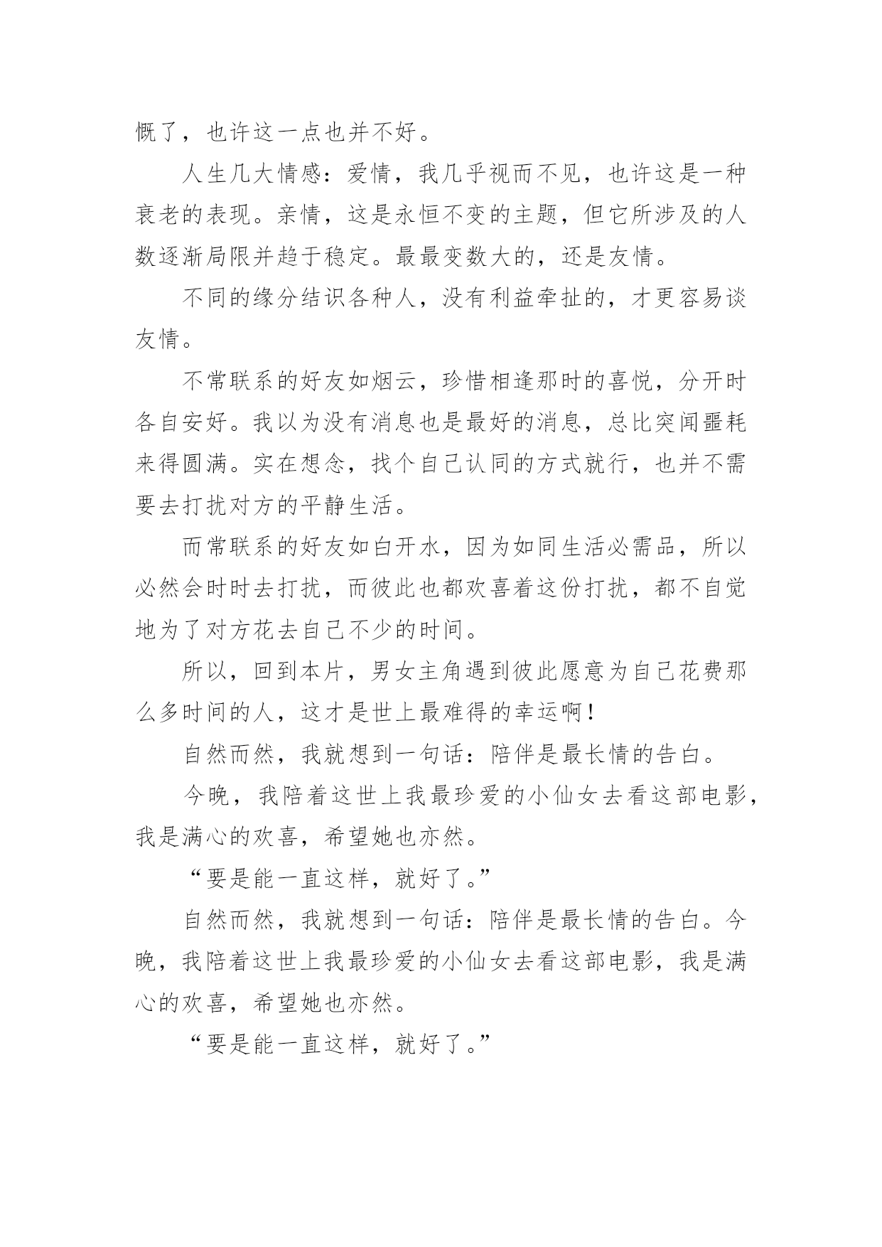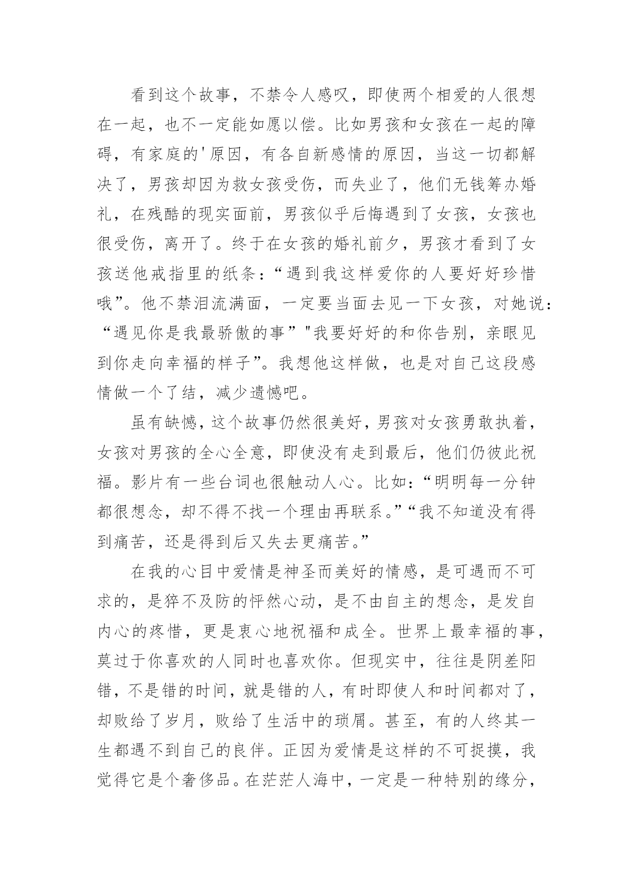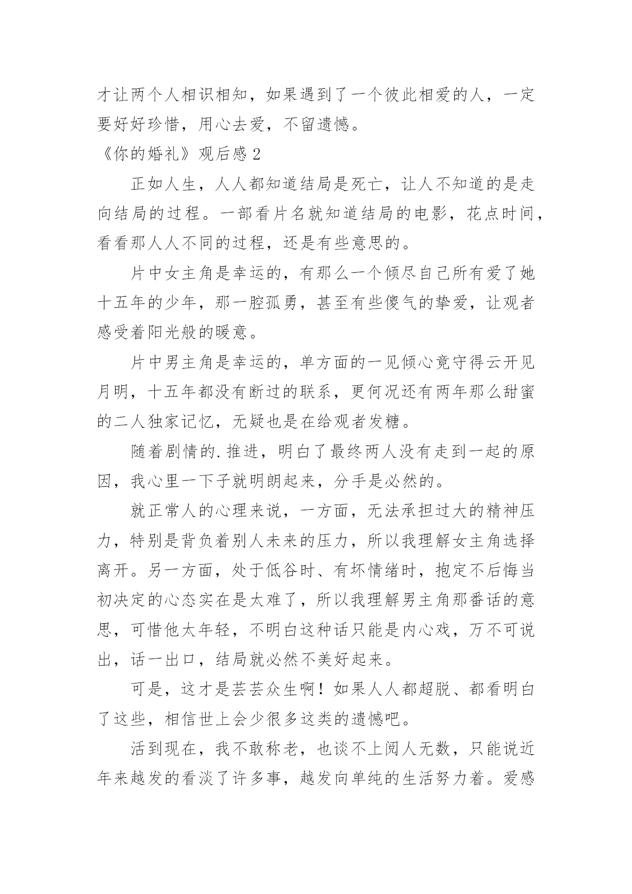 《你的婚礼》观后感《你的婚礼》观后感在看完一部作品以后,相信你会有不少感想吧,记录下来很重要哦,一起来写一篇观后感吧。那么你真的懂得怎么写观后感吗?以下是小编为大家收集的《你的婚礼》观后感,欢迎大家分享。《你的婚礼》观后感1今晚和家人看了电影《你的婚礼》,竟很感动。影片的很多地方引起了我们的共鸣,从中我们看到了爱情的浪漫美好,看到了它在真实生活面前的脆弱和无奈,也看到了它怎样使两个人成长,更从容的走进生活。影片由许光汉和章若楠主演。男生对女生一见钟情,女孩也很喜欢他,但是因为家庭原因,女孩中途离开了,男生为了守护这段感情,付出了很多努力。如:男孩为了女孩会一起逃课,会和比自己强很多的人比赛游泳,会为了找到女孩,而拼命复读考相同的大学,进相同的团队;会为女孩生日放烟花;会为了女孩能和新男友去三亚,去踢球等等。女孩也很喜欢男孩,在关键处总是支持男孩,为他解围;为男孩画画;设计专属服装;为他交房租;为他买戒指等等。这段感情长跑了15年,终于在女孩嫁给别人时画上了圆满的句号。看到这个故事,不禁令人感叹,即使两个相爱的人很想在一起,也不一定能如愿以偿。比如男孩和女孩在一起的障碍,有家庭的'原因,有各自新感情的原因,当这一切都解决了,男孩却因为救女孩受伤,而失业了,他们无钱筹办婚礼,在残酷的现实面前,男孩似乎后悔遇到了女孩,女孩也很受伤,离开了。终于在女孩的婚礼前夕,男孩才看到了女孩送他戒指里的纸条:“遇到我这样爱你的人要好好珍惜哦”。他不禁泪流满面,一定要当面去见一下女孩,对她说:“遇见你是我最骄傲的事”"我要好好的和你告别,亲眼见到你走向幸福的样子”。我想他这样做,也是对自己这段感情做一个了结,减少遗憾吧。虽有缺憾,这个故事仍然很美好,男孩对女孩勇敢执着,女孩对男孩的全心全意,即使没有走到最后,他们仍彼此祝福。影片有一些台词也很触动人心。比如:“明明每一分钟都很想念,却不得不找一个理由再联系。”“我不知道没有得到痛苦,还是得到后又失去更痛苦。”在我的心目中爱情是神圣而美好的情感,是可遇而不可求的,是猝不及防的怦然心动,是不由自主的想念,是发自内心的疼惜,更是衷心地祝福和成全。世界上最幸福的事,莫过于你喜欢的人同时也喜欢你。但现实中,往往是阴差阳错,不是错的时间,就是错的人,有时即使人和时间都对了,却败给了岁月,败给了生活中的琐屑。甚至,有的人终其一生都遇不到自己的良伴。正因为爱情是这样的不可捉摸,我觉得它是个奢侈品。在茫茫人海中,一定是一种特别的缘分,才让两个人相识相知,如果遇到了一个彼此相爱的人,一定要好好珍惜,用心去爱,不留遗憾。《你的婚礼》观后感2正如人生,人人都知道结局是死亡,让人不知道的是走向结局的过程。一部看片名就知道结局的电影,花点时间,看看那人人不同的过程,还是有些意思的。片中女主角是幸运的,有那么一个倾尽自己所有爱了她十五年的少年,那一腔孤勇,甚至有些傻气的挚爱,让观者感受着阳光般的暖意。片中男主角是幸运的,单方面的一见倾心竟守得云开见月明,十五年都没有断过的联系,更何况还有两年那么甜蜜的二人独家记忆,无疑也是在给观者发糖。随着剧情的.推进,明白了最终两人没有走到一起的原因,我心里一下子就明朗起来,分手是必然的。就正常人的心理来说,一方面,无法承担过大的精神压力,特别是背负着别人未来的压力,所以我理解女主角选择离开。另一方面,处于低谷时、有坏情绪时,抱定不后悔当初决定的心态实在是太难了,所以我理解男主角那番话的意思,可惜他太年轻,不明白这种话只能是内心戏,万不可说出,话一出口,结局就必然不美好起来。可是,这才是芸芸众生啊!如果人人都超脱、都看明白了这些,相信世上会少很多这类的遗憾吧。活到现在,我不敢称老,也谈不上阅人无数,只能说近年来越发的看淡了许多事,越发向单纯的生活努力着。爱感慨了,也许这一点也并不好。人生几大情感:爱情,我几乎视而不见,也许这是一种衰老的表现。亲情,这是永恒不变的主题,但它所涉及的人数逐渐局限并趋于稳定。最最变数大的,还是友情。不同的缘分结识各种人,没有利益牵扯的,才更容易谈友情。不常联系的好友如烟云,珍惜相逢那时的喜悦,分开时各自安好。我以为没有消息也是最好的消息,总比突闻噩耗来得圆满。实在想念,找个自己认同的方式就行,也并不需要去打扰对方的平静生活。而常联系的好友如白开水,因为如同生活必需品,所以必然会时时去打扰,而彼此也都欢喜着这份打扰,都不自觉地为了对方花去自己不少的时间。所以,回到本片,男女主角遇到彼此愿意为自己花费那么多时间的人,这才是世上最难得的幸运啊!自然而然,我就想到一句话:陪伴是最长情的告白。今晚,我陪着这世上我最珍爱的小仙女去看这部电影,我是满心的欢喜,希望她也亦然。“要是能一直这样,就好了。”自然而然,我就想到一句话:陪伴是最长情的告白。今晚,我陪着这世上我最珍爱的小