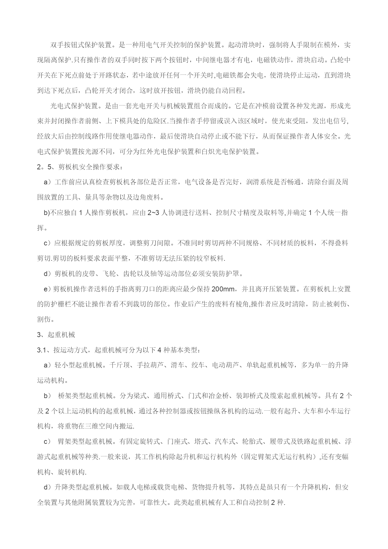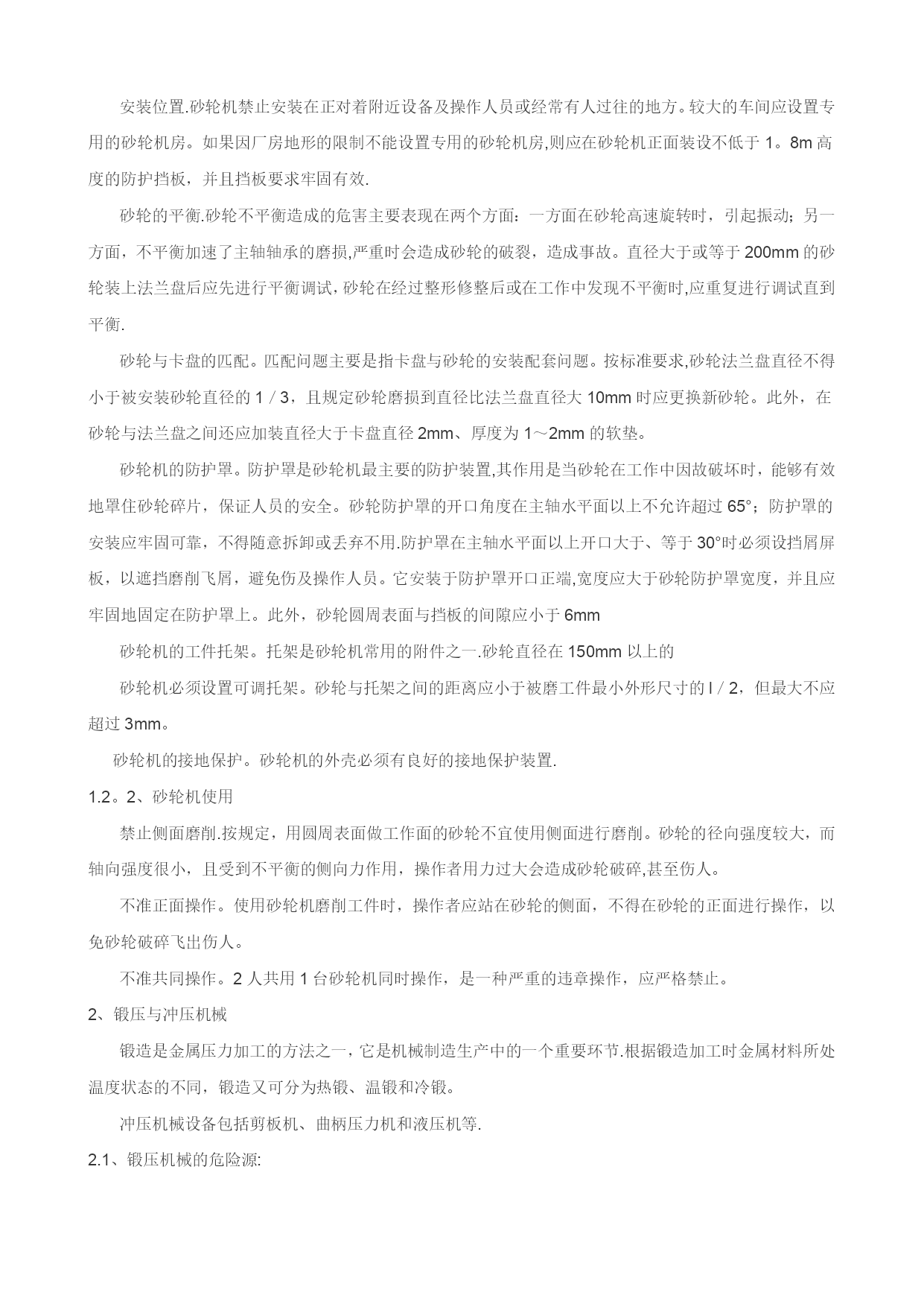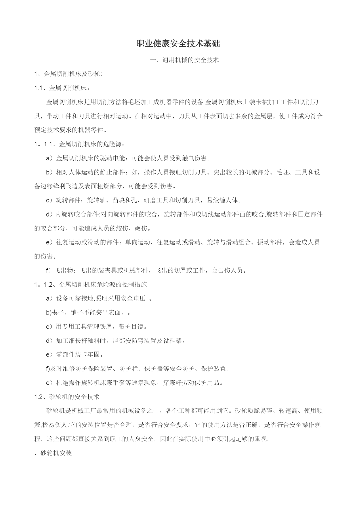 职业健康安全技术基础(可以直接使用,可编辑优秀版资料,欢迎下载)职业健康安全技术基础一、通用机械的安全技术1、金属切削机床及砂轮:1.1、金属切削机床:金属切削机床是用切削方法将毛坯加工成机器零件的设备.金属切削机床上装卡被加工工件和切削刀具,带动工件和刀具进行相对运动。在相对运动中,刀具从工件表面切去多余的金属层,使工件成为符合预定技术要求的机器零件。1。1.1、金属切削机床的危险源:a)金属切削机床的驱动电能:可能会使人员受到触电伤害。b)相对人体运动的静止部件:如,操作人员接触切削刀具、突出较长的机械部分、毛坯、工具和设备边缘锋利飞边及表面粗燥部分,可能会受到伤害。c)旋转部件:旋转轴、凸块和孔、研磨工具和切削刀具,易绞缠人体。d)内旋转咬合部件:对向旋转部件的咬合,旋转部件和成切线运动部件面的咬合,旋转部件和固定部件的咬合部分,可能造成人员的绞伤、碾伤。e)往复运动或滑动的部件:单向运动、往复运动或滑动、旋转与滑动组合、振动部件,会造成人员的伤害。f)飞出物:飞出的装夹具或机械部件,飞出的切屑或工件,会击伤人员。1。1.2、金属切削机床危险源的控制措施a)设备可靠接地,照明采用安全电压。b)楔子、销子不能突出表面,。c)用专用工具清理铁屑,带护目镜。d)加工细长杆轴料时,尾部安防弯装置及设料架。e)零部件装卡牢固。f)及时维修防护保险装置、防护栏、保护盖等安全防护、保护装置.e)杜绝操作旋转机床戴手套等违章现象,穿戴好劳动保护用品。1.2、砂轮机的安全技术砂轮机是机械工厂最常用的机械设备之一,各个工种都可能用到它。砂轮质脆易碎、转速高、使用频繁,极易伤人.它的安装位置是否合理,是否符合安全要求,它的使用方法是否正确,是否符合安全操作规程,这些问题都直接关系到职工的人身安全,因此在实际使用中必须引起足够的重视.、砂轮机安装安装位置.砂轮机禁止安装在正对着附近设备及操作人员或经常有人过往的地方。较大的车间应设置专用的砂轮机房。如果因厂房地形的限制不能设置专用的砂轮机房,则应在砂轮机正面装设不低于1。8m高度的防护挡板,并且挡板要求牢固有效.砂轮的平衡.砂轮不平衡造成的危害主要表现在两个方面:一方面在砂轮高速旋转时,引起振动;另一方面,不平衡加速了主轴轴承的磨损,严重时会造成砂轮的破裂,造成事故。直径大于或等于200mm的砂轮装上法兰盘后应先进行平衡调试,砂轮在经过整形修整后或在工作中发现不平衡时,应重复进行调试直到平衡.砂轮与卡盘的匹配。匹配问题主要是指卡盘与砂轮的安装配套问题。按标准要求,砂轮法兰盘直径不得小于被安装砂轮直径的1/3,且规定砂轮磨损到直径比法兰盘直径大10mm时应更换新砂轮。此外,在砂轮与法兰盘之间还应加装直径大于卡盘直径2mm、厚度为1~2mm的软垫。砂轮机的防护罩。防护罩是砂轮机最主要的防护装置,其作用是当砂轮在工作中因故破坏时,能够有效地罩住砂轮碎片,保证人员的安全。砂轮防护罩的开口角度在主轴水平面以上不允许超过65°;防护罩的安装应牢固可靠,不得随意拆卸或丢弃不用.防护罩在主轴水平面以上开口大于、等于30°时必须设挡屑屏板,以遮挡磨削飞屑,避免伤及操作人员。它安装于防护罩开口正端,宽度应大于砂轮防护罩宽度,并且应牢固地固定在防护罩上。此外,砂轮圆周表面与挡板的间隙应小于6mm砂轮机的工件托架。托架是砂轮机常用的附件之一.砂轮直径在150mm以上的砂轮机必须设置可调托架。砂轮与托架之间的距离应小于被磨工件最小外形尺寸的l/2,但最大不应超过3mm。砂轮机的接地保护。砂轮机的外壳必须有良好的接地保护装置.1.2。2、砂轮机使用禁止侧面磨削.按规定,用圆周表面做工作面的砂轮不宜使用侧面进行磨削。砂轮的径向强度较大,而轴向强度很小,且受到不平衡的侧向力作用,操作者用力过大会造成砂轮破碎,甚至伤人。不准正面操作。使用砂轮机磨削工件时,操作者应站在砂轮的侧面,不得在砂轮的正面进行操作,以免砂轮破碎飞出伤人。不准共同操作。2人共用1台砂轮机同时操作,是一种严重的违章操作,应严格禁止。2、锻压与冲压机械锻造是金属压力加工的方法之一,它是机械制造生产中的一个重要环节.根据锻造加工时金属材料所处温度状态的不同,锻造又可分为热锻、温锻和冷锻。冲压机械设备包括剪板机、曲柄压力机和液压机等.2.1、锻压机械的危险源:a)锻造生产是在金属灼热的状态下进行的(如低碳钢锻造温度范围在750~1250℃之间),由于有大量的手工作业,稍不小心就可能发生灼伤.b)锻造车间里的加热炉和灼热的钢锭、毛坯及锻件不断地发散出大量的辐射热(锻件在锻压终了时,仍然具有相当高的温度),工人可能受到热辐射的侵害。c)锻造车间的加热炉在燃烧过程中产生的烟尘可能排入车间的