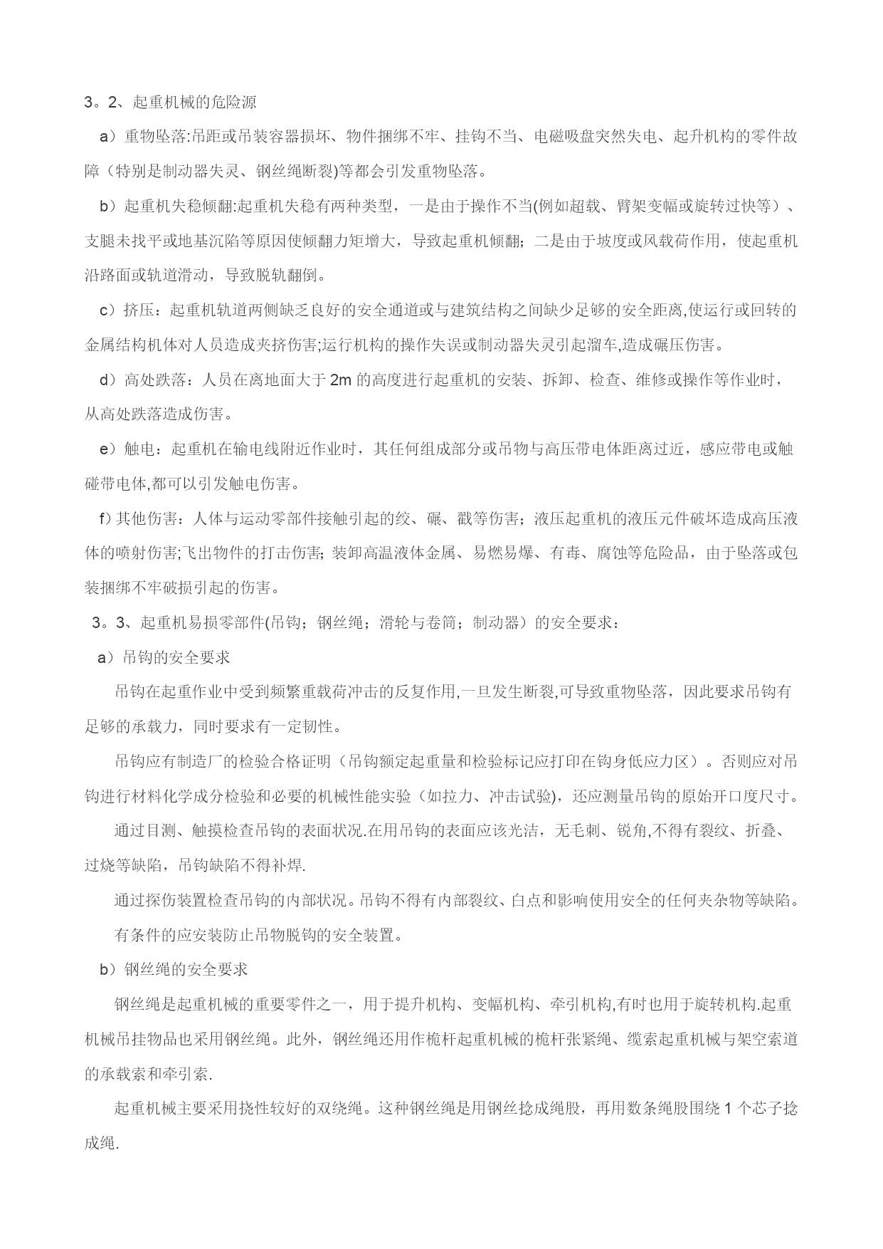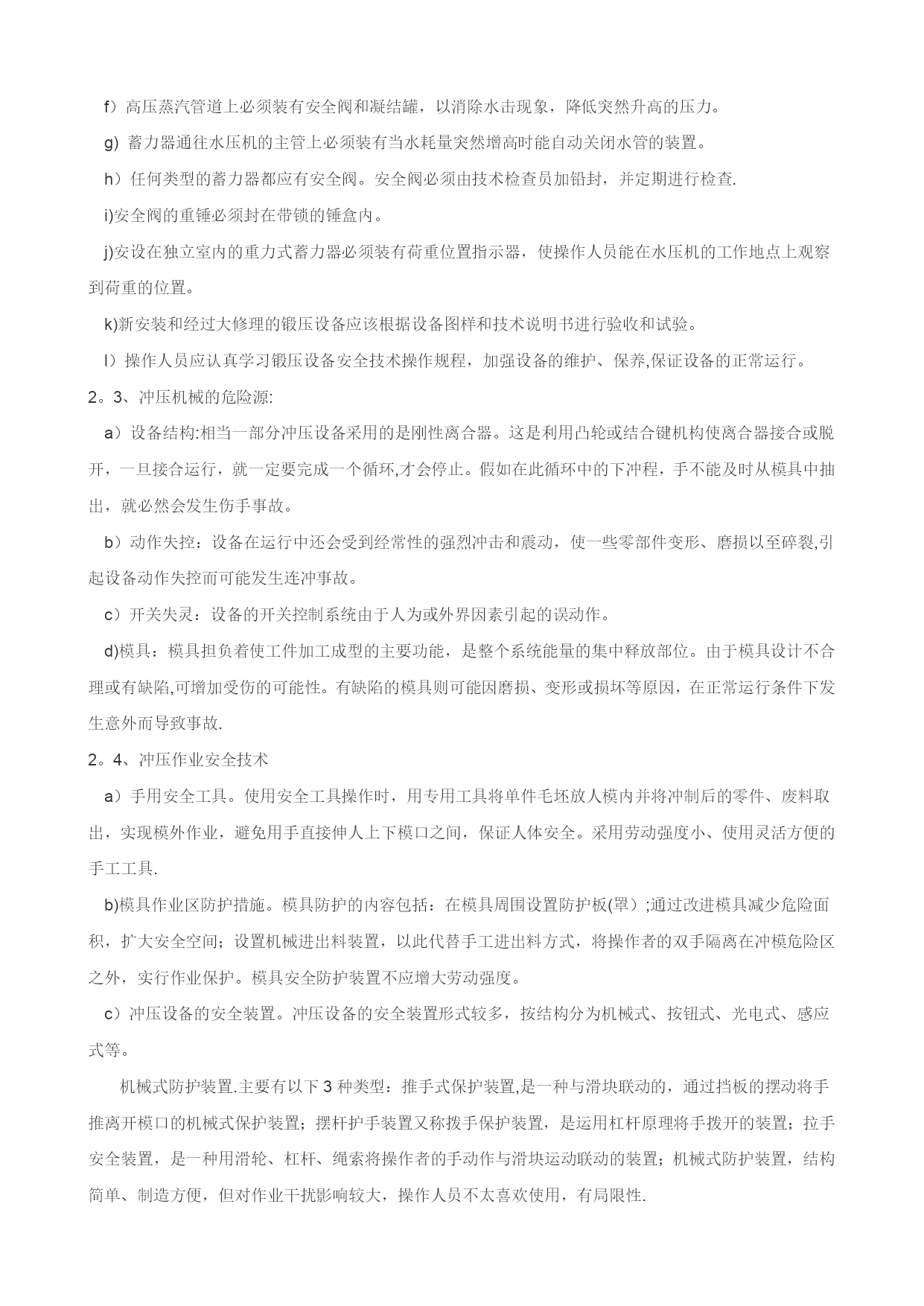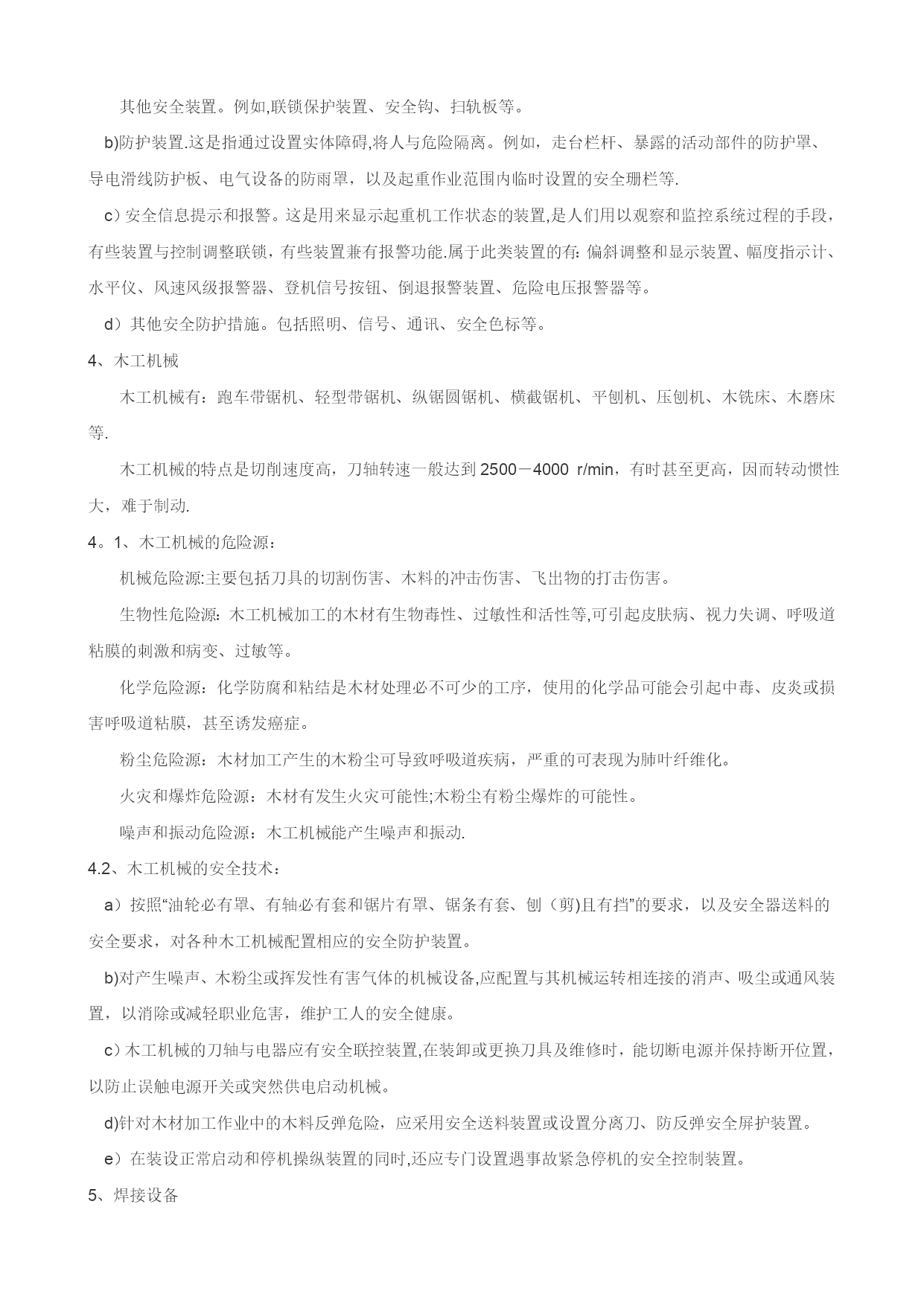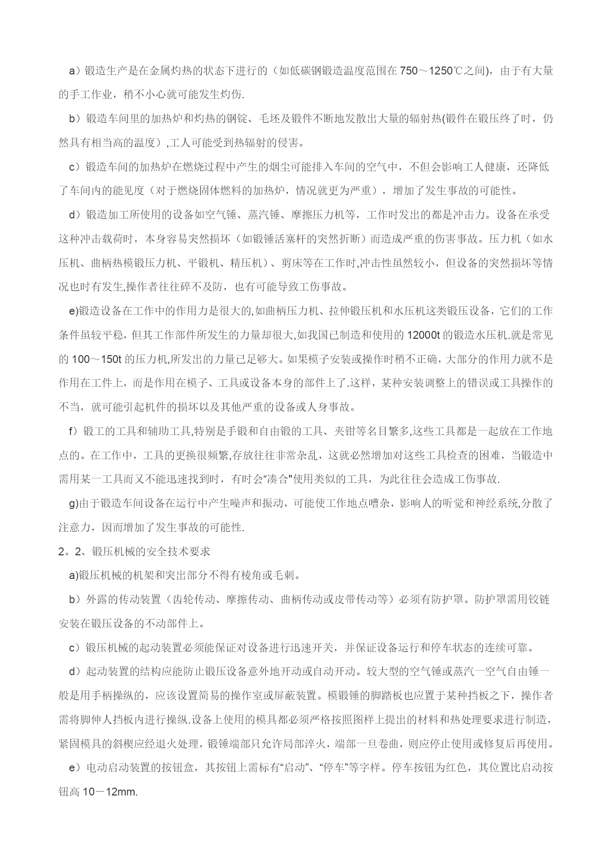 职业健康安全技术基础(可以直接使用,可编辑优秀版资料,欢迎下载)职业健康安全技术基础一、通用机械的安全技术1、金属切削机床及砂轮:1.1、金属切削机床:金属切削机床是用切削方法将毛坯加工成机器零件的设备.金属切削机床上装卡被加工工件和切削刀具,带动工件和刀具进行相对运动。在相对运动中,刀具从工件表面切去多余的金属层,使工件成为符合预定技术要求的机器零件。1。1.1、金属切削机床的危险源:a)金属切削机床的驱动电能:可能会使人员受到触电伤害。b)相对人体运动的静止部件:如,操作人员接触切削刀具、突出较长的机械部分、毛坯、工具和设备边缘锋利飞边及表面粗燥部分,可能会受到伤害。c)旋转部件:旋转轴、凸块和孔、研磨工具和切削刀具,易绞缠人体。d)内旋转咬合部件:对向旋转部件的咬合,旋转部件和成切线运动部件面的咬合,旋转部件和固定部件的咬合部分,可能造成人员的绞伤、碾伤。e)往复运动或滑动的部件:单向运动、往复运动或滑动、旋转与滑动组合、振动部件,会造成人员的伤害。f)飞出物:飞出的装夹具或机械部件,飞出的切屑或工件,会击伤人员。1。1.2、金属切削机床危险源的控制措施a)设备可靠接地,照明采用安全电压。b)楔子、销子不能突出表面,。c)用专用工具清理铁屑,带护目镜。d)加工细长杆轴料时,尾部安防弯装置及设料架。e)零部件装卡牢固。f)及时维修防护保险装置、防护栏、保护盖等安全防护、保护装置.e)杜绝操作旋转机床戴手套等违章现象,穿戴好劳动保护用品。1.2、砂轮机的安全技术砂轮机是机械工厂最常用的机械设备之一,各个工种都可能用到它。砂轮质脆易碎、转速高、使用频繁,极易伤人.它的安装位置是否合理,是否符合安全要求,它的使用方法是否正确,是否符合安全操作规程,这些问题都直接关系到职工的人身安全,因此在实际使用中必须引起足够的重视.、砂轮机安装安装位置.砂轮机禁止安装在正对着附近设备及操作人员或经常有人过往的地方。较大的车间应设置专用的砂轮机房。如果因厂房地形的限制不能设置专用的砂轮机房,则应在砂轮机正面装设不低于1。8m高度的防护挡板,并且挡板要求牢固有效.砂轮的平衡.砂轮不平衡造成的危害主要表现在两个方面:一方面在砂轮高速旋转时,引起振动;另一方面,不平衡加速了主轴轴承的磨损,严重时会造成砂轮的破裂,造成事故。直径大于或等于200mm的砂轮装上法兰盘后应先进行平衡调试,砂轮在经过整形修整后或在工作中发现不平衡时,应重复进行调试直到平衡.砂轮与卡盘的匹配。匹配问题主要是指卡盘与砂轮的安装配套问题。按标准要求,砂轮法兰盘直径不得小于被安装砂轮直径的1/3,且规定砂轮磨损到直径比法兰盘直径大10mm时应更换新砂轮。此外,在砂轮与法兰盘之间还应加装直径大于卡盘直径2mm、厚度为1~2mm的软垫。砂轮机的防护罩。防护罩是砂轮机最主要的防护装置,其作用是当砂轮在工作中因故破坏时,能够有效地罩住砂轮碎片,保证人员的安全。砂轮防护罩的开口角度在主轴水平面以上不允许超过65°;防护罩的安装应牢固可靠,不得随意拆卸或丢弃不用.防护罩在主轴水平面以上开口大于、等于30°时必须设挡屑屏板,以遮挡磨削飞屑,避免伤及操作人员。它安装于防护罩开口正端,宽度应大于砂轮防护罩宽度,并且应牢固地固定在防护罩上。此外,砂轮圆周表面与挡板的间隙应小于6mm砂轮机的工件托架。托架是砂轮机常用的附件之一.砂轮直径在150mm以上的砂轮机必须设置可调托架。砂轮与托架之间的距离应小于被磨工件最小外形尺寸的l/2,但最大不应超过3mm。砂轮机的接地保护。砂轮机的外壳必须有良好的接地保护装置.1.2。2、砂轮机使用禁止侧面磨削.按规定,用圆周表面做工作面的砂轮不宜使用侧面进行磨削。砂轮的径向强度较大,而轴向强度很小,且受到不平衡的侧向力作用,操作者用力过大会造成砂轮破碎,甚至伤人。不准正面操作。使用砂轮机磨削工件时,操作者应站在砂轮的侧面,不得在砂轮的正面进行操作,以免砂轮破碎飞出伤人。不准共同操作。2人共用1台砂轮机同时操作,是一种严重的违章操作,应严格禁止。2、锻压与冲压机械锻造是金属压力加工的方法之一,它是机械制造生产中的一个重要环节.根据锻造加工时金属材料所处温度状态的不同,锻造又可分为热锻、温锻和冷锻。冲压机械设备包括剪板机、曲柄压力机和液压机等.2.1、锻压机械的危险源:a)锻造生产是在金属灼热的状态下进行的(如低碳钢锻造温度范围在750~1250℃之间),由于有大量的手工作业,稍不小心就可能发生灼伤.b)锻造车间里的加热炉和灼热的钢锭、毛坯及锻件不断地发散出大量的辐射热(锻件在锻压终了时,仍然具有相当高的温度),工人可能受到热辐射的侵害。c)锻造车间的加热炉在燃烧过程中产生的烟尘可能排入车间的
