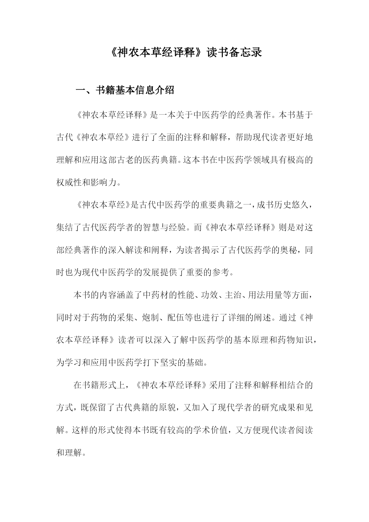 《神农本草经译释》读书备忘录一、书籍基本信息介绍《神农本草经译释》是一本关于中医药学的经典著作。本书基于古代《神农本草经》进行了全面的注释和解释,帮助现代读者更好地理解和应用这部古老的医药典籍。这本书在中医药学领域具有极高的权威性和影响力。《神农本草经》是古代中医药学的重要典籍之一,成书历史悠久,集结了古代医药学者的智慧与经验。而《神农本草经译释》则是对这部经典著作的深入解读和阐释,为读者揭示了古代医药学的奥秘,同时也为现代中医药学的发展提供了重要的参考。本书的内容涵盖了中药材的性能、功效、主治、用法用量
