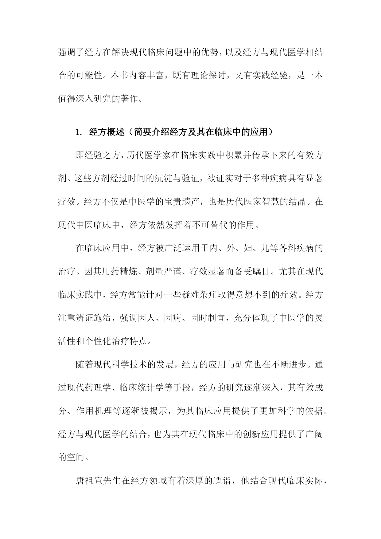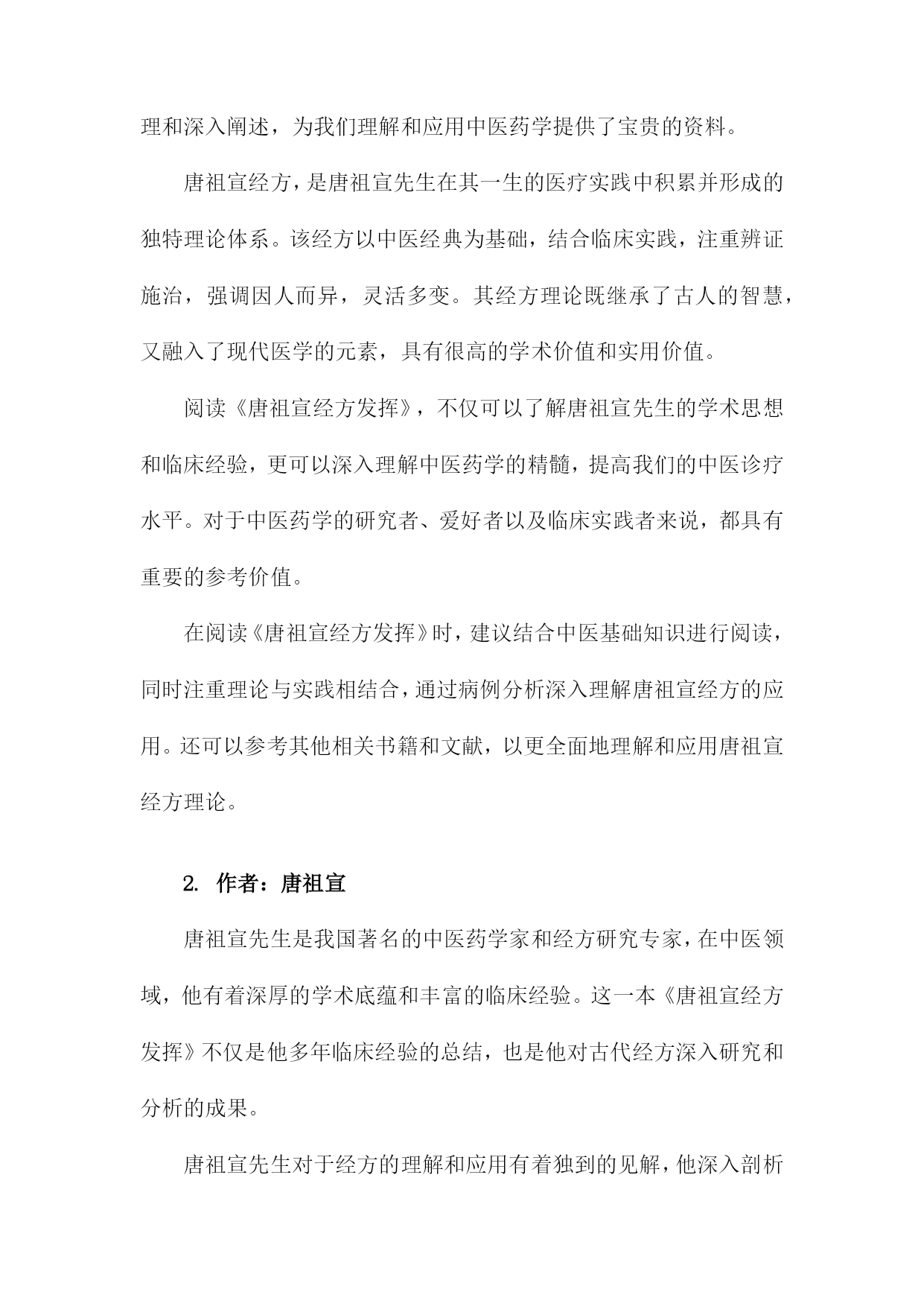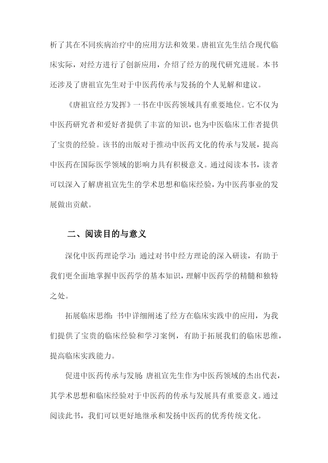 《唐祖宣经方发挥》读书备忘录一、书籍基本信息内容简介:本书是对唐祖宣先生经方理论与实践的总结,详细介绍了唐祖宣先生对经方的研究心得和临床经验。书中不仅探讨了经方的理论内涵,还展示了经方的实际应用效果,为读者提供了学习和应用经方的宝贵资料。本书适合中医从业者、中医爱好者以及学习中医的人群阅读。本书通过对唐祖宣先生经方经验的梳理,让读者深入了解经方的精髓和应用技巧,为临床实践提供了宝贵的参考。书中还介绍了经方在现代医学中的价值和意义,对于推动中医的发展具有一定的促进作用。个人备注:在阅读本书之前,我对唐祖宣先