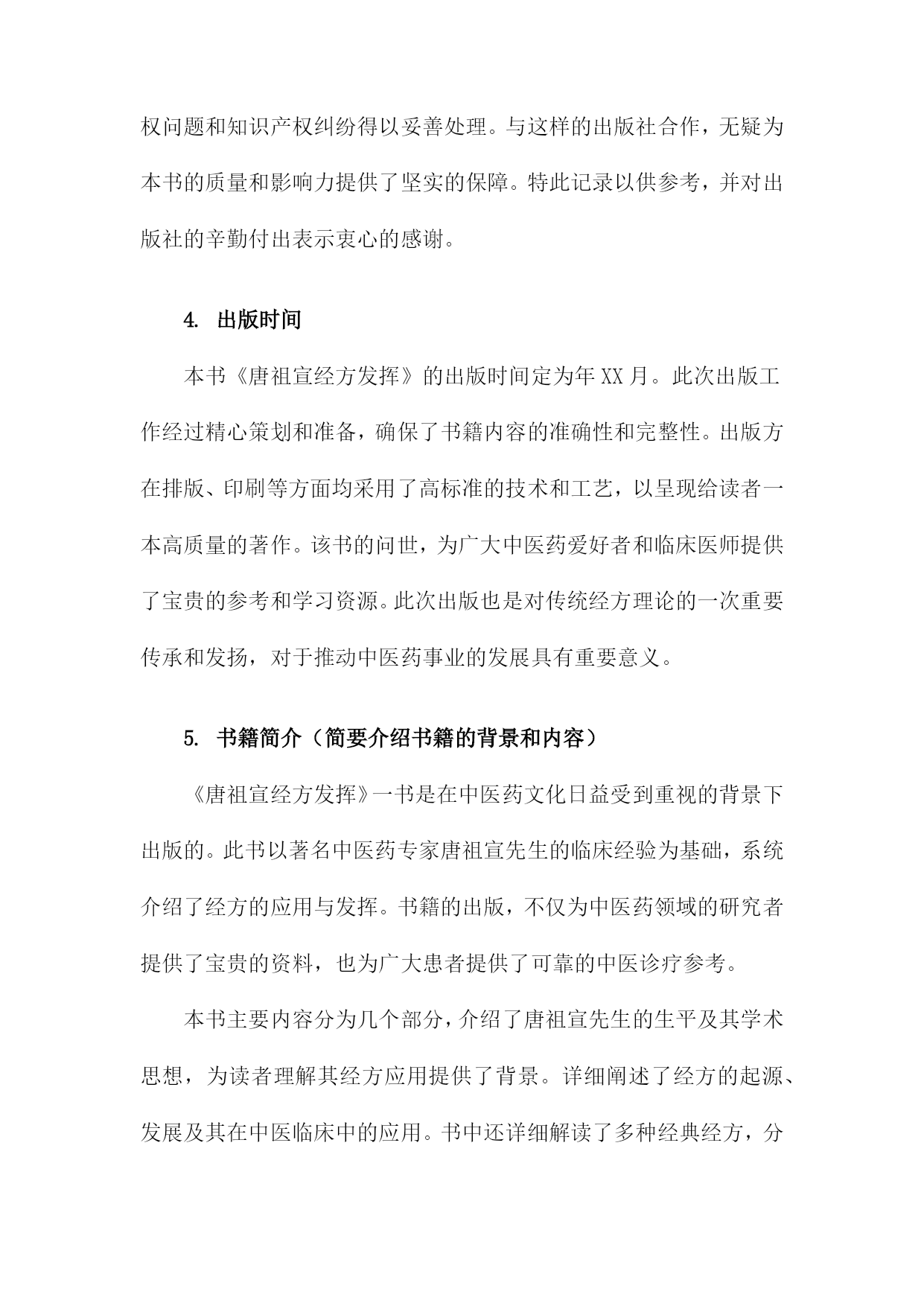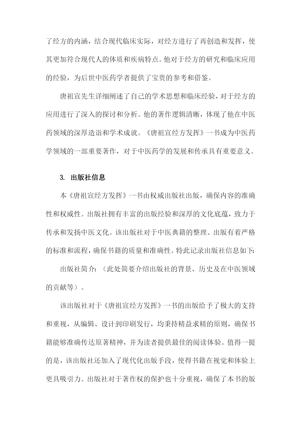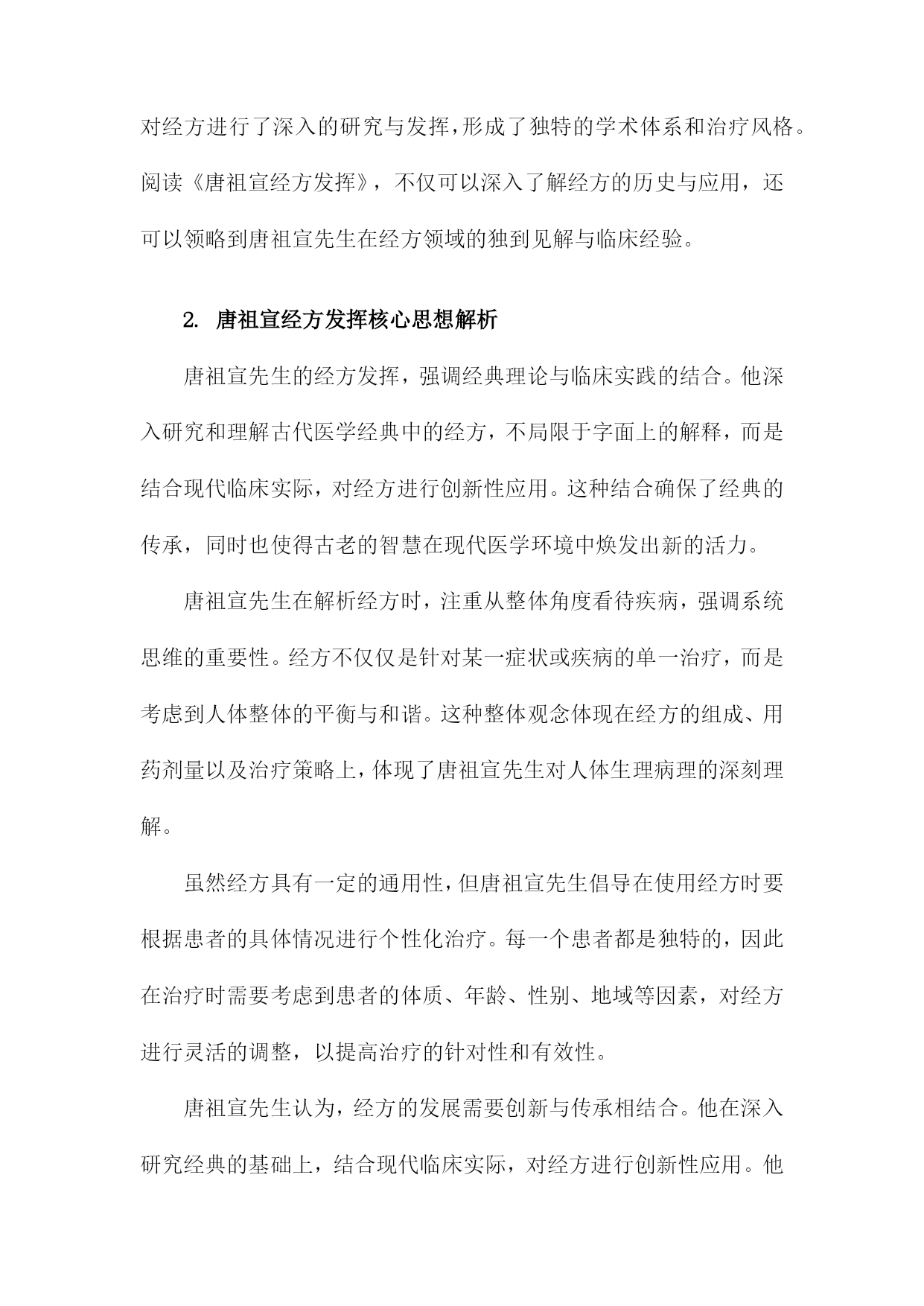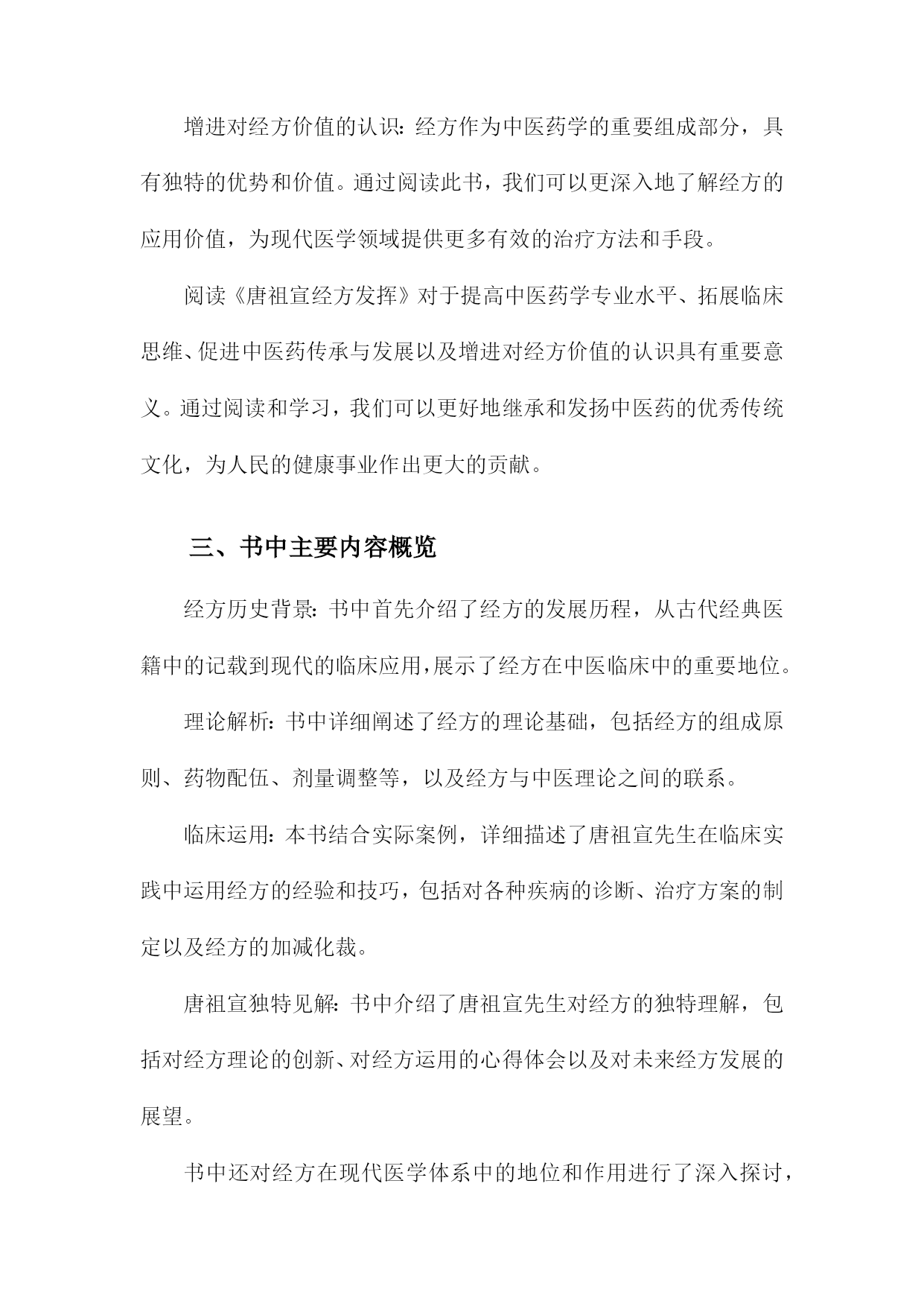 《唐祖宣经方发挥》读书备忘录一、书籍基本信息内容简介:本书是对唐祖宣先生经方理论与实践的总结,详细介绍了唐祖宣先生对经方的研究心得和临床经验。书中不仅探讨了经方的理论内涵,还展示了经方的实际应用效果,为读者提供了学习和应用经方的宝贵资料。本书适合中医从业者、中医爱好者以及学习中医的人群阅读。本书通过对唐祖宣先生经方经验的梳理,让读者深入了解经方的精髓和应用技巧,为临床实践提供了宝贵的参考。书中还介绍了经方在现代医学中的价值和意义,对于推动中医的发展具有一定的促进作用。个人备注:在阅读本书之前,我对唐祖宣先