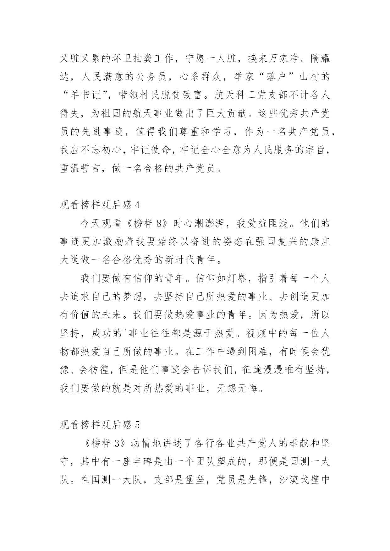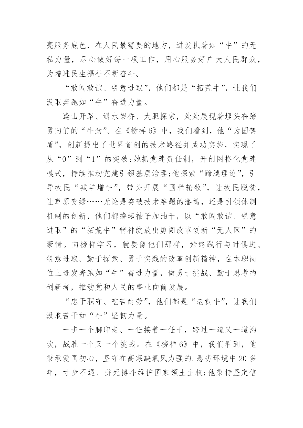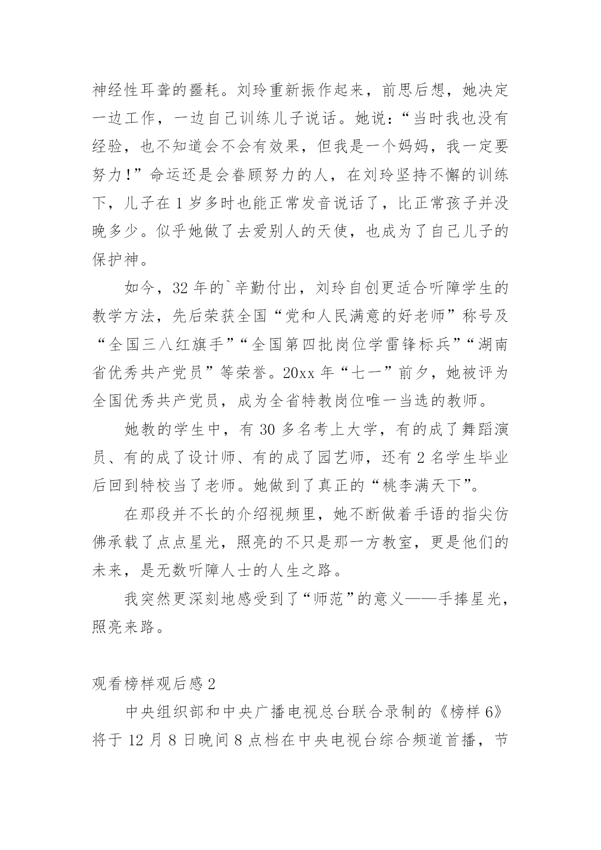 观看榜样观后感在看完一部作品以后,相信你会有不少感想吧,观后感需要表达真实的情感,不能虚假刻意。快来参考观后感是怎么写的吧,下面是小编精心整理的观看榜样观后感,希望能够帮助到大家。观看榜样观后感1作为一名师范生,我时常会思考,怎么才算得上是“桃李满天下”。我想过站在讲台上,台下几十名学生认真思考的样子;想过办公室里,三五结队的毕业生回到学校看望老师的样子;想过在各种岗位上同偶遇的老师侃侃而谈的学生的样子。但我似乎从没想过台下只有八名听不见声音的学生,只能靠手语和肢体语言,去让他们感受发音,感受世界的样子。我在《榜样8》中认识了衡阳市特殊教育学校教师刘玲,而我所不曾幻想过的“桃李满天下”,每天都在她身上上演。1973年,刘玲出生于衡阳市一个普通工人家庭,邻居是一名聋哑人,不识字也不能讲话。她从小就想,如果有学校能让他们从小就识字、学说话,那该多好。后来,她报考了南京特殊教育师范学校。18岁毕业那年,成为衡阳市特殊教育学校听障一年级的班主任。或许是命运弄人,即使十几年一心扑在听障教育上,在刘玲32岁时,还是收到了7个月大的儿子被诊断为先天性神经性耳聋的噩耗。刘玲重新振作起来,前思后想,她决定一边工作,一边自己训练儿子说话。她说:“当时我也没有经验,也不知道会不会有效果,但我是一个妈妈,我一定要努力!”命运还是会眷顾努力的人,在刘玲坚持不懈的训练下,儿子在1岁多时也能正常发音说话了,比正常孩子并没晚多少。似乎她做了去爱别人的天使,也成为了自己儿子的保护神。如今,32年的`辛勤付出,刘玲自创更适合听障学生的教学方法,先后荣获全国“党和人民满意的好老师”称号及“全国三八红旗手”“全国第四批岗位学雷锋标兵”“湖南省优秀共产党员”等荣誉。20xx年“七一”前夕,她被评为全国优秀共产党员,成为全省特教岗位唯一当选的教师。她教的学生中,有30多名考上大学,有的成了舞蹈演员、有的成了设计师、有的成了园艺师,还有2名学生毕业后回到特校当了老师。她做到了真正的“桃李满天下”。在那段并不长的介绍视频里,她不断做着手语的指尖仿佛承载了点点星光,照亮的不只是那一方教室,更是他们的未来,是无数听障人士的人生之路。我突然更深刻地感受到了“师范”的意义——手捧星光,照亮来路。观看榜样观后感2中央组织部和中央广播电视总台联合录制的《榜样6》将于12月8日晚间8点档在中央电视台综合频道首播,节目重点宣传“七一勋章”获得者和全国“两优一先”表彰对象典型事迹,通过典型事迹再现、现场访谈、重温入党誓词等形式,生动展现了中国共产党人坚定信念、践行宗旨、拼搏奉献、廉洁奉公的高尚品质和崇高精神,彰显基层党组织战斗堡垒作用和党员先锋模范作用,是开展党员教育培训的生动教材。榜样的力量是无穷的,精神的力量是伟大的。在《榜样6》中,一个个平凡的灵魂,却带给了我们不平凡的感受,他们在最普通的岗位上,在为人民服务的最前沿,用实际行动诠释了忠诚与担当、理想与信念、敬业与奉献,他们身上的“牛”力量,为我们树立了榜样,立起了标杆,鼓舞和激励着我们乘风破浪、扬帆远航,谱写干事创业新篇章。“不求回报、甘于奉献”,他们都是“孺子牛”,让我们汲取执着如“牛”无私力量。始终坚持以人民为中心,一切为了人民、一切依靠人民,永远为人民利益而奋斗。在《榜样6》中,我们看到,她用生命“燃灯”,坚守贫困地区教育一线40余年,创办全国第一所全免费女子高中,帮助约20xx名贫困山区女孩考上大学;他甘做“当代愚公”,团结带领村民历时36年,靠着锄头、钢钎和铁锤建成一条“生命渠”……为了党和人民的事业,他们始终心怀“国之大者”,用奉献点亮人生的征途,以“不求回报、甘于奉献”的“孺子牛”精神诠释对党忠诚、心系群众、无私奉献的优秀品质。向榜样学习,就要像他们那样,始终保持对人民群众的赤子之心,厚植公仆情怀、擦亮服务底色,在人民最需要的地方,迸发执着如“牛”的无私力量,尽心做好每一项工作,用心服务好广大人民群众,为增进民生福祉不断奋斗。“敢闯敢试、锐意进取”,他们都是“拓荒牛”,让我们汲取奔跑如“牛”奋进力量。逢山开路、遇水架桥、大胆探索,处处展现着埋头奋蹄勇向前的“牛劲”。在《榜样6》中,我们看到,他“为国铸盾”,创新提出了世界首创的技术路径并成功实施,实现了从“0”到“1”的突破;她抓党建责任制,开创网格化党建模式,持续推动党建引领基层治理;他探索“蹄腿理论”,引导牧民“减羊增牛”,带头开展“围栏轮牧”,让牧民脱贫,让草原变绿……无论是突破技术难题的藩篱,还是引领体制机制的创新,他们都撸起袖子加油干,以“敢闯敢试、锐意进取”的“拓荒牛”精神绽放出勇闯改革创新“无人区”的豪情。向榜样学习,就要像他们那样,始终践行与时俱进、锐意进取、勤于探索、勇于实践的改革创新精神,在本职岗位上迸发奔跑如“牛”奋进力量,做勇于挑战、勤于思考的