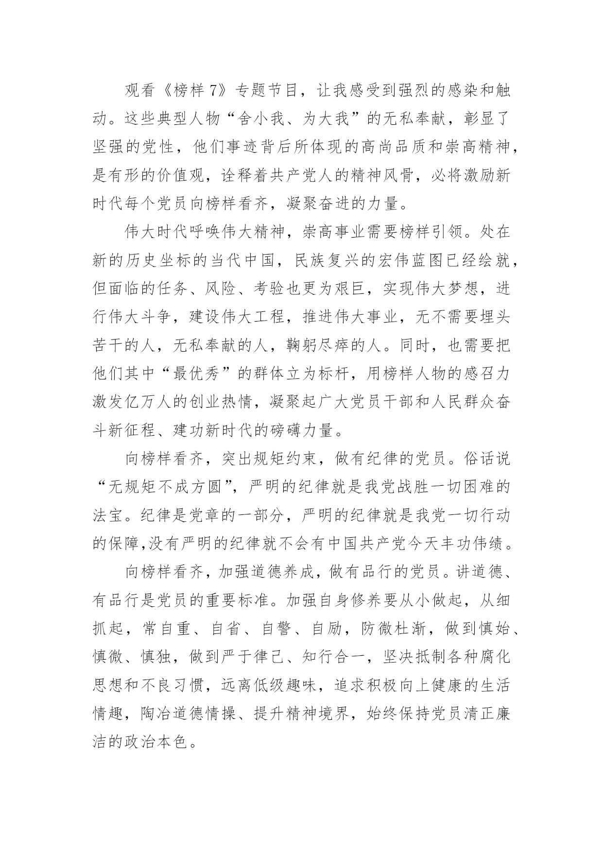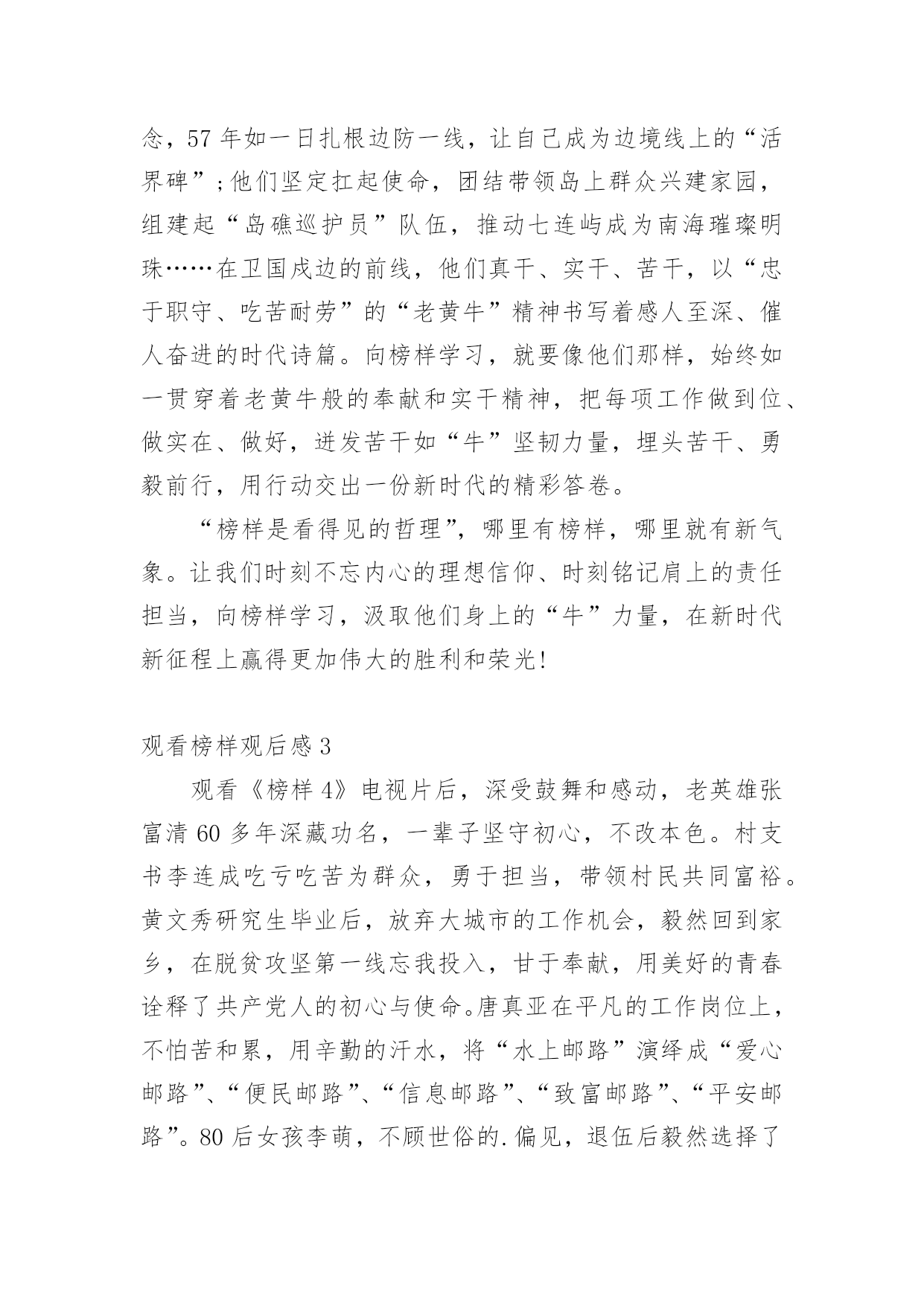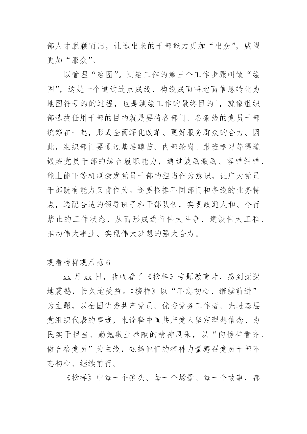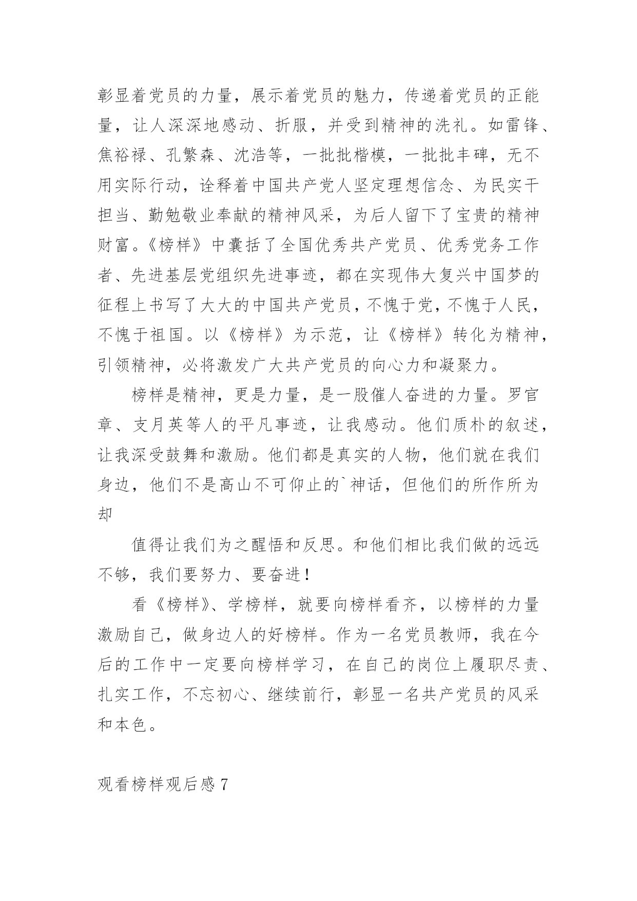 观看榜样观后感在看完一部作品以后,相信你会有不少感想吧,观后感需要表达真实的情感,不能虚假刻意。快来参考观后感是怎么写的吧,下面是小编精心整理的观看榜样观后感,希望能够帮助到大家。观看榜样观后感1作为一名师范生,我时常会思考,怎么才算得上是“桃李满天下”。我想过站在讲台上,台下几十名学生认真思考的样子;想过办公室里,三五结队的毕业生回到学校看望老师的样子;想过在各种岗位上同偶遇的老师侃侃而谈的学生的样子。但我似乎从没想过台下只有八名听不见声音的学生,只能靠手语和肢体语言,去让他们感受发音,感受世界的样子。我在《榜样8》中认识了衡阳市特殊教育学校教师刘玲,而我所不曾幻想过的“桃李满天下”,每天都在她身上上演。1973年,刘玲出生于衡阳市一个普通工人家庭,邻居是一名聋哑人,不识字也不能讲话。她从小就想,如果有学校能让他们从小就识字、学说话,那该多好。后来,她报考了南京特殊教育师范学校。18岁毕业那年,成为衡阳市特殊教育学校听障一年级的班主任。或许是命运弄人,即使十几年一心扑在听障教育上,在刘玲32岁时,还是收到了7个月大的儿子被诊断为先天性神经性耳聋的噩耗。刘玲重新振作起来,前思后想,她决定一边工作,一边自己训练儿子说话。她说:“当时我也没有经验,也不知道会不会有效果,但我是一个妈妈,我一定要努力!”命运还是会眷顾努力的人,在刘玲坚持不懈的训练下,儿子在1岁多时也能正常发音说话了,比正常孩子并没晚多少。似乎她做了去爱别人的天使,也成为了自己儿子的保护神。如今,32年的`辛勤付出,刘玲自创更适合听障学生的教学方法,先后荣获全国“党和人民满意的好老师”称号及“全国三八红旗手”“全国第四批岗位学雷锋标兵”“湖南省优秀共产党员”等荣誉。20xx年“七一”前夕,她被评为全国优秀共产党员,成为全省特教岗位唯一当选的教师。她教的学生中,有30多名考上大学,有的成了舞蹈演员、有的成了设计师、有的成了园艺师,还有2名学生毕业后回到特校当了老师。她做到了真正的“桃李满天下”。在那段并不长的介绍视频里,她不断做着手语的指尖仿佛承载了点点星光,照亮的不只是那一方教室,更是他们的未来,是无数听障人士的人生之路。我突然更深刻地感受到了“师范”的意义——手捧星光,照亮来路。观看榜样观后感2中央组织部和中央广播电视总台联合录制的《榜样6》将于12月8日晚间8点档在中央电视台综合频道首播,节目重点宣传“七一勋章”获得者和全国“两优一先”表彰对象典型事迹,通过典型事迹再现、现场访谈、重温入党誓词等形式,生动展现了中国共产党人坚定信念、践行宗旨、拼搏奉献、廉洁奉公的高尚品质和崇高精神,彰显基层党组织战斗堡垒作用和党员先锋模范作用,是开展党员教育培训的生动教材。榜样的力量是无穷的,精神的力量是伟大的。在《榜样6》中,一个个平凡的灵魂,却带给了我们不平凡的感受,他们在最普通的岗位上,在为人民服务的最前沿,用实际行动诠释了忠诚与担当、理想与信念、敬业与奉献,他们身上的“牛”力量,为我们树立了榜样,立起了标杆,鼓舞和激励着我们乘风破浪、扬帆远航,谱写干事创业新篇章。“不求回报、甘于奉献”,他们都是“孺子牛”,让我们汲取执着如“牛”无私力量。始终坚持以人民为中心,一切为了人民、一切依靠人民,永远为人民利益而奋斗。在《榜样6》中,我们看到,她用生命“燃灯”,坚守贫困地区教育一线40余年,创办全国第一所全免费女子高中,帮助约20xx名贫困山区女孩考上大学;他甘做“当代愚公”,团结带领村民历时36年,靠着锄头、钢钎和铁锤建成一条“生命渠”……为了党和人民的事业,他们始终心怀“国之大者”,用奉献点亮人生的征途,以“不求回报、甘于奉献”的“孺子牛”精神诠释对党忠诚、心系群众、无私奉献的优秀品质。向榜样学习,就要像他们那样,始终保持对人民群众的赤子之心,厚植公仆情怀、擦亮服务底色,在人民最需要的地方,迸发执着如“牛”的无私力量,尽心做好每一项工作,用心服务好广大人民群众,为增进民生福祉不断奋斗。“敢闯敢试、锐意进取”,他们都是“拓荒牛”,让我们汲取奔跑如“牛”奋进力量。逢山开路、遇水架桥、大胆探索,处处展现着埋头奋蹄勇向前的“牛劲”。在《榜样6》中,我们看到,他“为国铸盾”,创新提出了世界首创的技术路径并成功实施,实现了从“0”到“1”的突破;她抓党建责任制,开创网格化党建模式,持续推动党建引领基层治理;他探索“蹄腿理论”,引导牧民“减羊增牛”,带头开展“围栏轮牧”,让牧民脱贫,让草原变绿……无论是突破技术难题的藩篱,还是引领体制机制的创新,他们都撸起袖子加油干,以“敢闯敢试、锐意进取”的“拓荒牛”精神绽放出勇闯改革创新“无人区”的豪情。向榜样学习,就要像他们那样,始终践行与时俱进、锐意进取、勤于探索、勇于实践的改革创新精神,在本职岗位上迸发奔跑如“牛”奋进力量,做勇于挑战、勤于思考的