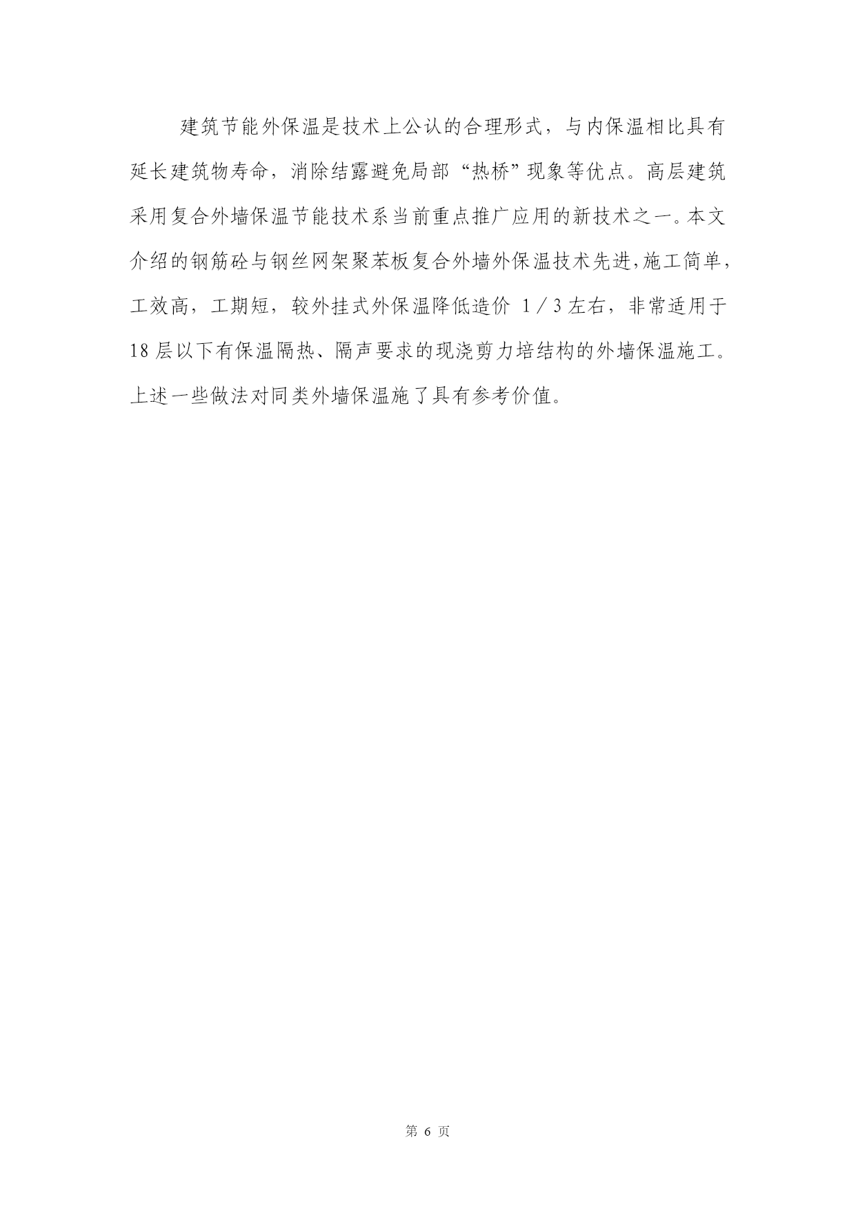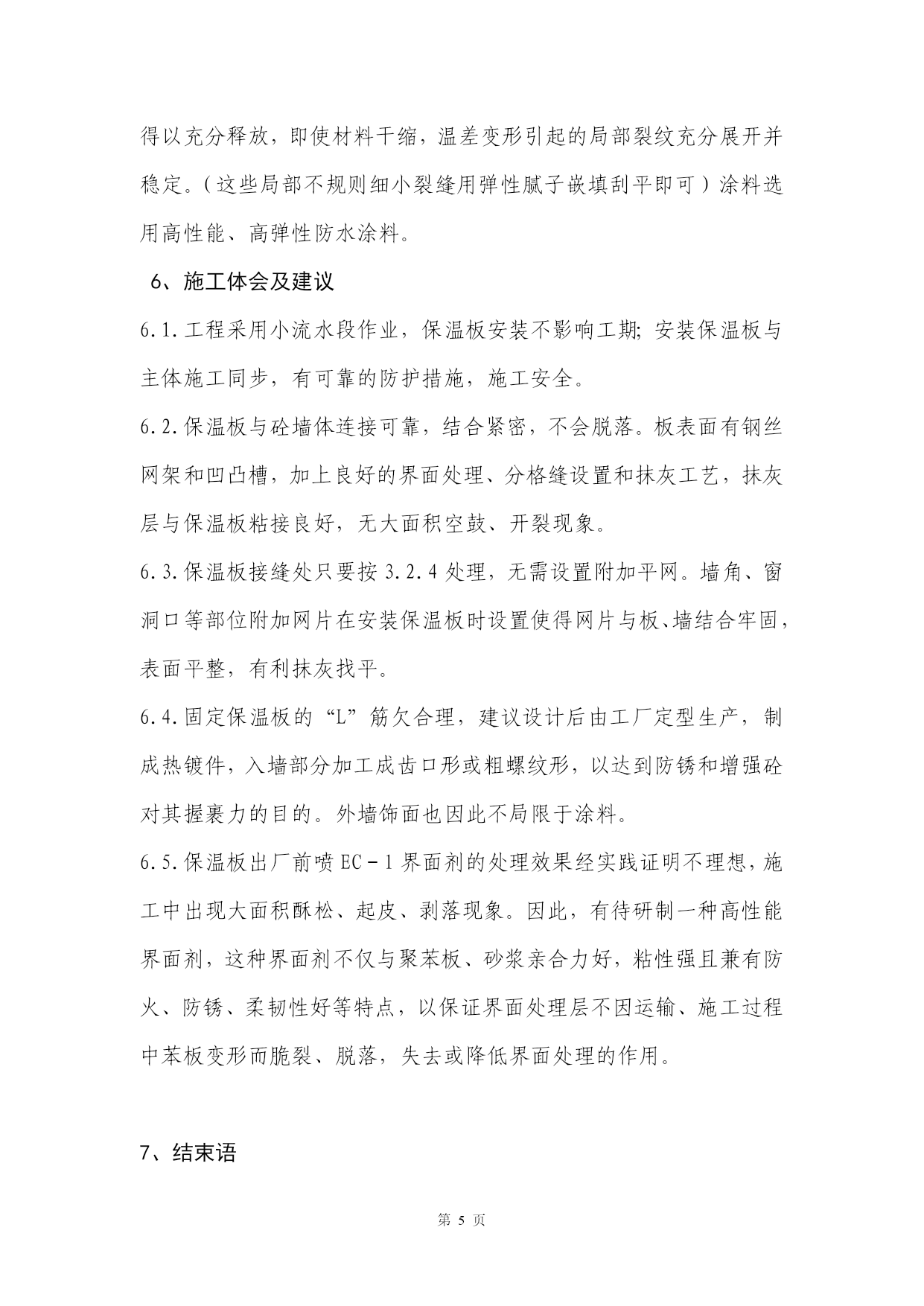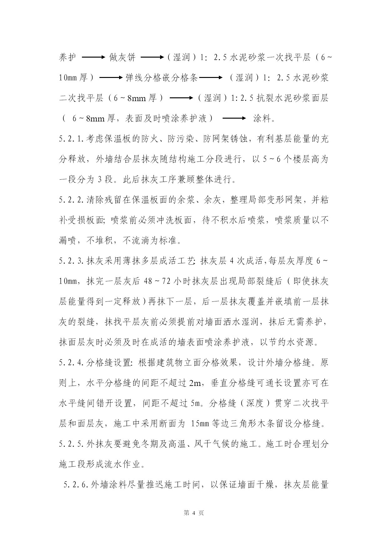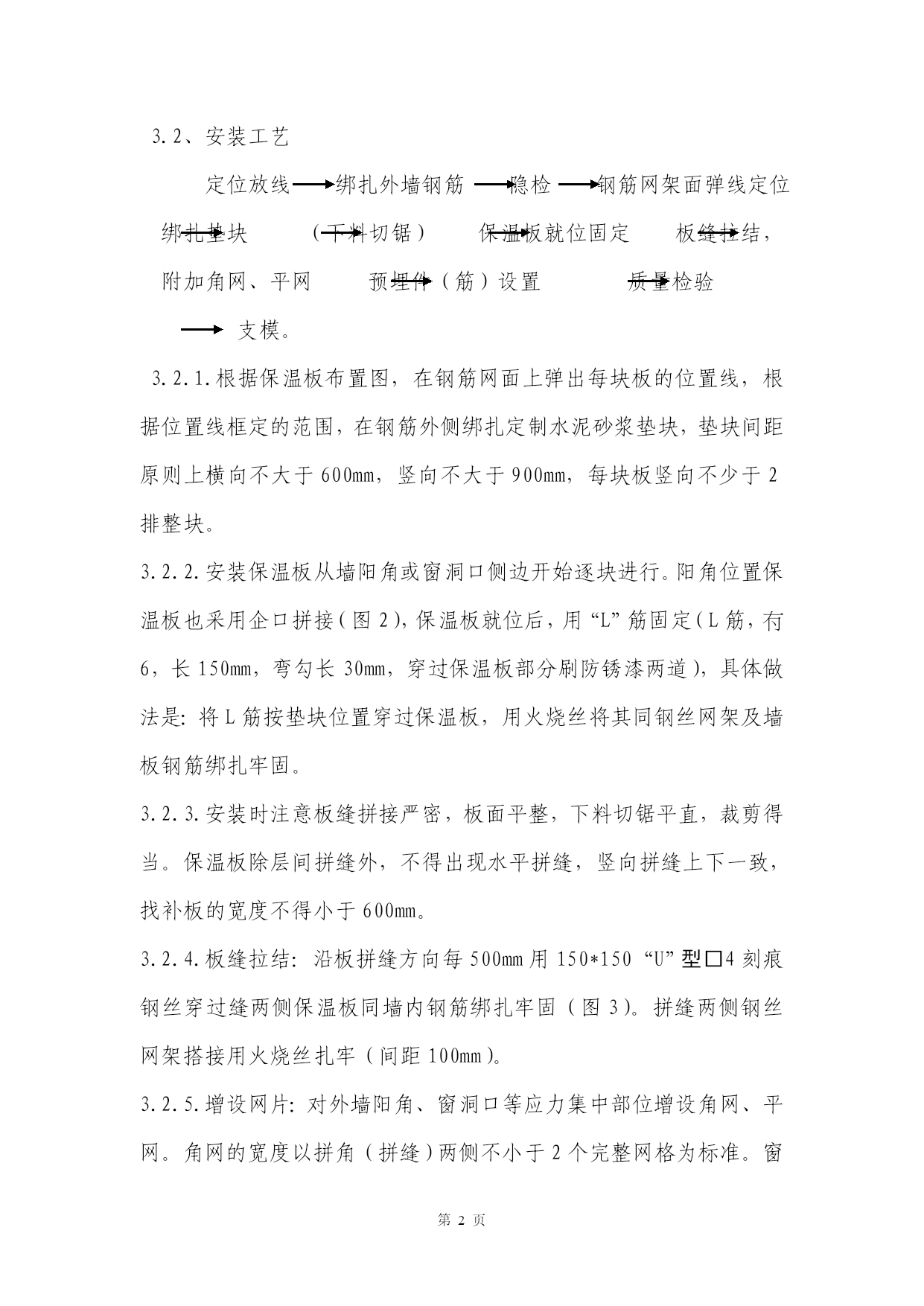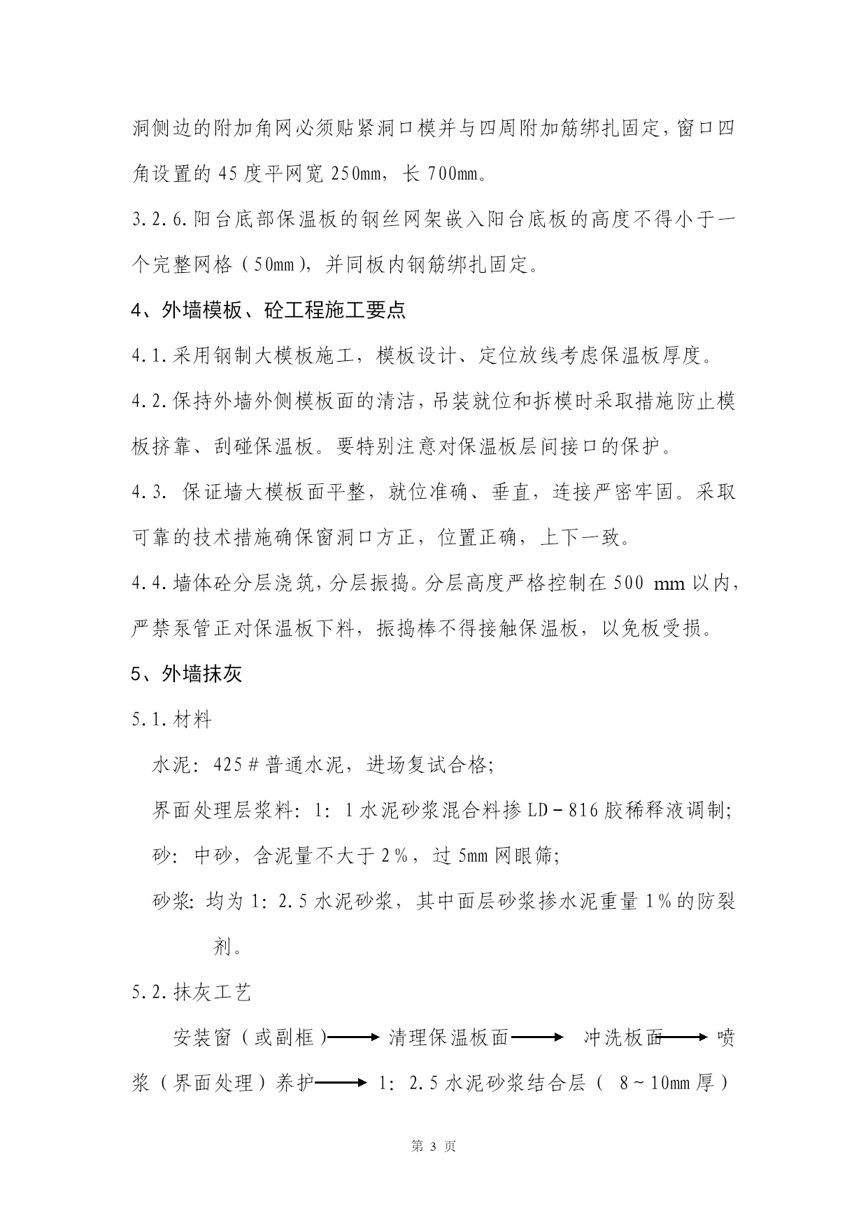 第PAGE6页高层住宅现浇混凝土外墙外保温体系的施工实践【摘要】介绍钢筋砼与钢丝网架聚苯板复合外墙外保温技术及其施工要点,同时提出改进建议。【关键词】外保温保温板安装抹灰工艺1、工程概况******工程,地下2层,地上16层,现浇钢筋砼剪力墙结构,建筑面积19800M2。建筑节能设计采用复合外墙外保温体系,外保温表面积计8900M2。外墙厚200mm,保温板50mm厚,层高2.8m。外装饰为彩色弹性涂料,铝合金窗。2、外保温构造钢筋砼与保温板复合外墙外保温做法是:在外墙钢筋骨架外侧安装保温板,支模、浇筑砼,拆模后保温板与外墙合而为一。最后在保温板面抹灰,完成外墙饰面。其构造见图1,钢筋砼外墙齿槽型聚苯板2钢丝网架界面处理层水泥砂浆结合层水泥砂浆找平层抗裂水泥砂浆面层弹性涂料。3、保温板安装3.1、保温板:设计采用密度20kg/m3,厚度50mm的齿槽型单面钢丝网架聚苯保温板(聚苯乙烯泡沫塑料板为阻燃型防火材料),规格1.2*2.8m,板的竖向侧边带有10mm深企口槽。3.2、安装工艺定位放线绑扎外墙钢筋隐检钢筋网架面弹线定位绑扎垫块(下料切锯)保温板就位固定板缝拉结,附加角网、平网预埋件(筋)设置质量检验支模。3.2.1.根据保温板布置图,在钢筋网面上弹出每块板的位置线,根据位置线框定的范围,在钢筋外侧绑扎定制水泥砂浆垫块,垫块间距原则上横向不大于600mm,竖向不大于900mm,每块板竖向不少于2排整块。3.2.2.安装保温板从墙阳角或窗洞口侧边开始逐块进行。阳角位置保温板也采用企口拼接(图2),保温板就位后,用“L”筋固定(L筋,6,长150mm,弯勾长30mm,穿过保温板部分刷防锈漆两道),具体做法是:将L筋按垫块位置穿过保温板,用火烧丝将其同钢丝网架及墙板钢筋绑扎牢固。3.2.3.安装时注意板缝拼接严密,板面平整,下料切锯平直,裁剪得当。保温板除层间拼缝外,不得出现水平拼缝,竖向拼缝上下一致,找补板的宽度不得小于600mm。3.2.4.板缝拉结:沿板拼缝方向每500mm用150*150“U”型4刻痕钢丝穿过缝两侧保温板同墙内钢筋绑扎牢固(图3)。拼缝两侧钢丝网架搭接用火烧丝扎牢(间距100mm)。3.2.5.增设网片:对外墙阳角、窗洞口等应力集中部位增设角网、平网。角网的宽度以拼角(拼缝)两侧不小于2个完整网格为标准。窗洞侧边的附加角网必须贴紧洞口模并与四周附加筋绑扎固定,窗口四角设置的45度平网宽250mm,长700mm。3.2.6.阳台底部保温板的钢丝网架嵌入阳台底板的高度不得小于一个完整网格(50mm),并同板内钢筋绑扎固定。4、外墙模板、砼工程施工要点4.1.采用钢制大模板施工,模板设计、定位放线考虑保温板厚度。4.2.保持外墙外侧模板面的清洁,吊装就位和拆模时采取措施防止模板挤靠、刮碰保温板。要特别注意对保温板层间接口的保护。4.3.保证墙大模板面平整,就位准确、垂直,连接严密牢固。采取可靠的技术措施确保窗洞口方正,位置正确,上下一致。4.4.墙体砼分层浇筑,分层振捣。分层高度严格控制在500mm以内,严禁泵管正对保温板下料,振捣棒不得接触保温板,以免板受损。5、外墙抹灰5.1.材料水泥:425#普通水泥,进场复试合格;界面处理层浆料:l:l水泥砂浆混合料掺LD-816胶稀释液调制;砂:中砂,含泥量不大于2%,过5mm网眼筛;砂浆:均为1:2.5水泥砂浆,其中面层砂浆掺水泥重量1%的防裂剂。5.2.抹灰工艺安装窗(或副框)清理保温板面冲洗板面喷浆(界面处理)养护l:2.5水泥砂浆结合层(8~10mm厚)养护做灰饼(湿润)l:2.5水泥砂浆一次找平层(6~10mm厚)弹线分格嵌分格条(湿润)l:2.5水泥砂浆二次找平层(6~8mm厚)(湿润)1:2.5抗裂水泥砂浆面层(6~8mm厚,表面及时喷涂养护液)涂料。5.2.1.考虑保温板的防火、防污染、防网架锈蚀,有利基层能量的充分释放,外墙结合层抹灰随结构施工分段进行,以5~6个楼层高为一段分为3段。此后抹灰工序兼顾整体进行。5.2.2.清除残留在保温板面的余浆、余灰,整理局部变形网架,并粘补受损板面;喷浆前必须冲洗板面,待不积水后喷浆,喷浆质量以不漏喷,不堆积,不流淌为标准。5.2.3.抹灰采用薄抹多层成活工艺:抹灰层4次成活,每层灰厚度6~10mm,抹完一层灰后48~72小时抹灰层出现局部裂缝后(即使抹灰层能量得到一定释放)再抹下一层,后一层抹灰覆盖并嵌填前一层抹灰的裂缝,抹找平层灰前必须提前对墙面洒水湿润,抹后无需养护,抹面层灰时必须及时在成活的墙表面喷涂养护液,以节约水资源。5.2.4.分格缝设置:根据建筑物立面分格效果,设计外墙分格缝。原则上,水平分格缝的间距不超过2m