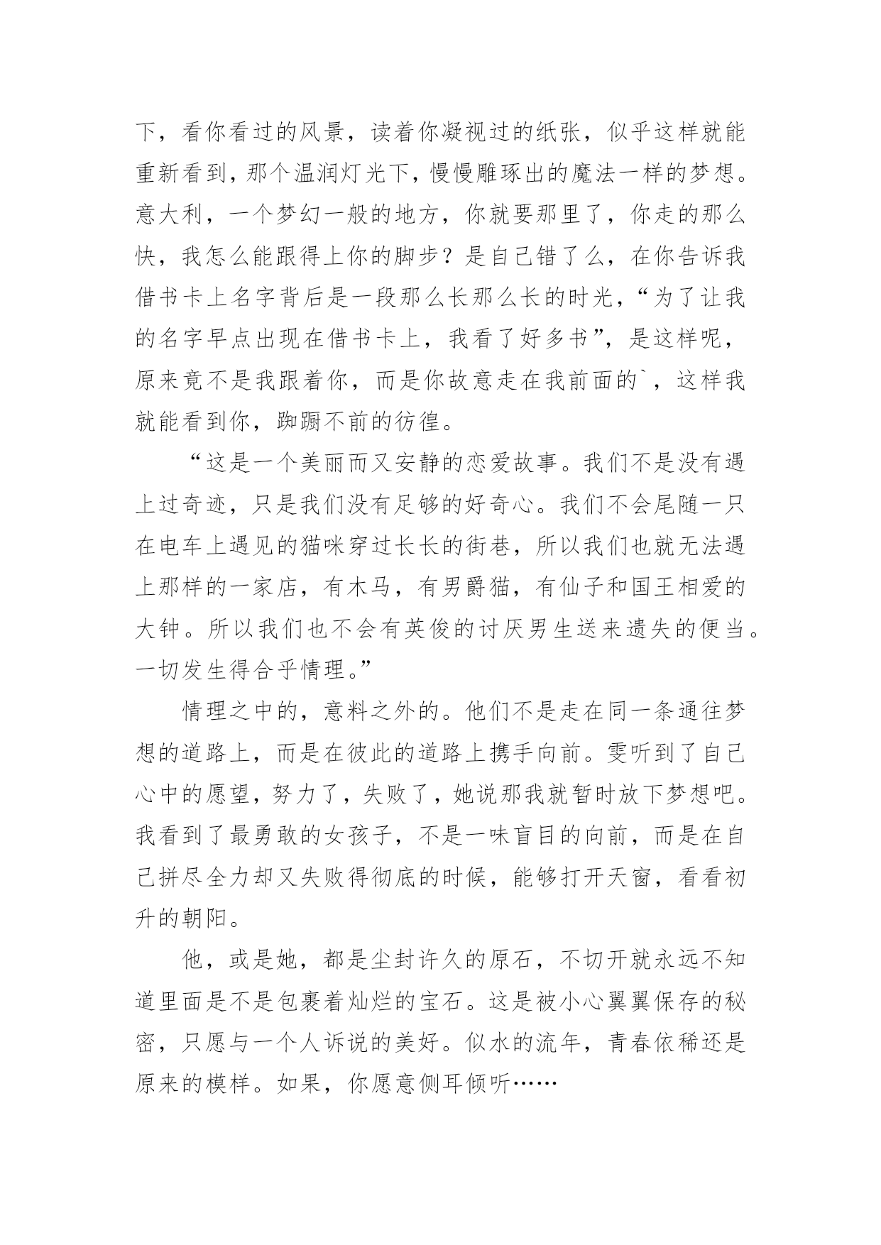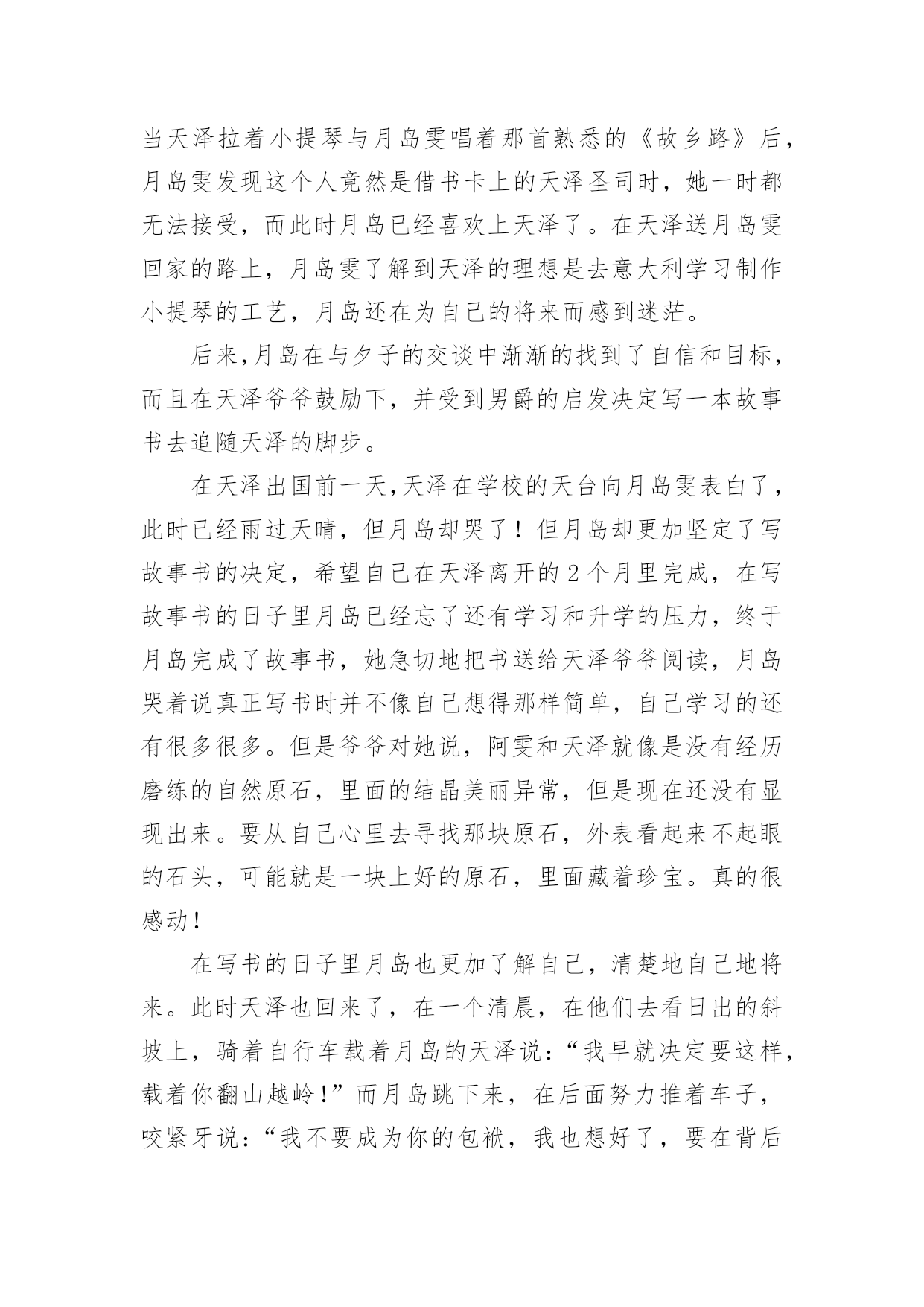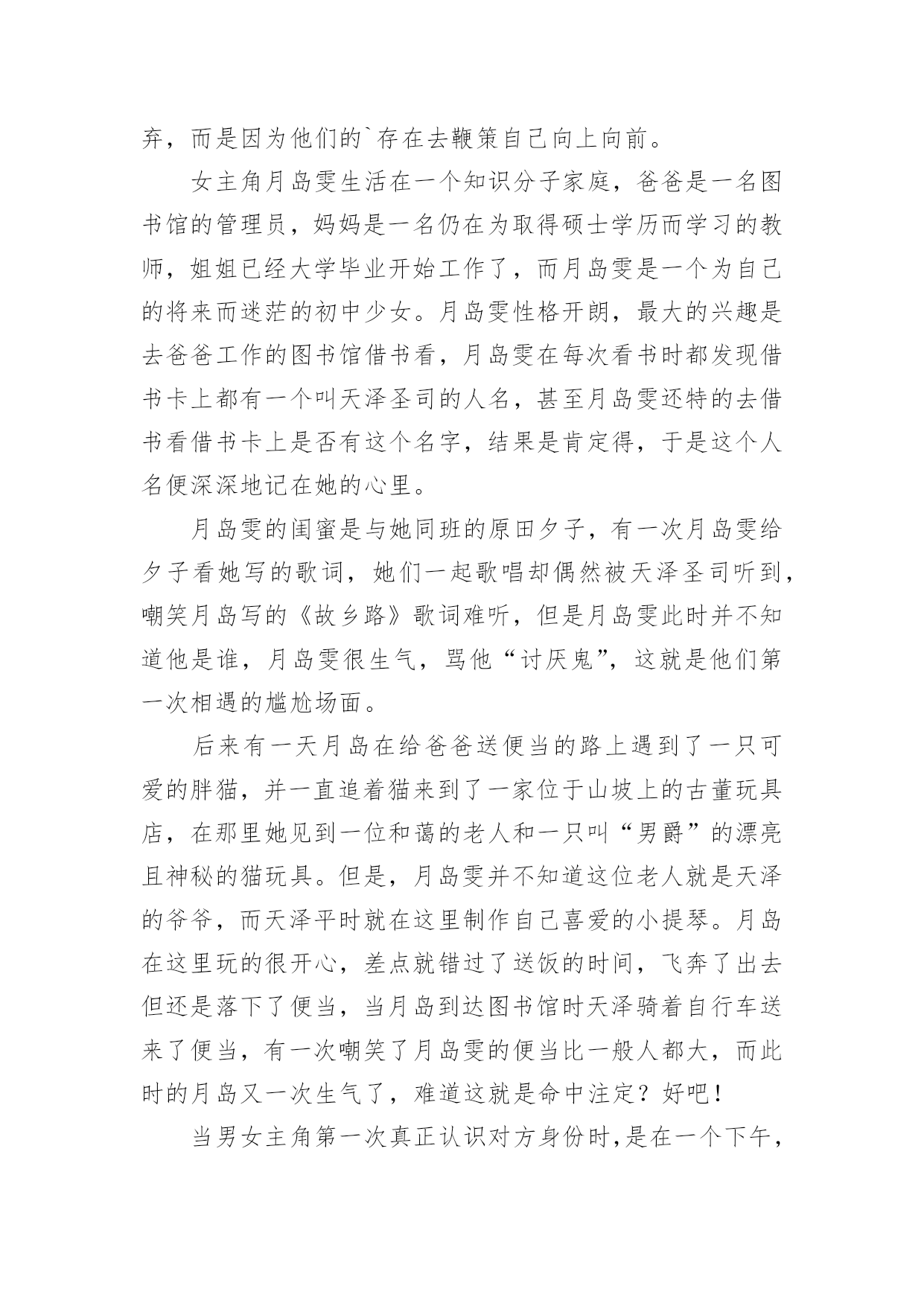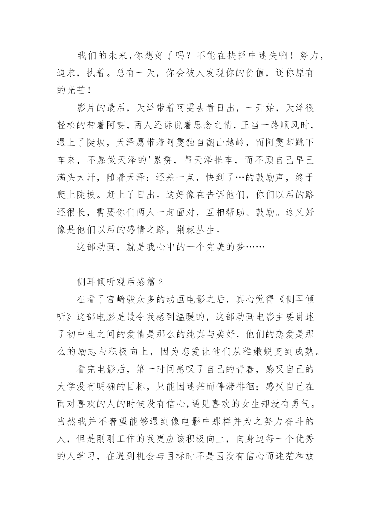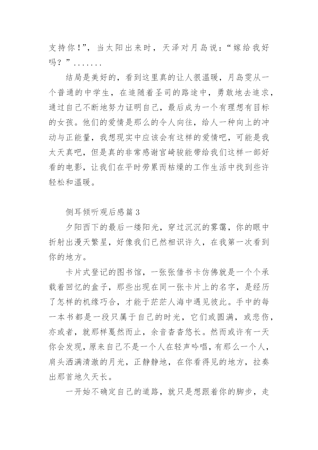 侧耳倾听观后感认真看完一部作品以后,相信你一定有很多值得分享的收获,此时需要认真地做好记录,写写观后感了。是不是无从下笔、没有头绪?下面是小编为大家整理的侧耳倾听观后感,供大家参考借鉴,希望可以帮助到有需要的朋友。侧耳倾听观后感篇1这是一部动漫电影,看起来很自然,怎么说呢,看这样的电影就是一种享受。这部电影讲的是月岛雯和天泽圣司的故事:月岛雯在念中学三年级,当然和所有毕业生一样,面对对未来的抉择,对未来的打算。可是,她对未来没有什么憧憬,不知道该做些什么。她不是一个爱念书的人,她爱写故事,爱写想象的东西。她也非常喜欢看书,并且喜欢写下自己的感受,她可以不上高中,来写关于爵士猫小说。她每次在图书馆读书时,都会看到借书卡上有个名字“天泽圣司”就开始关注起这个男生来。一次偶然的好奇,跟着一只肥猫来到了一家玩具店“地球屋”,在桌子上放的一只玩具猫令她着迷。后来,月岛雯对圣司有了好感。最后,这部片子最寓意深刻的是在影片末,圣司用自行车载着月岛雯骑自行车走着一段很陡的坡,月岛雯想到她可能会成为圣司踏上理想之路的负担,所以连忙从车上跳了下来帮忙推车,“不想成为圣司的负担,而是要和圣司一起努力把路走完。”这短短的一幕实在令人感动。我们的未来,你想好了吗?不能在抉择中迷失啊!努力,追求,执着。总有一天,你会被人发现你的价值,还你原有的光芒!影片的最后,天泽带着阿雯去看日出,一开始,天泽很轻松的带着阿雯,两人还诉说着思念之情,正当一路顺风时,遇上了陡坡,天泽愿带着阿雯独自翻山越岭,而阿雯却跳下车来,不愿做天泽的'累赘,帮天泽推车,而不顾自己早已满头大汗,随着天泽:还差一点,快到了…的鼓励声,终于爬上陡坡。赶上了日出。这好像在告诉他们,你们以后的路还很长,需要你们两人一起面对,互相帮助、鼓励。这又好像是他们以后的感情之路,荆棘丛生。这部动画,就是我心中的一个完美的梦……侧耳倾听观后感篇2在看了宫崎骏众多的动画电影之后,真心觉得《侧耳倾听》这部电影是最令我感到温暖的,这部动画电影主要讲述了初中生之间的爱情是那么的纯真与美好,他们的恋爱是那么的励志与积极向上,因为恋爱让他们从稚嫩蜕变到成熟。看完电影后,第一时间感叹了自己的青春,感叹自己的大学没有明确的目标,只能因迷茫而停滞徘徊;感叹自己在面对喜欢的人的时候没有信心,遇见喜欢的女生却没有勇气。当然我并不奢望能够遇到像电影中那样并为之努力奋斗的人,但是刚刚工作的我更应该积极向上,向身边每一个优秀的人学习,在遇到机会与目标时不是因没有信心而迷茫和放弃,而是因为他们的`存在去鞭策自己向上向前。女主角月岛雯生活在一个知识分子家庭,爸爸是一名图书馆的管理员,妈妈是一名仍在为取得硕士学历而学习的教师,姐姐已经大学毕业开始工作了,而月岛雯是一个为自己的将来而迷茫的初中少女。月岛雯性格开朗,最大的兴趣是去爸爸工作的图书馆借书看,月岛雯在每次看书时都发现借书卡上都有一个叫天泽圣司的人名,甚至月岛雯还特的去借书看借书卡上是否有这个名字,结果是肯定得,于是这个人名便深深地记在她的心里。月岛雯的闺蜜是与她同班的原田夕子,有一次月岛雯给夕子看她写的歌词,她们一起歌唱却偶然被天泽圣司听到,嘲笑月岛写的《故乡路》歌词难听,但是月岛雯此时并不知道他是谁,月岛雯很生气,骂他“讨厌鬼”,这就是他们第一次相遇的尴尬场面。后来有一天月岛在给爸爸送便当的路上遇到了一只可爱的胖猫,并一直追着猫来到了一家位于山坡上的古董玩具店,在那里她见到一位和蔼的老人和一只叫“男爵”的漂亮且神秘的猫玩具。但是,月岛雯并不知道这位老人就是天泽的爷爷,而天泽平时就在这里制作自己喜爱的小提琴。月岛在这里玩的很开心,差点就错过了送饭的时间,飞奔了出去但还是落下了便当,当月岛到达图书馆时天泽骑着自行车送来了便当,有一次嘲笑了月岛雯的便当比一般人都大,而此时的月岛又一次生气了,难道这就是命中注定?好吧!当男女主角第一次真正认识对方身份时,是在一个下午,当天泽拉着小提琴与月岛雯唱着那首熟悉的《故乡路》后,月岛雯发现这个人竟然是借书卡上的天泽圣司时,她一时都无法接受,而此时月岛已经喜欢上天泽了。在天泽送月岛雯回家的路上,月岛雯了解到天泽的理想是去意大利学习制作小提琴的工艺,月岛还在为自己的将来而感到迷茫。后来,月岛在与夕子的交谈中渐渐的找到了自信和目标,而且在天泽爷爷鼓励下,并受到男爵的启发决定写一本故事书去追随天泽的脚步。在天泽出国前一天,天泽在学校的天台向月岛雯表白了,此时已经雨过天晴,但月岛却哭了!但月岛却更加坚定了写故事书的决定,希望自己在天泽离开的2个月里完成,在写故事书的日子里月岛已经忘了还有学习和升学的压力,终于月岛完成了故事书,她急切地把书送给天泽爷爷阅读,月岛哭着说真正写书时并不像自己想得那样简单,自己学习的还有很多很多。但是爷爷对她说,阿雯和天泽就像是没