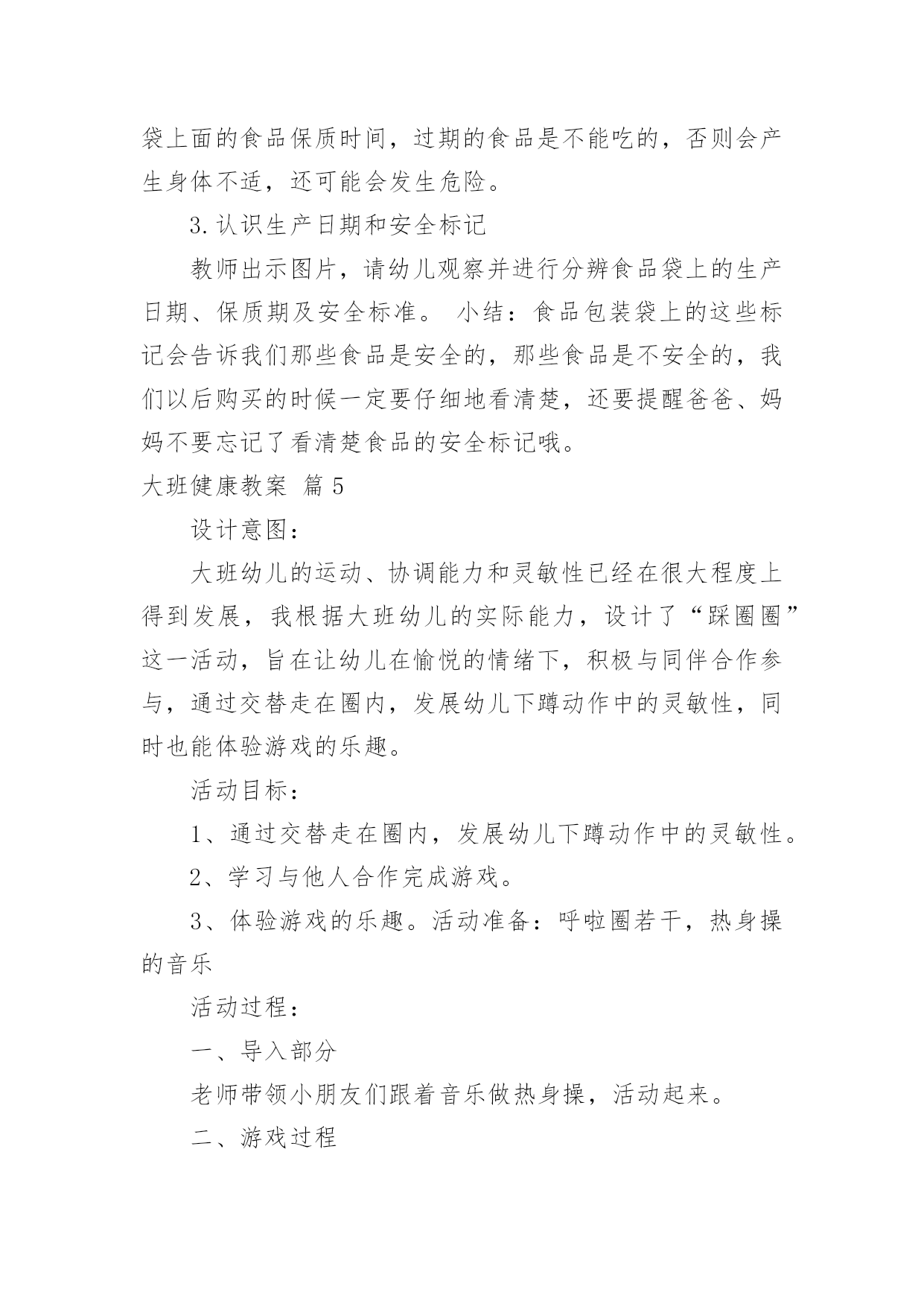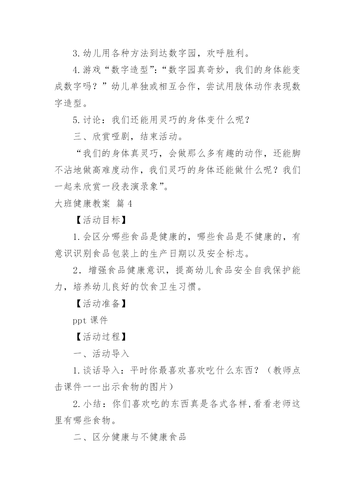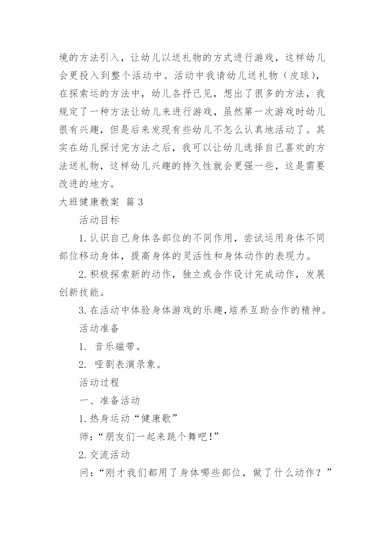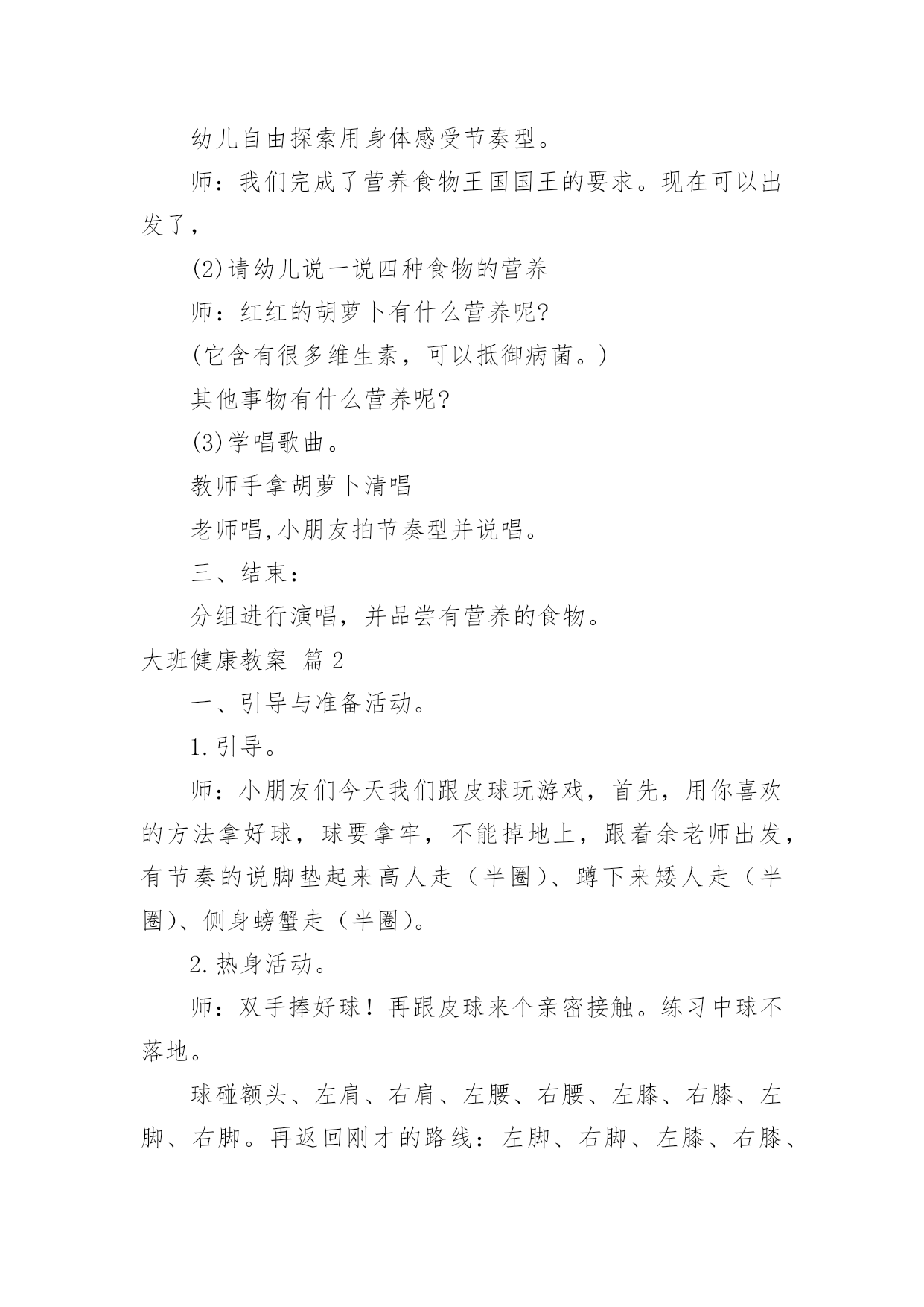 大班健康教案【热门】大班健康教案范文集锦七篇作为一名教职工,可能需要进行教案编写工作,借助教案可以让教学工作更科学化。那么教案应该怎么写才合适呢?下面是小编为大家整理的大班健康教案7篇,供大家参考借鉴,希望可以帮助到有需要的朋友。大班健康教案篇1活动目标1、认识有营养的胡萝卜、豆腐、菠菜等食物。2、懂得合理饮食,在日常生活中做到不挑食,不偏食。活动准备录音机、胡萝卜、菠菜等食物活动过程一、激趣导入:师:小朋友们,营养食物王国的国王邀请我们去做客,在哪里有许多好吃的.,你们想不想去?(想去)师:但请柬上有几个要求,我们能达到要求才能顺利到达。二、食物营养表达:(1)老师示范请同学们拍打节奏,在拍打这条节奏型时要注意附点和空拍,小朋友利用身体的部位感受这条节奏型。幼儿自由探索用身体感受节奏型。师:我们完成了营养食物王国国王的要求。现在可以出发了,(2)请幼儿说一说四种食物的营养师:红红的胡萝卜有什么营养呢?(它含有很多维生素,可以抵御病菌。)其他事物有什么营养呢?(3)学唱歌曲。教师手拿胡萝卜清唱老师唱,小朋友拍节奏型并说唱。三、结束:分组进行演唱,并品尝有营养的食物。大班健康教案篇2一、引导与准备活动。1.引导。师:小朋友们今天我们跟皮球玩游戏,首先,用你喜欢的方法拿好球,球要拿牢,不能掉地上,跟着余老师出发,有节奏的说脚垫起来高人走(半圈)、蹲下来矮人走(半圈)、侧身螃蟹走(半圈)。2.热身活动。师:双手捧好球!再跟皮球来个亲密接触。练习中球不落地。球碰额头、左肩、右肩、左腰、右腰、左膝、右膝、左脚、右脚。再返回刚才的路线:左脚、右脚、左膝、右膝、左腰、右腰、左肩、右肩、额头。师:现在我们加快速度。我们牢牢的拿好球,双脚分开,往左走三步、往右走三步。感觉这个走法像什么动物呢?(螃蟹)现在大螃蟹要加快速度了,往左走三步、往右走三步。二、学习单人抱、夹、顶球等方法跑动。1.用自己的办法玩球,不让球掉下来。师:老师有个问题:怎样让篮球在你身上不掉下来?请想一想。试一试吧。幼儿:手托球、夹、抱、扛、双手护球顶球、双手托球等。师:好!停,余老师请一位小朋友来试一试,大家也来学一学吧。2.那哪一种方法跑起来的时候不会掉又跑的快呢?赶紧来试一试吧!幼儿自由尝试,教师个别指导。(指导要点:把球牢牢固定住,跑的时候球不动。)师:好!现在余老师请一位特别的小朋友上来试一试。3.游戏“送球宝宝”。师:现在我们来玩第一个游戏“送球宝宝”。用你认为既不掉又跑的快的方法跑过去将球在框里,然后用同样的方法返回与下一个小朋友击掌,下个小朋友才可以出发。循环进行,直到全部完成。游戏中球不能落地,遵守游戏规则。三、学习双人夹球挪动、并步跳。1.练习抱球移动。师:请一、四两组小朋友把球放到旁边的框里去,再回到队伍中。师:余老师请这位小朋友上来合作一个游戏,面对面站好,相互抱住,球可以放在哪里?师:球放中间,把球牢牢的夹住,手不能碰球,我们可以往左边、右边移动,你跟你的小伙伴能做到吗?师:那我们赶紧来试一试吧!师:一、二两排小朋友面对面站好,三、四两排小朋友面对面站好。往右边走三步,往左边走三步。师:走了这么多的路,球怎么不掉下来呢?(原来是一起移动,互相抱的紧紧的,球也牢牢的夹紧了)2.游戏“送礼物”。师:好!现在我们来做个游戏“送礼物”,规则:当余老师说开始的时候第一组小朋友用刚才的方法把礼物送到愿望宝盒里面去,送到之后两人一起跑回来,拍一下下一组小朋友的手,然后下组小朋友才能出发,看看哪组送的`稳,送的快,先送完那组获得胜利。四、放松整理。师:小朋友今天表现的真不错,现在给你的伙伴按摩一下吧!活动反思与建议这是一个体育活动,主要发展幼儿双人夹球合作的能力,并且体验与同伴合作进行竞赛游戏的乐趣。这个活动是用情境的方法引入,让幼儿以送礼物的方式进行游戏,这样幼儿会更投入到整个活动中。活动中我请幼儿送礼物(皮球),在探索运的方法中,幼儿各抒己见,想出了很多的方法,我规定了一种方法让幼儿来进行游戏,虽然第一次游戏时幼儿很有兴趣,但是后来发现有些幼儿不怎么认真地活动了。其实在幼儿探讨完方法之后,我可以让幼儿选择自己喜欢的方法送礼物,这样幼儿兴趣的持久性就会更强一些,这是需要改进的地方。大班健康教案篇3活动目标1.认识自己身体各部位的不同作用,尝试运用身体不同部位移动身体,提高身体的灵活性和身体动作的表现力。2.积极探索新的动作,独立或合作设计完成动作,发展创新技能。3.在活动中体验身体游戏的乐趣,培养互助合作的精神。活动准备1.音乐磁带。2.哑剧表演录象。活动过程一、准备活动1.热身运动“健康歌”师:“朋友们一起来跳个舞吧!”2.交流活动问:“刚才我们都用了身体哪些部位,做了什么动作?”幼儿个别交流并作示范,教师小结身体不同部位的作用。二、探索活动(一)自由探索移动