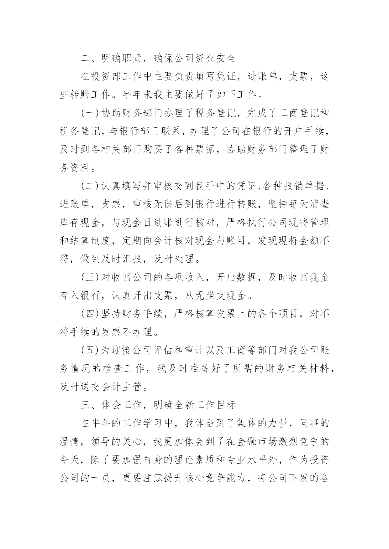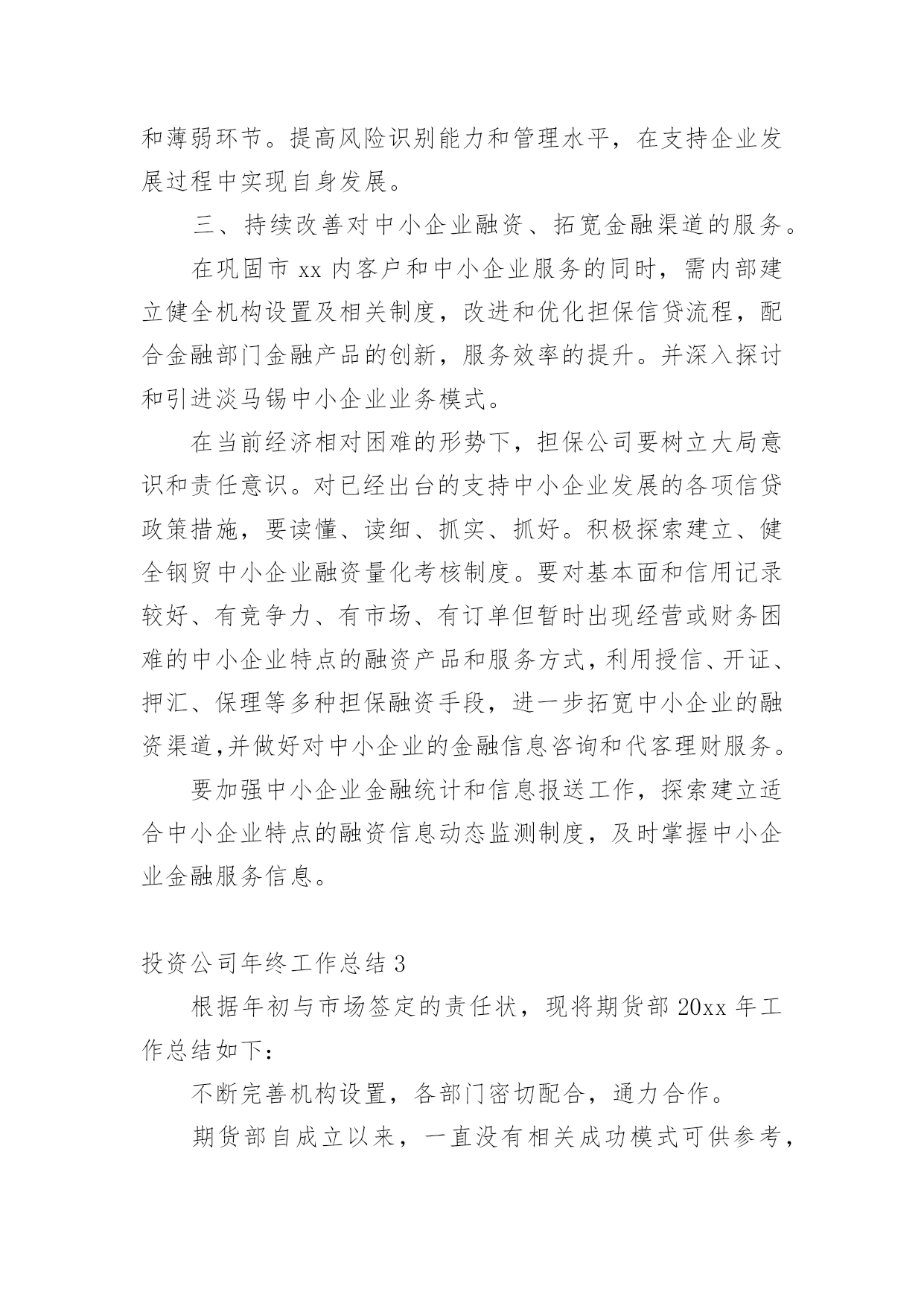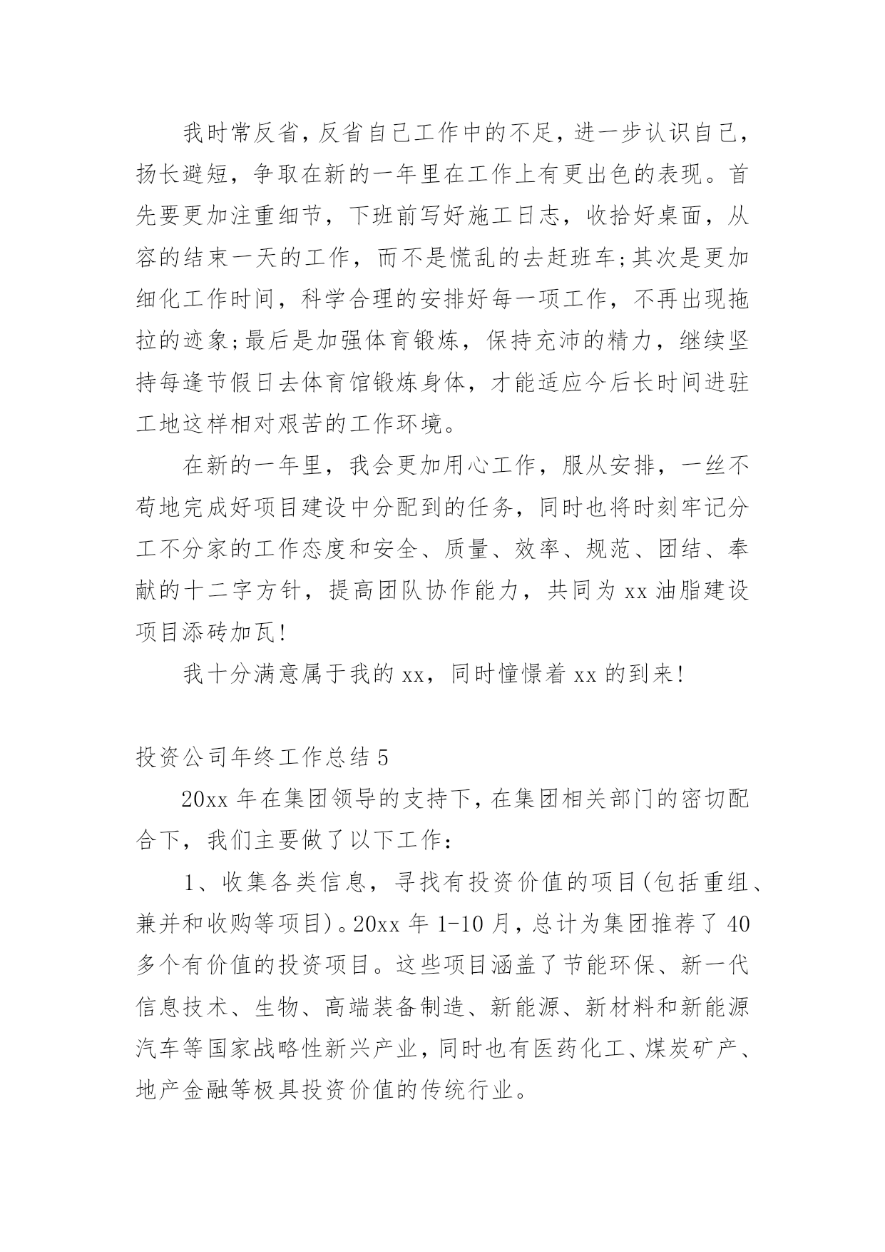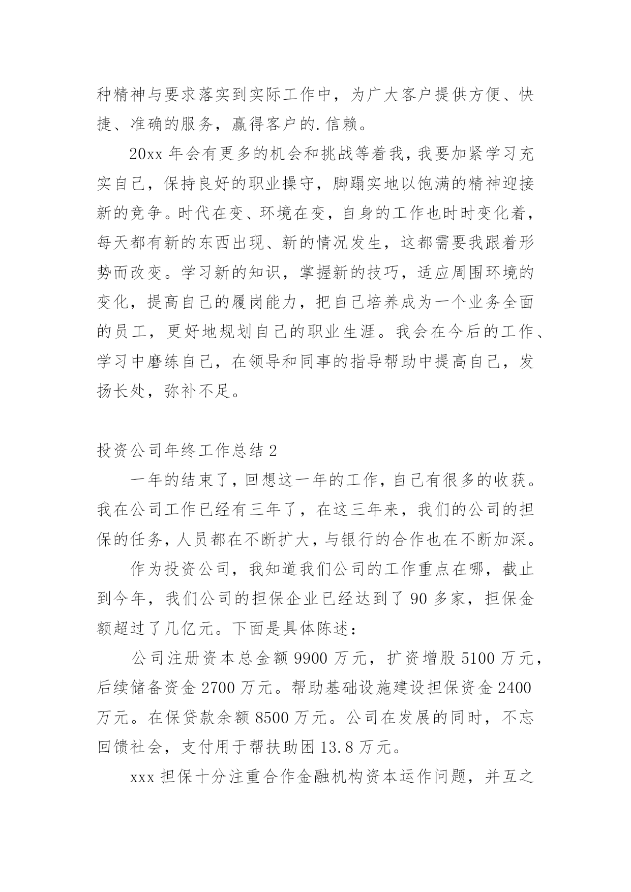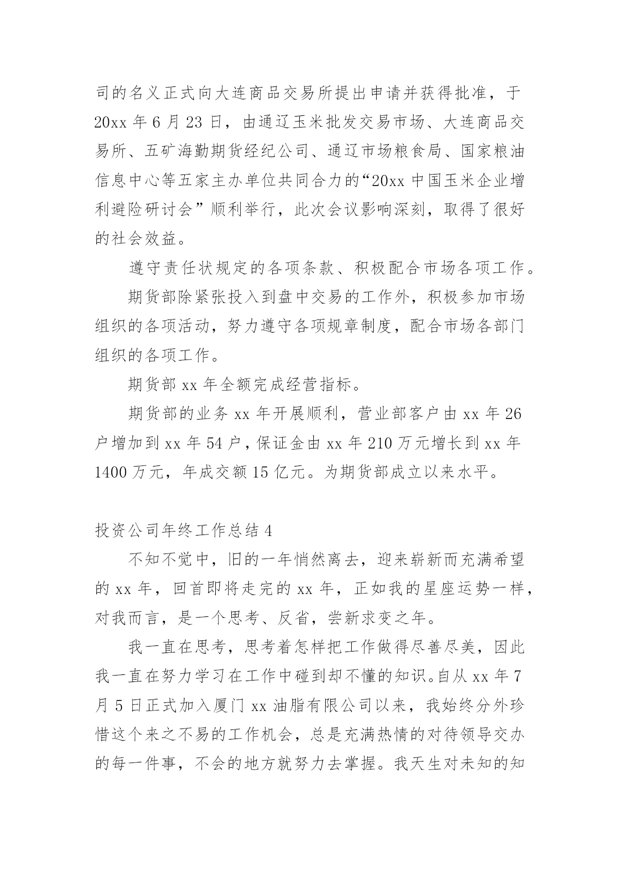 投资公司年终工作总结总结就是把一个时间段取得的成绩、存在的问题及得到的经验和教训进行一次全面系统的总结的书面材料,写总结有利于我们学习和工作能力的提高,让我们来为自己写一份总结吧。我们该怎么去写总结呢?下面是小编为大家收集的投资公司年终工作总结,仅供参考,大家一起来看看吧。投资公司年终工作总结1一、转变角色,迅速熟悉公司业务由于我入公司不久,公司的业务知识了解不多,为了尽快熟悉业务,我向同事借了各种综合业务操作手册。当我遇到问题的时候,我会十分虚心的向老同志请教,公司里的每一位老同事都热情的给与帮助和指导,令我很快地得到进步和提高。我入公司的第一个实习岗位是风险控制岗,我先跟一位同事学习,慢慢地再自己操作。学习了多月后我转入了投资部会计记帐岗,同样跟另一位同事学习,这个岗位比出风险控制岗要复杂一些,但是我一直坚信只要有心,铁锄就可以磨成针。刚开始的时候,我还由于不够细心和不够熟练犯过错误,但是这并不影响我对这份工作的积极性,反而更加鞭策我努力的学习业务技能和理论知识。在近半年的师徒教授方式的学习中,扎实地打牢了这个岗位的理论知识,并结合实践操作,我已能够独立胜任投资部这个岗位的业务工作。二、明确职责,确保公司资金安全在投资部工作中主要负责填写凭证,进账单,支票,这些转账工作。半年来我主要做好了如下工作。(一)协助财务部门办理了税务登记,完成了工商登记和税务登记,与银行部门联系,办理了公司在银行的开户手续,及时到各相关部门购买了各种票据,协助财务部门整理了财务资料。(二)认真填写并审核交到我手中的凭证、各种报销单据、进账单,支票,审核无误后到银行进行转账,坚持每天清查库存现金,与现金日进账进行核对,严格执行公司现将管理和结算制度,定期向会计核对现金与账目,发现现将金额不符,做到及时汇报,及时处理。(三)对收回公司的各项收入,开出数据,及时收回现金存入银行,认真开出支票,从无坐支现金。(四)坚持财务手续,严格核算发票上的各个项目,对不符手续的发票不办理。(五)为迎接公司评估和审计以及工商等部门对我公司账务情况的检查工作,我及时准备好了所需的财务相关材料,及时送交会计主管。三、体会工作,明确全新工作目标在半年的工作学习中,我体会到了集体的力量,同事的温情,领导的关心,我更加体会到了在金融市场激烈竞争的今天,除了要加强自身的理论素质和专业水平外,作为投资公司的一员,更要注意提升核心竞争能力,将公司下发的各种精神与要求落实到实际工作中,为广大客户提供方便、快捷、准确的服务,赢得客户的.信赖。20xx年会有更多的机会和挑战等着我,我要加紧学习充实自己,保持良好的职业操守,脚蹋实地以饱满的精神迎接新的竞争。时代在变、环境在变,自身的工作也时时变化着,每天都有新的东西出现、新的情况发生,这都需要我跟着形势而改变。学习新的知识,掌握新的技巧,适应周围环境的变化,提高自己的履岗能力,把自己培养成为一个业务全面的员工,更好地规划自己的职业生涯。我会在今后的工作、学习中磨练自己,在领导和同事的指导帮助中提高自己,发扬长处,弥补不足。投资公司年终工作总结2一年的结束了,回想这一年的工作,自己有很多的收获。我在公司工作已经有三年了,在这三年来,我们的公司的担保的任务,人员都在不断扩大,与银行的合作也在不断加深。作为投资公司,我知道我们公司的工作重点在哪,截止到今年,我们公司的担保企业已经达到了90多家,担保金额超过了几亿元。下面是具体陈述:公司注册资本总金额9900万元,扩资增股5100万元,后续储备资金2700万元。帮助基础设施建设担保资金2400万元。在保贷款余额8500万元。公司在发展的同时,不忘回馈社会,支付用于帮扶助困13.8万元。xxx担保十分注重合作金融机构资本运作问题,并互之于体现效益,以成为民营资本服务于中小企业的重要组成部分。在着力解决货币、抵押担保瓶颈、缓解中小企业融资难方面发挥着越来越突出的功能与作用。特别是为钢贸行业中的中小企业,审视和卓识了江苏、福建、苏闽商投资企业的稳健,敢拼会赢的经营经商理念。依托分区域商会、让有血缘、份缘、业缘情感相连、文化相融、理念相近经营者。在控制风险的前提下,利益捆绑、实力叠加,发挥资本信用信增的乘数效应,强强联合的战略联盟,逐步成为连接银行和中小企业的桥梁和纽带。在取得可喜成绩和巩固的基础上:今年,我们将在市经委的领导下,市中小企业信用担保协会的督促下,朝着自身行业规范发展,行业自律,有序竞争的方向迈进。着实、更加有效地改善服务理念和意识为钢贸行业、中小企业的服务。一、为银保合作拓宽层次和空间,继续为银企合作搭建可持续性良好互信、宽松平台,促进“三方”共创双赢。近期来,xx担保公司在拓宽银保合作的层面和空间、合作规模上与苏南长三角周边城市相比还略显薄弱。20xx年终我们将在市经贸委等相关经济综