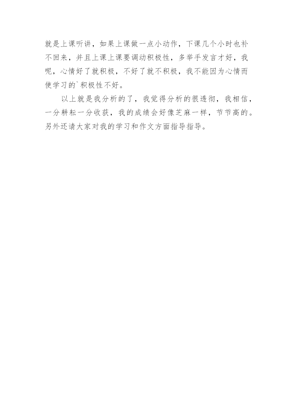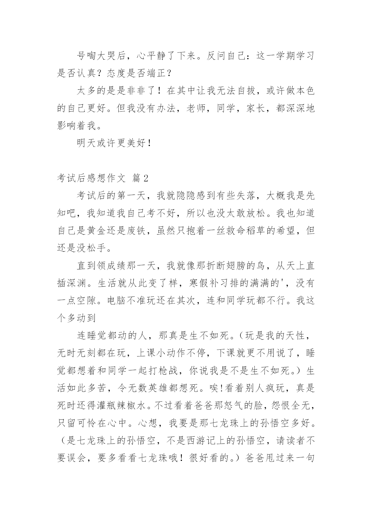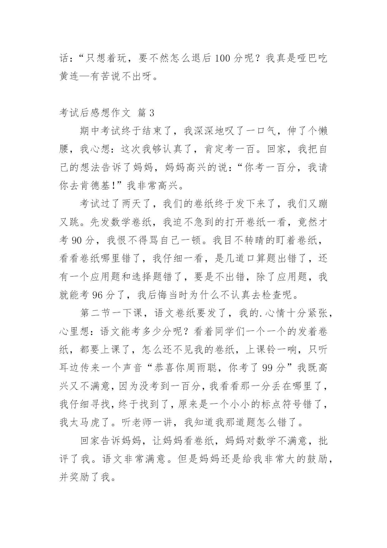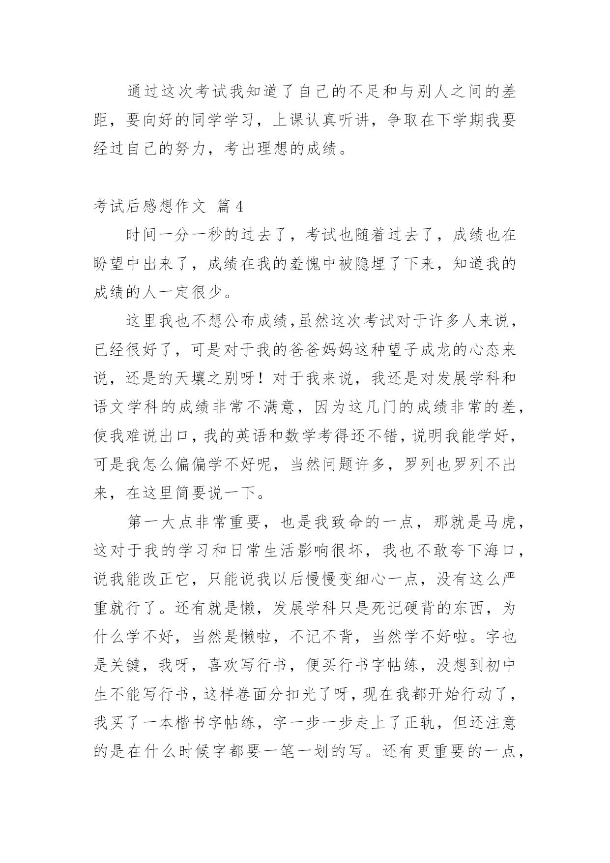 考试后感想作文【热门】考试后感想作文四篇无论在学习、工作或是生活中,大家对作文都再熟悉不过了吧,作文是从内部言语向外部言语的过渡,即从经过压缩的简要的、自己能明白的语言,向开展的、具有规范语法结构的、能为他人所理解的外部语言形式的转化。那么你知道一篇好的作文该怎么写吗?以下是小编整理的考试后感想作文4篇,供大家参考借鉴,希望可以帮助到有需要的朋友。考试后感想作文篇120xx年12月30日星期二天气:小雪雪,静静地下了;月光,悄无声息地洒满大地。夜里一个孩子在啜泣,手握着成绩单,目光透过泪水凝望着红色的.分数。正纳罕那人他是谁?哦,是我。父母刚刚说了我一顿,依稀听到父母在客厅里的谈话声。“孩子考得那么差,看来是不喜欢学习。”母亲说。爸爸叹了口气。沉默,表示赞许。我听着,静静地听着。我想:难道在81个人里排32位就算低吗?看窗外:黄晕的灯光斜射在大地。或许,我就是那灯光吧。没有日光那么耀眼,那么引人向上;没有月光那么富有诗意。号啕大哭后,心平静了下来。反问自己:这一学期学习是否认真?态度是否端正?太多的是是非非了!在其中让我无法自拔,或许做本色的自己更好。但我没有办法,老师,同学,家长,都深深地影响着我。明天或许更美好!考试后感想作文篇2考试后的第一天,我就隐隐感到有些失落,大概我是先知吧,我知道我自己考不好,所以也没太敢放松。我也知道自己是黄金还是废铁,虽然只抱着一丝救命稻草的希望,但还是没松手。直到领成绩那一天,我就像那折断翅膀的鸟,从天上直插深渊。生活就从此变了样,寒假补习排的满满的',没有一点空隙。电脑不准玩还在其次,连和同学玩都不行。我这个多动到连睡觉都动的人,那真是生不如死。(玩是我的天性,无时无刻都在玩,上课小动作不停,下课就更不用说了,睡觉都想着和同学一起打枪战,你说我是不是生不如死。)生活如此多苦,令无数英雄都想死。唉!看着别人疯玩,真是死时还得灌瓶辣椒水。不过看着爸爸那怒气的脸,怨恨全无,只留可怜在心中。心想,我要是那七龙珠上的孙悟空多好。(是七龙珠上的孙悟空,不是西游记上的孙悟空,请读者不要误会,要多看看七龙珠哦!很好看的。)爸爸甩过来一句话:“只想着玩,要不然怎么退后100分呢?我真是哑巴吃黄连—有苦说不出呀。考试后感想作文篇3期中考试终于结束了,我深深地叹了一口气,伸了个懒腰,我心想:这次我够认真了,肯定考一百。回家,我把自己的想法告诉了妈妈,妈妈高兴的说:“你考一百分,我请你去肯德基!”我非常高兴。考试过了两天了,我们的卷纸终于发下来了,我们又蹦又跳。先发数学卷纸,我迫不急到的打开卷纸一看,竟然才考90分,我恨不得骂自己一顿。我目不转睛的盯着卷纸,看看卷纸哪里错了,我仔细一看,是几道口算题出错了,还有一个应用题和选择题错了,要是不出错,除了应用题,我就能考96分了,我后悔当时为什么不认真去检查呢。第二节一下课,语文卷纸要发了,我的.心情十分紧张,心里想:语文能考多少分呢?看着同学们一个一个的发着卷纸,都要上课了,怎么还不见我的卷纸,上课铃一响,只听耳边传来一个声音“恭喜你周雨聪,你考了99分”我既高兴又不满意,因为没考到一百分,我看看那一分丢在哪里了,我仔细寻找,终于找到了,原来是一个小小的标点符号错了,我太马虎了。听老师一讲,我知道我那道题怎么错了。回家告诉妈妈,让妈妈看卷纸,妈妈对数学不满意,批评了我。语文非常满意。但是妈妈还是给我非常大的鼓励,并奖励了我。通过这次考试我知道了自己的不足和与别人之间的差距,要向好的同学学习,上课认真听讲,争取在下学期我要经过自己的努力,考出理想的成绩。考试后感想作文篇4时间一分一秒的过去了,考试也随着过去了,成绩也在盼望中出来了,成绩在我的羞愧中被隐埋了下来,知道我的成绩的人一定很少。这里我也不想公布成绩,虽然这次考试对于许多人来说,已经很好了,可是对于我的爸爸妈妈这种望子成龙的心态来说,还是的天壤之别呀!对于我来说,我还是对发展学科和语文学科的成绩非常不满意,因为这几门的成绩非常的差,使我难说出口,我的英语和数学考得还不错,说明我能学好,可是我怎么偏偏学不好呢,当然问题许多,罗列也罗列不出来,在这里简要说一下。第一大点非常重要,也是我致命的一点,那就是马虎,这对于我的学习和日常生活影响很坏,我也不敢夸下海口,说我能改正它,只能说我以后慢慢变细心一点,没有这么严重就行了。还有就是懒,发展学科只是死记硬背的东西,为什么学不好,当然是懒啦,不记不背,当然学不好啦。字也是关键,我呀,喜欢写行书,便买行书字帖练,没想到初中生不能写行书,这样卷面分扣光了呀,现在我都开始行动了,我买了一本楷书字帖练,字一步一步走上了正轨,但还注意的是在什么时候字都要一笔一划的写。还有更重要的一点,就是上课听讲,如果上课做一点小动作,下课几个小时也补不回来,并且上课上课要调动积极性,多举手发