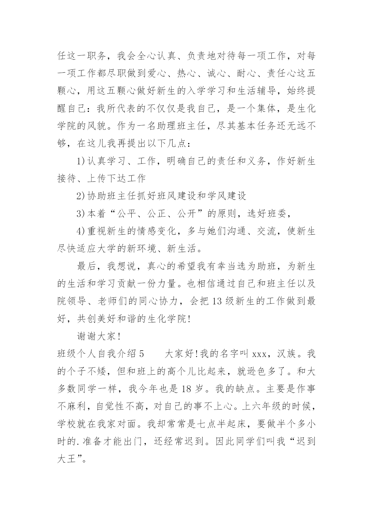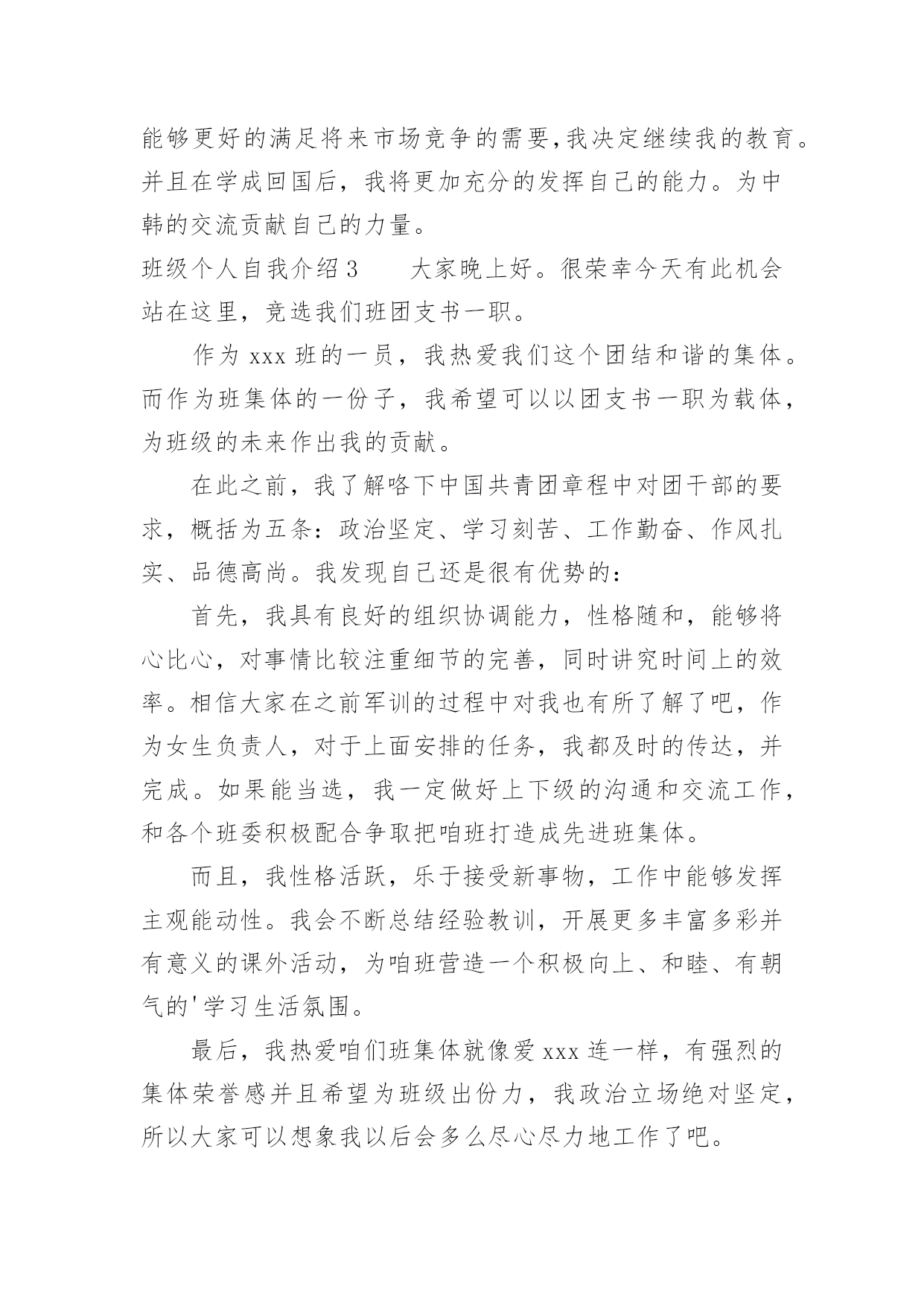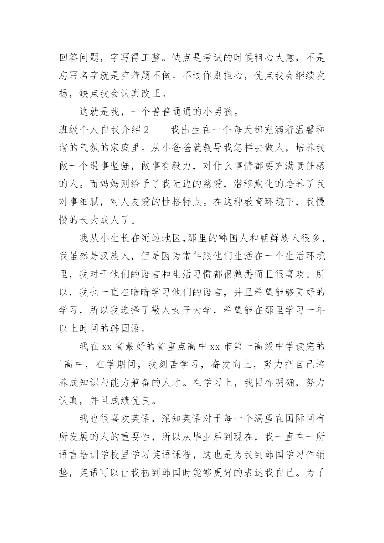 班级个人自我介绍班级个人自我介绍处在一个陌生场合时,通常需要用到自我介绍,通过自我介绍可以让他人了解我们。写起自我介绍来就毫无头绪?下面是小编收集整理的班级个人自我介绍,仅供参考,欢迎大家阅读。班级个人自我介绍1我叫xx,在xx实验中学读书。现在我要给大家介绍介绍我自己。先说说长相吧。我个子非常高,有一头乌黑发亮的头发,一对淡淡的眉毛下长着一双迷人的小眼睛,一个高高的鼻子下有一张能说会道的小嘴,我自认为我长得很帅。我非常胆小。记得四岁的.时候,我坐旋转木马,刚上去就很害怕,爸爸想锻炼一下我的胆量,就把我一个人独自放在了木马上,走开了。我吓得抱住了马的脖子,紧紧得闭上了眼睛。还有,我到七岁的时候还不敢做过山车,大家都说我的胆子比老鼠还小。我心想:不能让他们小看我。我必须用事实证明我的胆子不小。所以,我还是壮着胆子做了一次过山车。我还很大方。上次一个小妹妹来我家玩,看见了我心爱的机器猫,非常想要,我毫不犹豫的就给了她,不过给了之后又想玩,缠着爸爸又给我买了一个。我有优点也有缺点。我的优点是脑子反应快,上课积极回答问题,字写得工整。缺点是考试的时候粗心大意,不是忘写名字就是空着题不做。不过你别担心,优点我会继续发扬,缺点我会认真改正。这就是我,一个普普通通的小男孩。班级个人自我介绍2我出生在一个每天都充满着温馨和谐的气氛的家庭里。从小爸爸就教导我怎样去做人,培养我做一个遇事坚强,做事有毅力,对什么事情都要充满责任感的人。而妈妈则给予了我无边的慈爱,潜移默化的培养了我对事细腻,对人友爱的性格特点。在这种教育环境下,我慢慢的长大成人了。我从小生长在延边地区,那里的韩国人和朝鲜族人很多,我虽然是汉族人,但是因为常年跟他们生活在一个生活环境里,我对于他们的语言和生活习惯都很熟悉而且很喜欢。所以,我也一直在暗暗学习他们的语言,并且希望能够更好的学习,所以我选择了敬人女子大学,希望能在那里学习一年以上时间的韩国语。我在xx省最好的省重点高中xx市第一高级中学读完的`高中,在学期间,我刻苦学习,奋发向上,努力把自己培养成知识与能力兼备的人才。在学习上,我目标明确,努力认真,并且成绩优良。我也很喜欢英语,深知英语对于每一个渴望在国际间有所发展的人的重要性,所以从毕业后到现在,我一直在一所语言培训学校里学习英语课程,这也是为我到韩国学习作铺垫,英语可以让我初到韩国时能够更好的表达我自己。为了能够更好的满足将来市场竞争的需要,我决定继续我的教育。并且在学成回国后,我将更加充分的发挥自己的能力。为中韩的交流贡献自己的力量。班级个人自我介绍3大家晚上好。很荣幸今天有此机会站在这里,竞选我们班团支书一职。作为xxx班的一员,我热爱我们这个团结和谐的集体。而作为班集体的一份子,我希望可以以团支书一职为载体,为班级的未来作出我的贡献。在此之前,我了解咯下中国共青团章程中对团干部的要求,概括为五条:政治坚定、学习刻苦、工作勤奋、作风扎实、品德高尚。我发现自己还是很有优势的:首先,我具有良好的组织协调能力,性格随和,能够将心比心,对事情比较注重细节的完善,同时讲究时间上的效率。相信大家在之前军训的过程中对我也有所了解了吧,作为女生负责人,对于上面安排的任务,我都及时的传达,并完成。如果能当选,我一定做好上下级的沟通和交流工作,和各个班委积极配合争取把咱班打造成先进班集体。而且,我性格活跃,乐于接受新事物,工作中能够发挥主观能动性。我会不断总结经验教训,开展更多丰富多彩并有意义的课外活动,为咱班营造一个积极向上、和睦、有朝气的'学习生活氛围。最后,我热爱咱们班集体就像爱xxx连一样,有强烈的集体荣誉感并且希望为班级出份力,我政治立场绝对坚定,所以大家可以想象我以后会多么尽心尽力地工作了吧。我自信在同学们的帮助下,我一定能够胜任这项工作。如果给我这次机会,我一定会在大家的帮助和监督下,努力把本班打造成一个优秀的班集体,不论是在学习生活或是问题活动上,都展现出我们班独有的风采。最后一句话:同志们,朋友们,请大家助我一“票”之力!谢谢大家。班级个人自我介绍4尊敬的各位老师、同学们:大家好!平平淡淡间取舍,分分秒秒中争取;绕着自己的圆圈,划着人生的弧线。一切的一切,都从你踏入大学校门的那天开始……..我是来自分析1232班的严宇佳,从大一走到现在,令自己感触最深的,还是大一刚来的那个时候。一切都是那么的新鲜,一切都是那么的美好,学姐、学长、老师都是那么的和蔼可亲。对一切都有一种很神秘的'感觉。经过近一年的学习和工作,少了份天真,多了份成熟,少了份鲁莽,多了份沉稳一个人必须懂得去感恩,只有这样他才会长大。所以我选择做班助,首先,要有一个积极、乐观的工作态度。其次,要将所有工作做到细致入微。包括从开始的迎新工作,报道注册,住宿,同学关系的处理,教学楼分布及学校环境的熟悉,学校