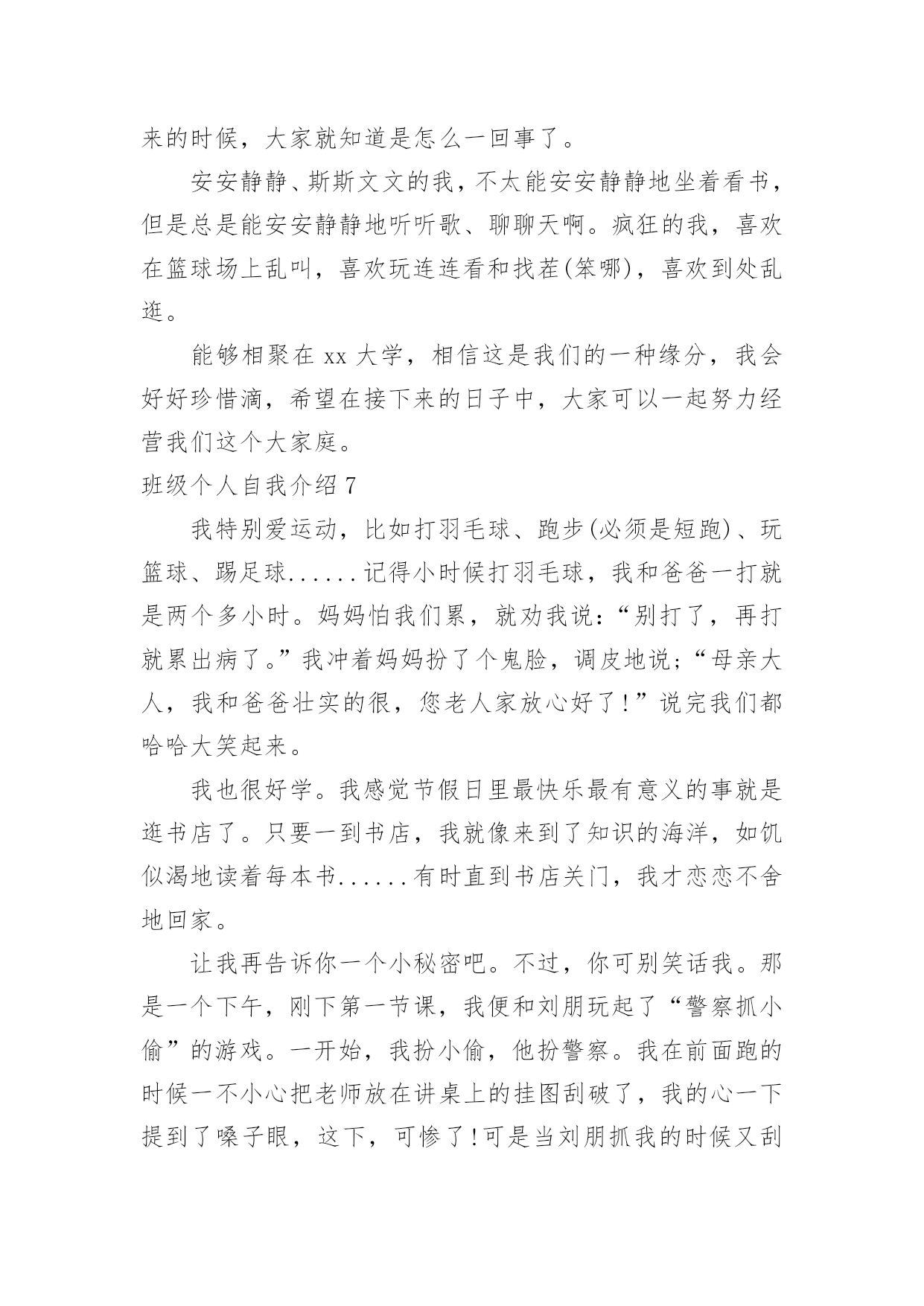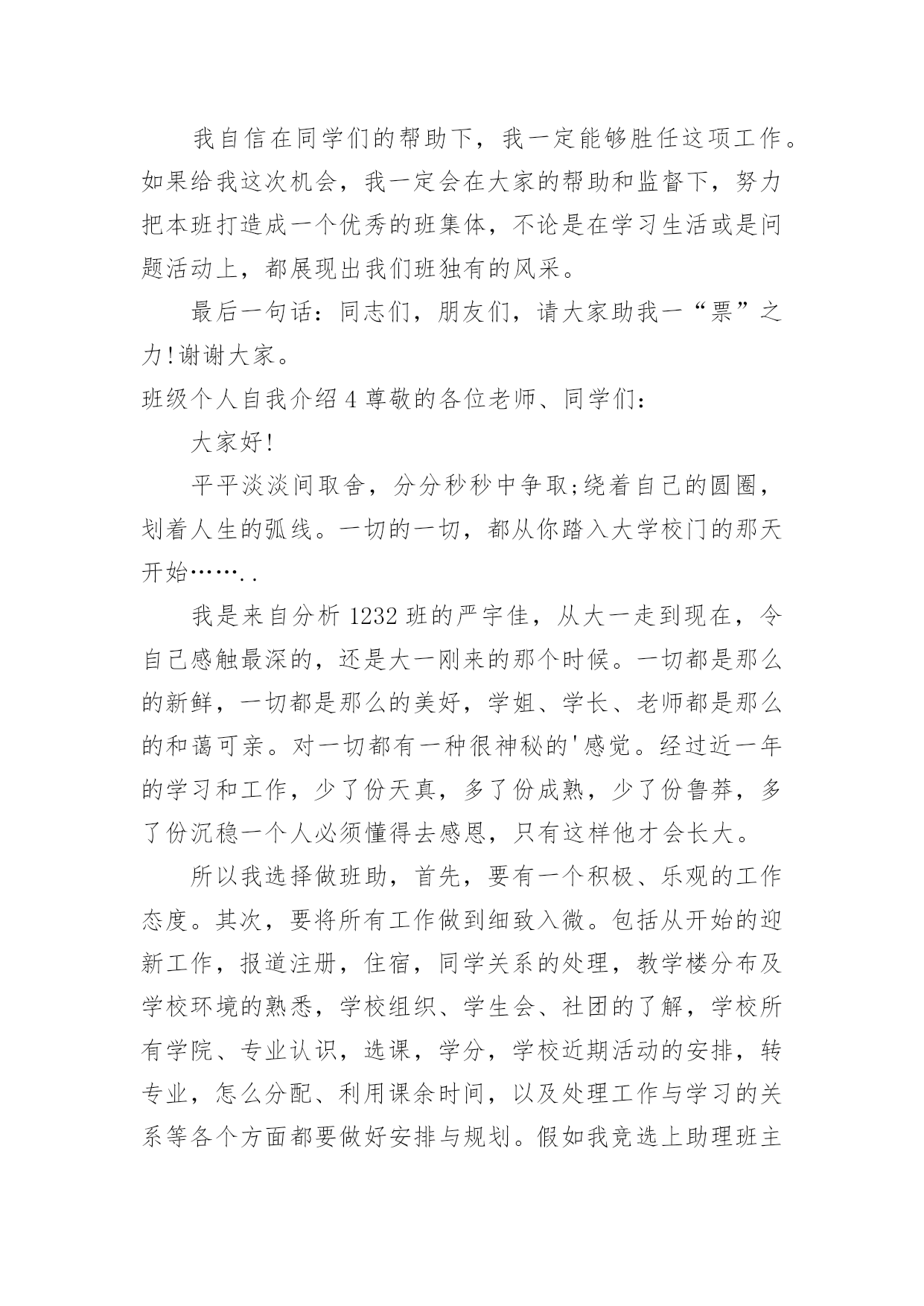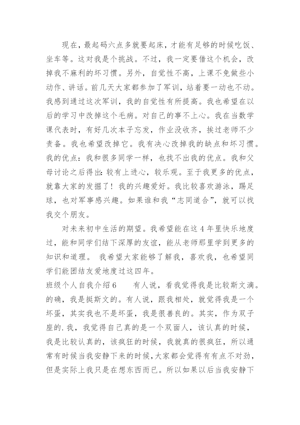 班级个人自我介绍班级个人自我介绍处在一个陌生场合时,通常需要用到自我介绍,通过自我介绍可以让他人了解我们。写起自我介绍来就毫无头绪?下面是小编收集整理的班级个人自我介绍,仅供参考,欢迎大家阅读。班级个人自我介绍1我叫xx,在xx实验中学读书。现在我要给大家介绍介绍我自己。先说说长相吧。我个子非常高,有一头乌黑发亮的头发,一对淡淡的眉毛下长着一双迷人的小眼睛,一个高高的鼻子下有一张能说会道的小嘴,我自认为我长得很帅。我非常胆小。记得四岁的.时候,我坐旋转木马,刚上去就很害怕,爸爸想锻炼一下我的胆量,就把我一个人独自放在了木马上,走开了。我吓得抱住了马的脖子,紧紧得闭上了眼睛。还有,我到七岁的时候还不敢做过山车,大家都说我的胆子比老鼠还小。我心想:不能让他们小看我。我必须用事实证明我的胆子不小。所以,我还是壮着胆子做了一次过山车。我还很大方。上次一个小妹妹来我家玩,看见了我心爱的机器猫,非常想要,我毫不犹豫的就给了她,不过给了之后又想玩,缠着爸爸又给我买了一个。我有优点也有缺点。我的优点是脑子反应快,上课积极回答问题,字写得工整。缺点是考试的时候粗心大意,不是忘写名字就是空着题不做。不过你别担心,优点我会继续发扬,缺点我会认真改正。这就是我,一个普普通通的小男孩。班级个人自我介绍2我出生在一个每天都充满着温馨和谐的气氛的家庭里。从小爸爸就教导我怎样去做人,培养我做一个遇事坚强,做事有毅力,对什么事情都要充满责任感的人。而妈妈则给予了我无边的慈爱,潜移默化的培养了我对事细腻,对人友爱的性格特点。在这种教育环境下,我慢慢的长大成人了。我从小生长在延边地区,那里的韩国人和朝鲜族人很多,我虽然是汉族人,但是因为常年跟他们生活在一个生活环境里,我对于他们的语言和生活习惯都很熟悉而且很喜欢。所以,我也一直在暗暗学习他们的语言,并且希望能够更好的学习,所以我选择了敬人女子大学,希望能在那里学习一年以上时间的韩国语。我在xx省最好的省重点高中xx市第一高级中学读完的`高中,在学期间,我刻苦学习,奋发向上,努力把自己培养成知识与能力兼备的人才。在学习上,我目标明确,努力认真,并且成绩优良。我也很喜欢英语,深知英语对于每一个渴望在国际间有所发展的人的重要性,所以从毕业后到现在,我一直在一所语言培训学校里学习英语课程,这也是为我到韩国学习作铺垫,英语可以让我初到韩国时能够更好的表达我自己。为了能够更好的满足将来市场竞争的需要,我决定继续我的教育。并且在学成回国后,我将更加充分的发挥自己的能力。为中韩的交流贡献自己的力量。班级个人自我介绍3大家晚上好。很荣幸今天有此机会站在这里,竞选我们班团支书一职。作为xxx班的一员,我热爱我们这个团结和谐的集体。而作为班集体的一份子,我希望可以以团支书一职为载体,为班级的未来作出我的贡献。在此之前,我了解咯下中国共青团章程中对团干部的要求,概括为五条:政治坚定、学习刻苦、工作勤奋、作风扎实、品德高尚。我发现自己还是很有优势的:首先,我具有良好的组织协调能力,性格随和,能够将心比心,对事情比较注重细节的完善,同时讲究时间上的效率。相信大家在之前军训的过程中对我也有所了解了吧,作为女生负责人,对于上面安排的任务,我都及时的传达,并完成。如果能当选,我一定做好上下级的沟通和交流工作,和各个班委积极配合争取把咱班打造成先进班集体。而且,我性格活跃,乐于接受新事物,工作中能够发挥主观能动性。我会不断总结经验教训,开展更多丰富多彩并有意义的课外活动,为咱班营造一个积极向上、和睦、有朝气的'学习生活氛围。最后,我热爱咱们班集体就像爱xxx连一样,有强烈的集体荣誉感并且希望为班级出份力,我政治立场绝对坚定,所以大家可以想象我以后会多么尽心尽力地工作了吧。我自信在同学们的帮助下,我一定能够胜任这项工作。如果给我这次机会,我一定会在大家的帮助和监督下,努力把本班打造成一个优秀的班集体,不论是在学习生活或是问题活动上,都展现出我们班独有的风采。最后一句话:同志们,朋友们,请大家助我一“票”之力!谢谢大家。班级个人自我介绍4尊敬的各位老师、同学们:大家好!平平淡淡间取舍,分分秒秒中争取;绕着自己的圆圈,划着人生的弧线。一切的一切,都从你踏入大学校门的那天开始……..我是来自分析1232班的严宇佳,从大一走到现在,令自己感触最深的,还是大一刚来的那个时候。一切都是那么的新鲜,一切都是那么的美好,学姐、学长、老师都是那么的和蔼可亲。对一切都有一种很神秘的'感觉。经过近一年的学习和工作,少了份天真,多了份成熟,少了份鲁莽,多了份沉稳一个人必须懂得去感恩,只有这样他才会长大。所以我选择做班助,首先,要有一个积极、乐观的工作态度。其次,要将所有工作做到细致入微。包括从开始的迎新工作,报道注册,住宿,同学关系的处理,教学楼分布及学校环境的熟悉,学校