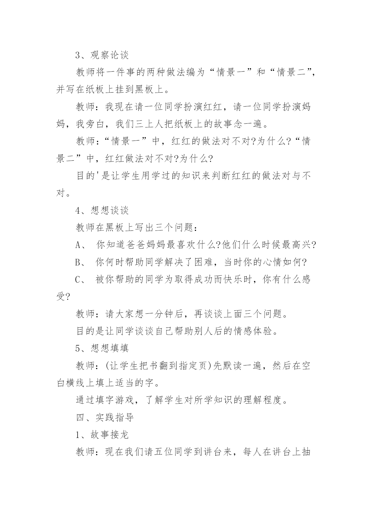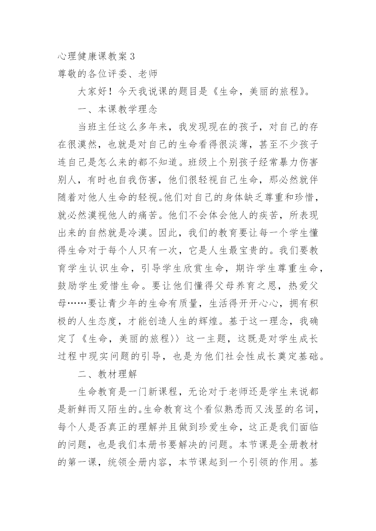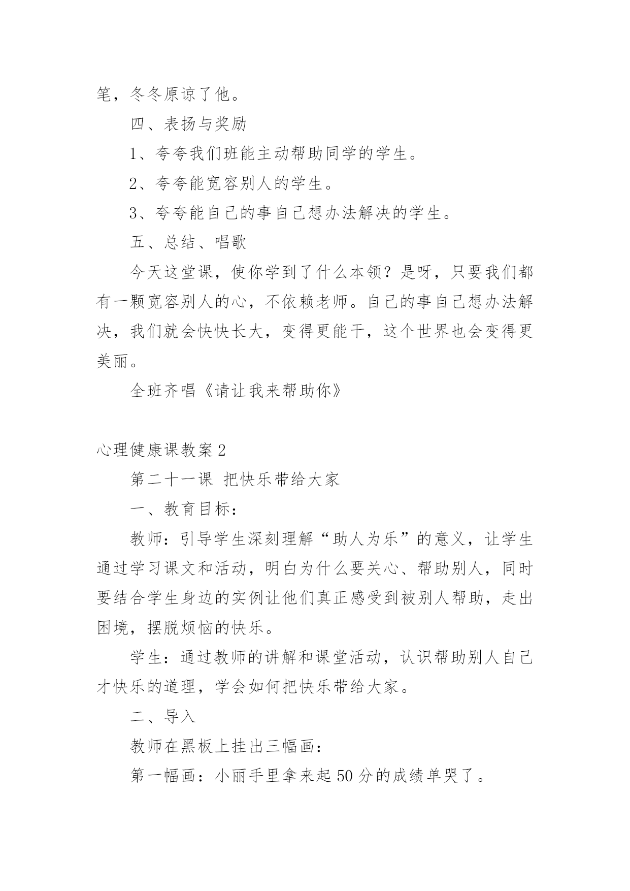 心理健康课教案心理健康课教案15篇(实用)作为一无名无私奉献的教育工作者,通常需要准备好一份教案,编写教案有利于我们准确把握教材的重点与难点,进而选择恰当的教学方法。怎样写教案才更能起到其作用呢?以下是小编为大家整理的心理健康课教案,欢迎大家分享。心理健康课教案1第二课:请让我来帮助你主题:克服依赖心理教学目标:克服依赖心理,学会宽容别人。发现同学的缺点能当面指出。初步培养自己的问题自己解决的能力。教学重点:初步培养自己的问题自己解决的能力。教学难点:消除依赖心理,学会宽容别人。教学过程:一、谈话导入,揭示课题。1、师:小朋友,我们在学校里一起生活、学习。你觉得开心吗?如果,你看到有位同学犯错误了,你会怎么办?引出:打小报告(板书)2、如果,在学校里有人欺负你了,你又会怎么办?3、你在哪些情况下,会去报告老师?(教师随意板书)二、看小品,明理。1、小品1:下课了,同学们在玩,丁丁无意中撞了小明一下,小明不问缘由,就跑去向老师报告,说丁丁打他,急得老师放下要批改的作业本,去处理这件事。看完请学生说小明是怎么做的?对不对?为什么?2、小品2:有一位家长在和老师交谈,冬冬总是插.进来说话,使老师和家长都无法谈话。看完请学生说冬冬这样做对吗?为什么?3、教师小结刚才两位同学的`做法,都是不对的,不仅把同学之间发生的一些小事夸大,还影响了老师办公。所以我们“不要动不动就打小报告”(板书)4、行为指导如果你是他们,你会怎么做?请你帮他们一下好吗?板书:请让我来帮助你三、行为指导。刚才我们同学说了好多事都要报告老师。那我们现在再来想想,有哪些事我们可以不报告老师,让我们来自己解决?1、看板书指导。并贴上小红星。2、指名表演。(1)丁丁和同学吵架了,小明看见了,进行劝阻。(2)老师在办公,冬冬看见了一件不文明的事,本想告诉老师,但思考了一下就走过去劝阻。(3)丁丁不小心碰翻了冬冬的铅笔盒,摔断了几只铅笔,冬冬原谅了他。四、表扬与奖励1、夸夸我们班能主动帮助同学的学生。2、夸夸能宽容别人的学生。3、夸夸能自己的事自己想办法解决的学生。五、总结、唱歌今天这堂课,使你学到了什么本领?是呀,只要我们都有一颗宽容别人的心,不依赖老师。自己的事自己想办法解决,我们就会快快长大,变得更能干,这个世界也会变得更美丽。全班齐唱《请让我来帮助你》心理健康课教案2第二十一课把快乐带给大家一、教育目标:教师:引导学生深刻理解“助人为乐”的意义,让学生通过学习课文和活动,明白为什么要关心、帮助别人,同时要结合学生身边的实例让他们真正感受到被别人帮助,走出困境,摆脱烦恼的快乐。学生:通过教师的讲解和课堂活动,认识帮助别人自己才快乐的道理,学会如何把快乐带给大家。二、导入教师在黑板上挂出三幅画:第一幅画:小丽手里拿来起50分的成绩单哭了。第二幅画:一位老奶奶摔倒了。第三幅画:壮壮生病躺在床上。教师:现在请一位同学念一遍课文,然后请同学们自己默读一遍。教师讲李素丽阿姨“肋人”的故事。教师:同学们,我们从路娜同学和李素丽阿姨且人的故事中,已经看到并认识到,只要你把快乐带给了人家,我们在日常生活中要学会观察,发现老人、残疾人行走时有困难,就立刻去帮且;发现同学学习有困难,主动去帮助;发现爸爸妈妈身体不舒服,要关心、疼爱和照顾他们。三、课堂活动1、想想议议教师:请同学们分组讨论以下三个问题,然后各组选派一名代表发言。讨论题为:A、路娜怎样把快乐带给别人?B、你向李素丽阿姨学习什么?C、你想做一个把快乐带给大家的人吗?目的是让同学们知道向李素丽阿姨和路娜同学学习什么,鼓励学生做一个把快乐带给别人的人。2、想想说说教师:请同学们先思考一分钟,然后说说你怎样把快乐百叶窗给同学?怎能样把快带给爸爸妈妈?怎样把快乐带给老师?目的是让学生以实际行动,把快乐带给自己周围的人。3、观察论谈教师将一件事的两种做法编为“情景一”和“情景二”,并写在纸板上挂到黑板上。教师:我现在请一位同学扮演红红,请一位同学扮演妈妈,我旁白,我们三上人把纸板上的故事念一遍。教师:“情景一”中,红红的做法对不对?为什么?“情景二”中,红红做法对不对?为什么?目的'是让学生用学过的知识来判断红红的做法对与不对。4、想想谈谈教师在黑板上写出三个问题:A、你知道爸爸妈妈最喜欢什么?他们什么时候最高兴?B、你何时帮助同学解决了困难,当时你的心情如何?C、被你帮助的同学为取得成功而快乐时,你有什么感受?教师:请大家想一分钟后,再谈谈上面三个问题。目的是让同学谈谈自己帮助别人后的情感体验。5、想想填填教师:(让学生把书翻到指定页)先默读一遍,然后在空白横线上填上适当的字。通过填字游戏,了解学生对所学知识的理解程度。四、实践指导1、故事接龙教师:现在我们请五位同学到讲台来,每人在讲台上抽一张卡片,然后的卡片上A、B、C、D、E的