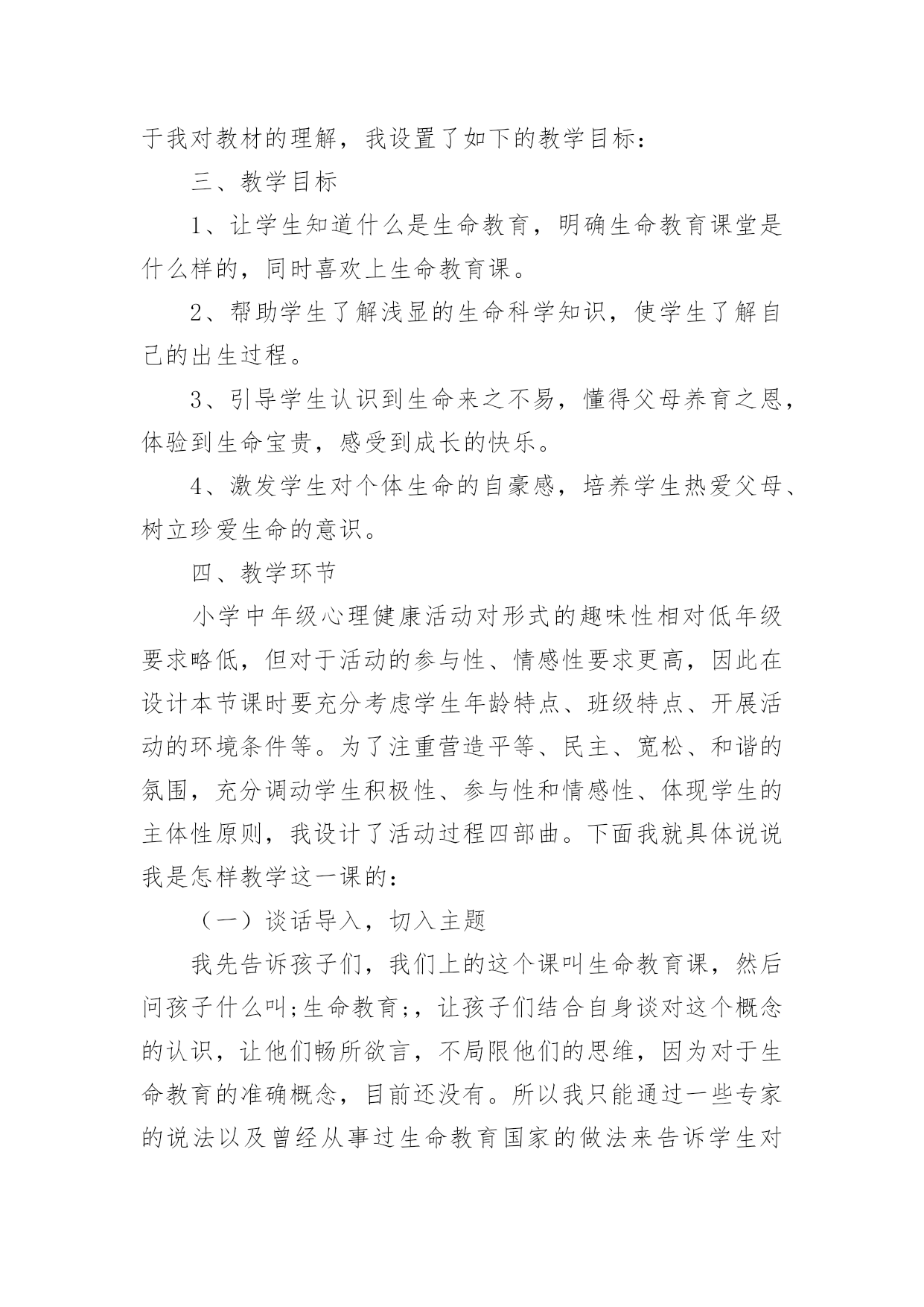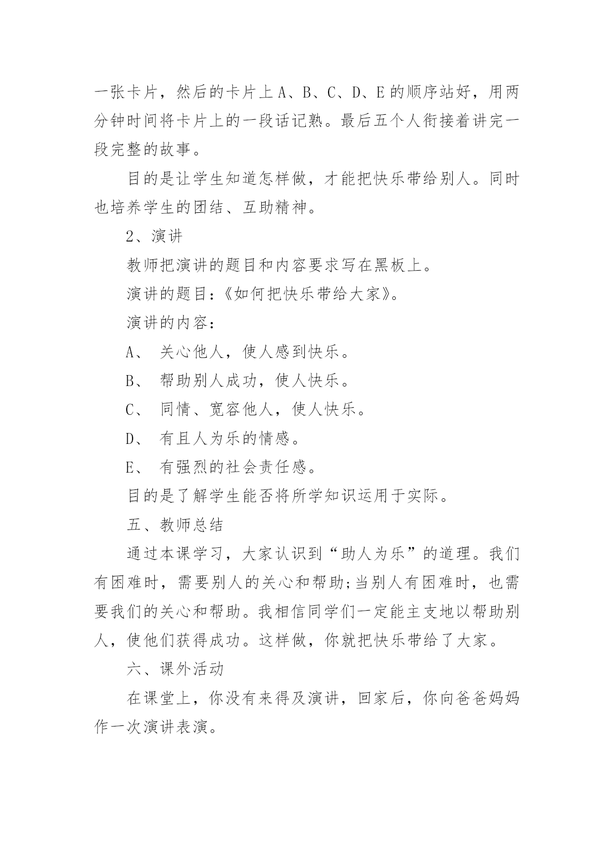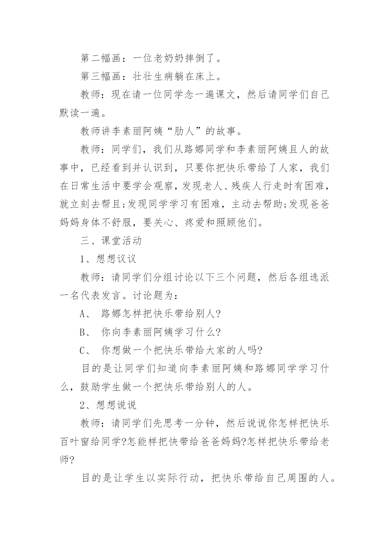 心理健康课教案心理健康课教案15篇(实用)作为一无名无私奉献的教育工作者,通常需要准备好一份教案,编写教案有利于我们准确把握教材的重点与难点,进而选择恰当的教学方法。怎样写教案才更能起到其作用呢?以下是小编为大家整理的心理健康课教案,欢迎大家分享。心理健康课教案1第二课:请让我来帮助你主题:克服依赖心理教学目标:克服依赖心理,学会宽容别人。发现同学的缺点能当面指出。初步培养自己的问题自己解决的能力。教学重点:初步培养自己的问题自己解决的能力。教学难点:消除依赖心理,学会宽容别人。教学过程:一、谈话导入,揭示课题。1、师:小朋友,我们在学校里一起生活、学习。你觉得开心吗?如果,你看到有位同学犯错误了,你会怎么办?引出:打小报告(板书)2、如果,在学校里有人欺负你了,你又会怎么办?3、你在哪些情况下,会去报告老师?(教师随意板书)二、看小品,明理。1、小品1:下课了,同学们在玩,丁丁无意中撞了小明一下,小明不问缘由,就跑去向老师报告,说丁丁打他,急得老师放下要批改的作业本,去处理这件事。看完请学生说小明是怎么做的?对不对?为什么?2、小品2:有一位家长在和老师交谈,冬冬总是插.进来说话,使老师和家长都无法谈话。看完请学生说冬冬这样做对吗?为什么?3、教师小结刚才两位同学的`做法,都是不对的,不仅把同学之间发生的一些小事夸大,还影响了老师办公。所以我们“不要动不动就打小报告”(板书)4、行为指导如果你是他们,你会怎么做?请你帮他们一下好吗?板书:请让我来帮助你三、行为指导。刚才我们同学说了好多事都要报告老师。那我们现在再来想想,有哪些事我们可以不报告老师,让我们来自己解决?1、看板书指导。并贴上小红星。2、指名表演。(1)丁丁和同学吵架了,小明看见了,进行劝阻。(2)老师在办公,冬冬看见了一件不文明的事,本想告诉老师,但思考了一下就走过去劝阻。(3)丁丁不小心碰翻了冬冬的铅笔盒,摔断了几只铅笔,冬冬原谅了他。四、表扬与奖励1、夸夸我们班能主动帮助同学的学生。2、夸夸能宽容别人的学生。3、夸夸能自己的事自己想办法解决的学生。五、总结、唱歌今天这堂课,使你学到了什么本领?是呀,只要我们都有一颗宽容别人的心,不依赖老师。自己的事自己想办法解决,我们就会快快长大,变得更能干,这个世界也会变得更美丽。全班齐唱《请让我来帮助你》心理健康课教案2第二十一课把快乐带给大家一、教育目标:教师:引导学生深刻理解“助人为乐”的意义,让学生通过学习课文和活动,明白为什么要关心、帮助别人,同时要结合学生身边的实例让他们真正感受到被别人帮助,走出困境,摆脱烦恼的快乐。学生:通过教师的讲解和课堂活动,认识帮助别人自己才快乐的道理,学会如何把快乐带给大家。二、导入教师在黑板上挂出三幅画:第一幅画:小丽手里拿来起50分的成绩单哭了。第二幅画:一位老奶奶摔倒了。第三幅画:壮壮生病躺在床上。教师:现在请一位同学念一遍课文,然后请同学们自己默读一遍。教师讲李素丽阿姨“肋人”的故事。教师:同学们,我们从路娜同学和李素丽阿姨且人的故事中,已经看到并认识到,只要你把快乐带给了人家,我们在日常生活中要学会观察,发现老人、残疾人行走时有困难,就立刻去帮且;发现同学学习有困难,主动去帮助;发现爸爸妈妈身体不舒服,要关心、疼爱和照顾他们。三、课堂活动1、想想议议教师:请同学们分组讨论以下三个问题,然后各组选派一名代表发言。讨论题为:A、路娜怎样把快乐带给别人?B、你向李素丽阿姨学习什么?C、你想做一个把快乐带给大家的人吗?目的是让同学们知道向李素丽阿姨和路娜同学学习什么,鼓励学生做一个把快乐带给别人的人。2、想想说说教师:请同学们先思考一分钟,然后说说你怎样把快乐百叶窗给同学?怎能样把快带给爸爸妈妈?怎样把快乐带给老师?目的是让学生以实际行动,把快乐带给自己周围的人。3、观察论谈教师将一件事的两种做法编为“情景一”和“情景二”,并写在纸板上挂到黑板上。教师:我现在请一位同学扮演红红,请一位同学扮演妈妈,我旁白,我们三上人把纸板上的故事念一遍。教师:“情景一”中,红红的做法对不对?为什么?“情景二”中,红红做法对不对?为什么?目的'是让学生用学过的知识来判断红红的做法对与不对。4、想想谈谈教师在黑板上写出三个问题:A、你知道爸爸妈妈最喜欢什么?他们什么时候最高兴?B、你何时帮助同学解决了困难,当时你的心情如何?C、被你帮助的同学为取得成功而快乐时,你有什么感受?教师:请大家想一分钟后,再谈谈上面三个问题。目的是让同学谈谈自己帮助别人后的情感体验。5、想想填填教师:(让学生把书翻到指定页)先默读一遍,然后在空白横线上填上适当的字。通过填字游戏,了解学生对所学知识的理解程度。四、实践指导1、故事接龙教师:现在我们请五位同学到讲台来,每人在讲台上抽一张卡片,然后的卡片上A、B、C、D、E的