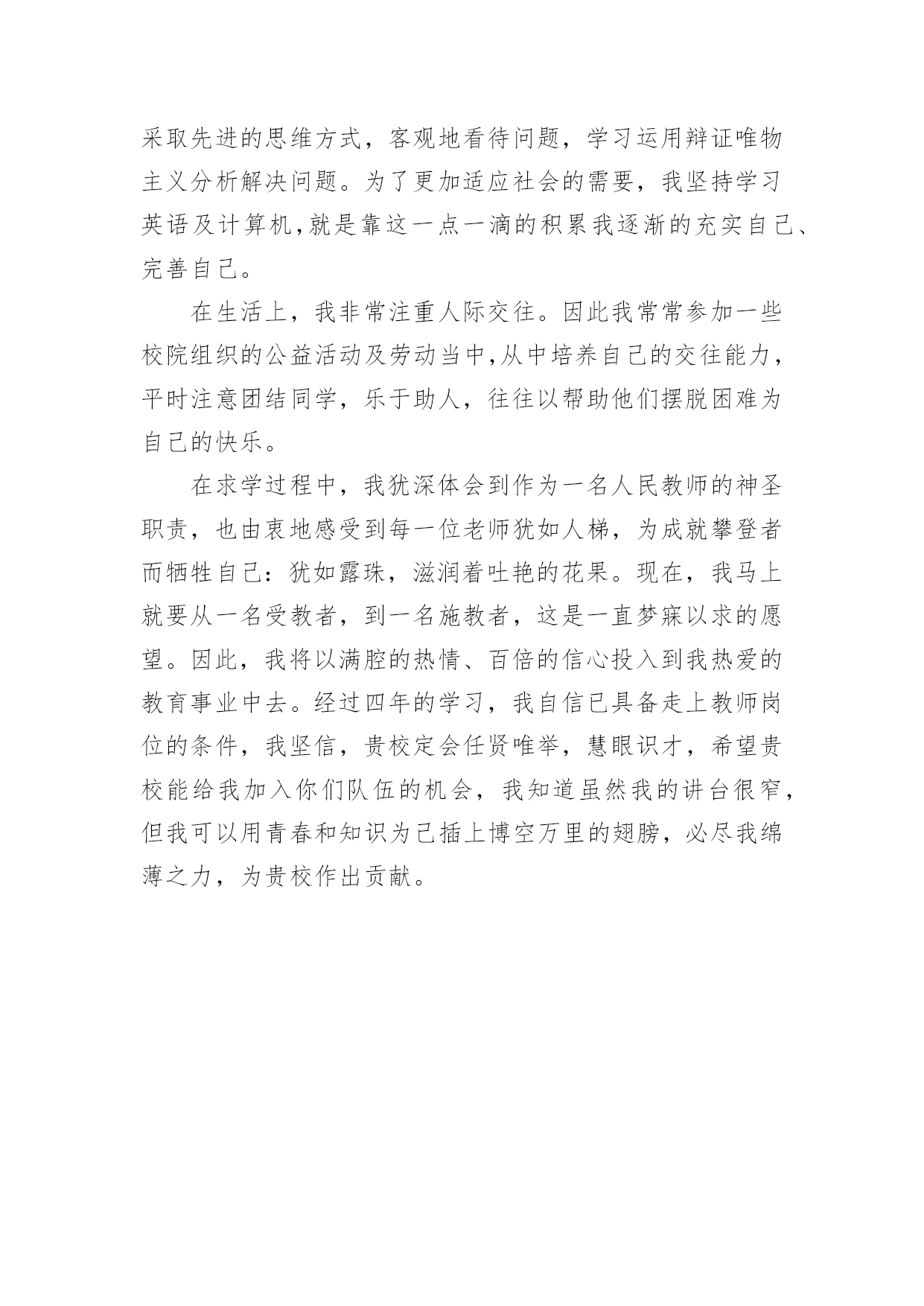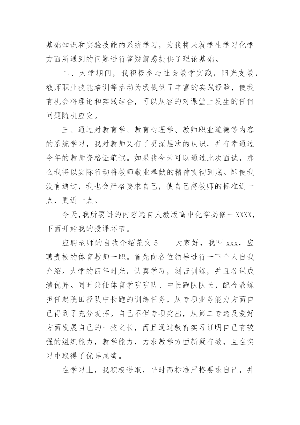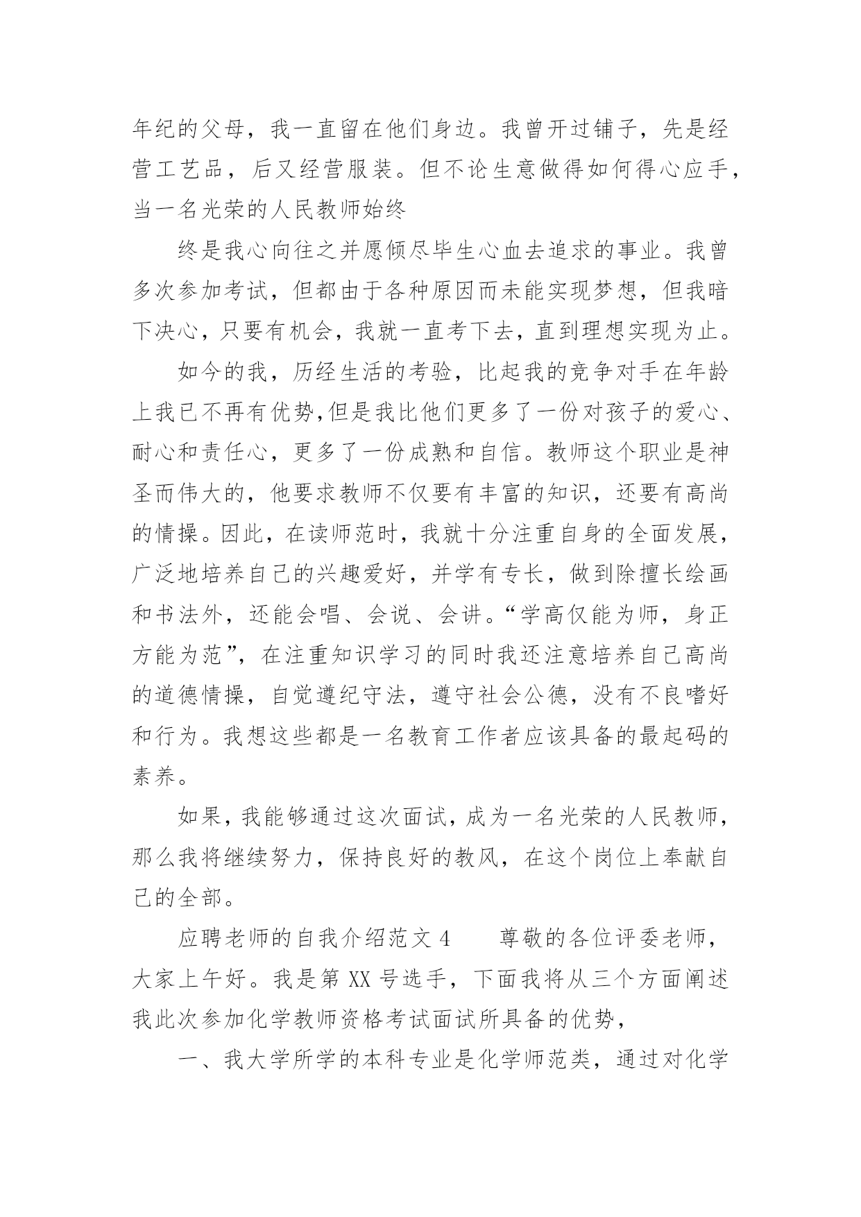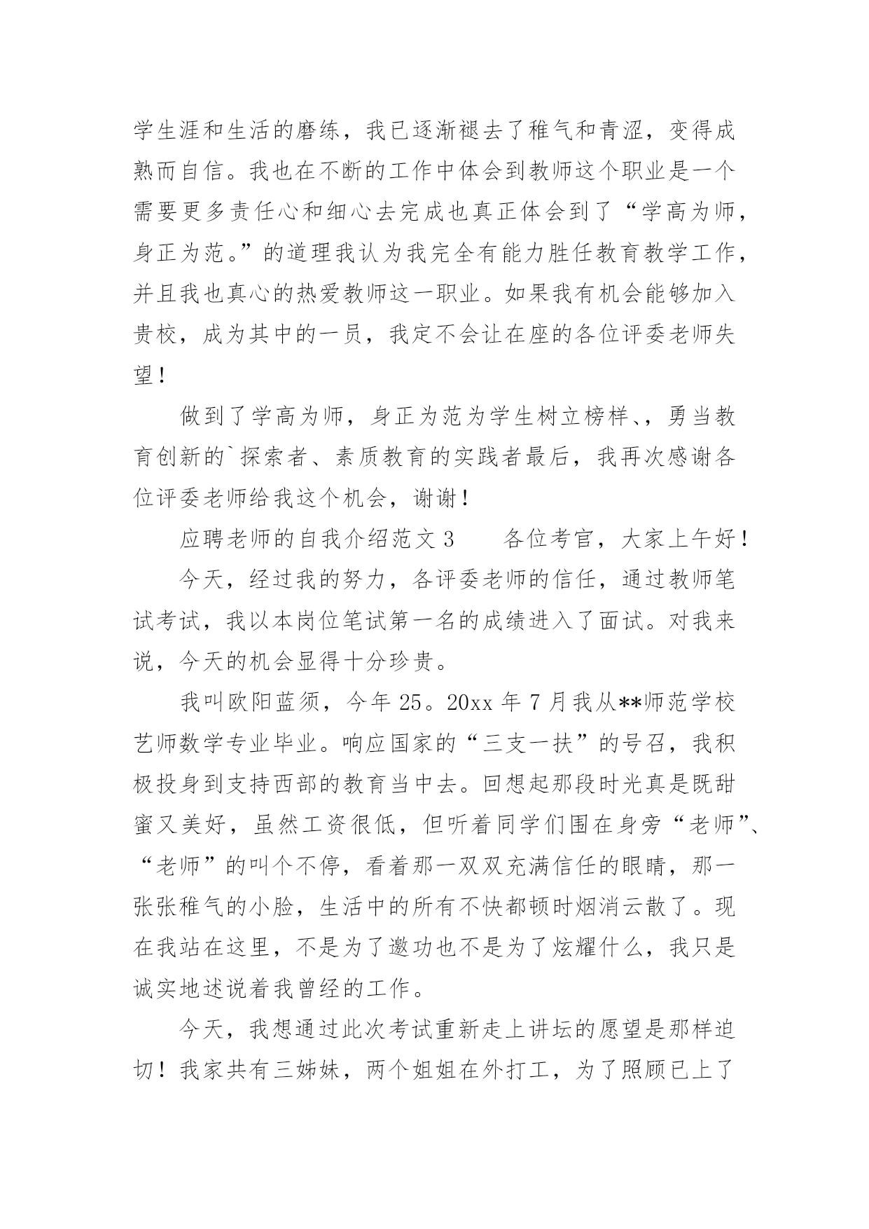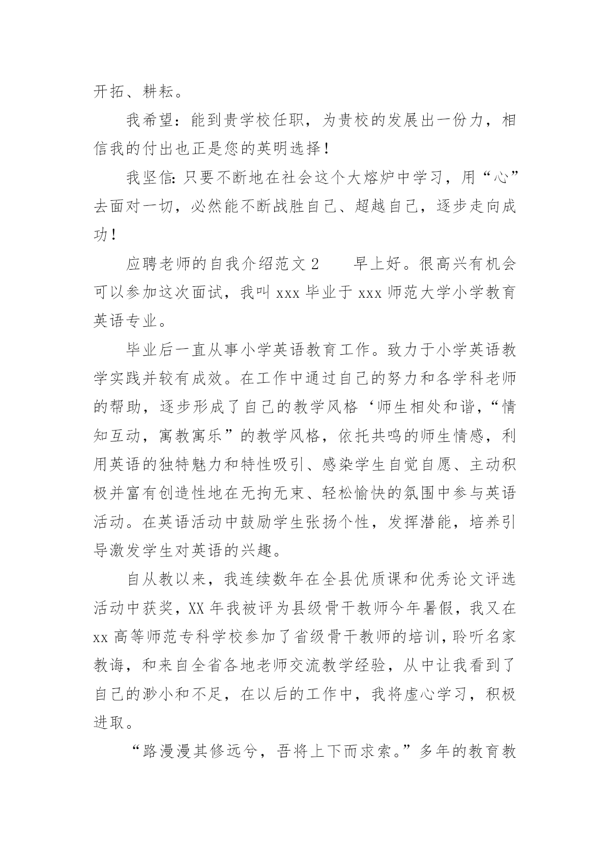 应聘老师的自我介绍应聘老师的自我介绍范文导语:教师是一个神圣的职业,无私奉献,培育了一代又一代的国家栋梁。下面是小编为大家带来的应聘老师的自我介绍范文,希望大家喜欢。应聘老师的自我介绍范文1各位考官:早上好。我是XX师范学院数学系xxxx届数学教育专业的一名毕业生,名叫XXX,很高兴能有机会在此向各位考官学习!XX师范学院数学系是我们学院最悠久、教学质量最优异的系别,在此学习环境下,使我的知识能力受益匪浅。在学好专业课的同时,我勤练教师基本技能,有较好的教学语言表达能力,掌握了教育学和心理学的许多知识,在假期从事的家教工作中加以运用。在实习期间,我思索激励教法、课件制作和教具选择,在课堂上取得了学生主动要学的效果,得到了校领导和指导老师的好评。我出生于教师家庭,对父辈循循善诱的引导深受感染;对父辈们的殷殷嘱咐,使我踏踏实实、勤勤恳恳做人;对所受到的学校教育,让我用科学的理论知识的专业技能干好每一件事;坦诚、踏实的性格,让我在工作中与领导、同事相处融洽,较好的完成了各项任务。我期望:有一个合适的平台,用我的热情和智慧去全力开拓、耕耘。我希望:能到贵学校任职,为贵校的发展出一份力,相信我的付出也正是您的英明选择!我坚信:只要不断地在社会这个大熔炉中学习,用“心”去面对一切,必然能不断战胜自己、超越自己,逐步走向成功!应聘老师的自我介绍范文2早上好。很高兴有机会可以参加这次面试,我叫xxx毕业于xxx师范大学小学教育英语专业。毕业后一直从事小学英语教育工作。致力于小学英语教学实践并较有成效。在工作中通过自己的努力和各学科老师的帮助,逐步形成了自己的教学风格‘师生相处和谐,“情知互动,寓教寓乐”的教学风格,依托共鸣的师生情感,利用英语的独特魅力和特性吸引、感染学生自觉自愿、主动积极并富有创造性地在无拘无束、轻松愉快的氛围中参与英语活动。在英语活动中鼓励学生张扬个性,发挥潜能,培养引导激发学生对英语的兴趣。自从教以来,我连续数年在全县优质课和优秀论文评选活动中获奖,XX年我被评为县级骨干教师今年暑假,我又在xx高等师范专科学校参加了省级骨干教师的培训,聆听名家教诲,和来自全省各地老师交流教学经验,从中让我看到了自己的渺小和不足,在以后的工作中,我将虚心学习,积极进取。“路漫漫其修远兮,吾将上下而求索。”多年的教育教学生涯和生活的磨练,我已逐渐褪去了稚气和青涩,变得成熟而自信。我也在不断的工作中体会到教师这个职业是一个需要更多责任心和细心去完成也真正体会到了“学高为师,身正为范。”的道理我认为我完全有能力胜任教育教学工作,并且我也真心的热爱教师这一职业。如果我有机会能够加入贵校,成为其中的一员,我定不会让在座的各位评委老师失望!做到了学高为师,身正为范为学生树立榜样、,勇当教育创新的`探索者、素质教育的实践者最后,我再次感谢各位评委老师给我这个机会,谢谢!应聘老师的自我介绍范文3各位考官,大家上午好!今天,经过我的努力,各评委老师的信任,通过教师笔试考试,我以本岗位笔试第一名的成绩进入了面试。对我来说,今天的机会显得十分珍贵。我叫欧阳蓝须,今年25。20xx年7月我从**师范学校艺师数学专业毕业。响应国家的“三支一扶”的号召,我积极投身到支持西部的教育当中去。回想起那段时光真是既甜蜜又美好,虽然工资很低,但听着同学们围在身旁“老师”、“老师”的叫个不停,看着那一双双充满信任的眼睛,那一张张稚气的小脸,生活中的所有不快都顿时烟消云散了。现在我站在这里,不是为了邀功也不是为了炫耀什么,我只是诚实地述说着我曾经的工作。今天,我想通过此次考试重新走上讲坛的愿望是那样迫切!我家共有三姊妹,两个姐姐在外打工,为了照顾已上了年纪的父母,我一直留在他们身边。我曾开过铺子,先是经营工艺品,后又经营服装。但不论生意做得如何得心应手,当一名光荣的人民教师始终终是我心向往之并愿倾尽毕生心血去追求的事业。我曾多次参加考试,但都由于各种原因而未能实现梦想,但我暗下决心,只要有机会,我就一直考下去,直到理想实现为止。如今的我,历经生活的考验,比起我的竞争对手在年龄上我已不再有优势,但是我比他们更多了一份对孩子的爱心、耐心和责任心,更多了一份成熟和自信。教师这个职业是神圣而伟大的,他要求教师不仅要有丰富的知识,还要有高尚的情操。因此,在读师范时,我就十分注重自身的全面发展,广泛地培养自己的兴趣爱好,并学有专长,做到除擅长绘画和书法外,还能会唱、会说、会讲。“学高仅能为师,身正方能为范”,在注重知识学习的同时我还注意培养自己高尚的道德情操,自觉遵纪守法,遵守社会公德,没有不良嗜好和行为。我想这些都是一名教育工作者应该具备的最起码的素养。如果,我能够通过这次面试,成为一名光荣的人民教师,那么我将继续努力,保持良好的教风,在这个岗位上奉献自己的全部。应聘老师的自我介绍范文