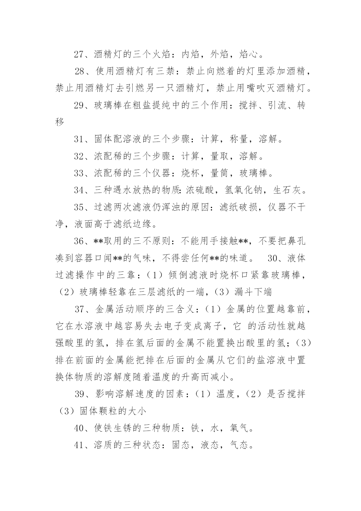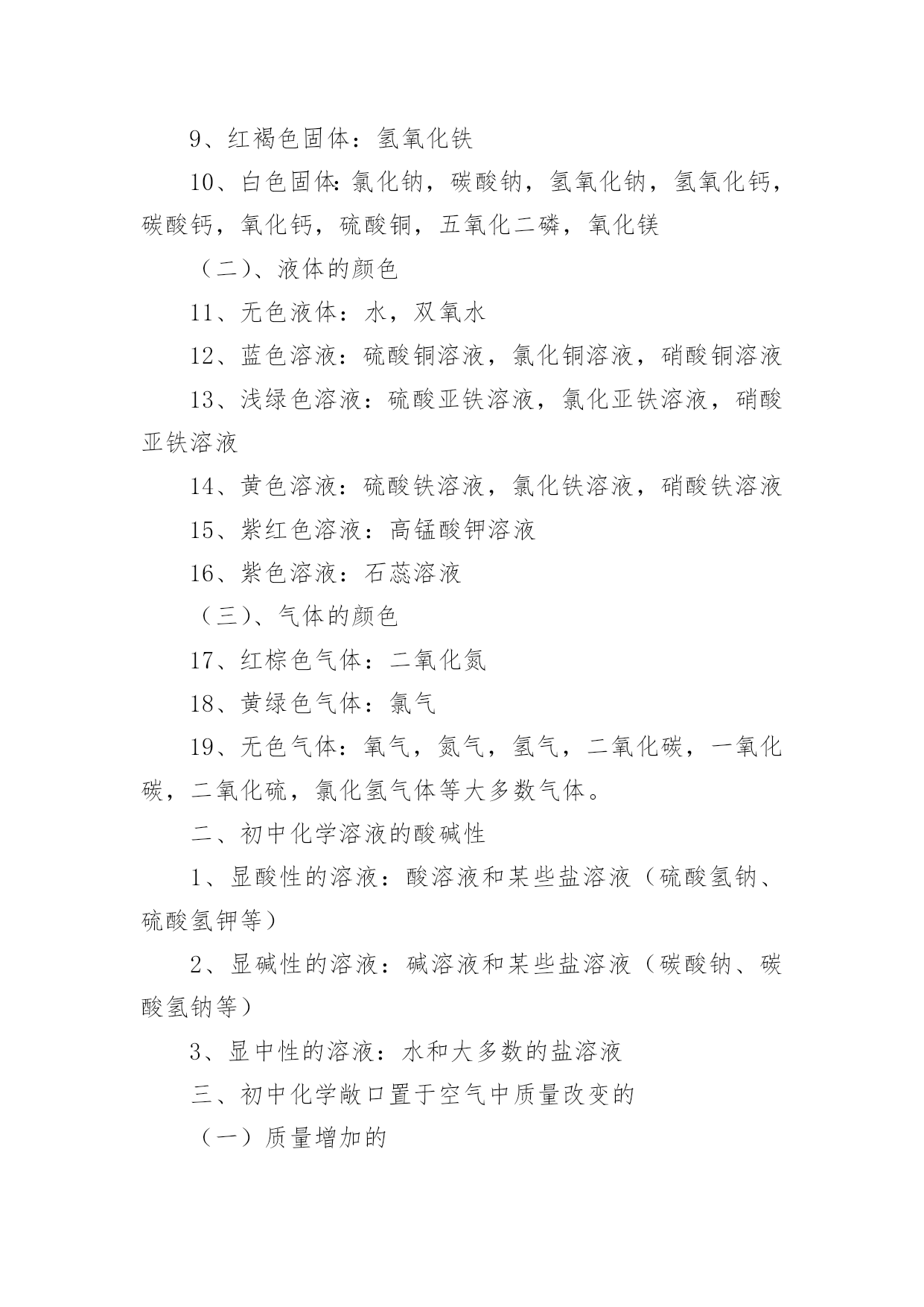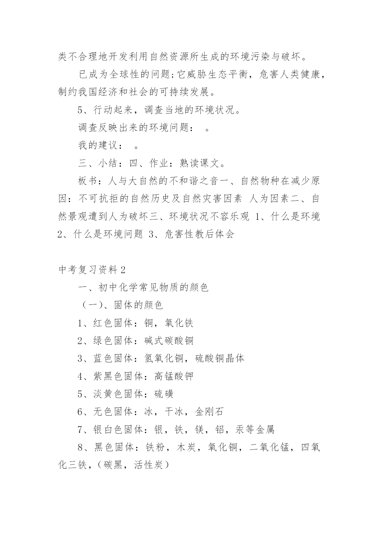 中考复习资料中考复习资料1第六单元与大自然和谐相处吴定侃教学要求1、知道人类自然界的一部分,认识自己生命的可贵。2.知道我国的人口、资源、环境等状况,了解保护环境、合理利用资源的政策、法律,树立可持续发展有意识。3、主动锻炼个性心理品质,磨砺意志,形成良好的学习习惯和生活态度。4、感受大自然之美,了解鉴赏自然美的方法,了解人与自然的道德规范和保护环境的法律法规。教学重难点:怎样鉴赏大自然之美教学方法:讨论法、谈话法、案例分析法、研究性学习法教学时数:5课时教学过程:第一课时教学内容:感受大自然之美教学要求:1、认识大自然的美丽的表现。2、知道怎样鉴赏大自然之美。教学过程:一、引入新课。阅读《孟杰和他的伙伴们》。我们是否也感受到了大自然的美、家乡的美?我们家乡是否也没有人捉小鸟,太阳的脸上也没有黑烟?让我们一起感受大自然吧!二、讲授新课。板书:感受大自然之美一、美丽的大自然1、学生看图,然后交流搜集到的资料,感受大自然之美,并精选资料在全班展示。谈一谈:每个人都有自己眼中的大自然,自己认为大自然美在哪里?代表发言,共同归纳:(1)神秘的宇宙使大自然魅力无穷。(2)奇妙的生物世界精彩纷呈。(3)大自然风光秀丽,美景如画。2、名篇欣赏,朗读〈〈海上日出〉〉。3、二、访谈:怎样鉴赏大自然之美看图,说一说:自己在图片中看到的在自然之美,自己在鉴赏大自然美景时,有什么经验?分角色扮演小记者和陆教授表演答记者问。从中总结出大自然的美。审美交流:谈一谈泰山美在哪里?三、小结:自然与我们的生活有着密切的联系,如果我们以此为基础领悟了人类在改造自然中的伟大力量,我们以对自然美的理解会更加深刻。希望大家走进大自然,在感受大自然无尽的美中更加亲近大自然,热爱大自然。四、作业:熟读课文,理解内容。板书:感受大自然之美一、美丽的大自然、神秘的宇宙使大自然魅力无穷2、奇妙的生物世界精彩纷呈3、大自然风光秀丽,美丽如画。二、访谈:怎样鉴赏大自然之美1、我们看到的自然现象。2、美的自然对象分为两种:(1)经过人工改造加工、利用的对象;(2)末经直接改造的自然。教学后体会:第二课时教学内容人与大自然的不和谐之音教学目标1、知道自然物种在减少及原因。2、如何认识自然景观遭到人为破坏的情况。3、懂得环境状况不容乐观,保护环境是我们的责任。教学重点:理解自然物种在减少和自然景观遭到人为破坏及其原因教学难点懂得环境状况不容乐观教学过程一、引入新课。二、讲授新课。1、学生看图,思考、讨论:看了上面的'图片自己有什么感想?对目前大自然面临的威胁自己知道多少?分小组交流。2、板书:一自然物种在减少学生阅读材料,谈谈自己的感受。讨论交流:导致大自然物种减少的原因是什么?物种的减少会给人类带来什么影响?捕杀、食用时野生动物有什么危害?共同归纳:原因:人为因素、不可抗拒的历史及自然灾害因素影响:破坏大自然的生态平衡,危及人类自身。3、板书:二、自然景观遭到人为破坏阅读材料,思考:我们如何认识自然景观遭到人为破坏的情况?自己还知道哪些自然景观遭到人为破坏的事例?说出来与大家交流。4、三、环境状况不容乐观学生阅读材料,讨论:自然环境对我们的生存与生活有什么影响?想一想:我们对自己生活的环境状况满意吗?交流:结合自己的生活环境及生活经历,谈谈对环境污染危害性的认识。共同归纳:环境是我们生产生活的场所;环境问题是人类不合理地开发利用自然资源所生成的环境污染与破坏。已成为全球性的问题;它威胁生态平衡,危害人类健康,制约我国经济和社会的可持续发展。5、行动起来,调查当地的环境状况。调查反映出来的环境问题:。我的建议:。三、小结:四、作业:熟读课文。板书:人与大自然的不和谐之音一、自然物种在减少原因:不可抗拒的自然历史及自然灾害因素人为因素二、自然景观遭到人为破坏三、环境状况不容乐观1、什么是环境2、什么是环境问题3、危害性教后体会中考复习资料2一、初中化学常见物质的颜色(一)、固体的颜色1、红色固体:铜,氧化铁2、绿色固体:碱式碳酸铜3、蓝色固体:氢氧化铜,硫酸铜晶体4、紫黑色固体:高锰酸钾5、淡黄色固体:硫磺6、无色固体:冰,干冰,金刚石7、银白色固体:银,铁,镁,铝,汞等金属8、黑色固体:铁粉,木炭,氧化铜,二氧化锰,四氧化三铁,(碳黑,活性炭)9、红褐色固体:氢氧化铁10、白色固体:氯化钠,碳酸钠,氢氧化钠,氢氧化钙,碳酸钙,氧化钙,硫酸铜,五氧化二磷,氧化镁(二)、液体的颜色11、无色液体:水,双氧水12、蓝色溶液:硫酸铜溶液,氯化铜溶液,硝酸铜溶液13、浅绿色溶液:硫酸亚铁溶液,氯化亚铁溶液,硝酸亚铁溶液14、黄色溶液:硫酸铁溶液,氯化铁溶液,硝酸铁溶液15、紫红色溶液:高锰酸钾溶液16、紫色溶液:石蕊溶液(三)、气体的颜色17、红棕色气体:二氧化氮18、黄绿色气体:氯气19、无