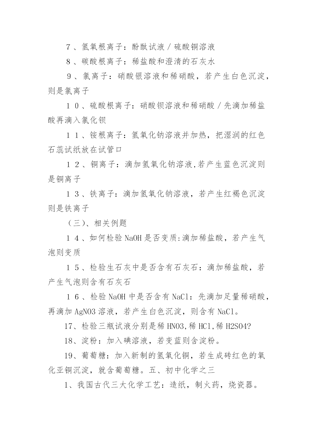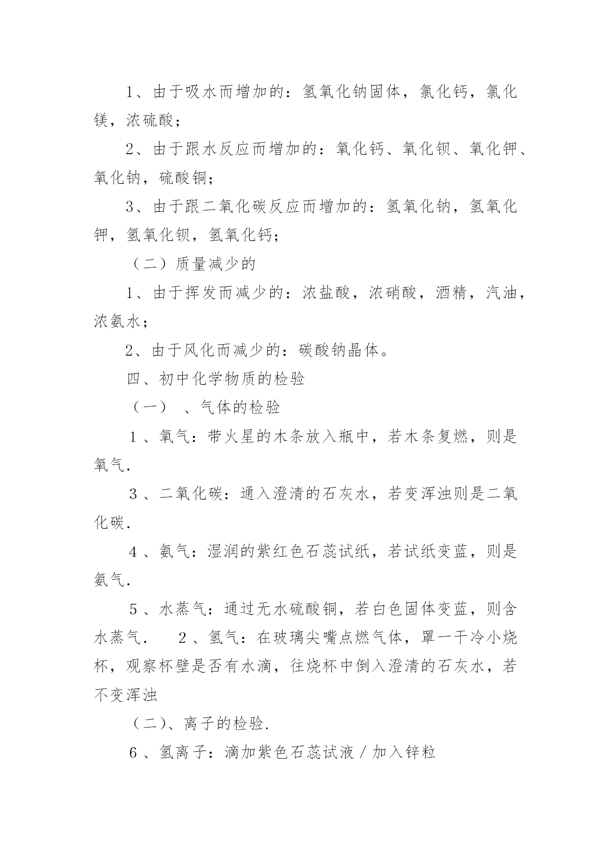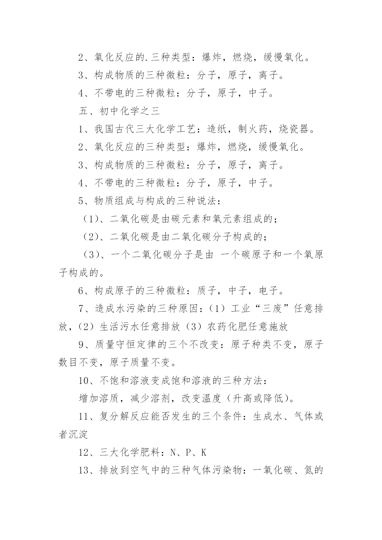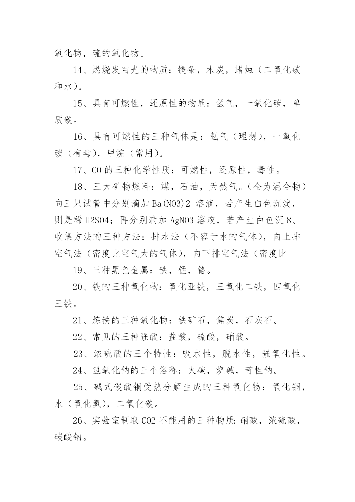 中考复习资料中考复习资料1第六单元与大自然和谐相处吴定侃教学要求1、知道人类自然界的一部分,认识自己生命的可贵。2.知道我国的人口、资源、环境等状况,了解保护环境、合理利用资源的政策、法律,树立可持续发展有意识。3、主动锻炼个性心理品质,磨砺意志,形成良好的学习习惯和生活态度。4、感受大自然之美,了解鉴赏自然美的方法,了解人与自然的道德规范和保护环境的法律法规。教学重难点:怎样鉴赏大自然之美教学方法:讨论法、谈话法、案例分析法、研究性学习法教学时数:5课时教学过程:第一课时教学内容:感受大自然之美教学要求:1、认识大自然的美丽的表现。2、知道怎样鉴赏大自然之美。教学过程:一、引入新课。阅读《孟杰和他的伙伴们》。我们是否也感受到了大自然的美、家乡的美?我们家乡是否也没有人捉小鸟,太阳的脸上也没有黑烟?让我们一起感受大自然吧!二、讲授新课。板书:感受大自然之美一、美丽的大自然1、学生看图,然后交流搜集到的资料,感受大自然之美,并精选资料在全班展示。谈一谈:每个人都有自己眼中的大自然,自己认为大自然美在哪里?代表发言,共同归纳:(1)神秘的宇宙使大自然魅力无穷。(2)奇妙的生物世界精彩纷呈。(3)大自然风光秀丽,美景如画。2、名篇欣赏,朗读〈〈海上日出〉〉。3、二、访谈:怎样鉴赏大自然之美看图,说一说:自己在图片中看到的在自然之美,自己在鉴赏大自然美景时,有什么经验?分角色扮演小记者和陆教授表演答记者问。从中总结出大自然的美。审美交流:谈一谈泰山美在哪里?三、小结:自然与我们的生活有着密切的联系,如果我们以此为基础领悟了人类在改造自然中的伟大力量,我们以对自然美的理解会更加深刻。希望大家走进大自然,在感受大自然无尽的美中更加亲近大自然,热爱大自然。四、作业:熟读课文,理解内容。板书:感受大自然之美一、美丽的大自然、神秘的宇宙使大自然魅力无穷2、奇妙的生物世界精彩纷呈3、大自然风光秀丽,美丽如画。二、访谈:怎样鉴赏大自然之美1、我们看到的自然现象。2、美的自然对象分为两种:(1)经过人工改造加工、利用的对象;(2)末经直接改造的自然。教学后体会:第二课时教学内容人与大自然的不和谐之音教学目标1、知道自然物种在减少及原因。2、如何认识自然景观遭到人为破坏的情况。3、懂得环境状况不容乐观,保护环境是我们的责任。教学重点:理解自然物种在减少和自然景观遭到人为破坏及其原因教学难点懂得环境状况不容乐观教学过程一、引入新课。二、讲授新课。1、学生看图,思考、讨论:看了上面的'图片自己有什么感想?对目前大自然面临的威胁自己知道多少?分小组交流。2、板书:一自然物种在减少学生阅读材料,谈谈自己的感受。讨论交流:导致大自然物种减少的原因是什么?物种的减少会给人类带来什么影响?捕杀、食用时野生动物有什么危害?共同归纳:原因:人为因素、不可抗拒的历史及自然灾害因素影响:破坏大自然的生态平衡,危及人类自身。3、板书:二、自然景观遭到人为破坏阅读材料,思考:我们如何认识自然景观遭到人为破坏的情况?自己还知道哪些自然景观遭到人为破坏的事例?说出来与大家交流。4、三、环境状况不容乐观学生阅读材料,讨论:自然环境对我们的生存与生活有什么影响?想一想:我们对自己生活的环境状况满意吗?交流:结合自己的生活环境及生活经历,谈谈对环境污染危害性的认识。共同归纳:环境是我们生产生活的场所;环境问题是人类不合理地开发利用自然资源所生成的环境污染与破坏。已成为全球性的问题;它威胁生态平衡,危害人类健康,制约我国经济和社会的可持续发展。5、行动起来,调查当地的环境状况。调查反映出来的环境问题:。我的建议:。三、小结:四、作业:熟读课文。板书:人与大自然的不和谐之音一、自然物种在减少原因:不可抗拒的自然历史及自然灾害因素人为因素二、自然景观遭到人为破坏三、环境状况不容乐观1、什么是环境2、什么是环境问题3、危害性教后体会中考复习资料2一、初中化学常见物质的颜色(一)、固体的颜色1、红色固体:铜,氧化铁2、绿色固体:碱式碳酸铜3、蓝色固体:氢氧化铜,硫酸铜晶体4、紫黑色固体:高锰酸钾5、淡黄色固体:硫磺6、无色固体:冰,干冰,金刚石7、银白色固体:银,铁,镁,铝,汞等金属8、黑色固体:铁粉,木炭,氧化铜,二氧化锰,四氧化三铁,(碳黑,活性炭)9、红褐色固体:氢氧化铁10、白色固体:氯化钠,碳酸钠,氢氧化钠,氢氧化钙,碳酸钙,氧化钙,硫酸铜,五氧化二磷,氧化镁(二)、液体的颜色11、无色液体:水,双氧水12、蓝色溶液:硫酸铜溶液,氯化铜溶液,硝酸铜溶液13、浅绿色溶液:硫酸亚铁溶液,氯化亚铁溶液,硝酸亚铁溶液14、黄色溶液:硫酸铁溶液,氯化铁溶液,硝酸铁溶液15、紫红色溶液:高锰酸钾溶液16、紫色溶液:石蕊溶液(三)、气体的颜色17、红棕色气体:二氧化氮18、黄绿色气体:氯气19、无