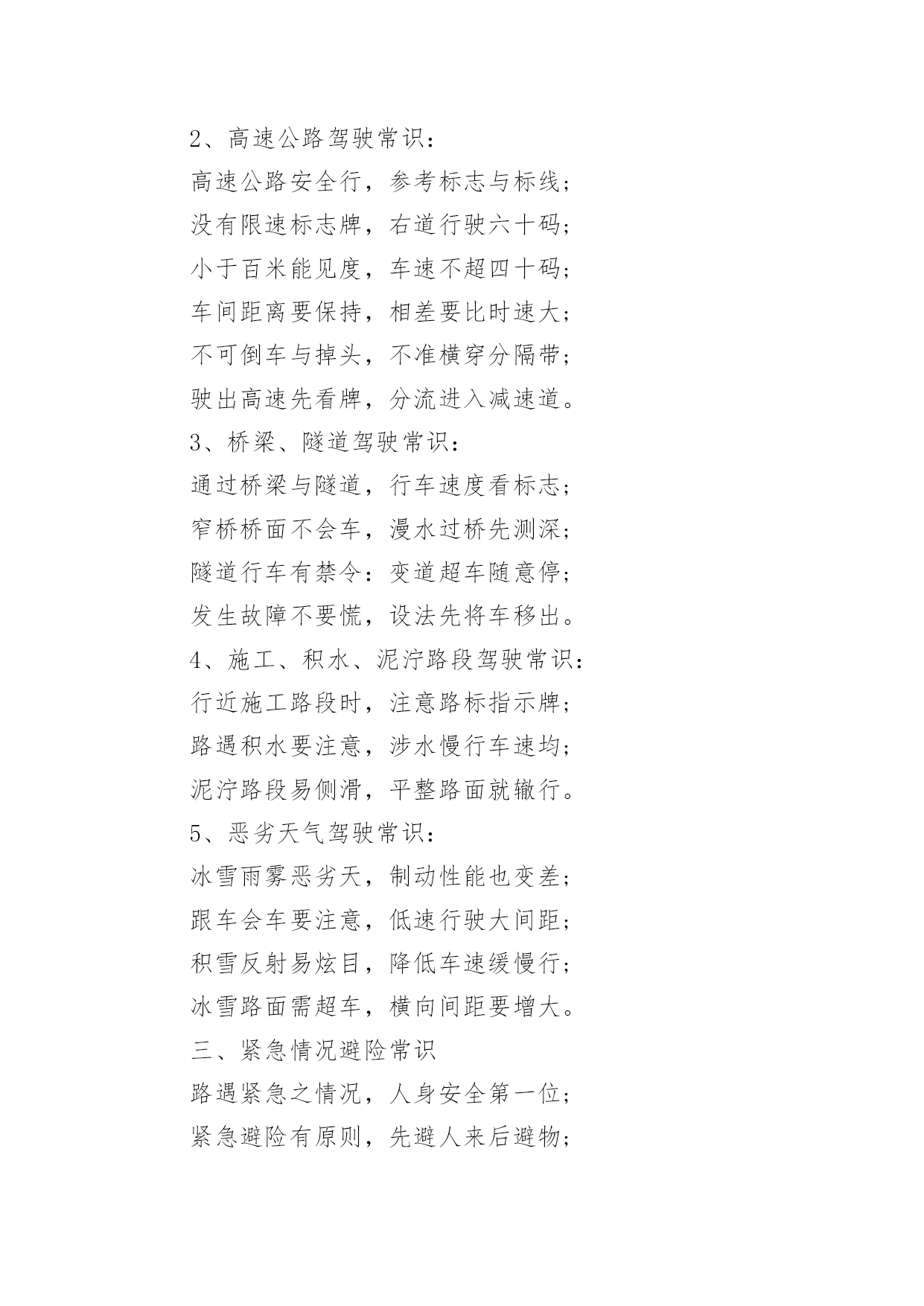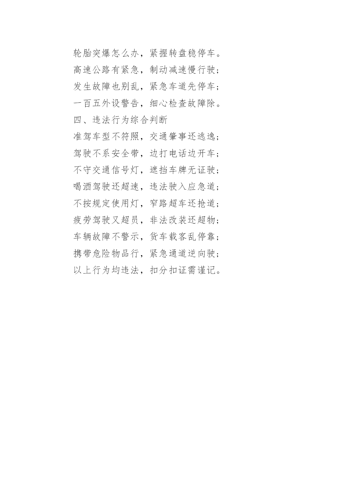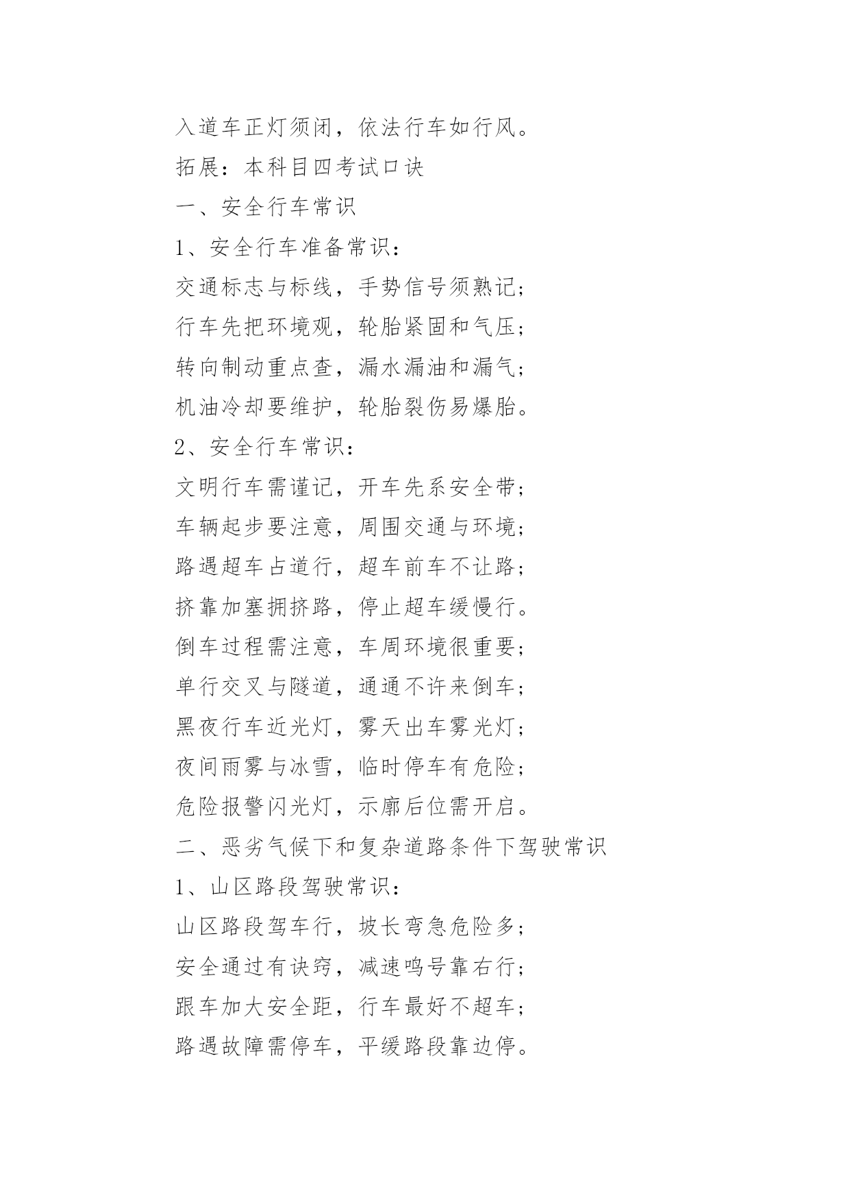 科目四考试速记口诀科目四考试速记口诀科目四考试作为驾考的最后一个科目,由于题目众多,所以大家一定要学会速记,以下是小编为大家整理的科目四考试速记口诀,仅供参考,欢迎大家阅读。科目四考试速记口诀车行路上万千事,件件应在预料中;路口转弯以灯示,红灯立停绿直通。变道行车看标记,行停头脑应灵光;限速行驶有规定,此时不宜加档冲。若遇弯道先减速,减速减档油全松;减至三档稳住油,弯过再把油门轰。超车道上不减档,减档停车靠边弄;紧急情况不受限,确保安全出万方。弯道快行莫急刹,急刹方向必反弓;猛打猛回是大忌,两者后果似一桩。行近坡顶油减半,判明路情通不通;路侧一险不近险,路侧均险走道中。前途不明莫急行,复杂路况别瞎懵;转弯进洞均需慢,超车更要视野空。各种情形道不尽,四十码内走始终;东西南北道不同,本领高强通四方。能行则行莫强行,变道后视打灯光;入道车正灯须闭,依法行车如行风。拓展:本科目四考试口诀一、安全行车常识1、安全行车准备常识:交通标志与标线,手势信号须熟记;行车先把环境观,轮胎紧固和气压;转向制动重点查,漏水漏油和漏气;机油冷却要维护,轮胎裂伤易爆胎。2、安全行车常识:文明行车需谨记,开车先系安全带;车辆起步要注意,周围交通与环境;路遇超车占道行,超车前车不让路;挤靠加塞拥挤路,停止超车缓慢行。倒车过程需注意,车周环境很重要;单行交叉与隧道,通通不许来倒车;黑夜行车近光灯,雾天出车雾光灯;夜间雨雾与冰雪,临时停车有危险;危险报警闪光灯,示廓后位需开启。二、恶劣气候下和复杂道路条件下驾驶常识1、山区路段驾驶常识:山区路段驾车行,坡长弯急危险多;安全通过有诀窍,减速鸣号靠右行;跟车加大安全距,行车最好不超车;路遇故障需停车,平缓路段靠边停。2、高速公路驾驶常识:高速公路安全行,参考标志与标线;没有限速标志牌,右道行驶六十码;小于百米能见度,车速不超四十码;车间距离要保持,相差要比时速大;不可倒车与掉头,不准横穿分隔带;驶出高速先看牌,分流进入减速道。3、桥梁、隧道驾驶常识:通过桥梁与隧道,行车速度看标志;窄桥桥面不会车,漫水过桥先测深;隧道行车有禁令:变道超车随意停;发生故障不要慌,设法先将车移出。4、施工、积水、泥泞路段驾驶常识:行近施工路段时,注意路标指示牌;路遇积水要注意,涉水慢行车速均;泥泞路段易侧滑,平整路面就辙行。5、恶劣天气驾驶常识:冰雪雨雾恶劣天,制动性能也变差;跟车会车要注意,低速行驶大间距;积雪反射易炫目,降低车速缓慢行;冰雪路面需超车,横向间距要增大。三、紧急情况避险常识路遇紧急之情况,人身安全第一位;紧急避险有原则,先避人来后避物;轮胎突爆怎么办,紧握转盘稳停车。高速公路有紧急,制动减速慢行驶;发生故障也别乱,紧急车道先停车;一百五外设警告,细心检查故障除。四、违法行为综合判断准驾车型不符照,交通肇事还逃逸;驾驶不系安全带,边打电话边开车;不守交通信号灯,遮挡车牌无证驶;喝酒驾驶还超速,违法驶入应急道;不按规定使用灯,窄路超车还抢道;疲劳驾驶又超员,非法改装还超物;车辆故障不警示,货车载客乱停靠;携带危险物品行,紧急通道逆向驶;以上行为均违法,扣分扣证需谨记。
