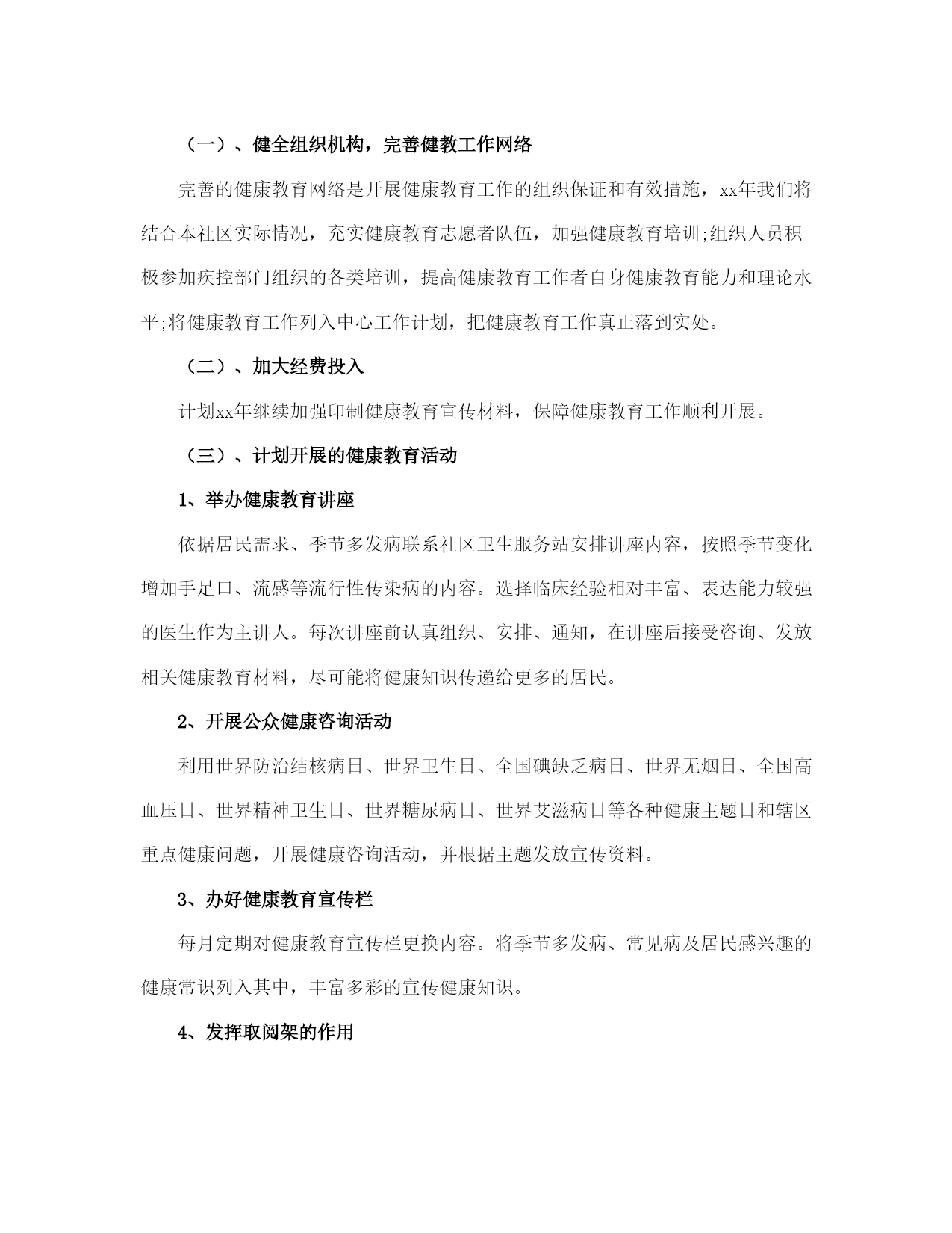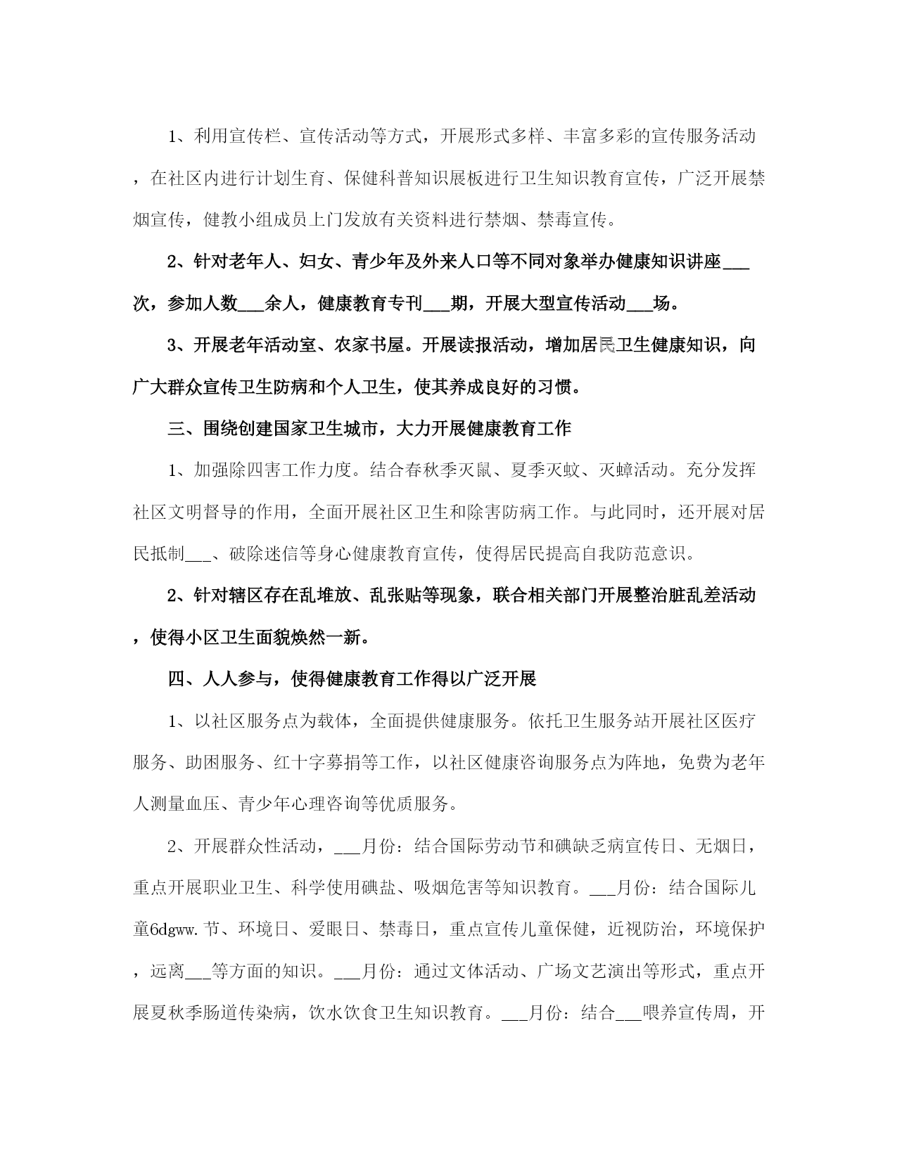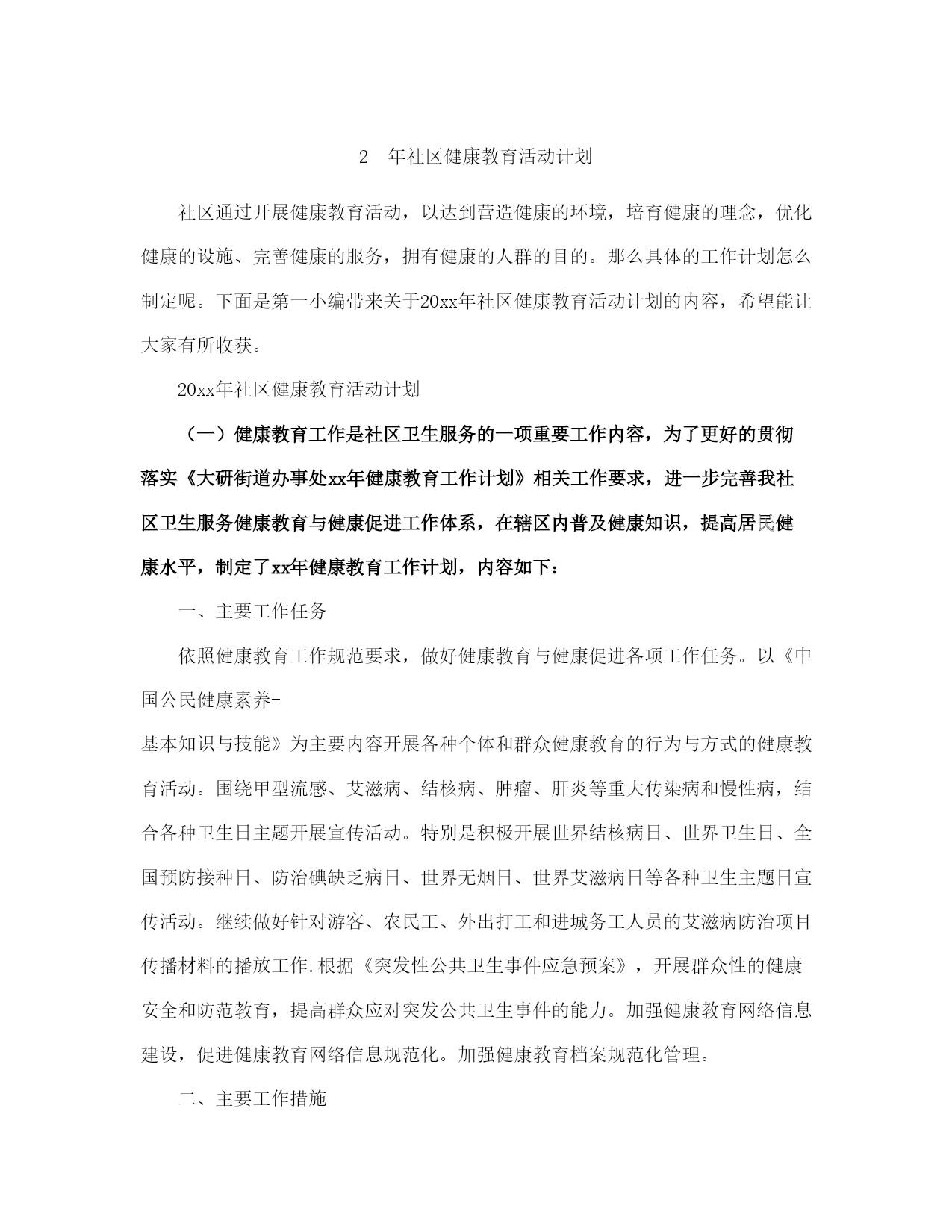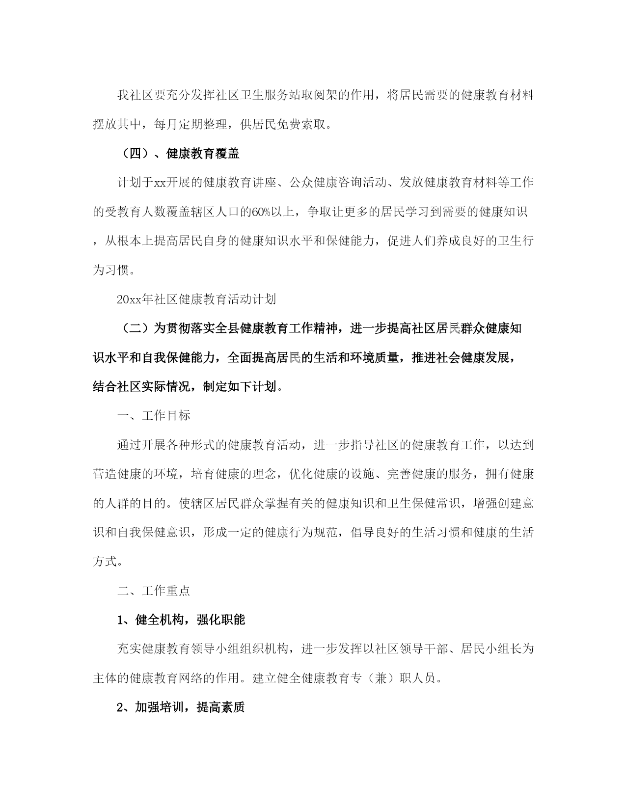 社区健康教育活动计划(完整版)文档资料可直接使用,可编辑,欢迎下载2年社区健康教育活动计划社区通过开展健康教育活动,以达到营造健康的环境,培育健康的理念,优化健康的设施、完善健康的服务,拥有健康的人群的目的。那么具体的工作计划怎么制定呢。下面是第一小编带来关于20xx年社区健康教育活动计划的内容,希望能让大家有所收获。20xx年社区健康教育活动计划(一)健康教育工作是社区卫生服务的一项重要工作内容,为了更好的贯彻落实《大研街道办事处xx年健康教育工作计划》相关工作要求,进一步完善我社区卫生服务健康教育与健康促进工作体系,在辖区内普及健康知识,提高居民健康水平,制定了xx年健康教育工作计划,内容如下:一、主要工作任务依照健康教育工作规范要求,做好健康教育与健康促进各项工作任务。以《中国公民健康素养-基本知识与技能》为主要内容开展各种个体和群众健康教育的行为与方式的健康教育活动。围绕甲型流感、艾滋病、结核病、肿瘤、肝炎等重大传染病和慢性病,结合各种卫生日主题开展宣传活动。特别是积极开展世界结核病日、世界卫生日、全国预防接种日、防治碘缺乏病日、世界无烟日、世界艾滋病日等各种卫生主题日宣传活动。继续做好针对游客、农民工、外出打工和进城务工人员的艾滋病防治项目传播材料的播放工作.根据《突发性公共卫生事件应急预案》,开展群众性的健康安全和防范教育,提高群众应对突发公共卫生事件的能力。加强健康教育网络信息建设,促进健康教育网络信息规范化。加强健康教育档案规范化管理。二、主要工作措施(一)、健全组织机构,完善健教工作网络完善的健康教育网络是开展健康教育工作的组织保证和有效措施,xx年我们将结合本社区实际情况,充实健康教育志愿者队伍,加强健康教育培训;组织人员积极参加疾控部门组织的各类培训,提高健康教育工作者自身健康教育能力和理论水平;将健康教育工作列入中心工作计划,把健康教育工作真正落到实处。(二)、加大经费投入计划xx年继续加强印制健康教育宣传材料,保障健康教育工作顺利开展。(三)、计划开展的健康教育活动1、举办健康教育讲座依据居民需求、季节多发病联系社区卫生服务站安排讲座内容,按照季节变化增加手足口、流感等流行性传染病的内容。选择临床经验相对丰富、表达能力较强的医生作为主讲人。每次讲座前认真组织、安排、通知,在讲座后接受咨询、发放相关健康教育材料,尽可能将健康知识传递给更多的居民。2、开展公众健康咨询活动利用世界防治结核病日、世界卫生日、全国碘缺乏病日、世界无烟日、全国高血压日、世界精神卫生日、世界糖尿病日、世界艾滋病日等各种健康主题日和辖区重点健康问题,开展健康咨询活动,并根据主题发放宣传资料。3、办好健康教育宣传栏每月定期对健康教育宣传栏更换内容。将季节多发病、常见病及居民感兴趣的健康常识列入其中,丰富多彩的宣传健康知识。4、发挥取阅架的作用我社区要充分发挥社区卫生服务站取阅架的作用,将居民需要的健康教育材料摆放其中,每月定期整理,供居民免费索取。(四)、健康教育覆盖计划于xx开展的健康教育讲座、公众健康咨询活动、发放健康教育材料等工作的受教育人数覆盖辖区人口的60%以上,争取让更多的居民学习到需要的健康知识,从根本上提高居民自身的健康知识水平和保健能力,促进人们养成良好的卫生行为习惯。20xx年社区健康教育活动计划(二)为贯彻落实全县健康教育工作精神,进一步提高社区居民群众健康知识水平和自我保健能力,全面提高居民的生活和环境质量,推进社会健康发展,结合社区实际情况,制定如下计划。一、工作目标通过开展各种形式的健康教育活动,进一步指导社区的健康教育工作,以达到营造健康的环境,培育健康的理念,优化健康的设施、完善健康的服务,拥有健康的人群的目的。使辖区居民群众掌握有关的健康知识和卫生保健常识,增强创建意识和自我保健意识,形成一定的健康行为规范,倡导良好的生活习惯和健康的生活方式。二、工作重点1、健全机构,强化职能充实健康教育领导小组组织机构,进一步发挥以社区领导干部、居民小组长为主体的健康教育网络的作用。建立健全健康教育专(兼)职人员。2、加强培训,提高素质办好健康教育居民学校,以社区健康教育为主,组织居民群众积极参与健康教育学习培训、座谈,努力提高社区居民素质。健康教育学习培训每年不少于两场,做到授课有计划安排、有记录,开课率达100%。3、广泛宣传,增强意识广泛开展各类宣传教育活动,大力普及健康教育知识、增强群众健康意识。利用宣传栏等阵地向居民宣传健康保健、卫生科普知识,每季度更换一期宣传内容,引导居民养成健康的生活方式,形成人人讲卫生的好风尚。4、创新方式,丰富载体探索创新健康教育活动方式,广泛开展丰富多彩的健康教育。开展上街入户宣传并发放健康知识材料普及健康