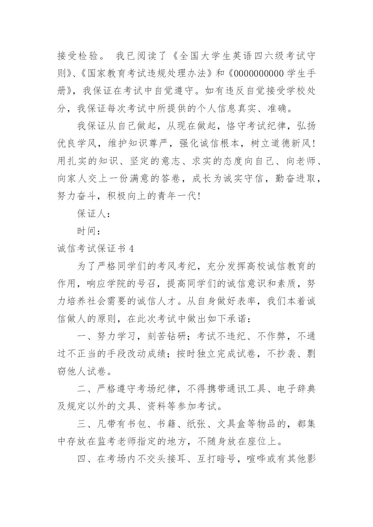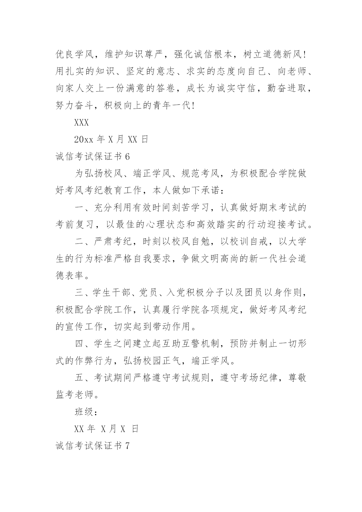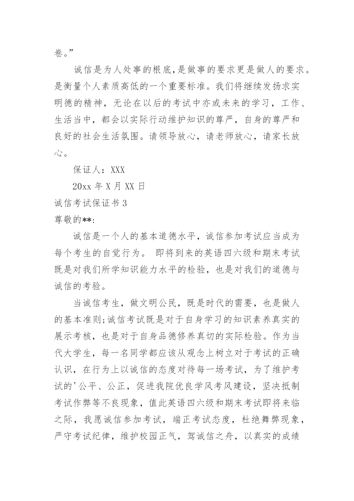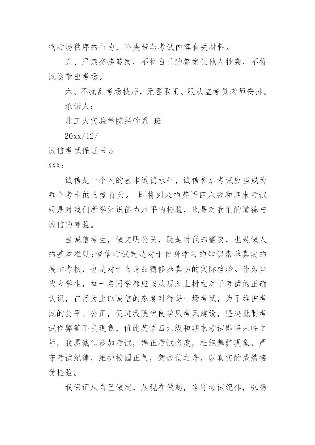 诚信考试保证书诚信考试保证书在不断进步的时代,保证书的使用频率呈上升趋势,有效的保证书必须合乎法律的规定。我们应当如何写保证书呢?以下是小编精心整理的诚信考试保证书,希望能够帮助到大家。诚信考试保证书1诚信是一个人的基本道德水平,诚信参加考试应当成为每个考生的自觉行为。即将到来的英语四六级和期末考试既是对我们所学知识能力水平的检验,也是对我们的道德与诚信的考验。当诚信考生,做文明公民,既是时代的需要,也是做人的基本准则;诚信考试既是对于自身学习的知识素养真实的展示考核,也是对于自身品德修养真切的实际检验。作为当代大学生,每一名同学都应该从观念上树立对于考试的正确认识,在行为上以诚信的态度对待每一场考试,为了维护考试的公平、公正,促进我院优良学风考风建设,坚决抵制考试作弊等不良现象,值此英语四六级和期末考试即将来临之际,我愿诚信参加考试,端正考试态度,杜绝舞弊现象,严守考试纪律,维护校园正气,驾诚信之舟,以真实的成绩接受检验。我已阅读了《全国大学生英语四六级考试守则》、《国家教育考试违规处理办法》和《学生手册》,我保证在考试中自觉遵守。如有违反自觉接受学校处分,我保证每次考试中所提供的个人信息真实、准确。我保证从自己做起,从现在做起,恪守考试纪律,弘扬优良学风,维护知识尊严,强化诚信根本,树立道德新风!用扎实的知识、坚定的意志、求实的态度向自己、向老师、向家人交上一份满意的答卷,成长为诚实守信,勤奋进取,努力奋斗,积极向上的青年一代!保证人:_________日期:_________年____月____日诚信考试保证书2一:充分利用有效时间刻苦学习,认真做好期末考试的考前复习,以最佳的心理状态和高效踏实的行动迎接考试。二:严肃考纪,时刻以校风自勉,以校训自戒,以大学生的行为标准严格自我要求,争做文明高尚的新一代社会道德表率。三:学生干部、团员、党员以及入党积极分子以身作则,积极配合学院工作,认真履行学院各项规定,做好考风考纪的宣传工作,切实起到带动作用。四:学生之间建立起互助互警机制,预防并制止一切形式的作弊行为,弘扬校园正气,端正学风。五:考试期间严格遵守考试规则,遵守考场纪律,尊敬监考老师。诚实守信,力争营造“诚信至上”的校园氛围。杜绝弄虚作假,做到不剽窃,不抄袭,真实独立地完成答卷。”诚信是为人处事的根底,是做事的要求更是做人的要求。是衡量个人素质高低的一个重要标准。我们将继续发扬求实明德的精神,无论在以后的考试中亦或未来的学习,工作、生活当中,都会以实际行动维护知识的尊严,自身的尊严和良好的社会生活氛围。请领导放心,请老师放心,请家长放心。保证人:XXX20xx年X月XX日诚信考试保证书3尊敬的**:诚信是一个人的基本道德水平,诚信参加考试应当成为每个考生的自觉行为。即将到来的英语四六级和期末考试既是对我们所学知识能力水平的检验,也是对我们的道德与诚信的考验。当诚信考生,做文明公民,既是时代的需要,也是做人的基本准则;诚信考试既是对于自身学习的知识素养真实的展示考核,也是对于自身品德修养真切的实际检验。作为当代大学生,每一名同学都应该从观念上树立对于考试的正确认识,在行为上以诚信的态度对待每一场考试,为了维护考试的'公平、公正,促进我院优良学风考风建设,坚决抵制考试作弊等不良现象,值此英语四六级和期末考试即将来临之际,我愿诚信参加考试,端正考试态度,杜绝舞弊现象,严守考试纪律,维护校园正气,驾诚信之舟,以真实的成绩接受检验。我已阅读了《全国大学生英语四六级考试守则》、《国家教育考试违规处理办法》和《0000000000学生手册》,我保证在考试中自觉遵守。如有违反自觉接受学校处分,我保证每次考试中所提供的个人信息真实、准确。我保证从自己做起,从现在做起,恪守考试纪律,弘扬优良学风,维护知识尊严,强化诚信根本,树立道德新风!用扎实的知识、坚定的意志、求实的态度向自己、向老师、向家人交上一份满意的答卷,成长为诚实守信,勤奋进取,努力奋斗,积极向上的青年一代!保证人:时间:诚信考试保证书4为了严格同学们的考风考纪,充分发挥高校诚信教育的作用,响应学院的号召,提高同学们的诚信意识和素质,努力培养社会需要的诚信人才。从自身做好表率,我们本着诚信做人的原则,在此次考试中做出如下承诺:一、努力学习,刻苦钻研;考试不违纪、不作弊,不通过不正当的手段改动成绩;按时独立完成试卷,不抄袭、剽窃他人试卷。二、严格遵守考场纪律,不得携带通讯工具、电子辞典及规定以外的文具、资料等参加考试。三、凡带有书包、书籍、纸张、文具盒等物品的,都集中存放在监考老师指定的地方,不随身放在座位上。四、在考场内不交头接耳、互打暗号,喧哗或有其他影响考场秩序的行为,不夹带与考试内容有关材料。五、严禁交换答案,不将自己的答案让他人抄袭,不将试卷带出考场。六、不扰乱考场