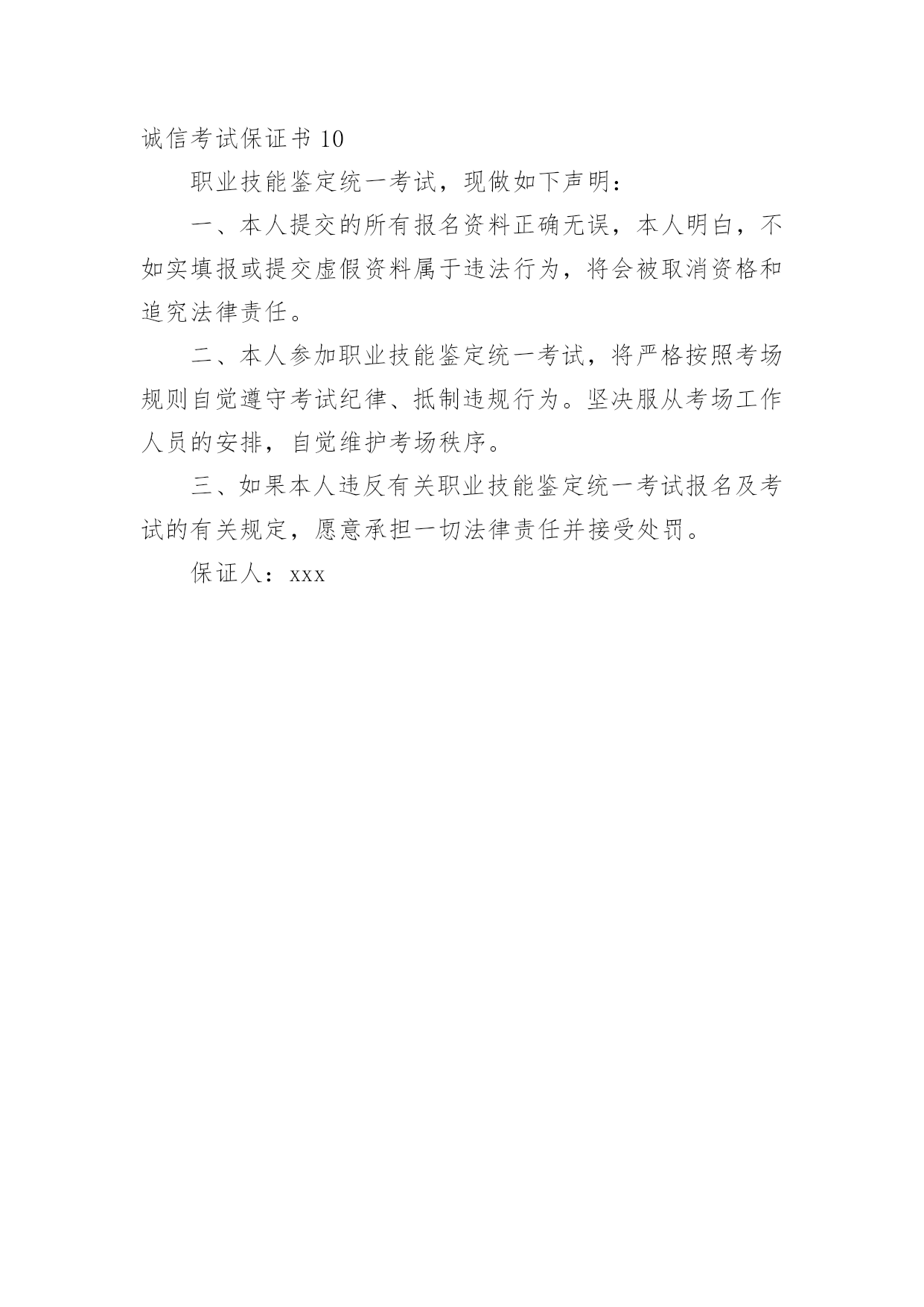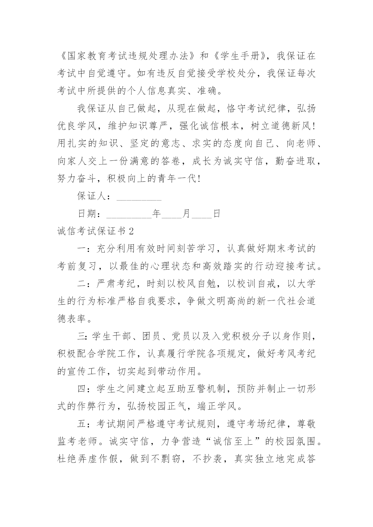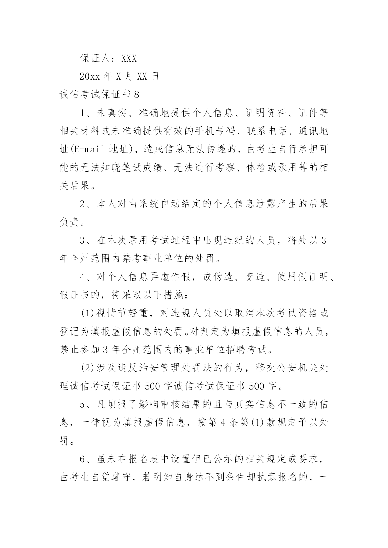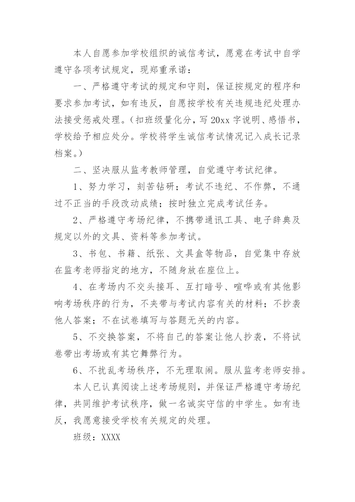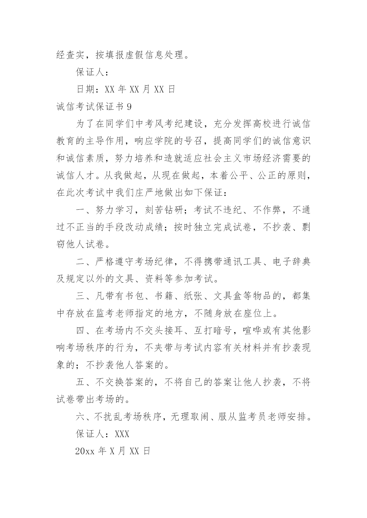 诚信考试保证书诚信考试保证书在不断进步的时代,保证书的使用频率呈上升趋势,有效的保证书必须合乎法律的规定。我们应当如何写保证书呢?以下是小编精心整理的诚信考试保证书,希望能够帮助到大家。诚信考试保证书1诚信是一个人的基本道德水平,诚信参加考试应当成为每个考生的自觉行为。即将到来的英语四六级和期末考试既是对我们所学知识能力水平的检验,也是对我们的道德与诚信的考验。当诚信考生,做文明公民,既是时代的需要,也是做人的基本准则;诚信考试既是对于自身学习的知识素养真实的展示考核,也是对于自身品德修养真切的实际检验。作为当代大学生,每一名同学都应该从观念上树立对于考试的正确认识,在行为上以诚信的态度对待每一场考试,为了维护考试的公平、公正,促进我院优良学风考风建设,坚决抵制考试作弊等不良现象,值此英语四六级和期末考试即将来临之际,我愿诚信参加考试,端正考试态度,杜绝舞弊现象,严守考试纪律,维护校园正气,驾诚信之舟,以真实的成绩接受检验。我已阅读了《全国大学生英语四六级考试守则》、《国家教育考试违规处理办法》和《学生手册》,我保证在考试中自觉遵守。如有违反自觉接受学校处分,我保证每次考试中所提供的个人信息真实、准确。我保证从自己做起,从现在做起,恪守考试纪律,弘扬优良学风,维护知识尊严,强化诚信根本,树立道德新风!用扎实的知识、坚定的意志、求实的态度向自己、向老师、向家人交上一份满意的答卷,成长为诚实守信,勤奋进取,努力奋斗,积极向上的青年一代!保证人:_________日期:_________年____月____日诚信考试保证书2一:充分利用有效时间刻苦学习,认真做好期末考试的考前复习,以最佳的心理状态和高效踏实的行动迎接考试。二:严肃考纪,时刻以校风自勉,以校训自戒,以大学生的行为标准严格自我要求,争做文明高尚的新一代社会道德表率。三:学生干部、团员、党员以及入党积极分子以身作则,积极配合学院工作,认真履行学院各项规定,做好考风考纪的宣传工作,切实起到带动作用。四:学生之间建立起互助互警机制,预防并制止一切形式的作弊行为,弘扬校园正气,端正学风。五:考试期间严格遵守考试规则,遵守考场纪律,尊敬监考老师。诚实守信,力争营造“诚信至上”的校园氛围。杜绝弄虚作假,做到不剽窃,不抄袭,真实独立地完成答卷。”诚信是为人处事的根底,是做事的要求更是做人的要求。是衡量个人素质高低的一个重要标准。我们将继续发扬求实明德的精神,无论在以后的考试中亦或未来的学习,工作、生活当中,都会以实际行动维护知识的尊严,自身的尊严和良好的社会生活氛围。请领导放心,请老师放心,请家长放心。保证人:XXX20xx年X月XX日诚信考试保证书3尊敬的**:诚信是一个人的基本道德水平,诚信参加考试应当成为每个考生的自觉行为。即将到来的英语四六级和期末考试既是对我们所学知识能力水平的检验,也是对我们的道德与诚信的考验。当诚信考生,做文明公民,既是时代的需要,也是做人的基本准则;诚信考试既是对于自身学习的知识素养真实的展示考核,也是对于自身品德修养真切的实际检验。作为当代大学生,每一名同学都应该从观念上树立对于考试的正确认识,在行为上以诚信的态度对待每一场考试,为了维护考试的'公平、公正,促进我院优良学风考风建设,坚决抵制考试作弊等不良现象,值此英语四六级和期末考试即将来临之际,我愿诚信参加考试,端正考试态度,杜绝舞弊现象,严守考试纪律,维护校园正气,驾诚信之舟,以真实的成绩接受检验。我已阅读了《全国大学生英语四六级考试守则》、《国家教育考试违规处理办法》和《0000000000学生手册》,我保证在考试中自觉遵守。如有违反自觉接受学校处分,我保证每次考试中所提供的个人信息真实、准确。我保证从自己做起,从现在做起,恪守考试纪律,弘扬优良学风,维护知识尊严,强化诚信根本,树立道德新风!用扎实的知识、坚定的意志、求实的态度向自己、向老师、向家人交上一份满意的答卷,成长为诚实守信,勤奋进取,努力奋斗,积极向上的青年一代!保证人:时间:诚信考试保证书4为了严格同学们的考风考纪,充分发挥高校诚信教育的作用,响应学院的号召,提高同学们的诚信意识和素质,努力培养社会需要的诚信人才。从自身做好表率,我们本着诚信做人的原则,在此次考试中做出如下承诺:一、努力学习,刻苦钻研;考试不违纪、不作弊,不通过不正当的手段改动成绩;按时独立完成试卷,不抄袭、剽窃他人试卷。二、严格遵守考场纪律,不得携带通讯工具、电子辞典及规定以外的文具、资料等参加考试。三、凡带有书包、书籍、纸张、文具盒等物品的,都集中存放在监考老师指定的地方,不随身放在座位上。四、在考场内不交头接耳、互打暗号,喧哗或有其他影响考场秩序的行为,不夹带与考试内容有关材料。五、严禁交换答案,不将自己的答案让他人抄袭,不将试卷带出考场。六、不扰乱考场