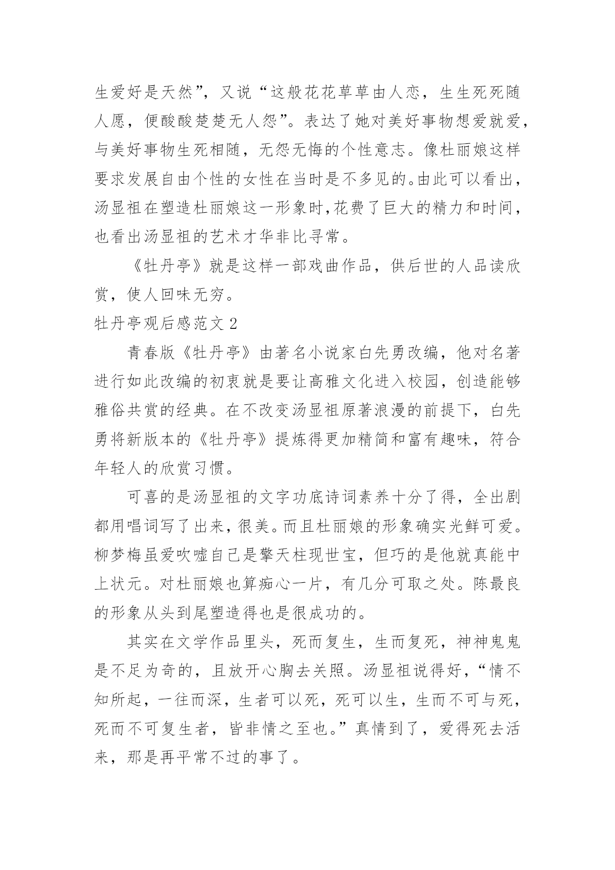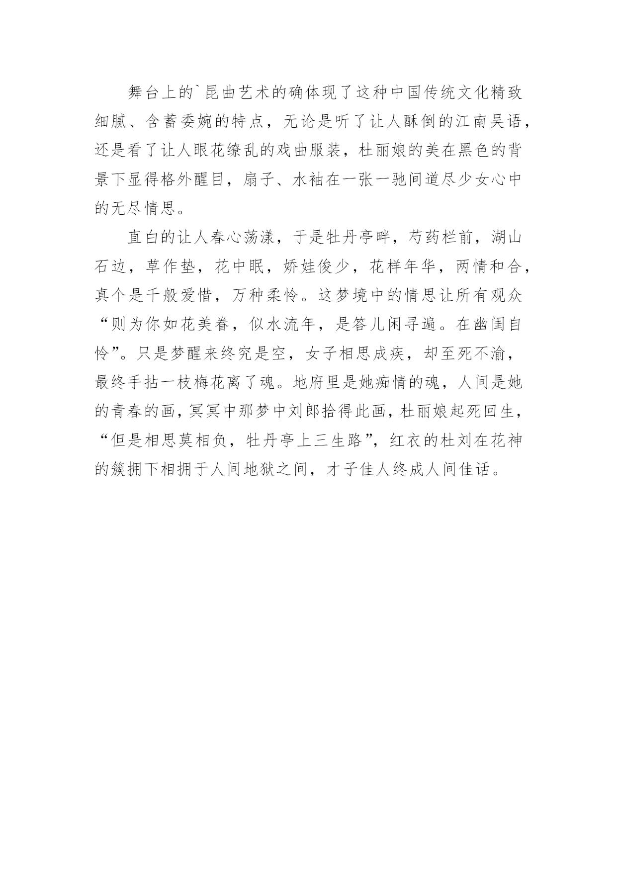 牡丹亭观后感牡丹亭观后感范文品味完一部作品后,从中我们收获新的思想,这时候最关键的观后感不能忘了。为了让您不再为写观后感头疼,下面是小编帮大家整理的牡丹亭观后感范文,欢迎阅读与收藏。牡丹亭观后感范文1中国古代文学名著灿烂辉煌,光是四川大古典名著就值得我们一辈子品读。但是,我们往往忽略了一些杰出的戏曲作品,比如:《牡丹亭》。《牡丹亭》是明代戏曲作家汤显祖的代表作。其实我会注意到这本书,是因为这本书有一个非常好听的名字。我当时猜想这本书上应该描写一个凄美的爱情故事。所以怀着好奇的心情,我借来了这本书,想要一饱眼福。《牡丹亭》的确和我的猜想差不多,它描述的是贫寒书生柳梦梅与太守千金杜丽娘之间的爱情故事。但因故事中杜丽娘忧郁而死,后化为鬼魂与柳梦梅相会。使得《牡丹亭》又笼罩上了一层诡异的色彩。《牡丹亭》是我国一部充满积极浪漫主义的伟大杰作。它所表现的`是青年男女对自由爱情生活的追求,要求个性解放。这在当时的那个年代,是前所未有的,也因此显得前卫和与众不同。我认为其中描写最成功的人物当数杜丽娘。杜丽娘“一生爱好是天然”,又说“这般花花草草由人恋,生生死死随人愿,便酸酸楚楚无人怨”。表达了她对美好事物想爱就爱,与美好事物生死相随,无怨无悔的个性意志。像杜丽娘这样要求发展自由个性的女性在当时是不多见的。由此可以看出,汤显祖在塑造杜丽娘这一形象时,花费了巨大的精力和时间,也看出汤显祖的艺术才华非比寻常。《牡丹亭》就是这样一部戏曲作品,供后世的人品读欣赏,使人回味无穷。牡丹亭观后感范文2青春版《牡丹亭》由著名小说家白先勇改编,他对名著进行如此改编的初衷就是要让高雅文化进入校园,创造能够雅俗共赏的经典。在不改变汤显祖原著浪漫的前提下,白先勇将新版本的《牡丹亭》提炼得更加精简和富有趣味,符合年轻人的欣赏习惯。可喜的是汤显祖的文字功底诗词素养十分了得,全出剧都用唱词写了出来,很美。而且杜丽娘的形象确实光鲜可爱。柳梦梅虽爱吹嘘自己是擎天柱现世宝,但巧的是他就真能中上状元。对杜丽娘也算痴心一片,有几分可取之处。陈最良的形象从头到尾塑造得也是很成功的。其实在文学作品里头,死而复生,生而复死,神神鬼鬼是不足为奇的,且放开心胸去关照。汤显祖说得好,“情不知所起,一往而深,生者可以死,死可以生,生而不可与死,死而不可复生者,皆非情之至也。”真情到了,爱得死去活来,那是再平常不过的事了。舞台上的`昆曲艺术的确体现了这种中国传统文化精致细腻、含蓄委婉的特点,无论是听了让人酥倒的江南吴语,还是看了让人眼花缭乱的戏曲服装,杜丽娘的美在黑色的背景下显得格外醒目,扇子、水袖在一张一驰间道尽少女心中的无尽情思。直白的让人春心荡漾,于是牡丹亭畔,芍药栏前,湖山石边,草作垫,花中眠,娇娃俊少,花样年华,两情和合,真个是千般爱惜,万种柔怜。这梦境中的情思让所有观众“则为你如花美眷,似水流年,是答儿闲寻遍。在幽闺自怜”。只是梦醒来终究是空,女子相思成疾,却至死不渝,最终手拈一枝梅花离了魂。地府里是她痴情的魂,人间是她的青春的画,冥冥中那梦中刘郎拾得此画,杜丽娘起死回生,“但是相思莫相负,牡丹亭上三生路”,红衣的杜刘在花神的簇拥下相拥于人间地狱之间,才子佳人终成人间佳话。