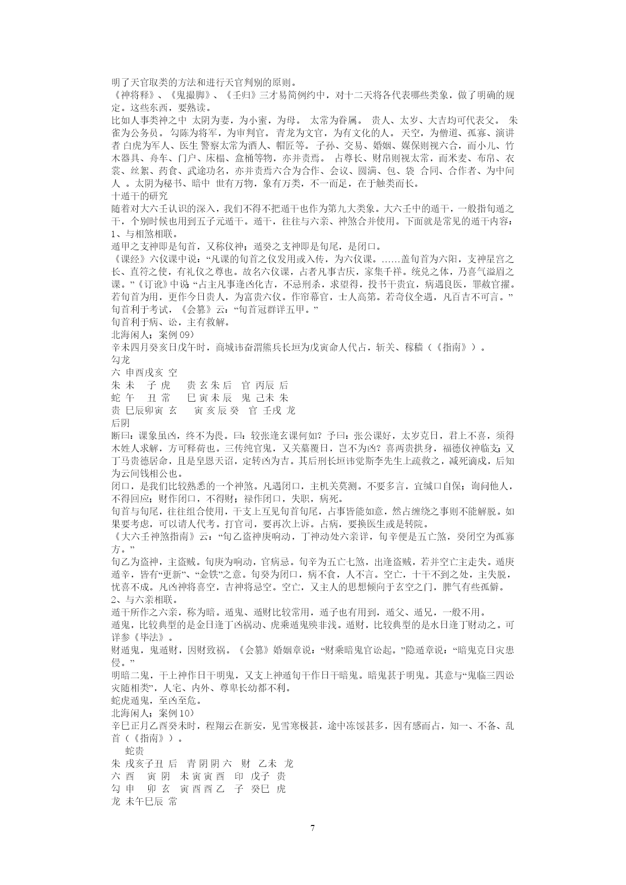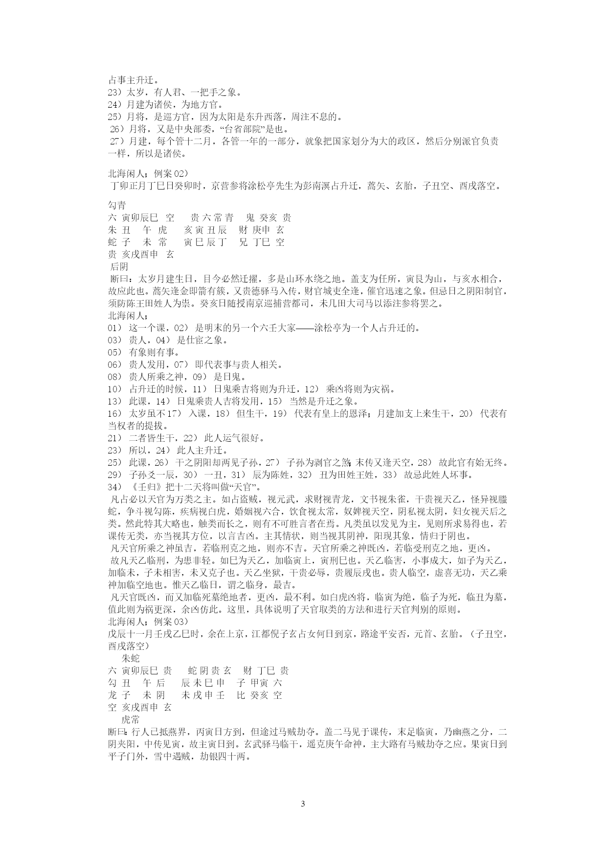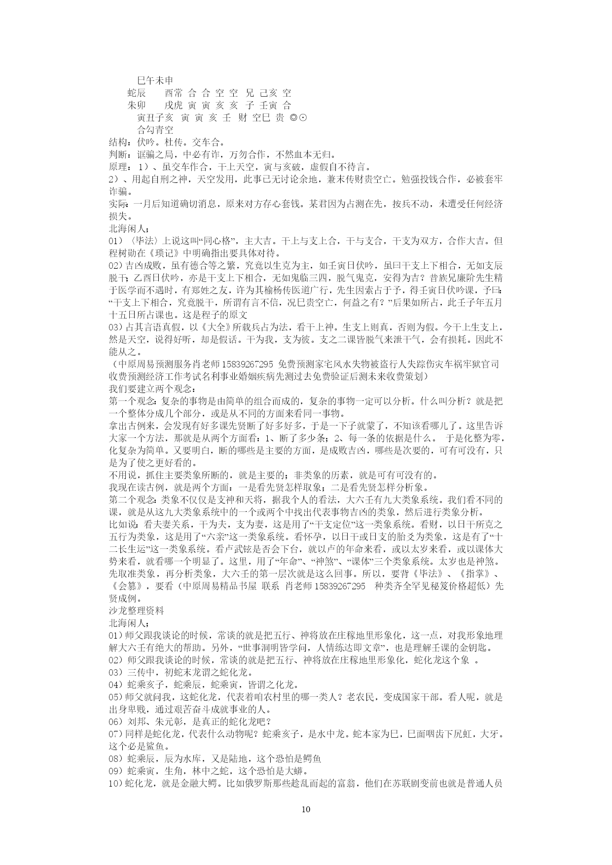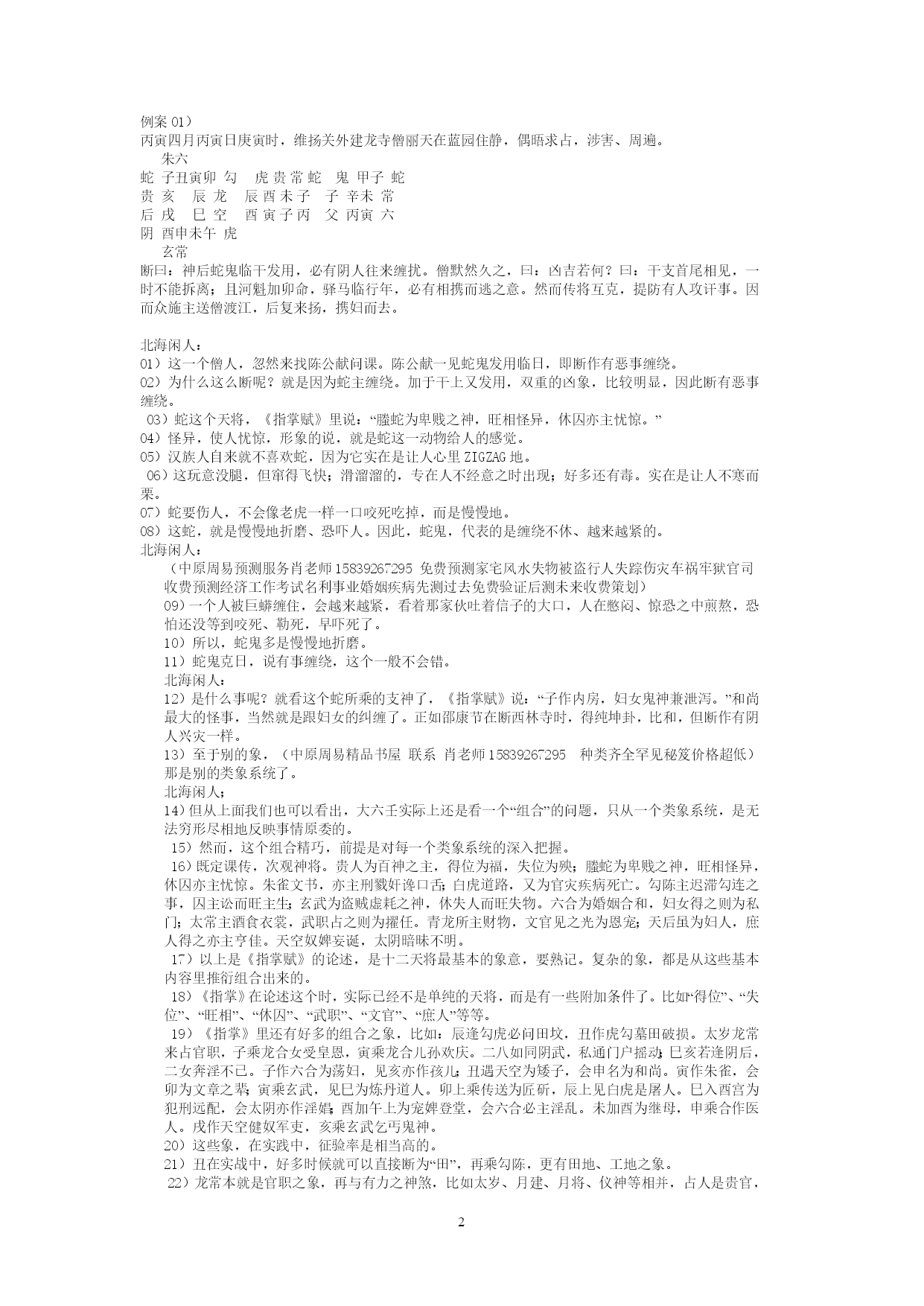 PAGEPAGE65大六壬学习案例整理资料北海闲人例案01)丙寅四月丙寅日庚寅时,维扬关外建龙寺僧丽天在蓝园住静,偶晤求占,涉害、周遍。朱六蛇子丑寅卯勾虎贵常蛇鬼甲子蛇贵亥辰龙辰酉未子子辛未常后戌巳空酉寅子丙父丙寅六阴酉申未午虎玄常断曰:神后蛇鬼临干发用,必有阴人往来缠扰。僧默然久之,曰:凶吉若何?曰:干支首尾相见,一时不能拆离;且河魁加卯命,驿马临行年,必有相携而逃之意。然而传将互克,提防有人攻讦事。因而众施主送僧渡江,后复来扬,携妇而去。北海闲人:01)这一个僧人,忽然来找陈公献问课。陈公献一见蛇鬼发用临日,即断作有恶事缠绕。02)为什么这么断呢?就是因为蛇主缠绕。加于干上又发用,双重的凶象,比较明显,因此断有恶事缠绕。03)蛇这个天将,《指掌赋》里说:“螣蛇为卑贱之神,旺相怪异,休囚亦主忧惊。”04)怪异,使人忧惊,形象的说,就是蛇这一动物给人的感觉。05)汉族人自来就不喜欢蛇,因为它实在是让人心里ZIGZAG地。06)这玩意没腿,但窜得飞快;滑溜溜的,专在人不经意之时出现;好多还有毒。实在是让人不寒而栗。07)蛇要伤人,不会像老虎一样一口咬死吃掉,而是慢慢地。08)这蛇,就是慢慢地折磨、恐吓人。因此,蛇鬼,代表的是缠绕不休、越来越紧的。北海闲人:(中原周易预测服务肖老师15839267295免费预测家宅风水失物被盗行人失踪伤灾车祸牢狱官司收费预测经济工作考试名利事业婚姻疾病先测过去免费验证后测未来收费策划)09)一个人被巨蟒缠住,会越来越紧,看着那家伙吐着信子的大口,人在憋闷、惊恐之中煎熬,恐怕还没等到咬死、勒死,早吓死了。10)所以,蛇鬼多是慢慢地折磨。11)蛇鬼克日,说有事缠绕,这个一般不会错。北海闲人:12)是什么事呢?就看这个蛇所乘的支神了,《指掌赋》说:“子作内房,妇女鬼神兼泄泻。”和尚最大的怪事,当然就是跟妇女的纠缠了。正如邵康节在断西林寺时,得纯坤卦,比和,但断作有阴人兴灾一样。13)至于别的象,(中原周易精品书屋联系肖老师15839267295种类齐全罕见秘笈价格超低)那是别的类象系统了。北海闲人;14)但从上面我们也可以看出,大六壬实际上还是看一个“组合”的问题,只从一个类象系统,是无法穷形尽相地反映事情原委的。15)然而,这个组合精巧,前提是对每一个类象系统的深入把握。16)既定课传,次观神将。贵人为百神之主,得位为福,失位为殃;螣蛇为卑贱之神,旺相怪异,休囚亦主忧惊。朱雀文书,亦主刑戮奸谗口舌;白虎道路,又为官灾疾病死亡。勾陈主迟滞勾连之事,囚主讼而旺主生;玄武为盗贼虚耗之神,休失人而旺失物。六合为婚姻合和,妇女得之则为私门;太常主酒食衣裳,武职占之则为擢任。青龙所主财物,文官见之光为恩宠;天后虽为妇人,庶人得之亦主亨佳。天空奴婢妄诞,太阴暗昧不明。17)以上是《指掌赋》的论述,是十二天将最基本的象意,要熟记。复杂的象,都是从这些基本内容里推衍组合出来的。18)《指掌》在论述这个时,实际已经不是单纯的天将,而是有一些附加条件了。比如“得位”、“失位”、“旺相”、“休囚”、“武职”、“文官”、“庶人”等等。19)《指掌》里还有好多的组合之象,比如:辰逢勾虎必问田坟,丑作虎勾墓田破损。太岁龙常来占官职,子乘龙合女受皇恩,寅乘龙合儿孙欢庆。二八如同阴武,私通门户摇动;巳亥若逢阴后,二女奔淫不已。子作六合为荡妇,见亥亦作孩儿;丑遇天空为矮子,会申名为和尚。寅作朱雀,会卯为文章之辈;寅乘玄武,见巳为炼丹道人。卯上乘传送为匠斫,辰上见白虎是屠人。巳入酉宫为犯刑远配,会太阴亦作淫娼;酉加午上为宠婢登堂,会六合必主淫乱。未加酉为继母,申乘合作医人。戌作天空健奴军吏,亥乘玄武乞丐鬼神。20)这些象,在实践中,征验率是相当高的。21)丑在实战中,好多时候就可以直接断为“田”,再乘勾陈,更有田地、工地之象。22)龙常本就是官职之象,再与有力之神煞,比如太岁、月建、月将、仪神等相并,占人是贵官,占事主升迁。23)太岁,有人君、一把手之象。24)月建为诸侯,为地方官。25)月将,是巡方官,因为太阳是东升西落,周注不息的。26)月将,又是中央部委,“台省部院”是也。27)月建,每个管十二月,各管一年的一部分,就象把国家划分为大的政区,然后分别派官负责一样,所以是诸侯。北海闲人;例案02)丁卯正月丁巳日癸卯时,京营参将涂松亭先生为彭南溟占升迁,蒿矢、玄胎,子丑空、酉戌落空。勾青六寅卯辰巳空贵六常青鬼癸亥贵朱丑午虎亥寅丑辰财庚申玄蛇子未常寅巳辰丁兄丁巳空贵亥戌酉申玄后阴断曰:太岁月建生日,目今必然迁擢,多是山环水绕之地。盖支为任所,寅艮为山,与亥水相合,故应此也。蒿矢逢金即箭有簇,又贵德驿马入传,财官城吏全逢,催官迅速之象。但