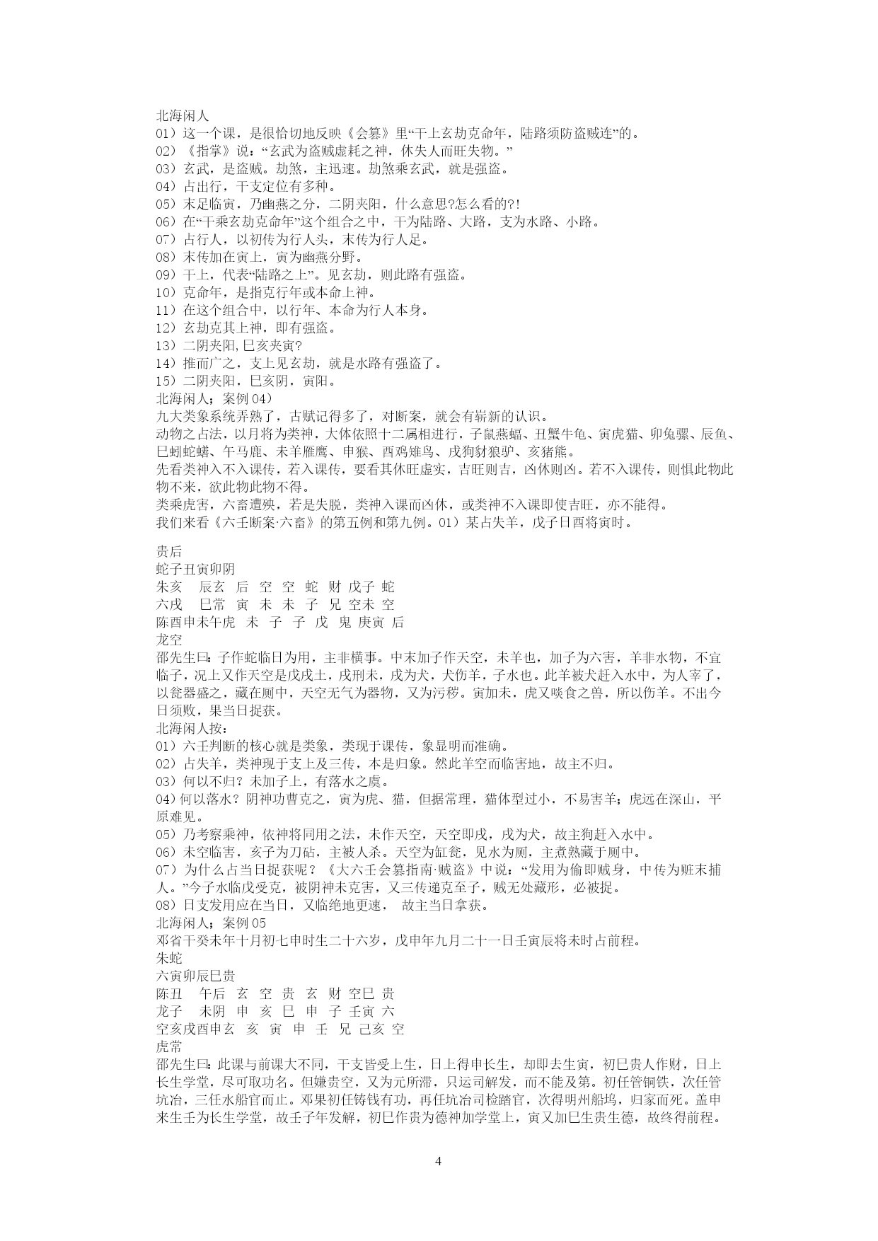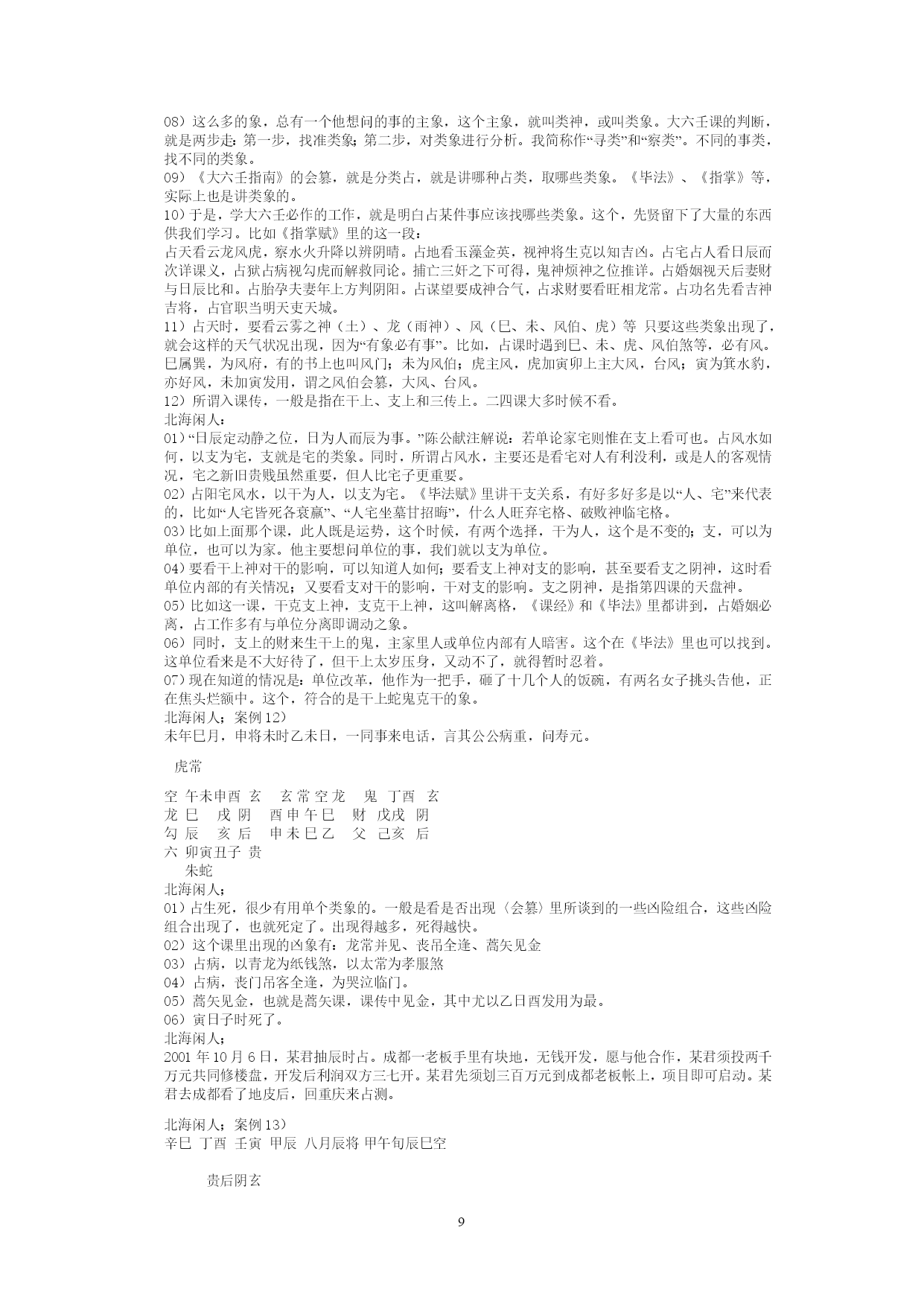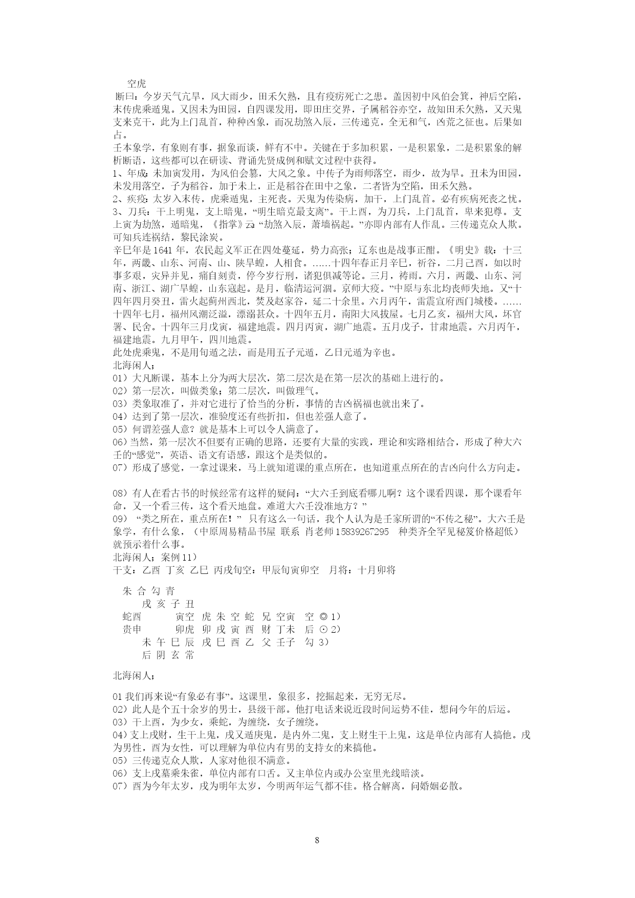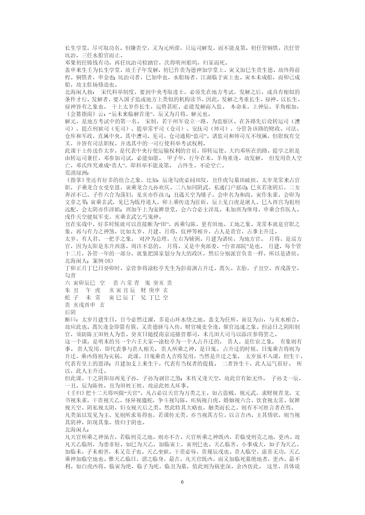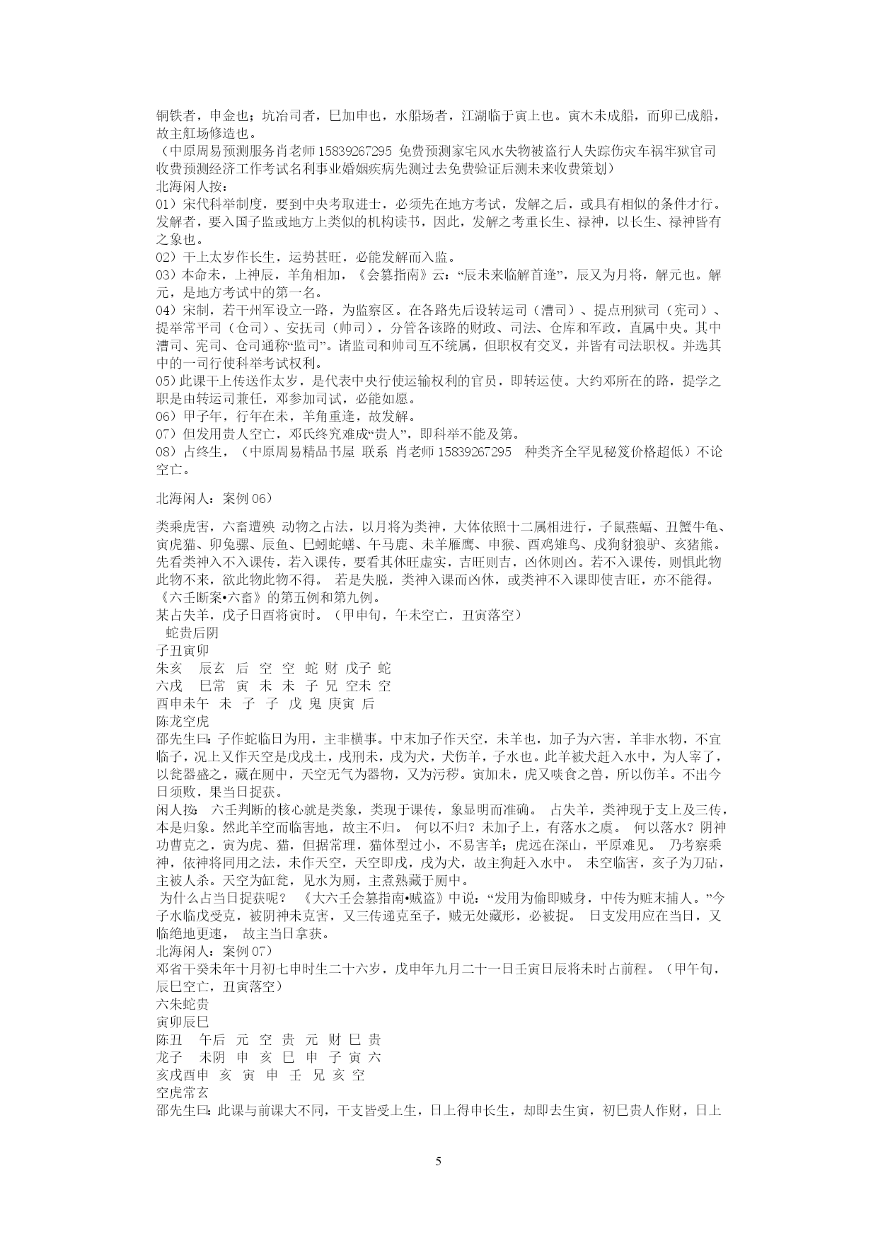 PAGEPAGE65大六壬学习案例整理资料北海闲人例案01)丙寅四月丙寅日庚寅时,维扬关外建龙寺僧丽天在蓝园住静,偶晤求占,涉害、周遍。朱六蛇子丑寅卯勾虎贵常蛇鬼甲子蛇贵亥辰龙辰酉未子子辛未常后戌巳空酉寅子丙父丙寅六阴酉申未午虎玄常断曰:神后蛇鬼临干发用,必有阴人往来缠扰。僧默然久之,曰:凶吉若何?曰:干支首尾相见,一时不能拆离;且河魁加卯命,驿马临行年,必有相携而逃之意。然而传将互克,提防有人攻讦事。因而众施主送僧渡江,后复来扬,携妇而去。北海闲人:01)这一个僧人,忽然来找陈公献问课。陈公献一见蛇鬼发用临日,即断作有恶事缠绕。02)为什么这么断呢?就是因为蛇主缠绕。加于干上又发用,双重的凶象,比较明显,因此断有恶事缠绕。03)蛇这个天将,《指掌赋》里说:“螣蛇为卑贱之神,旺相怪异,休囚亦主忧惊。”04)怪异,使人忧惊,形象的说,就是蛇这一动物给人的感觉。05)汉族人自来就不喜欢蛇,因为它实在是让人心里ZIGZAG地。06)这玩意没腿,但窜得飞快;滑溜溜的,专在人不经意之时出现;好多还有毒。实在是让人不寒而栗。07)蛇要伤人,不会像老虎一样一口咬死吃掉,而是慢慢地。08)这蛇,就是慢慢地折磨、恐吓人。因此,蛇鬼,代表的是缠绕不休、越来越紧的。北海闲人:(中原周易预测服务肖老师15839267295免费预测家宅风水失物被盗行人失踪伤灾车祸牢狱官司收费预测经济工作考试名利事业婚姻疾病先测过去免费验证后测未来收费策划)09)一个人被巨蟒缠住,会越来越紧,看着那家伙吐着信子的大口,人在憋闷、惊恐之中煎熬,恐怕还没等到咬死、勒死,早吓死了。10)所以,蛇鬼多是慢慢地折磨。11)蛇鬼克日,说有事缠绕,这个一般不会错。北海闲人:12)是什么事呢?就看这个蛇所乘的支神了,《指掌赋》说:“子作内房,妇女鬼神兼泄泻。”和尚最大的怪事,当然就是跟妇女的纠缠了。正如邵康节在断西林寺时,得纯坤卦,比和,但断作有阴人兴灾一样。13)至于别的象,(中原周易精品书屋联系肖老师15839267295种类齐全罕见秘笈价格超低)那是别的类象系统了。北海闲人;14)但从上面我们也可以看出,大六壬实际上还是看一个“组合”的问题,只从一个类象系统,是无法穷形尽相地反映事情原委的。15)然而,这个组合精巧,前提是对每一个类象系统的深入把握。16)既定课传,次观神将。贵人为百神之主,得位为福,失位为殃;螣蛇为卑贱之神,旺相怪异,休囚亦主忧惊。朱雀文书,亦主刑戮奸谗口舌;白虎道路,又为官灾疾病死亡。勾陈主迟滞勾连之事,囚主讼而旺主生;玄武为盗贼虚耗之神,休失人而旺失物。六合为婚姻合和,妇女得之则为私门;太常主酒食衣裳,武职占之则为擢任。青龙所主财物,文官见之光为恩宠;天后虽为妇人,庶人得之亦主亨佳。天空奴婢妄诞,太阴暗昧不明。17)以上是《指掌赋》的论述,是十二天将最基本的象意,要熟记。复杂的象,都是从这些基本内容里推衍组合出来的。18)《指掌》在论述这个时,实际已经不是单纯的天将,而是有一些附加条件了。比如“得位”、“失位”、“旺相”、“休囚”、“武职”、“文官”、“庶人”等等。19)《指掌》里还有好多的组合之象,比如:辰逢勾虎必问田坟,丑作虎勾墓田破损。太岁龙常来占官职,子乘龙合女受皇恩,寅乘龙合儿孙欢庆。二八如同阴武,私通门户摇动;巳亥若逢阴后,二女奔淫不已。子作六合为荡妇,见亥亦作孩儿;丑遇天空为矮子,会申名为和尚。寅作朱雀,会卯为文章之辈;寅乘玄武,见巳为炼丹道人。卯上乘传送为匠斫,辰上见白虎是屠人。巳入酉宫为犯刑远配,会太阴亦作淫娼;酉加午上为宠婢登堂,会六合必主淫乱。未加酉为继母,申乘合作医人。戌作天空健奴军吏,亥乘玄武乞丐鬼神。20)这些象,在实践中,征验率是相当高的。21)丑在实战中,好多时候就可以直接断为“田”,再乘勾陈,更有田地、工地之象。22)龙常本就是官职之象,再与有力之神煞,比如太岁、月建、月将、仪神等相并,占人是贵官,占事主升迁。23)太岁,有人君、一把手之象。24)月建为诸侯,为地方官。25)月将,是巡方官,因为太阳是东升西落,周注不息的。26)月将,又是中央部委,“台省部院”是也。27)月建,每个管十二月,各管一年的一部分,就象把国家划分为大的政区,然后分别派官负责一样,所以是诸侯。北海闲人;例案02)丁卯正月丁巳日癸卯时,京营参将涂松亭先生为彭南溟占升迁,蒿矢、玄胎,子丑空、酉戌落空。勾青六寅卯辰巳空贵六常青鬼癸亥贵朱丑午虎亥寅丑辰财庚申玄蛇子未常寅巳辰丁兄丁巳空贵亥戌酉申玄后阴断曰:太岁月建生日,目今必然迁擢,多是山环水绕之地。盖支为任所,寅艮为山,与亥水相合,故应此也。蒿矢逢金即箭有簇,又贵德驿马入传,财官城吏全逢,催官迅速之象。但