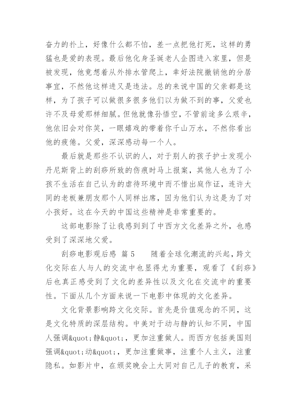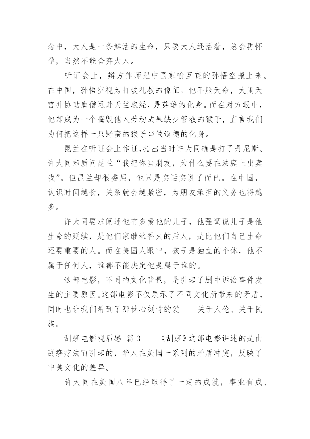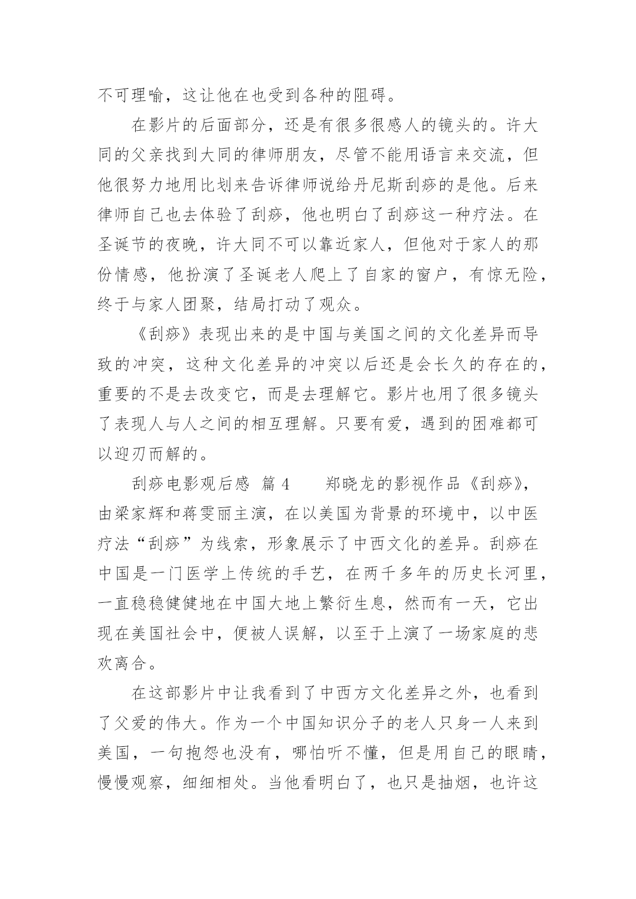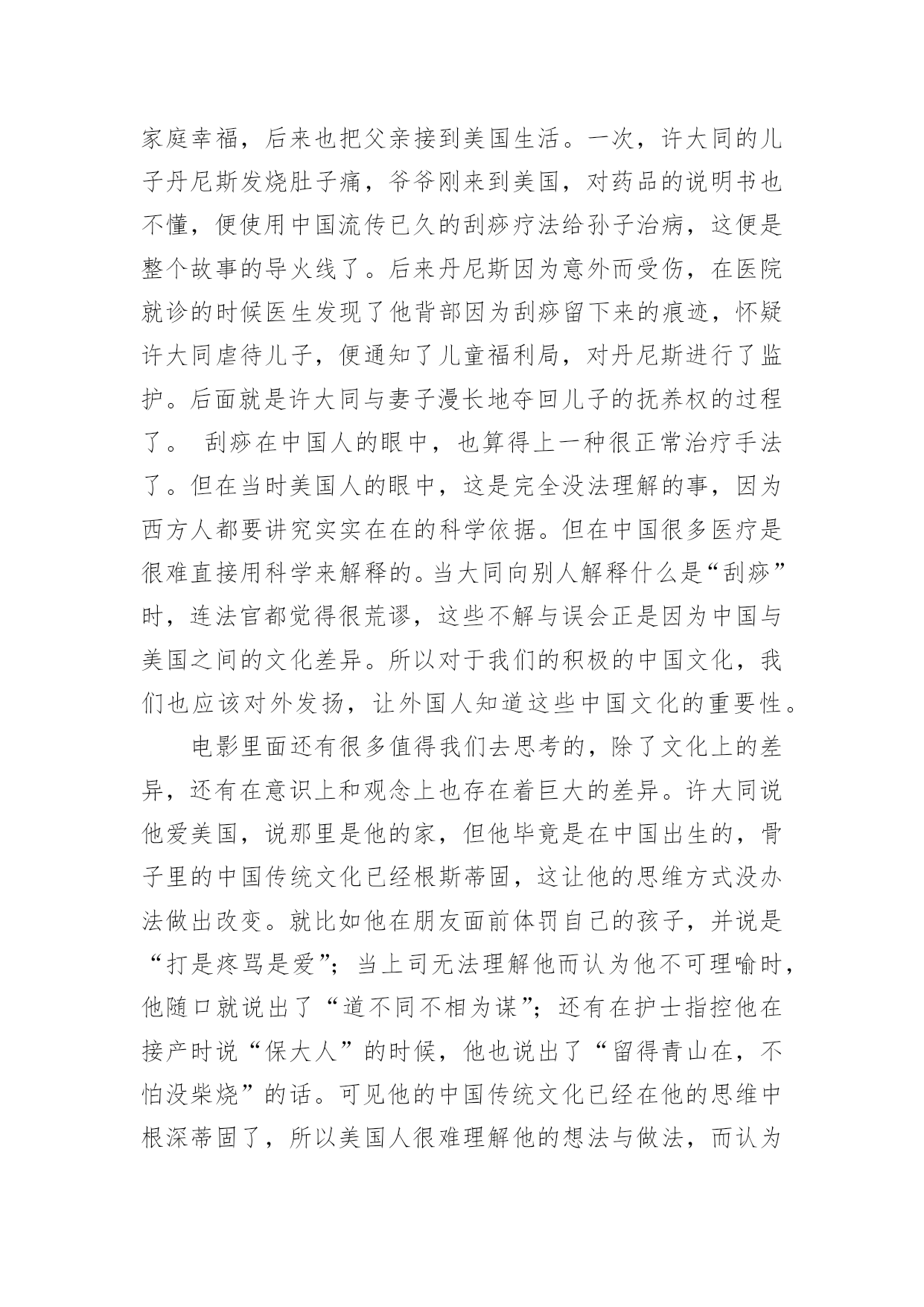 刮痧电影观后感刮痧电影观后感(通用9篇)看完一部经典作品以后,一定有不少感悟吧,现在就让我们写一篇走心的观后感吧。可能你现在毫无头绪吧,下面是小编整理的刮痧电影观后感,仅供参考,欢迎大家阅读。刮痧电影观后感篇1在经济正逐渐走向全球化的今天,各国间的交流越来越密切,不同领域间的文化也在不断的碰撞融合。然而在不同的文化背景下,由于对来自不同文化领域的人与事的不够了解,总是容易导致许些矛盾的产生。电影《刮痧》就向我们着展示了这样一个由于中西文化差异而引起的一系列事件。这部电影给我的感触很深,它告诉了我们在出国热流行起来后,中西方文化的交流越来越频繁。然而由于双方文化的差异发生了些不和谐的碰撞,产生了很多矛盾。电影里的故事发生在21世纪初的美国,这是个正处在很多中国年轻人想要出国寻梦的年代。然而由于中西方文化的差异,很多在海外的中国人与西方社会产生了矛盾。电影中的中国老人按照中国流传了几千年的治疗古法“刮痧”给孙子治病,这在我们中国人眼里这是十分正常的。然而在美国人眼里,这项让我们中国人骄傲的祖宗智慧“刮痧”却成了中国家长虐待儿童的证据。在我们中国,家喻户晓的神话人物孙悟空是正义、勇敢与睿智的代表性人物。在《西游记》中他一路斩妖除魔,所向披靡,深受广大中国儿童的喜爱。然而在美国,很多美国人却把孙悟空说成是邪恶的化身、暴力血腥的恶魔。或许很多中国人在看到这段电影时会义愤填膺,骂电影中的律师无知,侮辱我们的中华文化。但我想说,这本无关对错。电影中的律师在他所处的西方美国文化背景下用他美式的思想对他不了解的中国文化做了“全新”的解释,而主人公则坚持自己的文化立场,对这番言论发出了一句“道不同,不相为谋”的怒吼。这都是由于双方文化差异以及对对方文化的不了解及理解导致的。就像老人在离开美国时说的那样,他不明白就刮痧这一件小事怎么就惹出这么多事,本来是想给孙子治病的,没想到给孩子添了这么多的麻烦。但不管在中国还是在美国,人们都一样重视和爱护孩子,这份爱是无国界的,只是方式不同罢了。在当今社会,由文明化的差异导致的矛盾是数不胜数,但我们所关心的是如何才能避免或化解这些矛盾。文化具有一定的包容性。在新文化运动时,大批的知识分子大力主张引进西学,文化的碰撞不可避免;当时的北大校长蔡元培先生就主张“囊括大典,包罗众家;思想自由,兼容并包”。对待外来文化,我们先不要过分的去抨击它,我们应持一种宽容的心态,去了解它,然后再取其精华,弃其糟粕,使之促进我们文化的发展。在经济全球化的今天,中西方的文化交流越来越频繁。在交流的同时,我们应保护并发展好我们本国的文化,保持好一颗宽容理解的心。在没有了解之前,不要以自身的观点和立场去妄加评论任何一种文化。刮痧电影观后感篇2每个人,每个民族,每个国家都有属于自己的文化,文化与文化间的迥然差异必然会带来个人行为思想的不同。中国文化的核心是至情至性,而西方文化更讲求理性的梳理。这就好像一个性情中人与理性至上的人之间发生碰撞,在各自的思维方式主导之下展开一场拉锯战。影片《刮痧》中以游戏设计师许大同的故事为线索展现了中西文化的巨大差异。主人公儿子丹尼斯发烧肚子疼,刚来美国的爷爷因为不懂药瓶上的英文而采用中国几千年传统的“刮痧”给孙子治病。儿子因为意外摔伤后在医院被医护人员看见背部的痧印而指被虐待进而强制留在福利院。丹尼斯因为打游戏而与许大同上司昆兰的儿子打架,许大同知道后勒令丹尼斯道歉,在丹尼斯拒绝后打了孩子一巴掌。这在我们看来一个非常平常教育孩子的举动在美国人眼中却是伤害孩子的证据。以许大同为代表的中国人则认为孩子必须在家长的指导下知道哪些事该做哪些事不该做,并以“打是亲,骂是爱”来说明打孩子是爱的一种体现。但在以昆兰为原型的美国人眼中,家长与孩子是平等的,家长并不能为孩子决定一切。在听证会上,一位帮许大同妻子简宁接生的护士则指出在孩子出生时,因为早产使得母亲与孩子非常危险。她得知许大同坚决保住妻子的答复中认为他根本就不在乎这个孩子,在听证会上大吼出一句:野蛮的东方人。而在我们的观念中,大人是一条鲜活的生命,只要大人还活着,总会再怀孕,当然不能舍弃大人。听证会上,辩方律师把中国家喻互晓的孙悟空搬上来。在中国,孙悟空视为打破礼教的像征。他不服天命,大闹天宫并协助唐僧远赴天竺取经,是英雄的化身。而在对方眼中,他却成为一个捣毁他人劳动成果缺少管教的猴子,直言我们为何把这样一只野蛮的猴子当做道德的化身。昆兰在听证会上作证,指出当时许大同确是打了丹尼斯。许大同却质问昆兰“我把你当朋友,为什么要在法庭上出卖我”。但昆兰却很委屈,他只是实话实说了而已。在中国,认识时间越长,关系就会越紧密,为朋友承担的义务也将越多。许大同要求阐述他有多爱他的儿子,他强调说儿子是他生命的延续,是他们家继承香火的后人,是比他们自己生命还要重要的人。而在美国人
