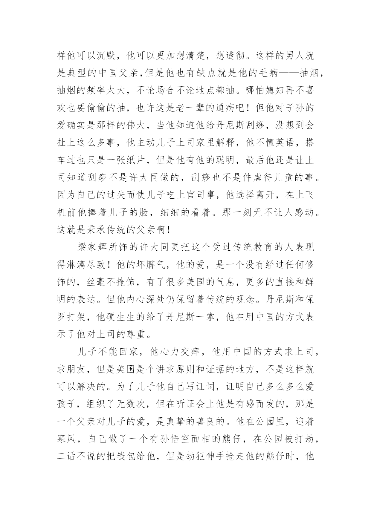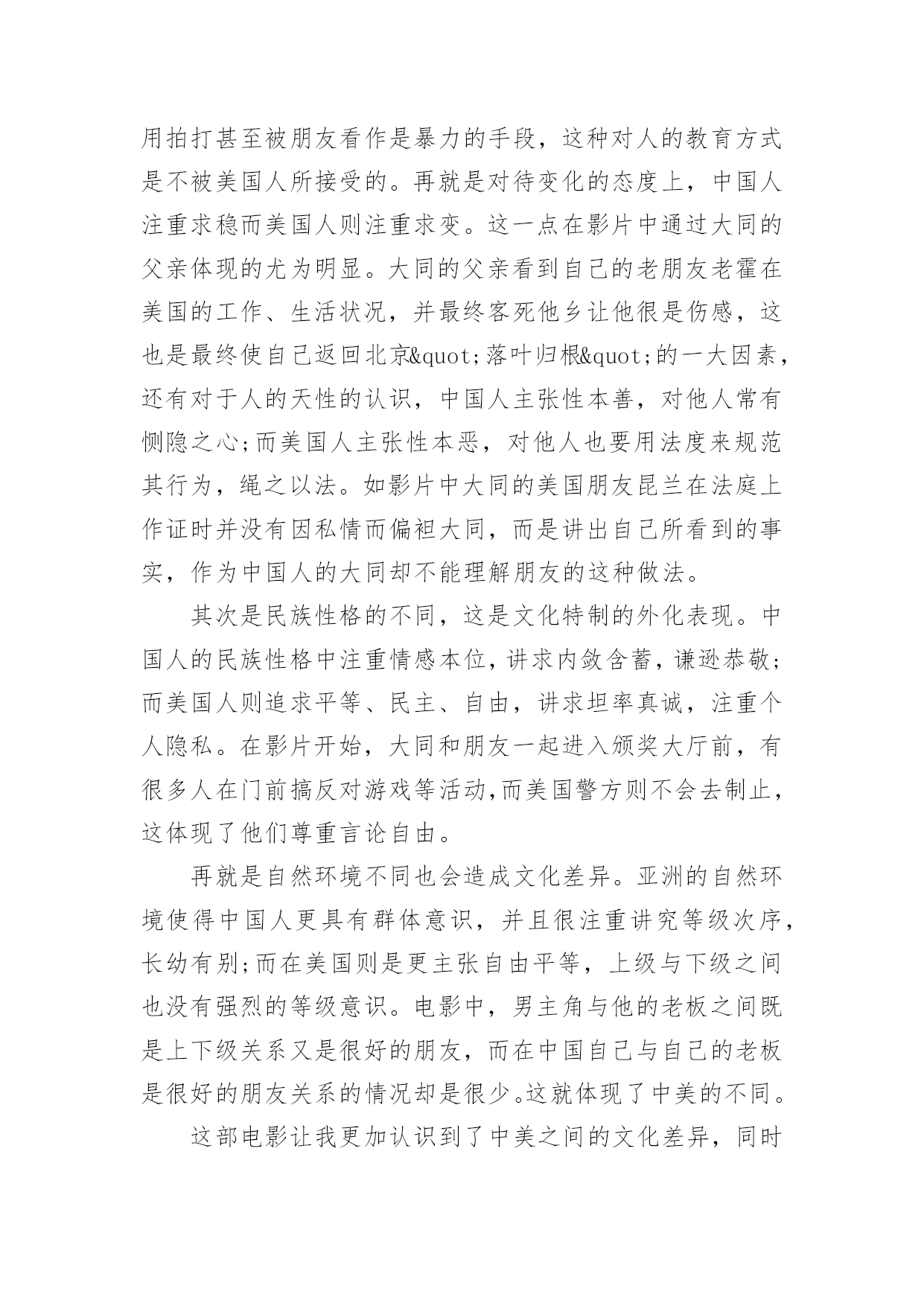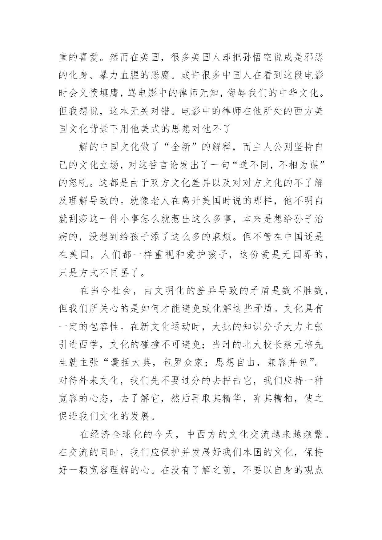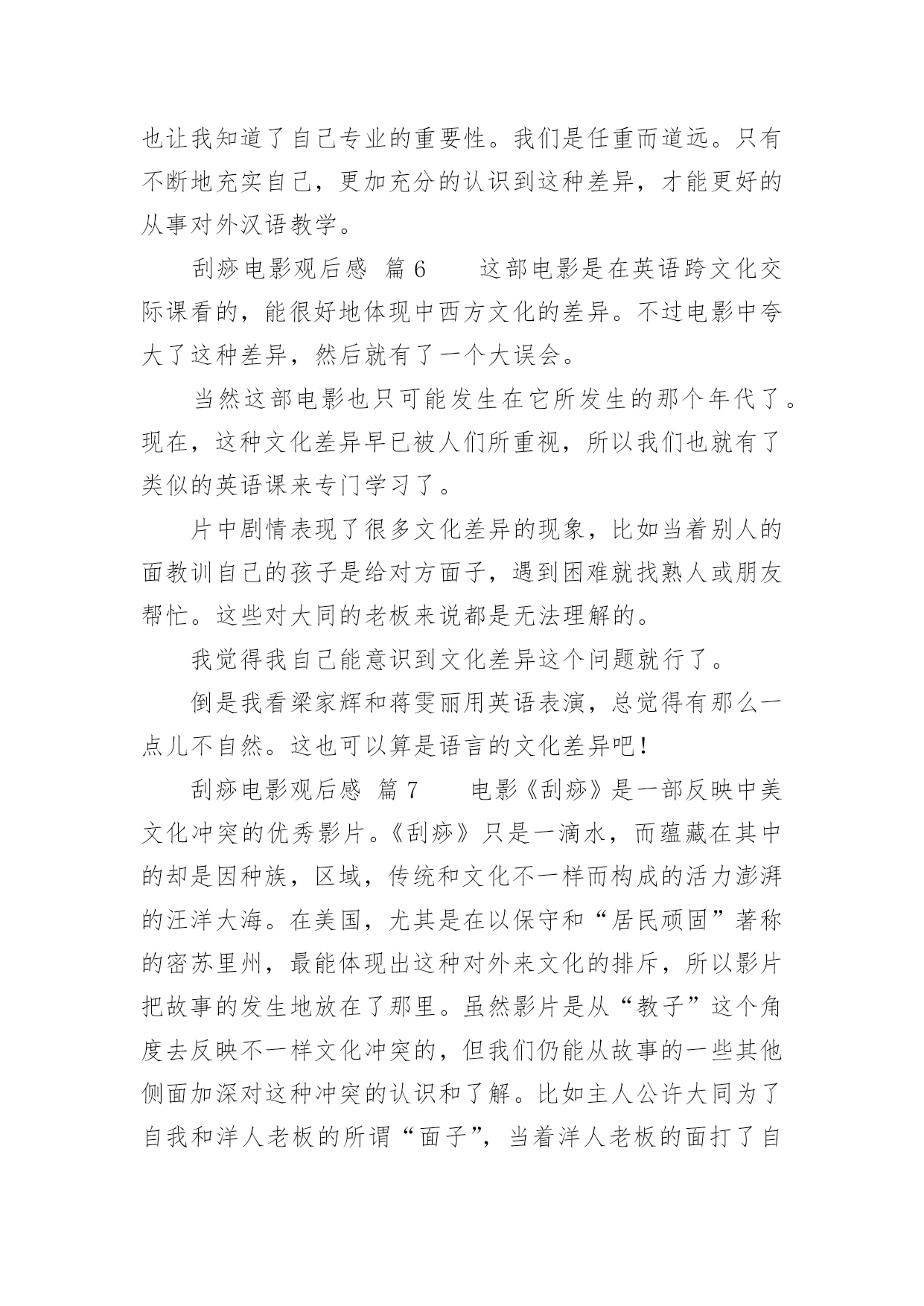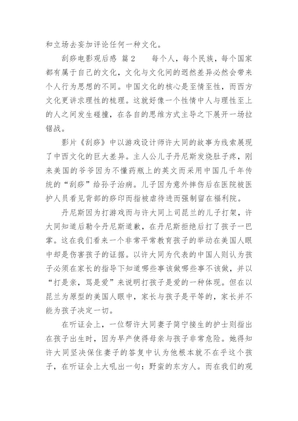 刮痧电影观后感刮痧电影观后感(通用9篇)看完一部经典作品以后,一定有不少感悟吧,现在就让我们写一篇走心的观后感吧。可能你现在毫无头绪吧,下面是小编整理的刮痧电影观后感,仅供参考,欢迎大家阅读。刮痧电影观后感篇1在经济正逐渐走向全球化的今天,各国间的交流越来越密切,不同领域间的文化也在不断的碰撞融合。然而在不同的文化背景下,由于对来自不同文化领域的人与事的不够了解,总是容易导致许些矛盾的产生。电影《刮痧》就向我们着展示了这样一个由于中西文化差异而引起的一系列事件。这部电影给我的感触很深,它告诉了我们在出国热流行起来后,中西方文化的交流越来越频繁。然而由于双方文化的差异发生了些不和谐的碰撞,产生了很多矛盾。电影里的故事发生在21世纪初的美国,这是个正处在很多中国年轻人想要出国寻梦的年代。然而由于中西方文化的差异,很多在海外的中国人与西方社会产生了矛盾。电影中的中国老人按照中国流传了几千年的治疗古法“刮痧”给孙子治病,这在我们中国人眼里这是十分正常的。然而在美国人眼里,这项让我们中国人骄傲的祖宗智慧“刮痧”却成了中国家长虐待儿童的证据。在我们中国,家喻户晓的神话人物孙悟空是正义、勇敢与睿智的代表性人物。在《西游记》中他一路斩妖除魔,所向披靡,深受广大中国儿童的喜爱。然而在美国,很多美国人却把孙悟空说成是邪恶的化身、暴力血腥的恶魔。或许很多中国人在看到这段电影时会义愤填膺,骂电影中的律师无知,侮辱我们的中华文化。但我想说,这本无关对错。电影中的律师在他所处的西方美国文化背景下用他美式的思想对他不了解的中国文化做了“全新”的解释,而主人公则坚持自己的文化立场,对这番言论发出了一句“道不同,不相为谋”的怒吼。这都是由于双方文化差异以及对对方文化的不了解及理解导致的。就像老人在离开美国时说的那样,他不明白就刮痧这一件小事怎么就惹出这么多事,本来是想给孙子治病的,没想到给孩子添了这么多的麻烦。但不管在中国还是在美国,人们都一样重视和爱护孩子,这份爱是无国界的,只是方式不同罢了。在当今社会,由文明化的差异导致的矛盾是数不胜数,但我们所关心的是如何才能避免或化解这些矛盾。文化具有一定的包容性。在新文化运动时,大批的知识分子大力主张引进西学,文化的碰撞不可避免;当时的北大校长蔡元培先生就主张“囊括大典,包罗众家;思想自由,兼容并包”。对待外来文化,我们先不要过分的去抨击它,我们应持一种宽容的心态,去了解它,然后再取其精华,弃其糟粕,使之促进我们文化的发展。在经济全球化的今天,中西方的文化交流越来越频繁。在交流的同时,我们应保护并发展好我们本国的文化,保持好一颗宽容理解的心。在没有了解之前,不要以自身的观点和立场去妄加评论任何一种文化。刮痧电影观后感篇2每个人,每个民族,每个国家都有属于自己的文化,文化与文化间的迥然差异必然会带来个人行为思想的不同。中国文化的核心是至情至性,而西方文化更讲求理性的梳理。这就好像一个性情中人与理性至上的人之间发生碰撞,在各自的思维方式主导之下展开一场拉锯战。影片《刮痧》中以游戏设计师许大同的故事为线索展现了中西文化的巨大差异。主人公儿子丹尼斯发烧肚子疼,刚来美国的爷爷因为不懂药瓶上的英文而采用中国几千年传统的“刮痧”给孙子治病。儿子因为意外摔伤后在医院被医护人员看见背部的痧印而指被虐待进而强制留在福利院。丹尼斯因为打游戏而与许大同上司昆兰的儿子打架,许大同知道后勒令丹尼斯道歉,在丹尼斯拒绝后打了孩子一巴掌。这在我们看来一个非常平常教育孩子的举动在美国人眼中却是伤害孩子的证据。以许大同为代表的中国人则认为孩子必须在家长的指导下知道哪些事该做哪些事不该做,并以“打是亲,骂是爱”来说明打孩子是爱的一种体现。但在以昆兰为原型的美国人眼中,家长与孩子是平等的,家长并不能为孩子决定一切。在听证会上,一位帮许大同妻子简宁接生的护士则指出在孩子出生时,因为早产使得母亲与孩子非常危险。她得知许大同坚决保住妻子的答复中认为他根本就不在乎这个孩子,在听证会上大吼出一句:野蛮的东方人。而在我们的观念中,大人是一条鲜活的生命,只要大人还活着,总会再怀孕,当然不能舍弃大人。听证会上,辩方律师把中国家喻互晓的孙悟空搬上来。在中国,孙悟空视为打破礼教的像征。他不服天命,大闹天宫并协助唐僧远赴天竺取经,是英雄的化身。而在对方眼中,他却成为一个捣毁他人劳动成果缺少管教的猴子,直言我们为何把这样一只野蛮的猴子当做道德的化身。昆兰在听证会上作证,指出当时许大同确是打了丹尼斯。许大同却质问昆兰“我把你当朋友,为什么要在法庭上出卖我”。但昆兰却很委屈,他只是实话实说了而已。在中国,认识时间越长,关系就会越紧密,为朋友承担的义务也将越多。许大同要求阐述他有多爱他的儿子,他强调说儿子是他生命的延续,是他们家继承香火的后人,是比他们自己生命还要重要的人。而在美国人