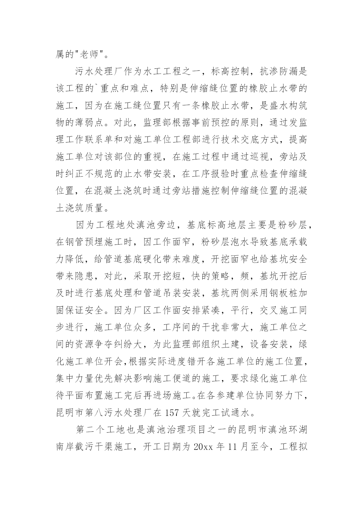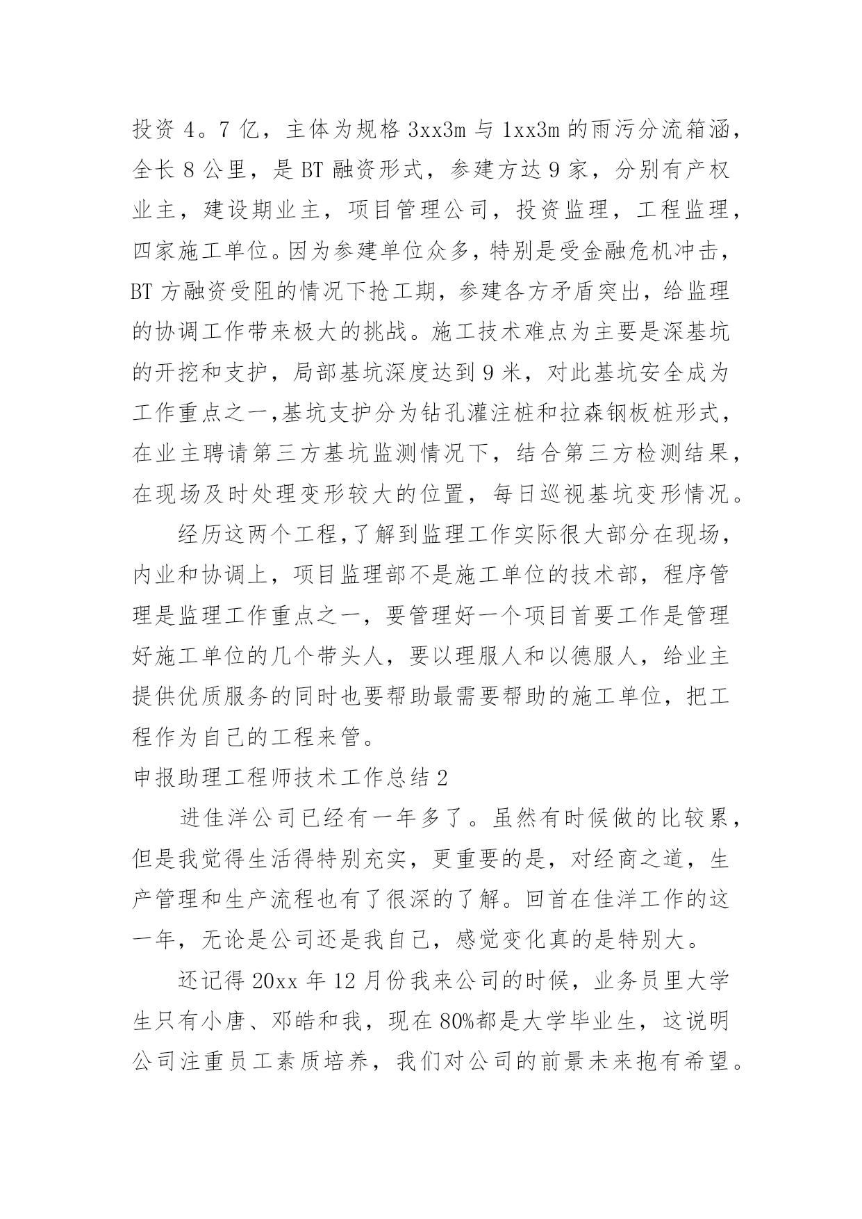 申报助理工程师技术工作总结申报助理工程师技术工作总结11篇总结是事后对某一阶段的学习或工作情况作加以回顾检查并分析评价的书面材料,它是增长才干的一种好办法,快快来写一份总结吧。总结怎么写才能发挥它的作用呢?以下是小编整理的申报助理工程师技术工作总结,欢迎大家借鉴与参考,希望对大家有所帮助。申报助理工程师技术工作总结1时不我待,转眼就毕业一年了,回首过去一年,从找工作到现在要感谢的人很多,有很多收获,也有很多遗憾,"往者不可谏,来者犹可追",对收获还是得感谢那些有声和无声的老师,对遗憾只能在今后的工作中进一步学习,争取做到智明而行无过。下面是在去年一年经历两个工地的一些体会:毕业后第一个工地是昆明市第八污水处理厂,从20xx年7月23日开工到20xx年12月28日通水剪裁,是列入国家五年规划的国家重点项目,滇池治理的工程之一,该工程日处理量10万吨,采用AAO工艺,工程主要包括桩长螺旋钻空灌注桩基础,深4.5~5米基坑开挖,主体土建施工,设备安装,绿化种植,试通车。作为毕业后第一个工程,很幸运能跟一个实战经验丰富,协调能力很强,真心体谅我们下属的"老师"。污水处理厂作为水工工程之一,标高控制,抗渗防漏是该工程的`重点和难点,特别是伸缩缝位置的橡胶止水带的施工,因为在施工缝位置只有一条橡胶止水带,是盛水构筑物的薄弱点。对此,监理部根据事前预控的原则,通过发监理工作联系单和对施工单位工程部进行技术交底方式,提高施工单位对该部位的重视,在施工过程中通过巡视,旁站及时纠正不规范的止水带安装,在工序报验时重点检查伸缩缝位置,在混凝土浇筑时通过旁站措施控制伸缩缝位置的混凝土浇筑质量。因为工程地处滇池旁边,基底标高地层主要是粉砂层,在钢管预埋施工时,因工作面窄,粉砂层泡水导致基底承载力降低,给管道基底硬化带来难度,开挖面窄也给基坑安全带来隐患,对此,采取开挖短,快的策略,频,基坑开挖后及时进行基底处理和管道吊装安装,基坑两侧采用钢板桩加固保证安全。因为厂区工作面安排紧凑,平行,交叉施工同步进行,施工单位众多,工序间的干扰非常大,施工单位之间的资源争夺纠纷大,为此监理部组织土建,设备安装,绿化施工单位开会,根据实际进度错开各施工单位的施工位置,集中力量优先解决影响施工便道的施工,要求绿化施工单位待平面布置施工完后再进场施工。在各参建单位协同努力下,昆明市第八污水处理厂在157天就完工试通水。第二个工地也是滇池治理项目之一的昆明市滇池环湖南岸截污干渠施工,开工日期为20xx年11月至今,工程拟投资4。7亿,主体为规格3xx3m与1xx3m的雨污分流箱涵,全长8公里,是BT融资形式,参建方达9家,分别有产权业主,建设期业主,项目管理公司,投资监理,工程监理,四家施工单位。因为参建单位众多,特别是受金融危机冲击,BT方融资受阻的情况下抢工期,参建各方矛盾突出,给监理的协调工作带来极大的挑战。施工技术难点为主要是深基坑的开挖和支护,局部基坑深度达到9米,对此基坑安全成为工作重点之一,基坑支护分为钻孔灌注桩和拉森钢板桩形式,在业主聘请第三方基坑监测情况下,结合第三方检测结果,在现场及时处理变形较大的位置,每日巡视基坑变形情况。经历这两个工程,了解到监理工作实际很大部分在现场,内业和协调上,项目监理部不是施工单位的技术部,程序管理是监理工作重点之一,要管理好一个项目首要工作是管理好施工单位的几个带头人,要以理服人和以德服人,给业主提供优质服务的同时也要帮助最需要帮助的施工单位,把工程作为自己的工程来管。申报助理工程师技术工作总结2进佳洋公司已经有一年多了。虽然有时候做的比较累,但是我觉得生活得特别充实,更重要的是,对经商之道,生产管理和生产流程也有了很深的了解。回首在佳洋工作的这一年,无论是公司还是我自己,感觉变化真的是特别大。还记得20xx年12月份我来公司的时候,业务员里大学生只有小唐、邓皓和我,现在80%都是大学毕业生,这说明公司注重员工素质培养,我们对公司的前景未来抱有希望。公司的业绩也一直的在上升,从我们负责的区域也可以明显感觉到,原来一个人负责两三个展柜,现在一个人负责一个展柜刚好合适,说明我们的瓷器更换的速度快,销售业绩的增加。5月份,我从一个业务员变成经理助理,这对我来说是一个锻炼,尤其是在工作遇到很多第一次有点担心怕处理不妥当的'时候。第一次主持召开晨会,从不知道说什么,好在大家都特别熟悉,但当经理还是一问,我们三不知的时候,我知道平时需要更加仔细的记录客户订单和客户销售记录折扣情况。所以每天我的本子都记的很多,生怕因为我个人工作疏忽而拖累大家一起挨批;第一次有公司名片,记得印好的时候,姐姐们经常发我的名片,还说:“这是我们助理的名片,有什么事情可以直接找她就行。开始的时候我脸都会红,还有些时候我就站在旁边,土土的装扮,加上心很虚,我