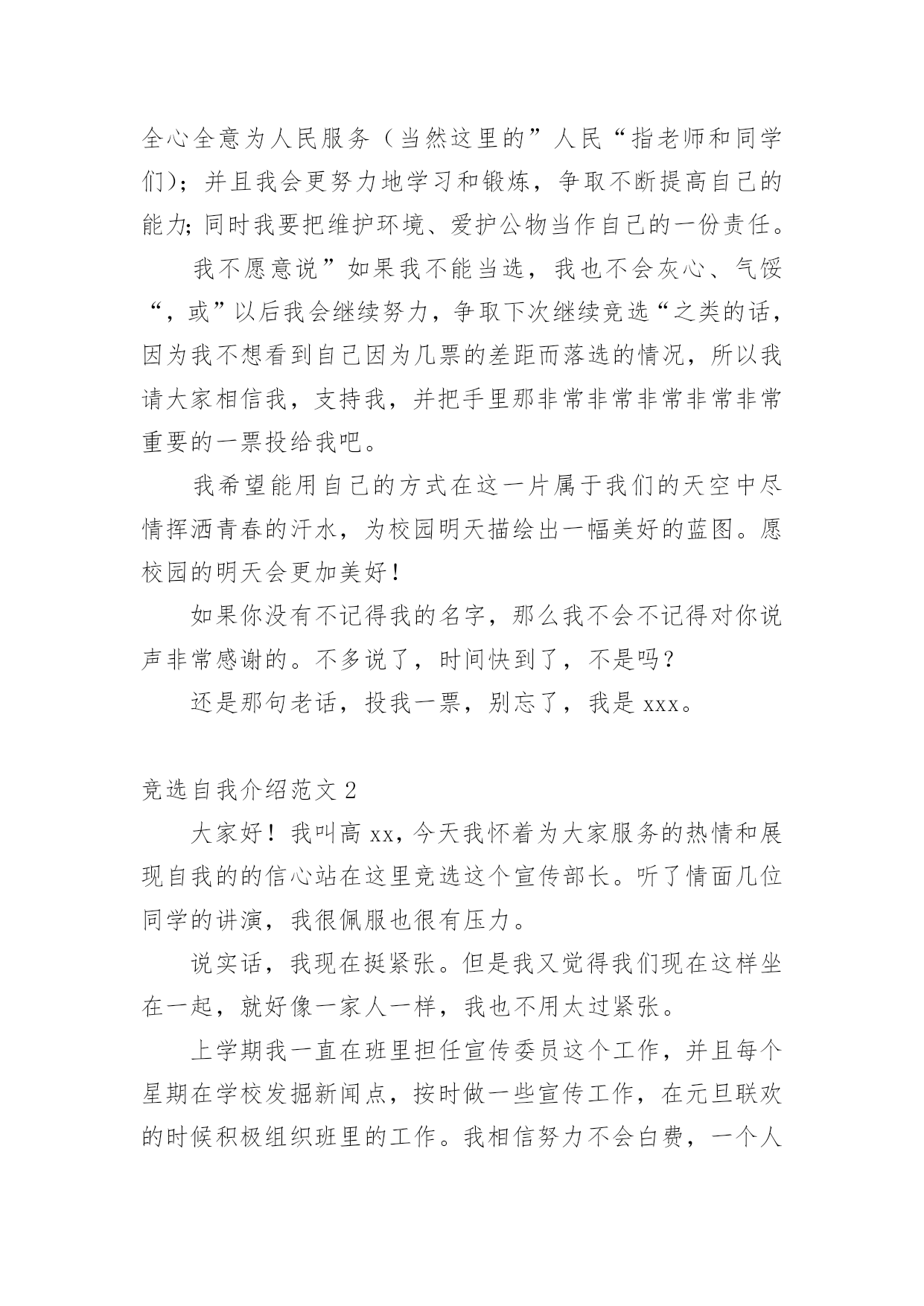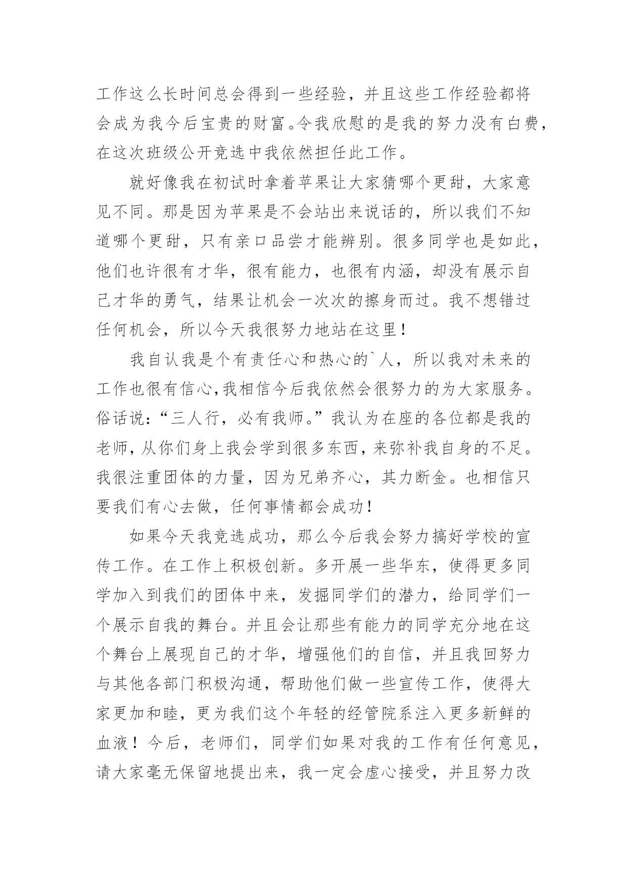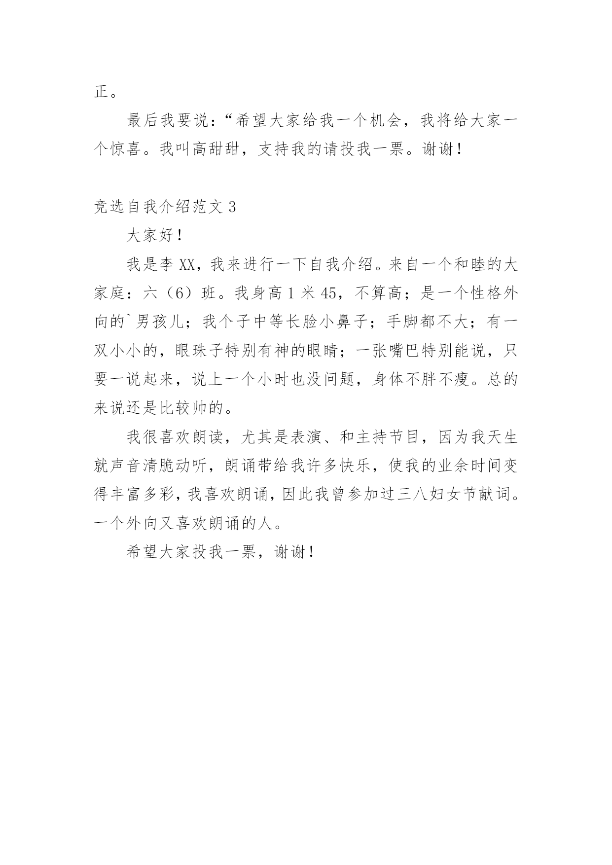 竞选自我介绍竞选自我介绍范文来到一个陌生的地方时,我们就有可能用到自我介绍,通过自我介绍可以得到他人的认识。你所见过的自我介绍是什么样的呢?下面是小编为大家收集的竞选自我介绍范文,仅供参考,欢迎大家阅读。竞选自我介绍范文1亲爱的老师、同学们:你们好!我叫xx,二(1)的。站在这里非常荣幸。我很清楚我的对手实力很强,但我仍然自信。一个人若连自信都没有,他就没资格做什么事了,即使做了,也很难成功!但仅有自信是不够的,还要有能力。小学时,我一直任中队干部,有一定的`组织能力。上中学后,虽然没有加入班委会,但我一直渴望着能有机会为同学们服务,为学校的发展尽一份力量。我对这份工作有着浓厚的兴趣,因为我非常愿意为大家服务,同时我的性格也很适合干这份工作。我外向、善于接受别人的意见,勇于创新。我的爱好广泛,学过声乐获过奖,还有机会参加过演讲比赛、故事大赛、数学竞赛等等,这让我的业余生活丰富多彩,同时也帮助我更好地工作。我不敢奢求一定能竞选成功,但如果我竞选上了,我会全心全意为人民服务(当然这里的”人民“指老师和同学们);并且我会更努力地学习和锻炼,争取不断提高自己的能力;同时我要把维护环境、爱护公物当作自己的一份责任。我不愿意说”如果我不能当选,我也不会灰心、气馁“,或”以后我会继续努力,争取下次继续竞选“之类的话,因为我不想看到自己因为几票的差距而落选的情况,所以我请大家相信我,支持我,并把手里那非常非常非常非常非常重要的一票投给我吧。我希望能用自己的方式在这一片属于我们的天空中尽情挥洒青春的汗水,为校园明天描绘出一幅美好的蓝图。愿校园的明天会更加美好!如果你没有不记得我的名字,那么我不会不记得对你说声非常感谢的。不多说了,时间快到了,不是吗?还是那句老话,投我一票,别忘了,我是xxx。竞选自我介绍范文2大家好!我叫高xx,今天我怀着为大家服务的热情和展现自我的的信心站在这里竞选这个宣传部长。听了情面几位同学的讲演,我很佩服也很有压力。说实话,我现在挺紧张。但是我又觉得我们现在这样坐在一起,就好像一家人一样,我也不用太过紧张。上学期我一直在班里担任宣传委员这个工作,并且每个星期在学校发掘新闻点,按时做一些宣传工作,在元旦联欢的时候积极组织班里的工作。我相信努力不会白费,一个人工作这么长时间总会得到一些经验,并且这些工作经验都将会成为我今后宝贵的财富。令我欣慰的是我的努力没有白费,在这次班级公开竞选中我依然担任此工作。就好像我在初试时拿着苹果让大家猜哪个更甜,大家意见不同。那是因为苹果是不会站出来说话的,所以我们不知道哪个更甜,只有亲口品尝才能辨别。很多同学也是如此,他们也许很有才华,很有能力,也很有内涵,却没有展示自己才华的勇气,结果让机会一次次的擦身而过。我不想错过任何机会,所以今天我很努力地站在这里!我自认我是个有责任心和热心的`人,所以我对未来的工作也很有信心,我相信今后我依然会很努力的为大家服务。俗话说:“三人行,必有我师。”我认为在座的各位都是我的老师,从你们身上我会学到很多东西,来弥补我自身的不足。我很注重团体的力量,因为兄弟齐心,其力断金。也相信只要我们有心去做,任何事情都会成功!如果今天我竞选成功,那么今后我会努力搞好学校的宣传工作。在工作上积极创新。多开展一些华东,使得更多同学加入到我们的团体中来,发掘同学们的潜力,给同学们一个展示自我的舞台。并且会让那些有能力的同学充分地在这个舞台上展现自己的才华,增强他们的自信,并且我回努力与其他各部门积极沟通,帮助他们做一些宣传工作,使得大家更加和睦,更为我们这个年轻的经管院系注入更多新鲜的血液!今后,老师们,同学们如果对我的工作有任何意见,请大家毫无保留地提出来,我一定会虚心接受,并且努力改正。最后我要说:“希望大家给我一个机会,我将给大家一个惊喜。我叫高甜甜,支持我的请投我一票。谢谢!竞选自我介绍范文3大家好!我是李XX,我来进行一下自我介绍。来自一个和睦的大家庭:六(6)班。我身高1米45,不算高;是一个性格外向的`男孩儿;我个子中等长脸小鼻子;手脚都不大;有一双小小的,眼珠子特别有神的眼睛;一张嘴巴特别能说,只要一说起来,说上一个小时也没问题,身体不胖不瘦。总的来说还是比较帅的。我很喜欢朗读,尤其是表演、和主持节目,因为我天生就声音清脆动听,朗诵带给我许多快乐,使我的业余时间变得丰富多彩,我喜欢朗诵,因此我曾参加过三八妇女节献词。一个外向又喜欢朗诵的人。希望大家投我一票,谢谢!
