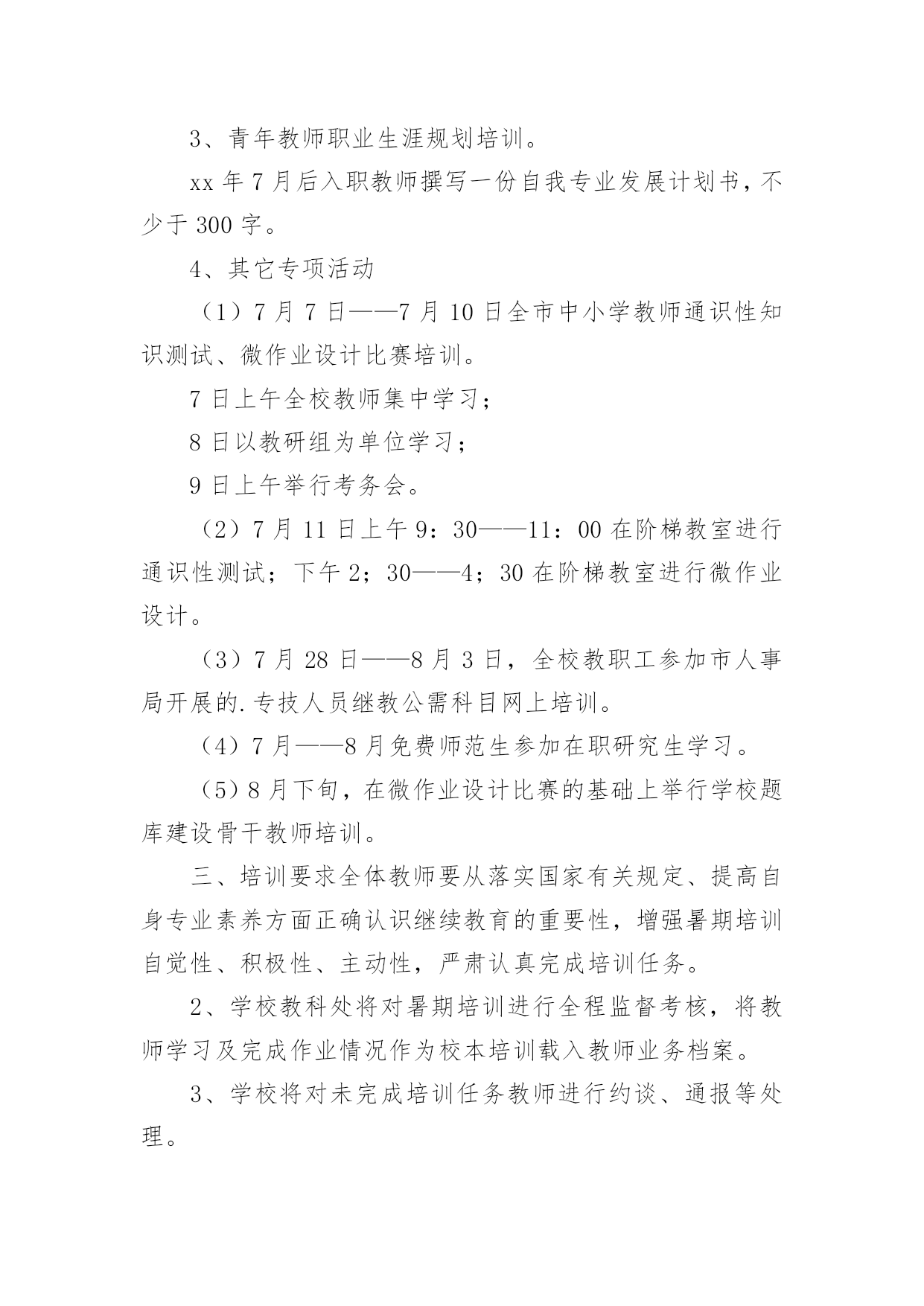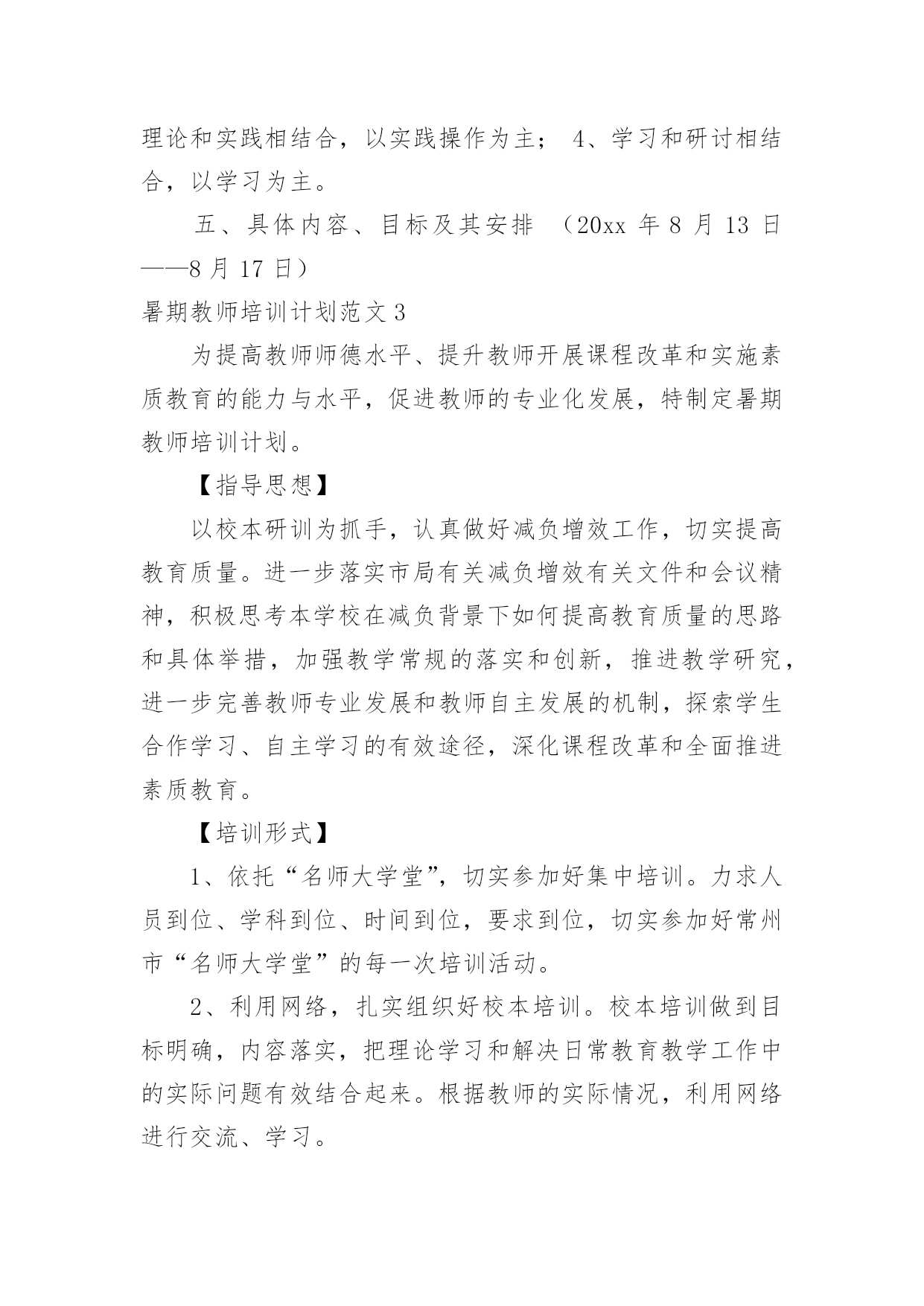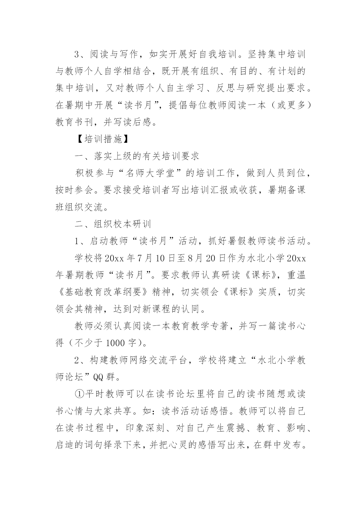 暑期教师培训计划暑期教师培训计划范文暑期教师培训计划范文1为贯彻落实市教育局xx年教师大比武活动的安排及有关教师暑假培训会议的精神,进一步提高广大教师思想和业务素质,提高教师的理论素养和实践能力,建立一支适应新课改需要的师资队伍,结合本校实际,特制定xx一中暑期教师培训计划。一、培训方式集中培训、网络研修与个人自学相结合二、培训内容教师专业培训。(1)7月1日——7月5日信息技术培训高一高二信息管理员培训,内容:学习信息管理规定和操作规程。高一高二教师多媒体、电子白板使用培训。由信息中心承办。(2)高三教师自主研究xx年全国高考试卷,开学后进行学科专业能力测试。2、班主任教育法规培训。8月学习《中小学教师职业道德规范》《中小学班主任工作规定》,并进行网络沙龙研讨(以xx一中教师qq群为平台),每人发言不少于10次。3、青年教师职业生涯规划培训。xx年7月后入职教师撰写一份自我专业发展计划书,不少于300字。4、其它专项活动(1)7月7日——7月10日全市中小学教师通识性知识测试、微作业设计比赛培训。7日上午全校教师集中学习;8日以教研组为单位学习;9日上午举行考务会。(2)7月11日上午9:30——11:00在阶梯教室进行通识性测试;下午2;30——4;30在阶梯教室进行微作业设计。(3)7月28日——8月3日,全校教职工参加市人事局开展的.专技人员继教公需科目网上培训。(4)7月——8月免费师范生参加在职研究生学习。(5)8月下旬,在微作业设计比赛的基础上举行学校题库建设骨干教师培训。三、培训要求全体教师要从落实国家有关规定、提高自身专业素养方面正确认识继续教育的重要性,增强暑期培训自觉性、积极性、主动性,严肃认真完成培训任务。2、学校教科处将对暑期培训进行全程监督考核,将教师学习及完成作业情况作为校本培训载入教师业务档案。3、学校将对未完成培训任务教师进行约谈、通报等处理。暑期教师培训计划范文2一、指导思想幼儿园工作人员的成长与提高和幼儿园的.发展是紧密相联的,金色童年幼儿园坚持三个“留人”稳定队伍:事业是留人的前提、情感是留人的纽带、待遇是留人的条件;坚持“三讲”培养教职工:讲团结是基础、讲奉献(事业第一、工作第一)是关键、讲实效是根本;坚持“三抓”提高教师:锤炼师德抓学习、提高师能抓研讨、优化师技抓培训。构建学习型、研究型组织,是金色童年幼儿园发展的基石。二、培训目标1、规范幼儿园各项工作,建立稳定、协调、有活力的保教工作秩序;2、构建特色园本课程,提高实施课程的效果和效率,切实提高保教质量;3、构建学习型组织,提高保教人员整体素质,为幼儿园可持续发展打下坚实基础;4、树立幼儿园形象,提高幼儿园的知名度和美誉度。三、培训对象1、幼儿园管理人员;2、全体教学老师;四、培训形式和方法1、互动式和讲授相结合,以互动式为主;2、集体培训和个人自学相结合,以集体培训为主;3、理论和实践相结合,以实践操作为主;4、学习和研讨相结合,以学习为主。五、具体内容、目标及其安排(20xx年8月13日——8月17日)暑期教师培训计划范文3为提高教师师德水平、提升教师开展课程改革和实施素质教育的能力与水平,促进教师的专业化发展,特制定暑期教师培训计划。【指导思想】以校本研训为抓手,认真做好减负增效工作,切实提高教育质量。进一步落实市局有关减负增效有关文件和会议精神,积极思考本学校在减负背景下如何提高教育质量的思路和具体举措,加强教学常规的落实和创新,推进教学研究,进一步完善教师专业发展和教师自主发展的机制,探索学生合作学习、自主学习的有效途径,深化课程改革和全面推进素质教育。【培训形式】1、依托“名师大学堂”,切实参加好集中培训。力求人员到位、学科到位、时间到位,要求到位,切实参加好常州市“名师大学堂”的每一次培训活动。2、利用网络,扎实组织好校本培训。校本培训做到目标明确,内容落实,把理论学习和解决日常教育教学工作中的实际问题有效结合起来。根据教师的实际情况,利用网络进行交流、学习。3、阅读与写作,如实开展好自我培训。坚持集中培训与教师个人自学相结合,既开展有组织、有目的、有计划的集中培训,又对教师个人自主学习、反思与研究提出要求。在暑期中开展“读书月”,提倡每位教师阅读一本(或更多)教育书刊,并写读后感。【培训措施】一、落实上级的有关培训要求积极参与“名师大学堂”的培训工作,做到人员到位,按时参会。要求接受培训者写出培训汇报或收获,暑期备课班组织交流。二、组织校本研训1、启动教师“读书月”活动,抓好暑假教师读书活动。学校将20xx年7月10日至8月20日作为水北小学20xx年暑期教师“读书月”。要求教师认真研读《课标》,重温《基础教育改革纲要》精神,切实领会《课标》实质,切实领会其精神,达到对新课程的认同。教师必须认真阅读一本教育教学