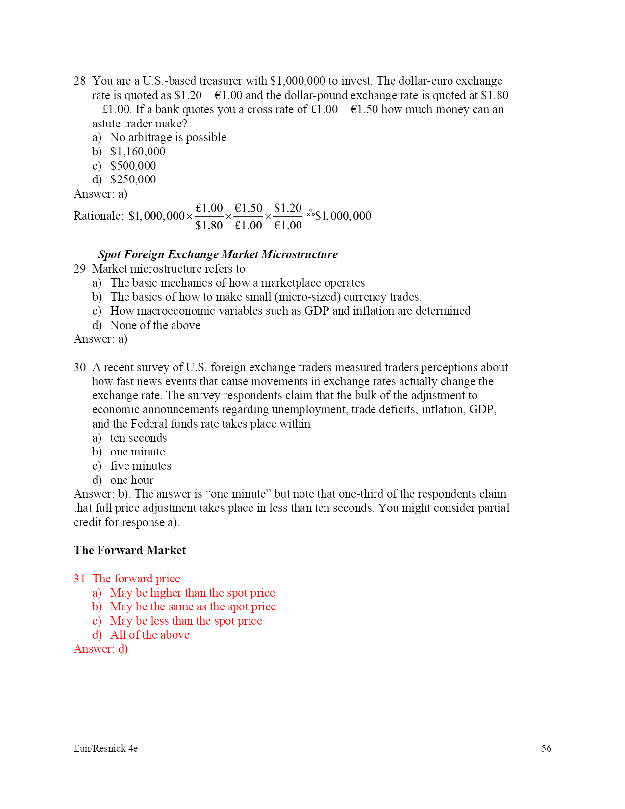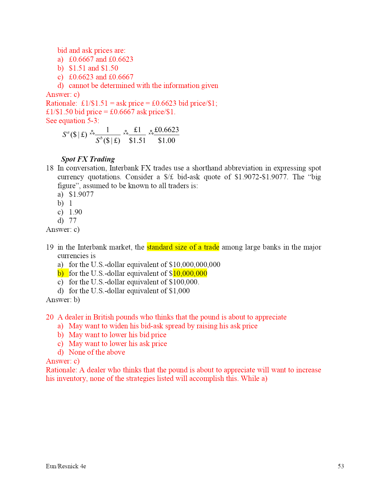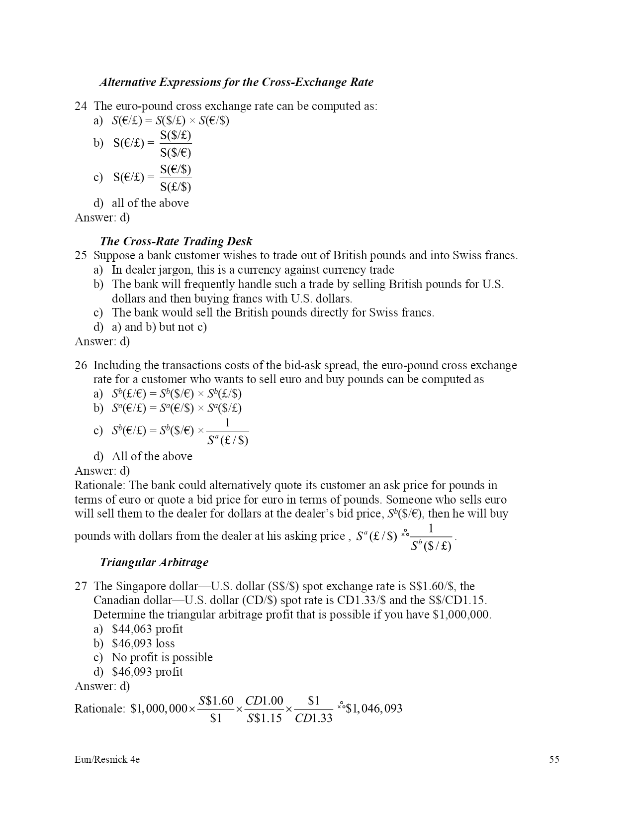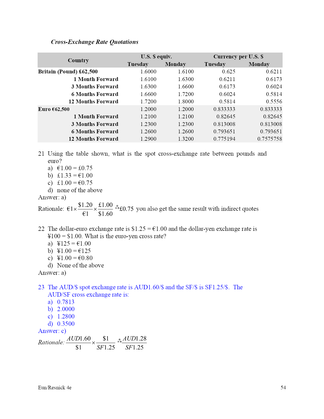 PAGEPAGE61Eun/Resnick4eEun&Resnick4eCHAPTER5TheMarketforForeignExchangeFunctionandStructureoftheFXMarketInternationalFinanceinPractice:TheMouseTakesOvertheFloorFXMarketParticipantsCorrespondentBankingRelationshipsInternationalFinanceinPractice:WhereMoneyTalksVeryLoudlyTheSpotMarketSpotRateQuotationsTheBid-AskSpreadSpotFXTradingCross-ExchangeRateQuotationsAlternativeExpressionsfortheCross-ExchangeRateTheCross-RateTradingDeskTriangularArbitrageSpotForeignExchangeMarketMicrostructureTheForwardMarketForwardRateQuotationsLongandShortForwardPositionsForwardCross-ExchangeRatesSwapTransactionsForwardPremiumSummaryMINICASE:ShrewsburyHerbalProducts,Ltd.FunctionandStructureoftheFXMarketTheworld’slargestforeignexchangetradingcenteris:NewYorkTokyoLondonHongKongAnswer:c)Onaverage,worldwidedailytradingofforeignexchangeisimpossibletoestimate$15billion$504billion$1.88trillionAnswer:d)TheforeignexchangemarketclosesNever4:00p.m.EST(NewYorktime)4:00p.m.GMT(Londontime)4:00p.m.(Tokyotime)Answer:a)FXMarketParticipantsMostforeignexchangetransactionsarefor:InterventionbycentralbanksInterbanktradesbetweeninternationalbanksornonbankdealersretailtradepurchaseofhardcurrenciesAnswer:b)ThedifferencebetweenabrokerandadealerisDealersselldrugs,brokerssellhouses.Brokersbringtogetherbuyersandsellers,butcarrynoinventory.Dealersstandreadytobuyandsellfromtheirinventory.Brokerstransactinstocksandbonds;currencyisboughtandsoldthroughdealers.NoneoftheaboveAnswerb)Rationale:ifsomeonecomplainsabouta)beingcorrect,askthemwhowouldsellacrackhouseoramethlab.MostInterbanktradesareSpeculativeorarbitragetransactionsSimpleorderprocessingfortheretailclientOvernightloansfromonebanktoanotherBrokeredbydealersAnswera)AtthewholesalelevelMosttradingtakesplaceOTCbetweenindividualsontheflooroftheexchangeMosttradingtakesplaceoverthephoneMosttradingflowsoverReutersandEBSplatformsMosttradingflowsthroughspecialized“broking”firmsAnswer:c