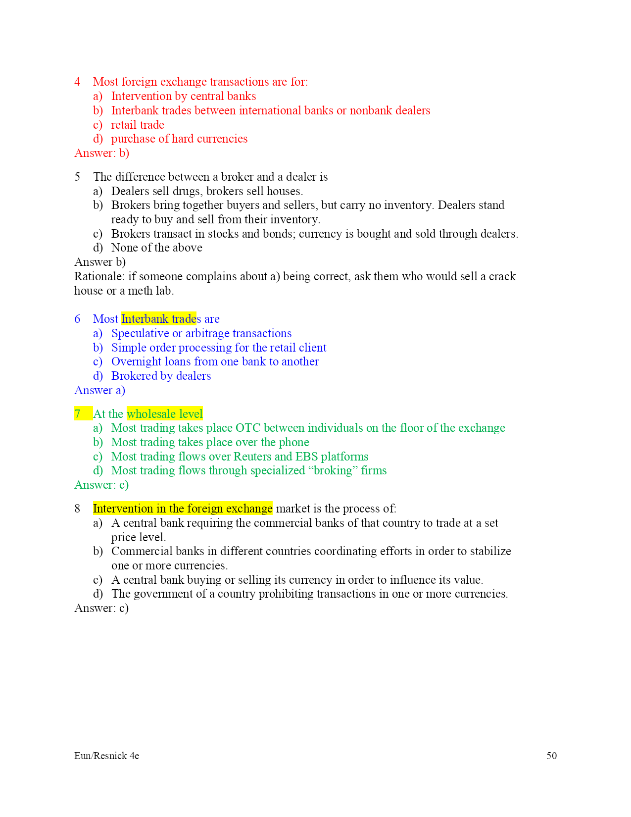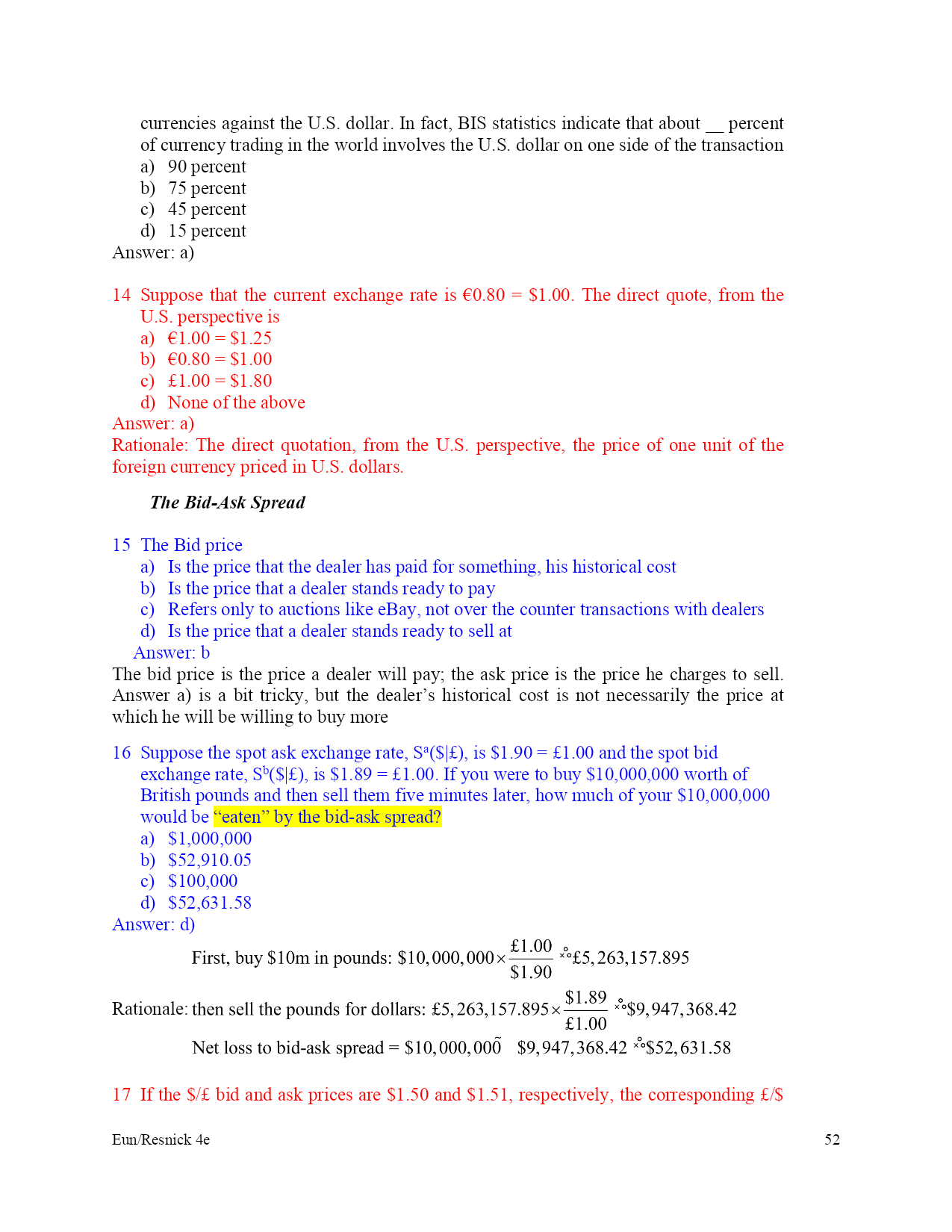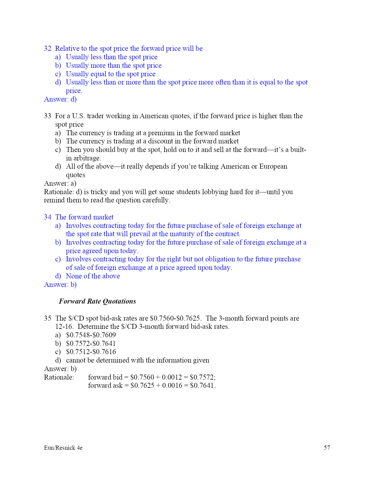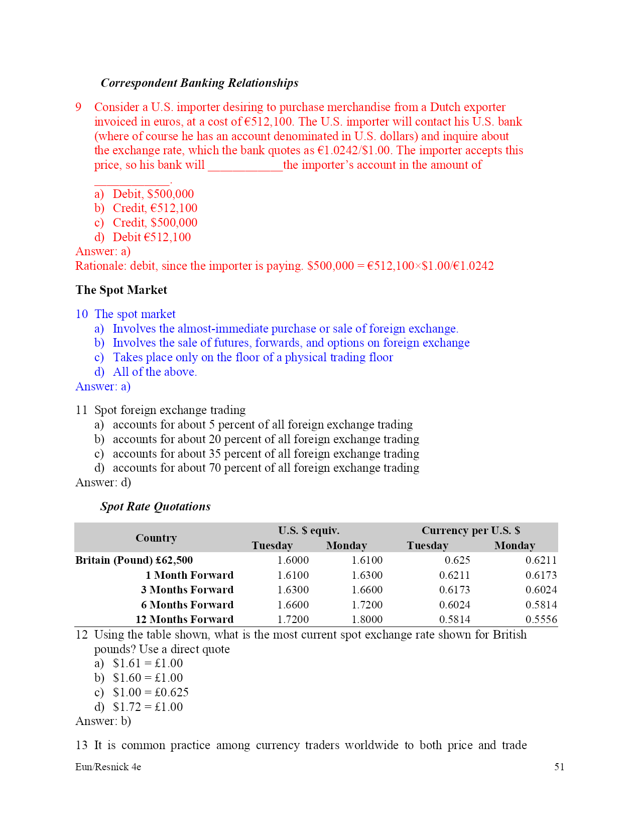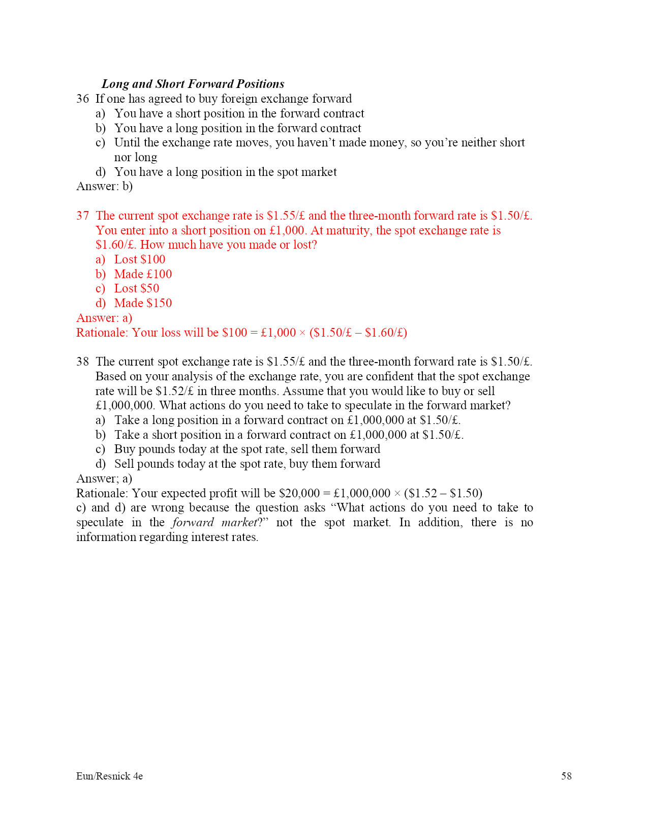 PAGEPAGE61Eun/Resnick4eEun&Resnick4eCHAPTER5TheMarketforForeignExchangeFunctionandStructureoftheFXMarketInternationalFinanceinPractice:TheMouseTakesOvertheFloorFXMarketParticipantsCorrespondentBankingRelationshipsInternationalFinanceinPractice:WhereMoneyTalksVeryLoudlyTheSpotMarketSpotRateQuotationsTheBid-AskSpreadSpotFXTradingCross-ExchangeRateQuotationsAlternativeExpressionsfortheCross-ExchangeRateTheCross-RateTradingDeskTriangularArbitrageSpotForeignExchangeMarketMicrostructureTheForwardMarketForwardRateQuotationsLongandShortForwardPositionsForwardCross-ExchangeRatesSwapTransactionsForwardPremiumSummaryMINICASE:ShrewsburyHerbalProducts,Ltd.FunctionandStructureoftheFXMarketTheworld’slargestforeignexchangetradingcenteris:NewYorkTokyoLondonHongKongAnswer:c)Onaverage,worldwidedailytradingofforeignexchangeisimpossibletoestimate$15billion$504billion$1.88trillionAnswer:d)TheforeignexchangemarketclosesNever4:00p.m.EST(NewYorktime)4:00p.m.GMT(Londontime)4:00p.m.(Tokyotime)Answer:a)FXMarketParticipantsMostforeignexchangetransactionsarefor:InterventionbycentralbanksInterbanktradesbetweeninternationalbanksornonbankdealersretailtradepurchaseofhardcurrenciesAnswer:b)ThedifferencebetweenabrokerandadealerisDealersselldrugs,brokerssellhouses.Brokersbringtogetherbuyersandsellers,butcarrynoinventory.Dealersstandreadytobuyandsellfromtheirinventory.Brokerstransactinstocksandbonds;currencyisboughtandsoldthroughdealers.NoneoftheaboveAnswerb)Rationale:ifsomeonecomplainsabouta)beingcorrect,askthemwhowouldsellacrackhouseoramethlab.MostInterbanktradesareSpeculativeorarbitragetransactionsSimpleorderprocessingfortheretailclientOvernightloansfromonebanktoanotherBrokeredbydealersAnswera)AtthewholesalelevelMosttradingtakesplaceOTCbetweenindividualsontheflooroftheexchangeMosttradingtakesplaceoverthephoneMosttradingflowsoverReutersandEBSplatformsMosttradingflowsthroughspecialized“broking”firmsAnswer:c