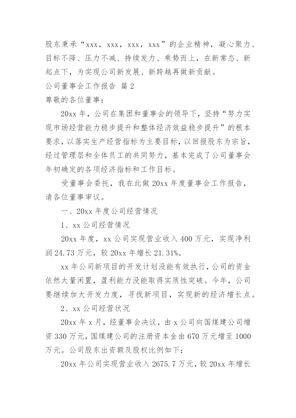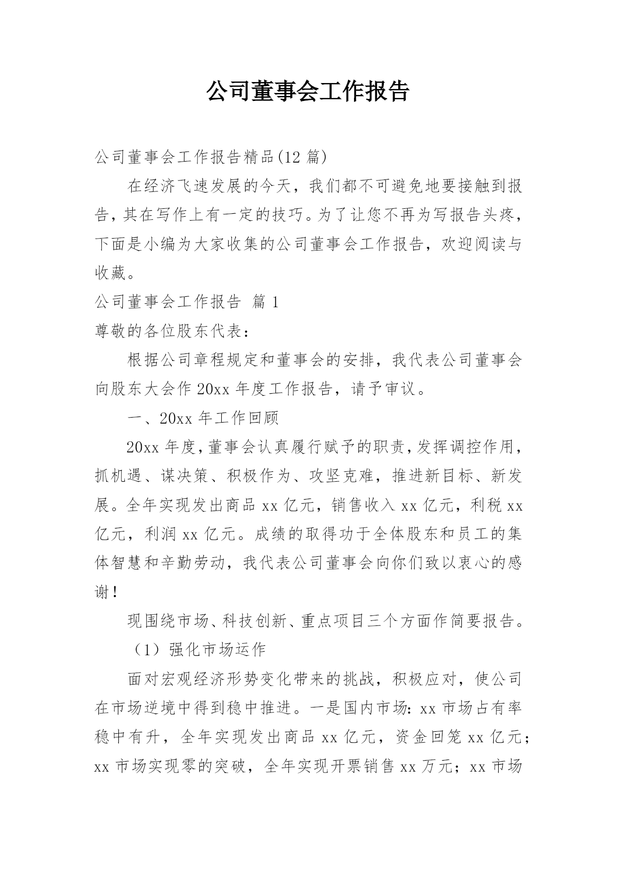 公司董事会工作报告公司董事会工作报告汇编[12篇]在学习、工作生活中,报告有着举足轻重的地位,我们在写报告的时候要避免篇幅过长。那么一般报告是怎么写的呢?下面是小编整理的公司董事会工作报告,欢迎阅读与收藏。公司董事会工作报告篇1尊敬的各位股东代表:根据公司章程规定和董事会的安排,我代表公司董事会向股东大会作20xx年度工作报告,请予审议。一、20xx年工作回顾20xx年度,董事会认真履行赋予的职责,发挥调控作用,抓机遇、谋决策、积极作为、攻坚克难,推进新目标、新发展。全年实现发出商品xx亿元,销售收入xx