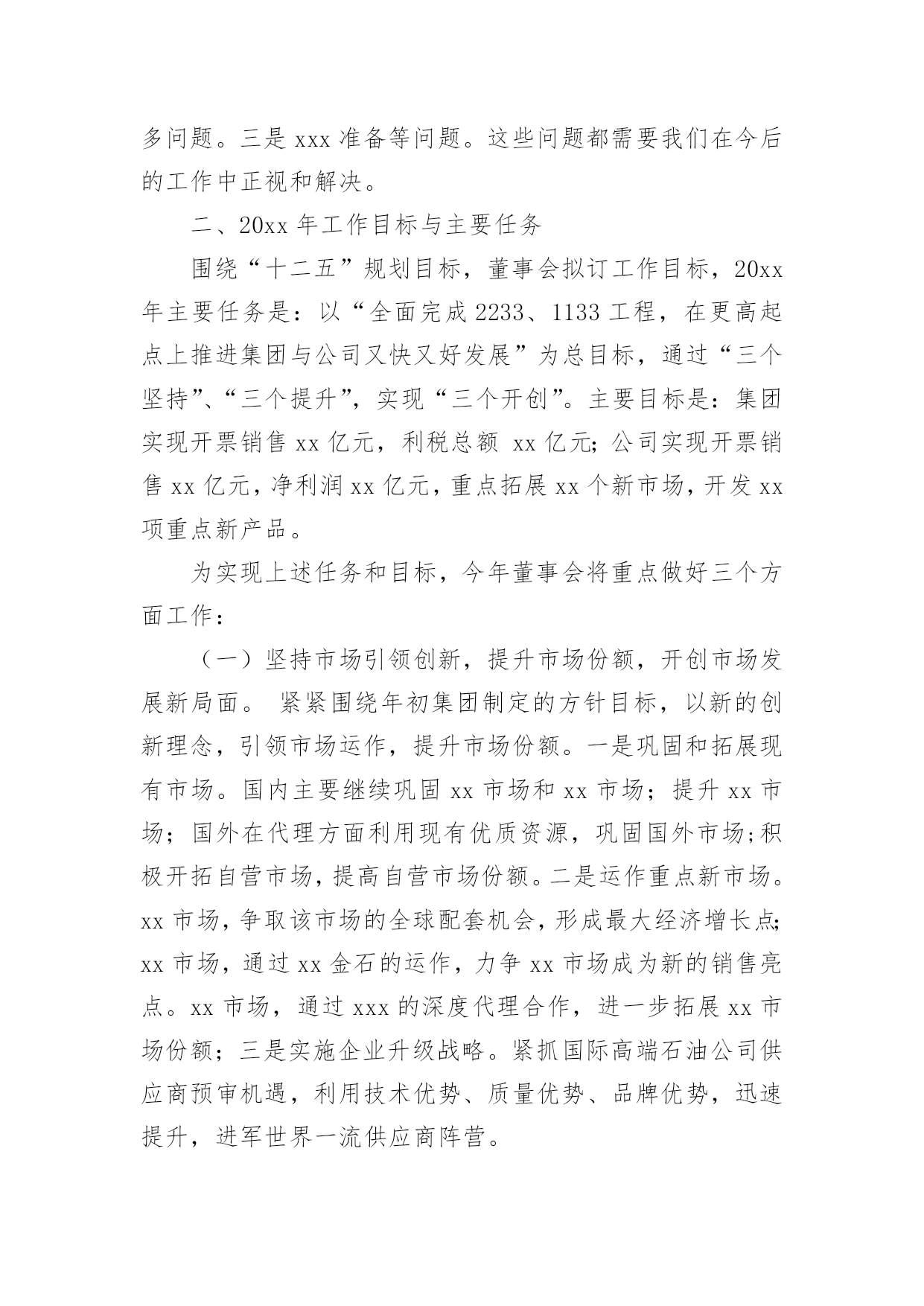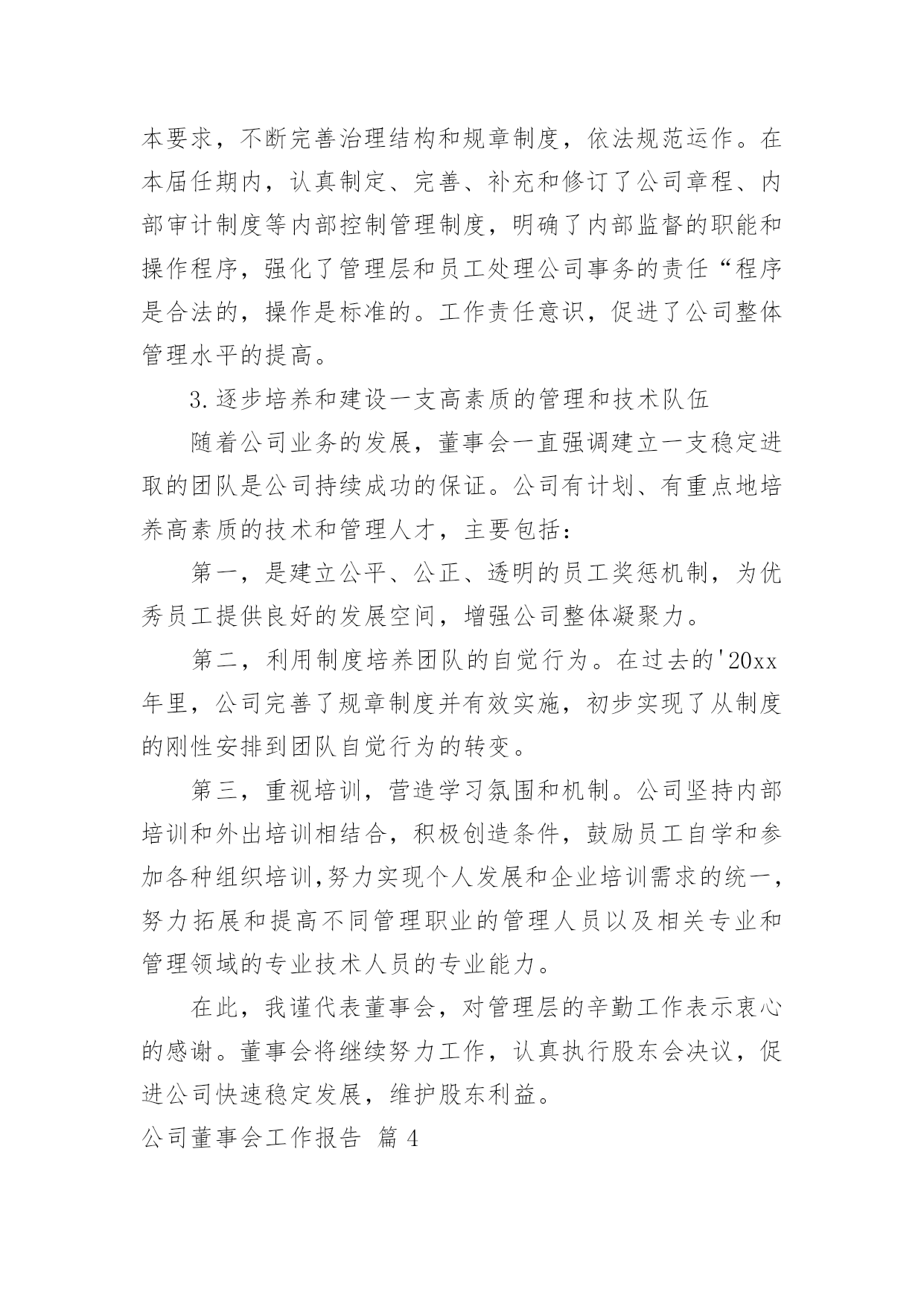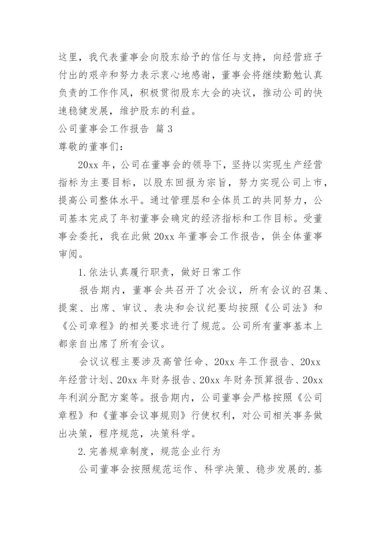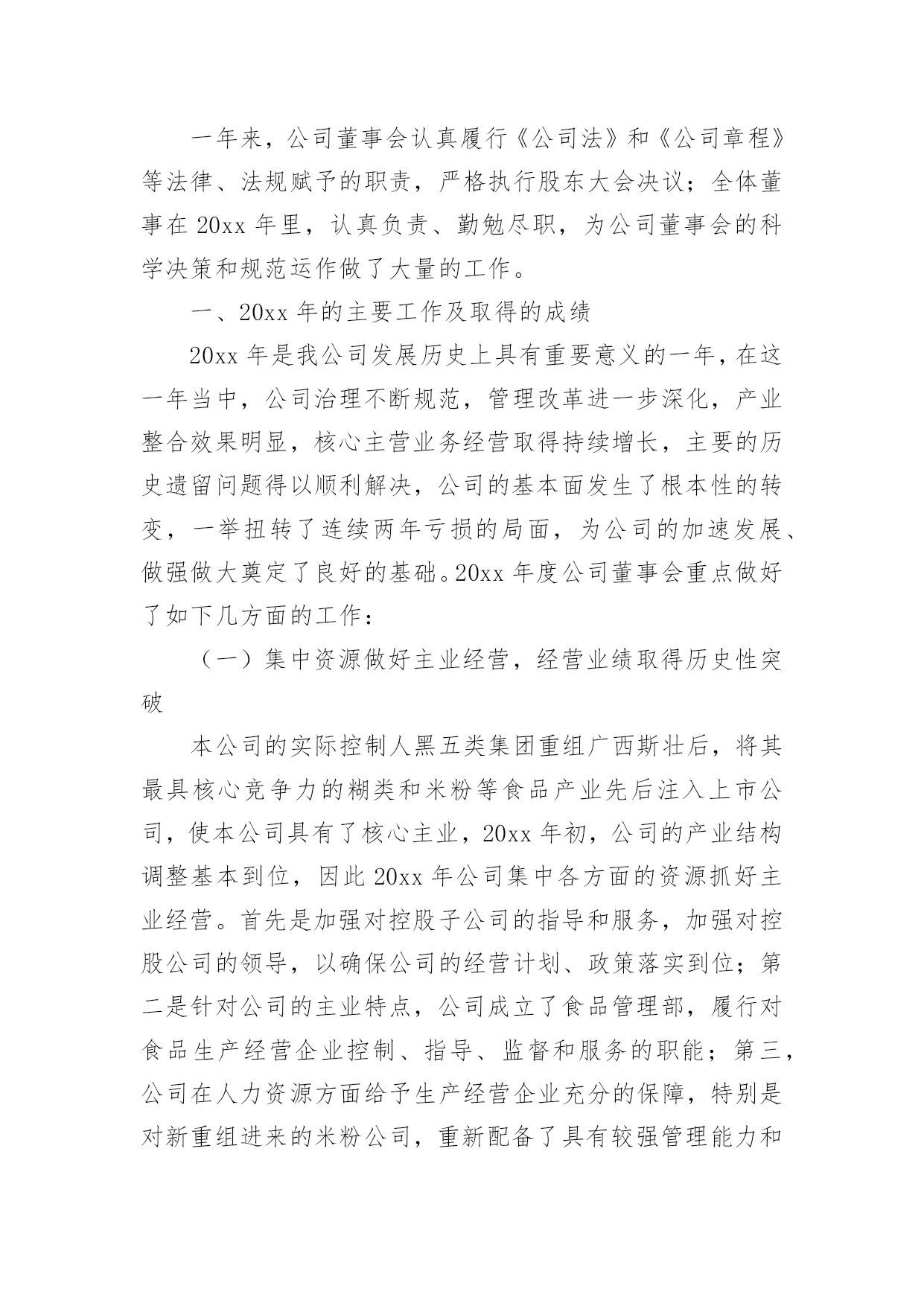 公司董事会工作报告公司董事会工作报告范文在学习、工作生活中,越来越多人会去使用报告,我们在写报告的时候要注意涵盖报告的基本要素。你还在对写报告感到一筹莫展吗?以下是小编收集整理的公司董事会工作报告范文,欢迎阅读,希望大家能够喜欢。公司董事会工作报告范文120xx年,在董事会的正确领导和大力支持下,我们公司全体干部员工,增强忧患意识和紧迫感,增强战胜困难的决心和信心,寻找物流业发展的有利条件和积极因素,变压力为动力,化挑战为机遇。以继续强化市场开拓,提高服务质量和水平为目标,努力抓好安全运行,挖掘新的盈利潜