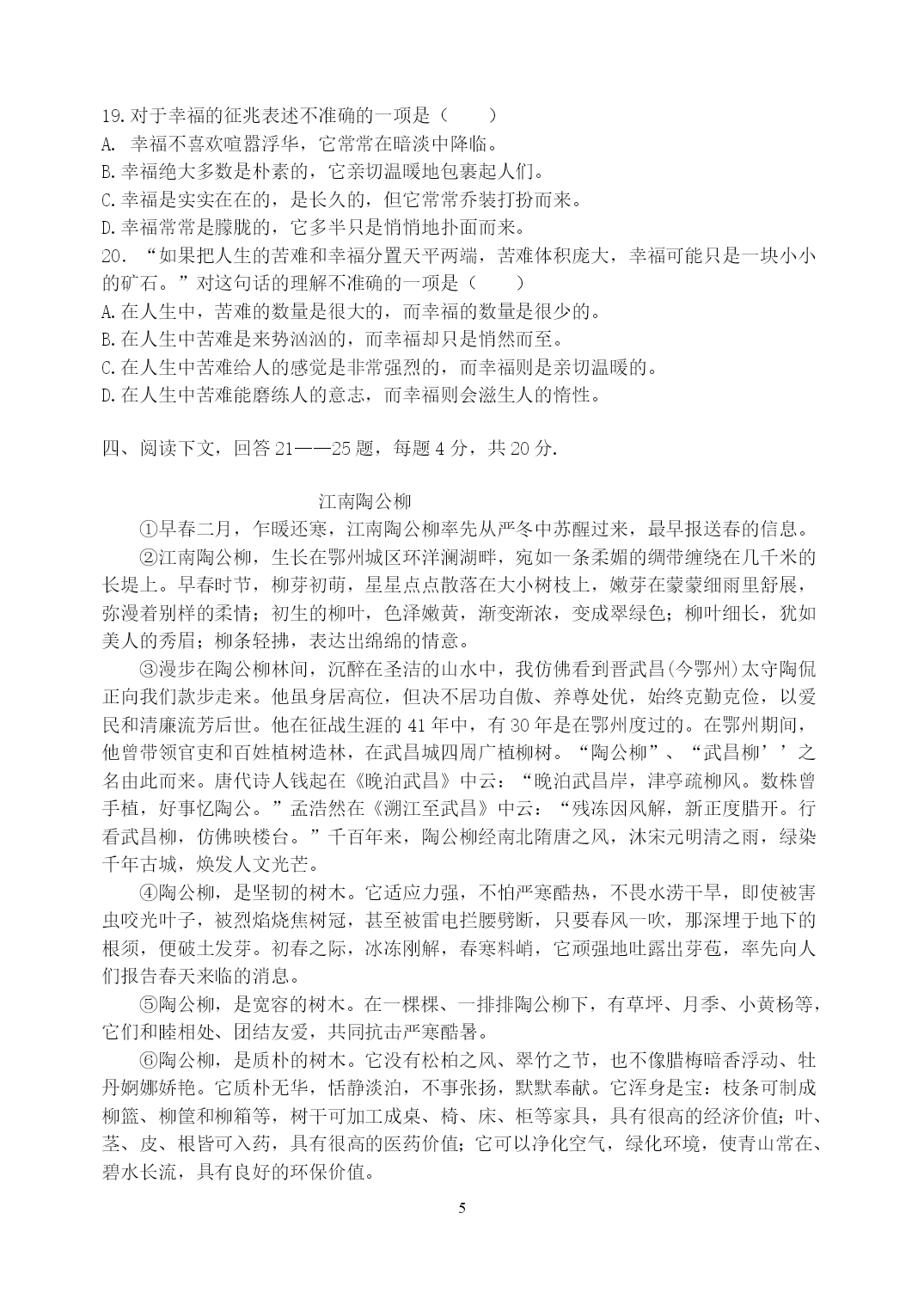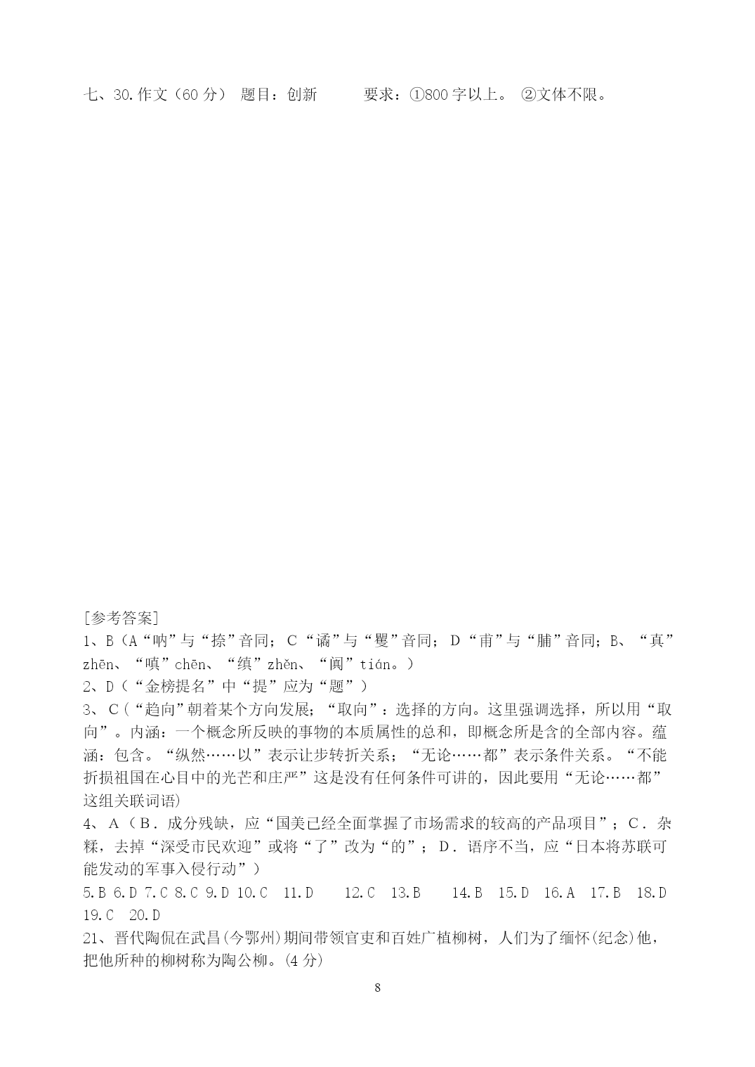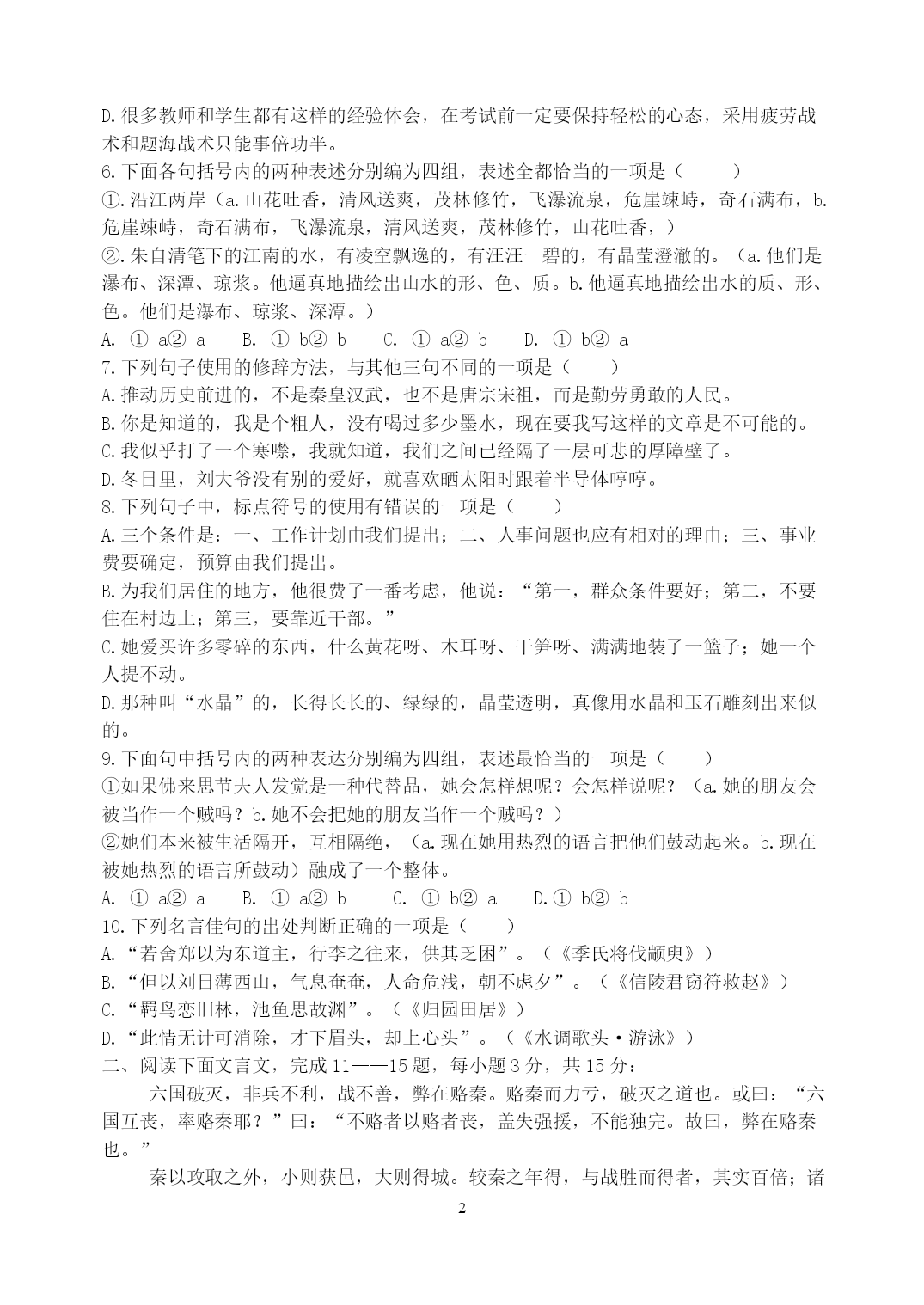 PAGEPAGE9高职考试语文练习试卷一、共十题,每小题3分,共计30分1.下列词语中加点字的读音,全都不相同的一组是()A.呐喊木讷那年方枘圆凿按捺不住B.纯真嗔怪缜密审慎周密宾客阗门C.倔强角色联袂诡谲奸诈精神矍铄D.杜甫哺育果脯铺张浪费花园苗圃2.下列各组词语中,有错别字的一组是()A.振动举世震惊行迹形迹可疑B.风声谈笑风生卓见真知灼见C.恣意肆意妄为直言仗义执言D.桃园世外桃源题名金榜提名3.依次填入下列各句横线处的词语,最恰当的一组是()①不少“形象工程”的背后,往往隐藏着双重的利益:政治上以政绩求得上级提拔,经济上以项目捞取一己实惠。②文学需要深厚的文化和深沉的人文精神,没有这些则只能流于一般的情感宣泄和浅薄的心灵安慰。③“人有七情六欲”这固然不错,但物欲怎样膨胀,不应该折损祖国在心目中的光芒和庄严。A.趋向内涵纵然/也B.趋向蕴涵纵然/也C.取向内涵无论/都D.取向蕴涵无论/都4.下列各句中没有语病的一句是()A.随着滨海新区开发开放的深入,为滨海新区提供强大的智力、人力支撑,已成为本市高校的广泛共识。B.经过元旦三天的旺销,国美已经全面掌握了市场需求的较高的产品,特别针对此类产品进行了备货。C.进入冬季以来,天津水上公园开展了各种丰富多彩的雪上、冰上娱乐项目深受市民欢迎。D.冷战时期,作为美国军事盟友的日本将可能发动的苏联军事入侵行动列为主要威胁之一。5.下列各句中加点的成语使用不恰当的一项是()A.和煦的春风带来生机盎然的季节,学校社团的招新活动再次成为一道亮丽的风景线,男女学生纷至沓来,踊跃报名。B.机场附近山顶的大量无限电发射台严重影响了飞行安全,目前虽有一些已搬下山,但这对实现机场净空不过是九牛一毛。C.东方大学城在短短四年内就以2.1亿元自有资金获取了13.7亿元巨额利润,这种惊人的财富增长速度确实匪夷所思。D.很多教师和学生都有这样的经验体会,在考试前一定要保持轻松的心态,采用疲劳战术和题海战术只能事倍功半。6.下面各句括号内的两种表述分别编为四组,表述全都恰当的一项是()=1\*GB3①.沿江两岸(a.山花吐香,清风送爽,茂林修竹,飞瀑流泉,危崖竦峙,奇石满布,b.危崖竦峙,奇石满布,飞瀑流泉,清风送爽,茂林修竹,山花吐香,)=2\*GB3②.朱自清笔下的江南的水,有凌空飘逸的,有汪汪一碧的,有晶莹澄澈的。(a.他们是瀑布、深潭、琼浆。他逼真地描绘出山水的形、色、质。b.他逼真地描绘出水的质、形、色。他们是瀑布、琼浆、深潭。)A.=1\*GB3①a=2\*GB3②aB.=1\*GB3①b=2\*GB3②bC.=1\*GB3①a=2\*GB3②bD.=1\*GB3①b=2\*GB3②a7.下列句子使用的修辞方法,与其他三句不同的一项是()A.推动历史前进的,不是秦皇汉武,也不是唐宗宋祖,而是勤劳勇敢的人民。B.你是知道的,我是个粗人,没有喝过多少墨水,现在要我写这样的文章是不可能的。C.我似乎打了一个寒噤,我就知道,我们之间已经隔了一层可悲的厚障壁了。D.冬日里,刘大爷没有别的爱好,就喜欢晒太阳时跟着半导体哼哼。8.下列句子中,标点符号的使用有错误的一项是()A.三个条件是:=1\*CHINESENUM3一、工作计划由我们提出;=2\*CHINESENUM3二、人事问题也应有相对的理由;=3\*CHINESENUM3三、事业费要确定,预算由我们提出。B.为我们居住的地方,他很费了一番考虑,他说:“第一,群众条件要好;第二,不要住在村边上;第三,要靠近干部。”C.她爱买许多零碎的东西,什么黄花呀、木耳呀、干笋呀、满满地装了一篮子;她一个人提不动。D.那种叫“水晶”的,长得长长的、绿绿的,晶莹透明,真像用水晶和玉石雕刻出来似的。9.下面句中括号内的两种表达分别编为四组,表述最恰当的一项是()=1\*GB3①如果佛来思节夫人发觉是一种代替品,她会怎样想呢?会怎样说呢?(a.她的朋友会被当作一个贼吗?b.她不会把她的朋友当作一个贼吗?)=2\*GB3②她们本来被生活隔开,互相隔绝,(a.现在她用热烈的语言把他们鼓动起来。b.现在被她热烈的语言所鼓动)融成了一个整体。A.=1\*GB3①a=2\*GB3②aB.=1\*GB3①a=2\*GB3②bC.=1\*GB3①b=2\*GB3②aD.=1\*GB3①b=2\*GB3②b10.下列名言佳句的出处判断正确的一项是()A.“若舍郑以为东道主,行李之往来,供其乏困”。(《季氏将伐颛臾》)B.“但以刘日薄西山,